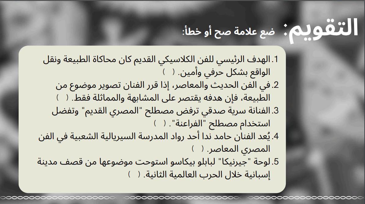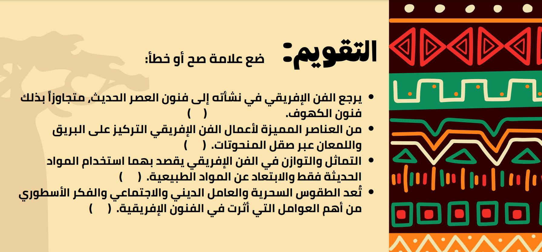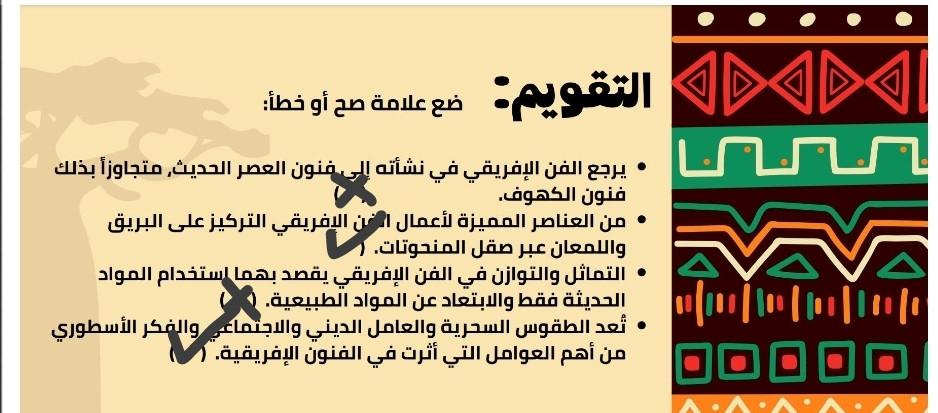 راجعنا درس الفن الأفريقي ودرس الفن وقضايا المجتمع، وحلينا أسئلة مراجعة