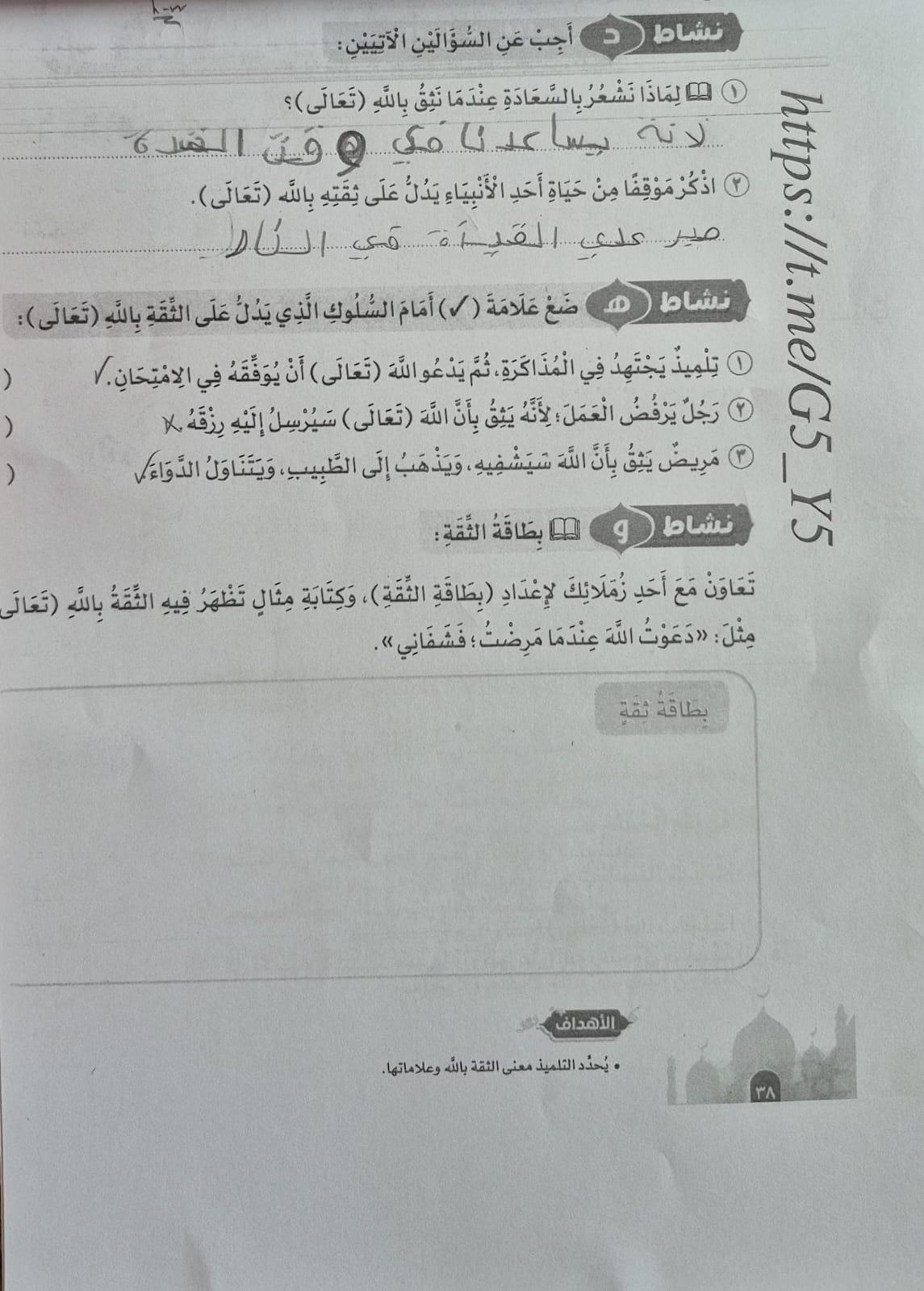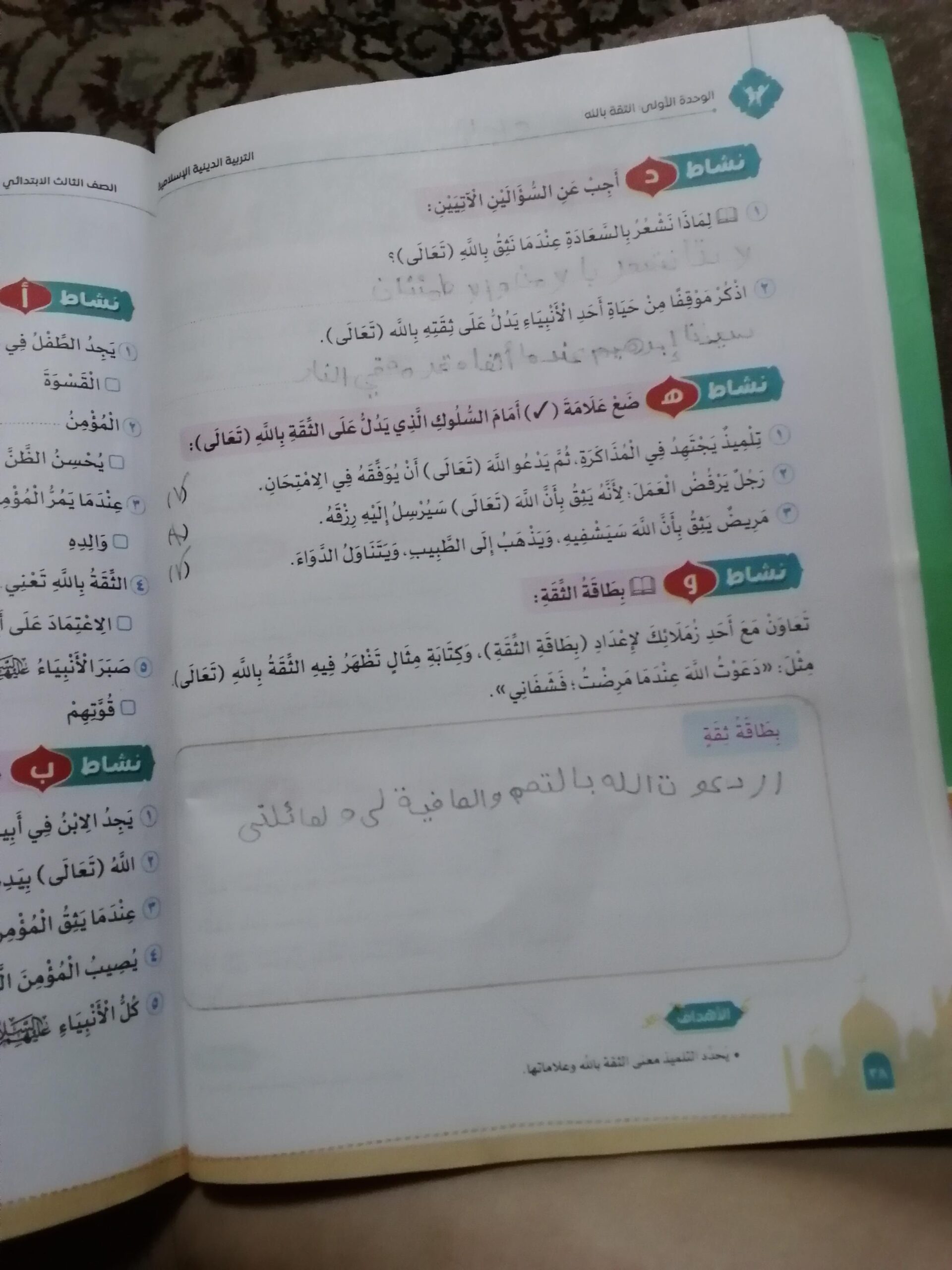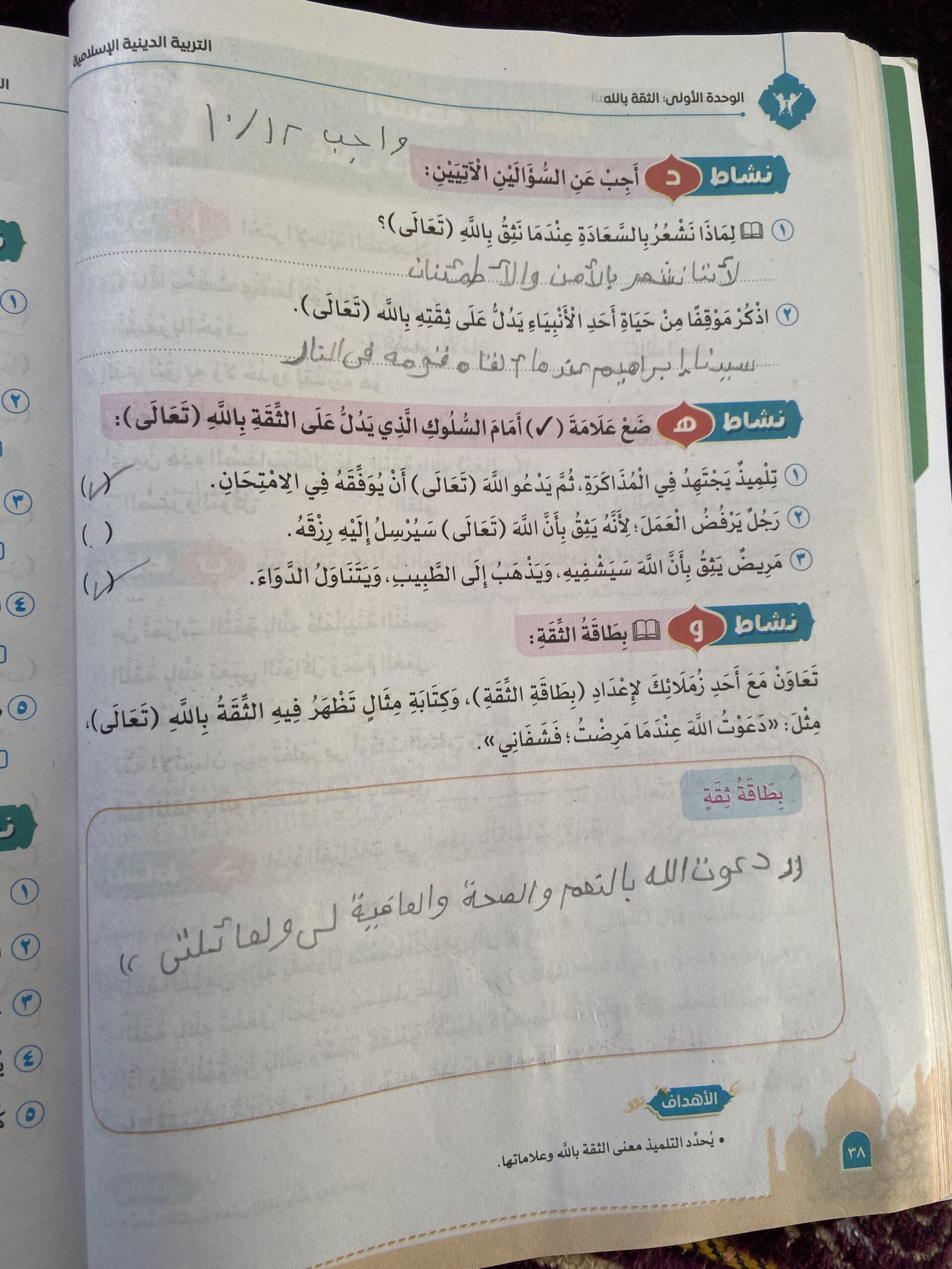 الواجب/مذاكرة درس الثقة بالله وتحضير الوحدة الثانية
