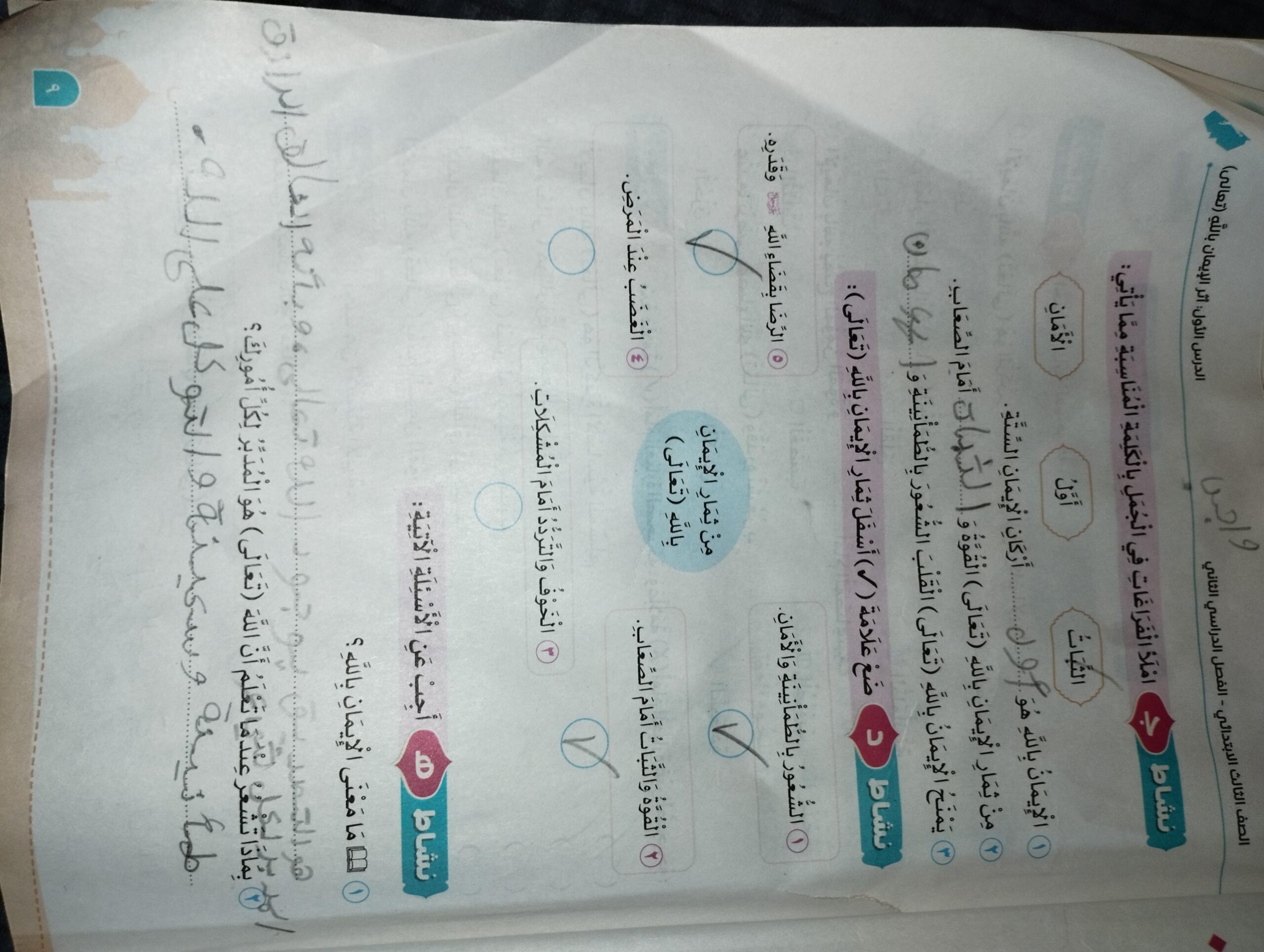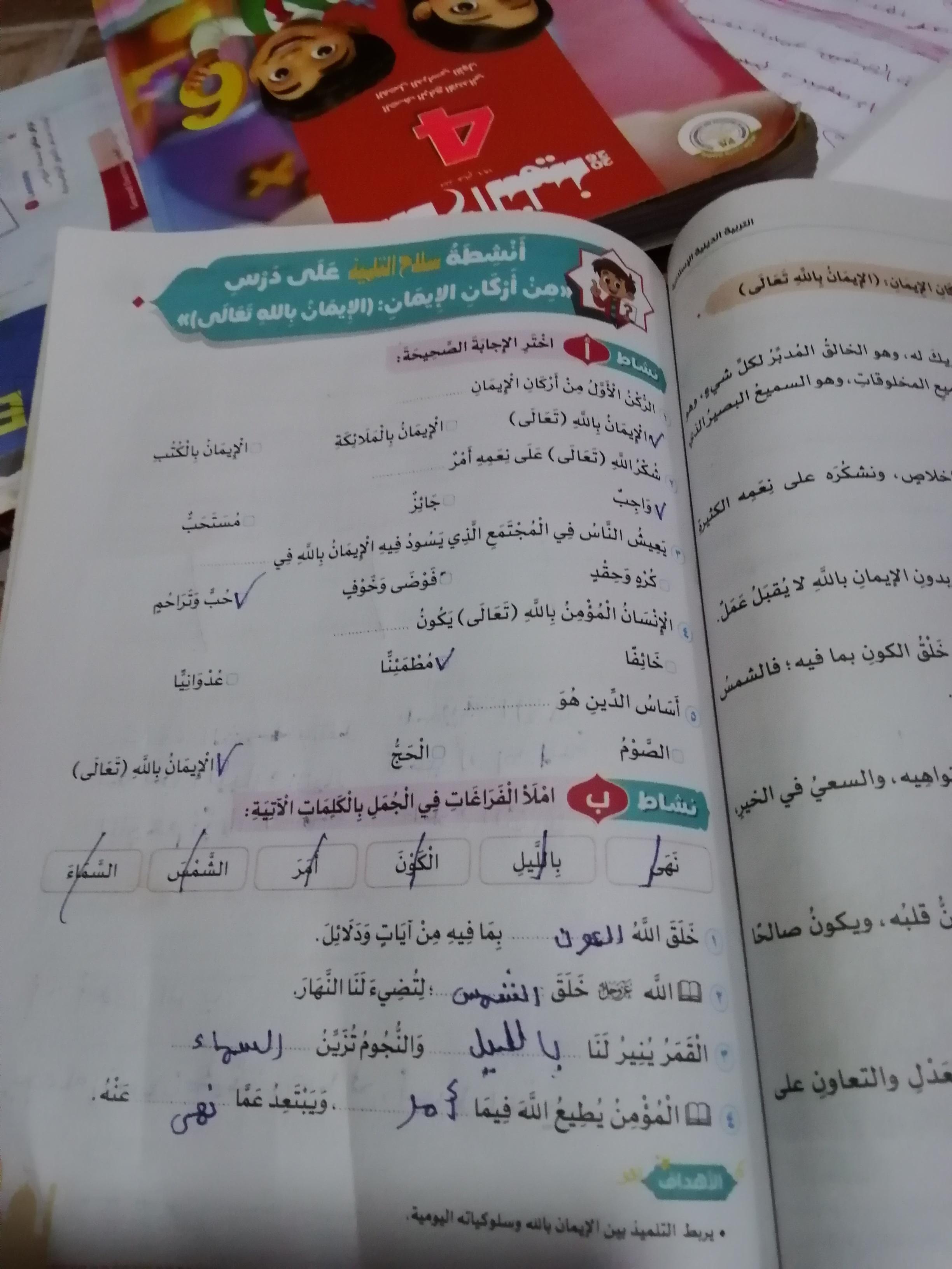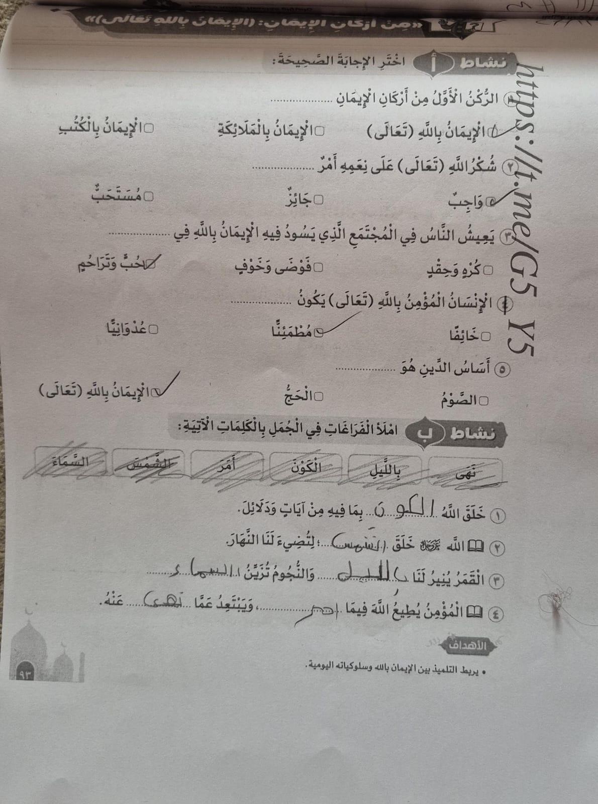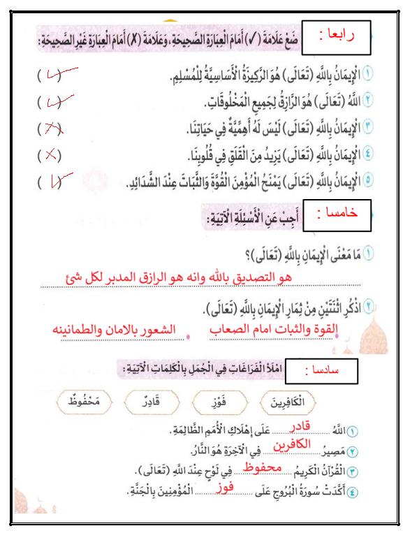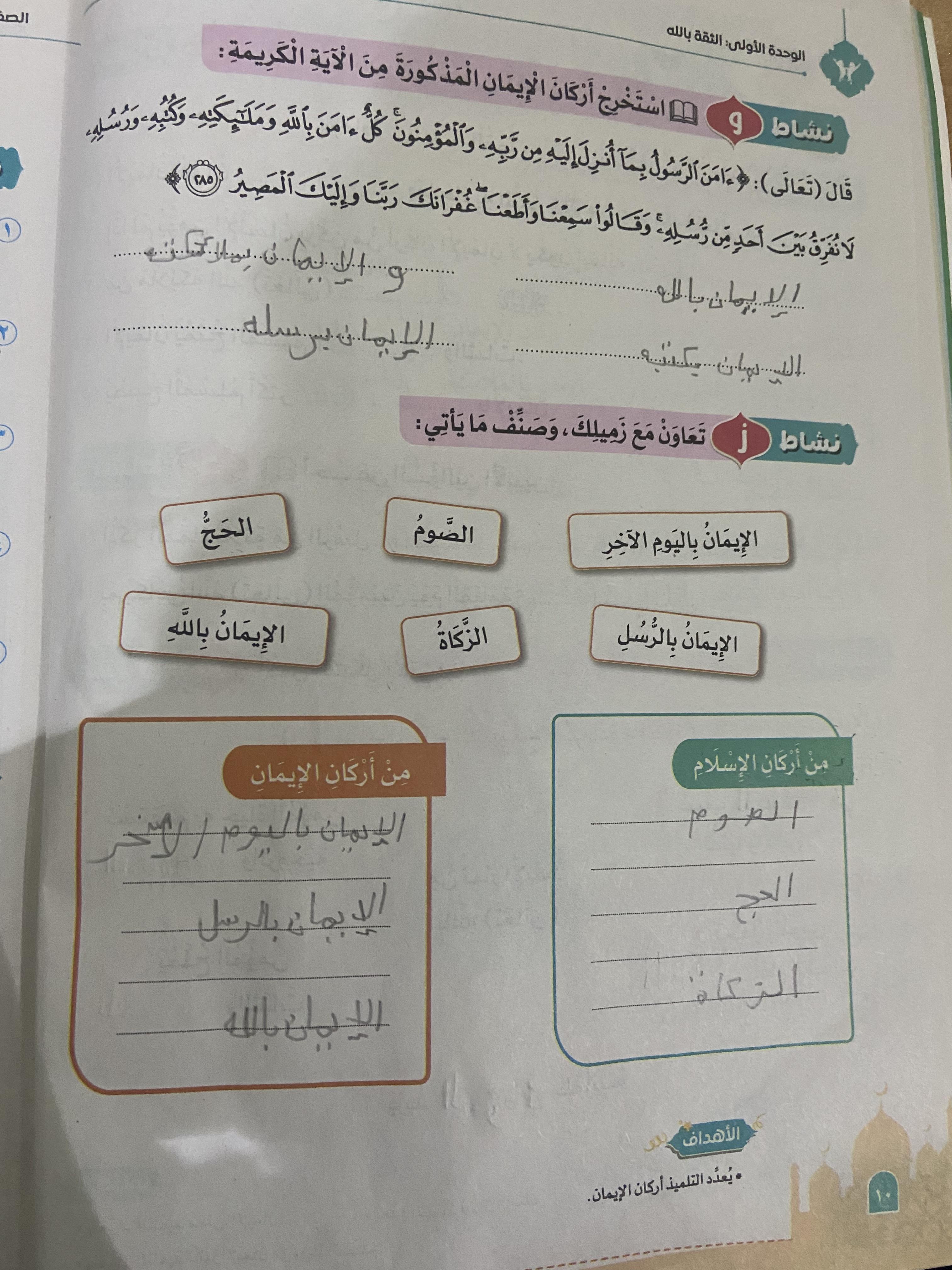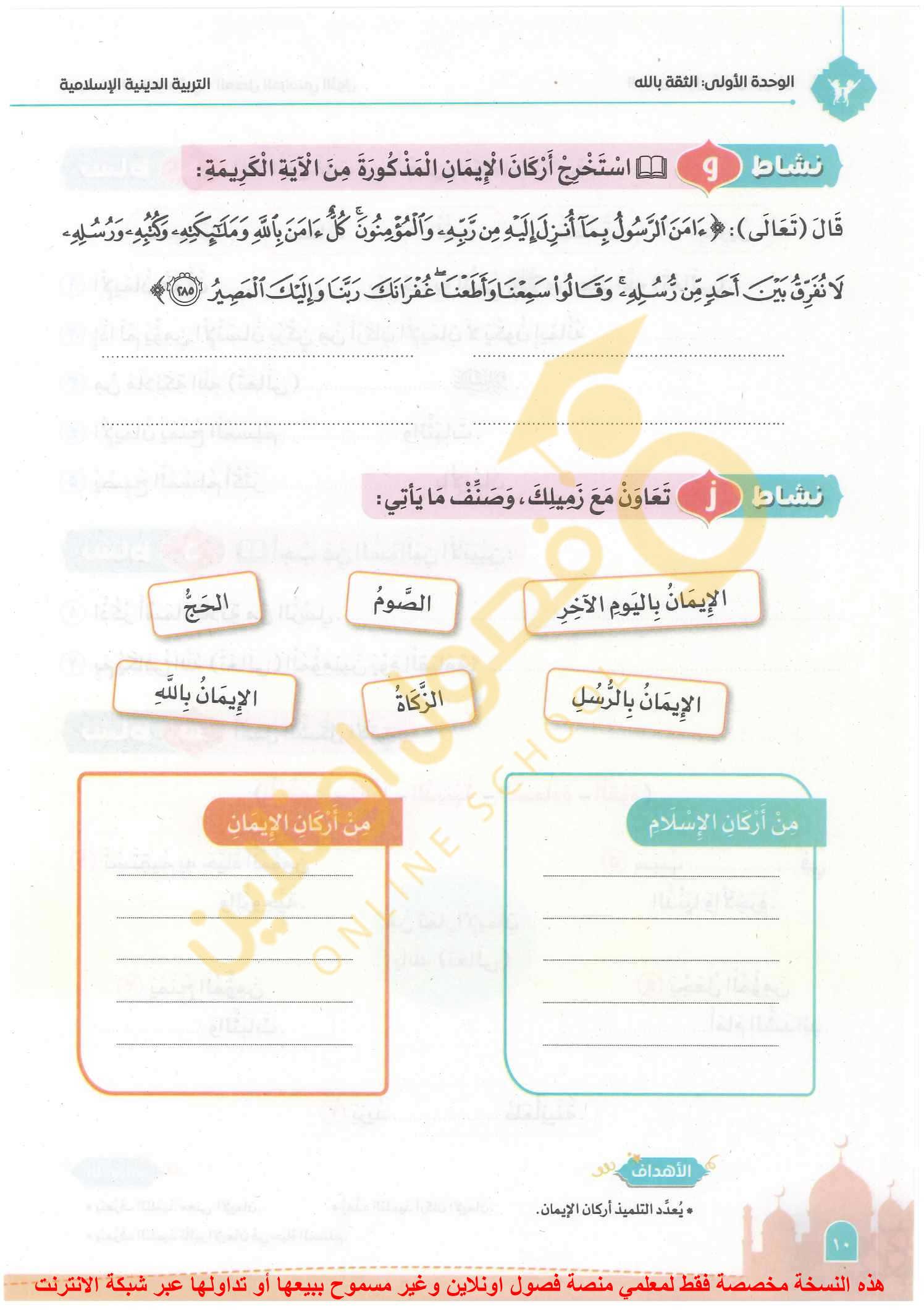 الدرس/ أركان الإيمان الواجب/ حل التدريبات + حفظ الحديث