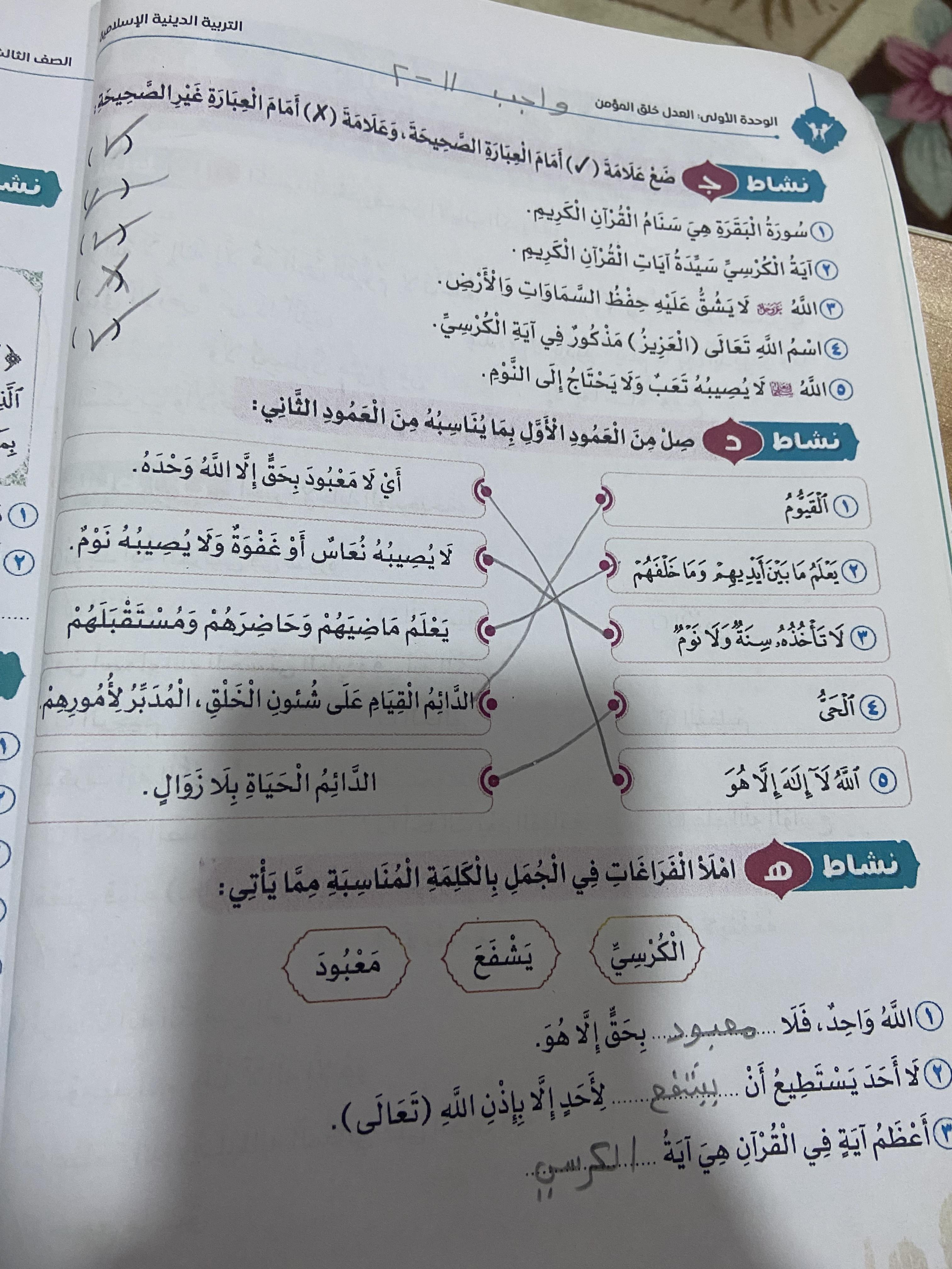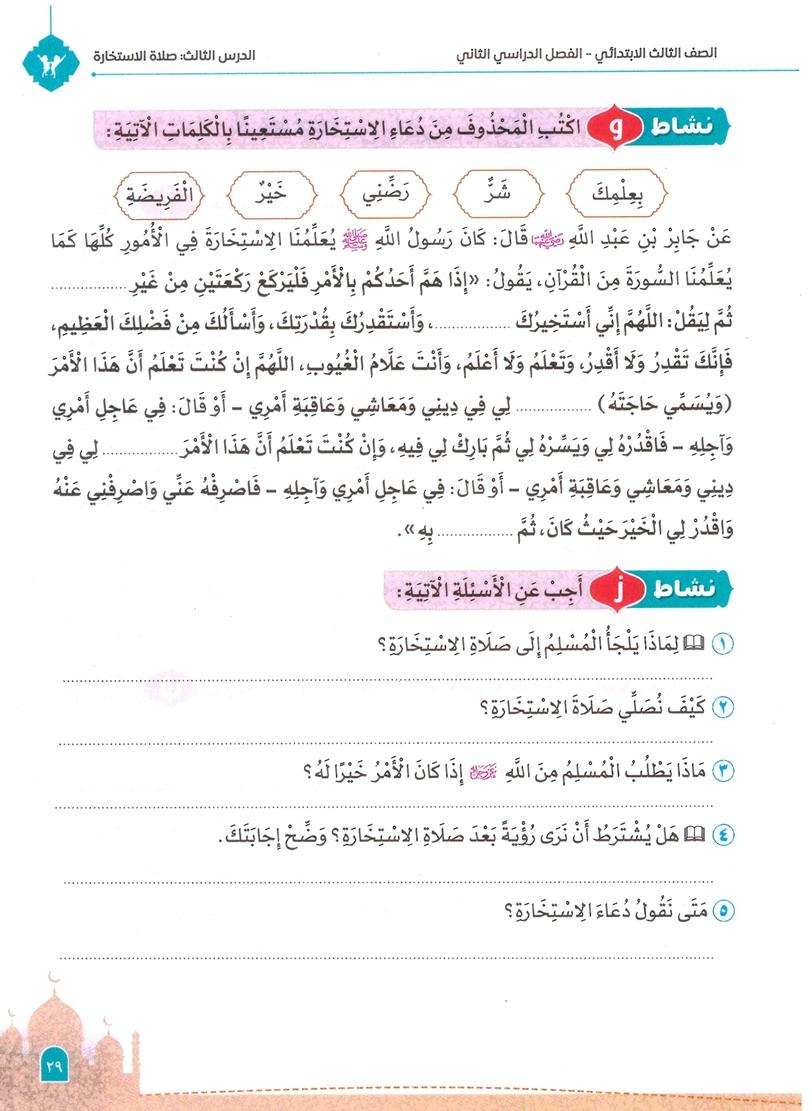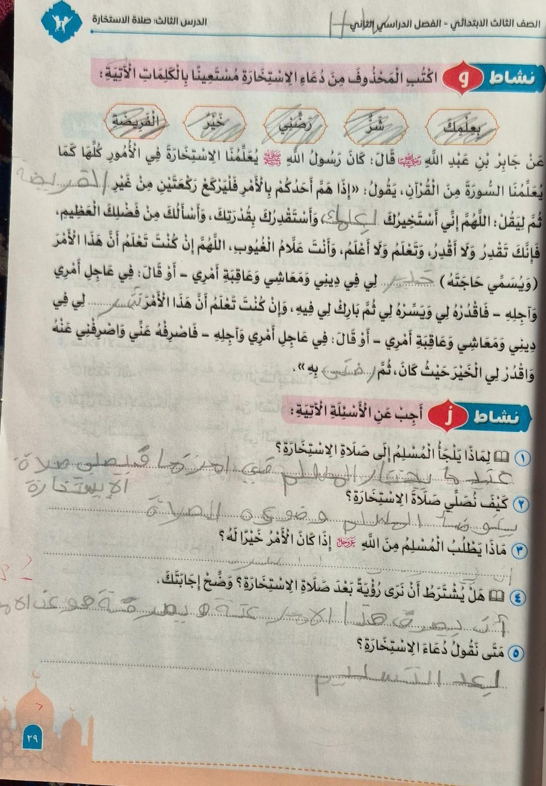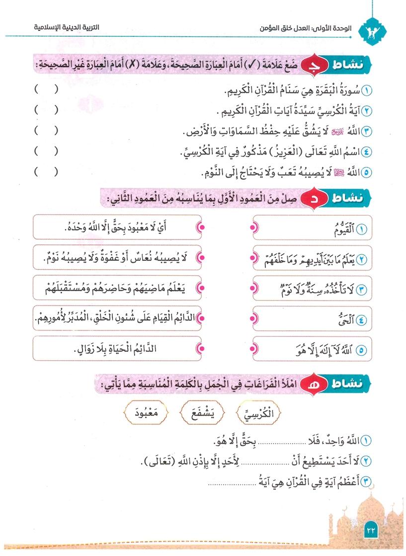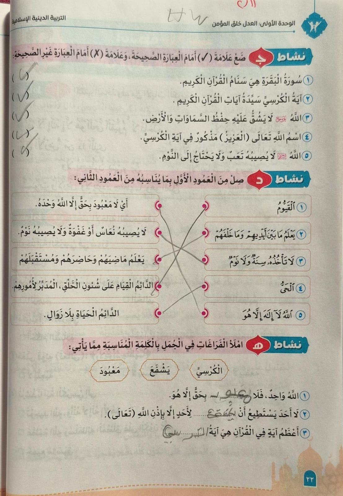 الدرس\ آية الكرسي وصلاة الإستخارة الواجب\ حل تدريبات الكتاب صفحة ( 22و28و29 )