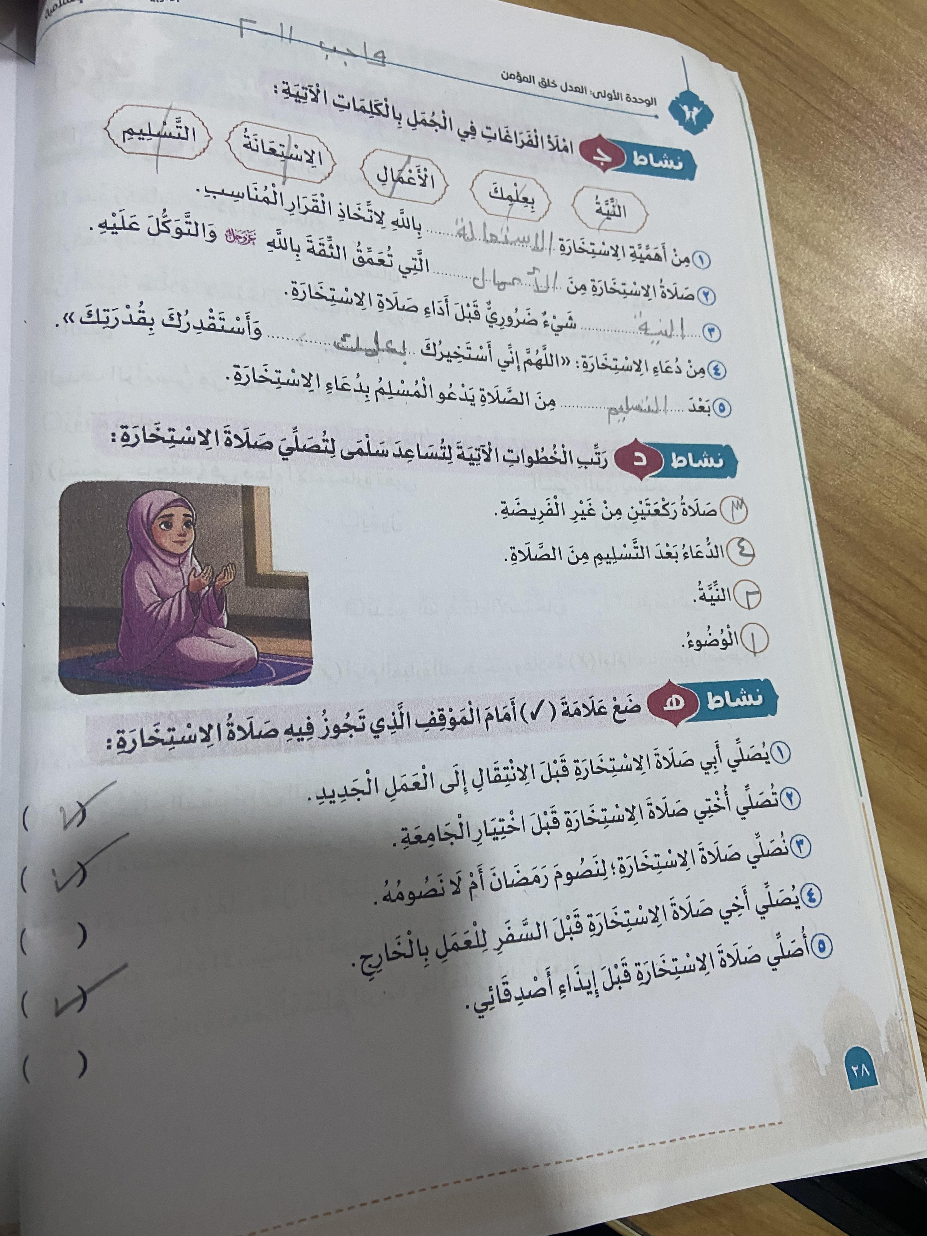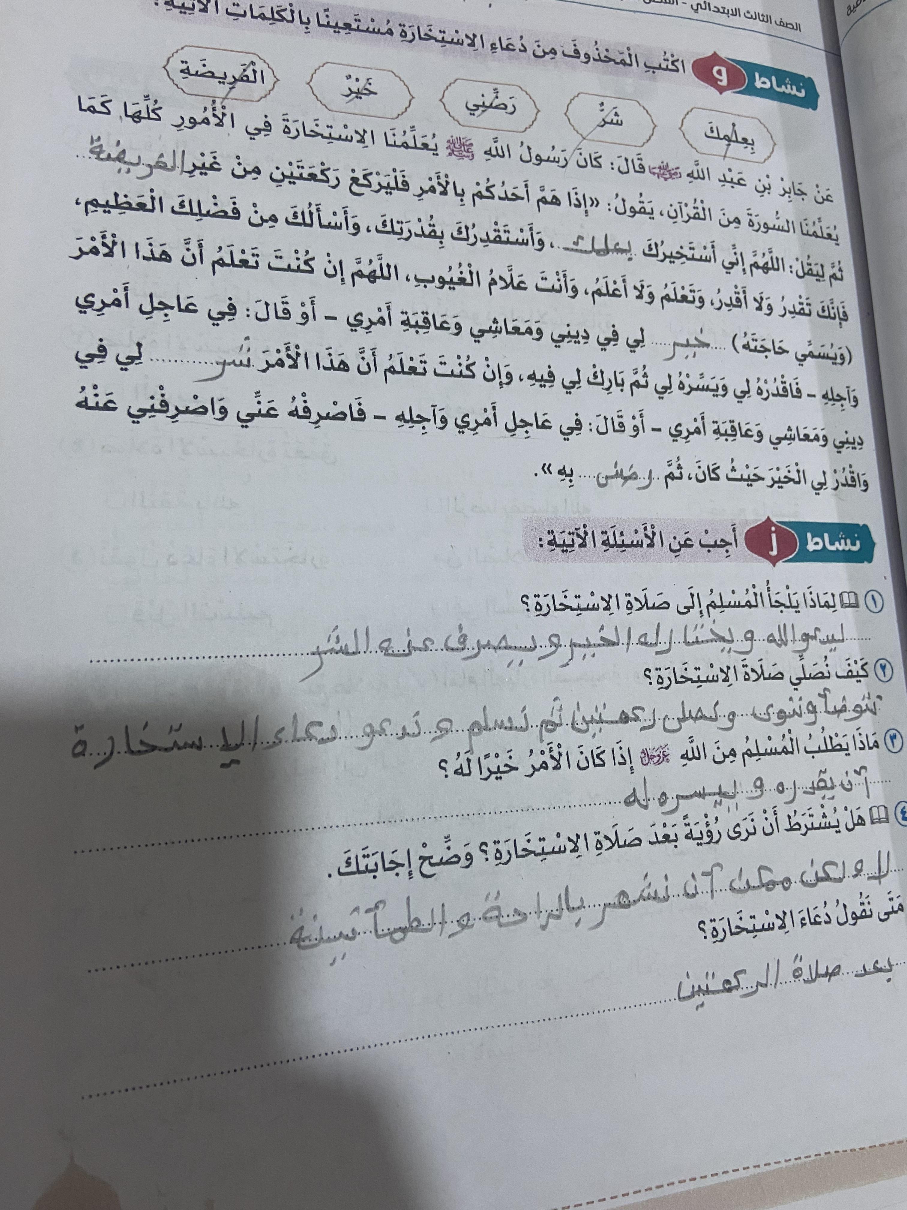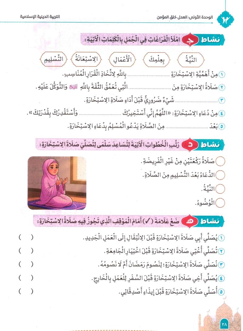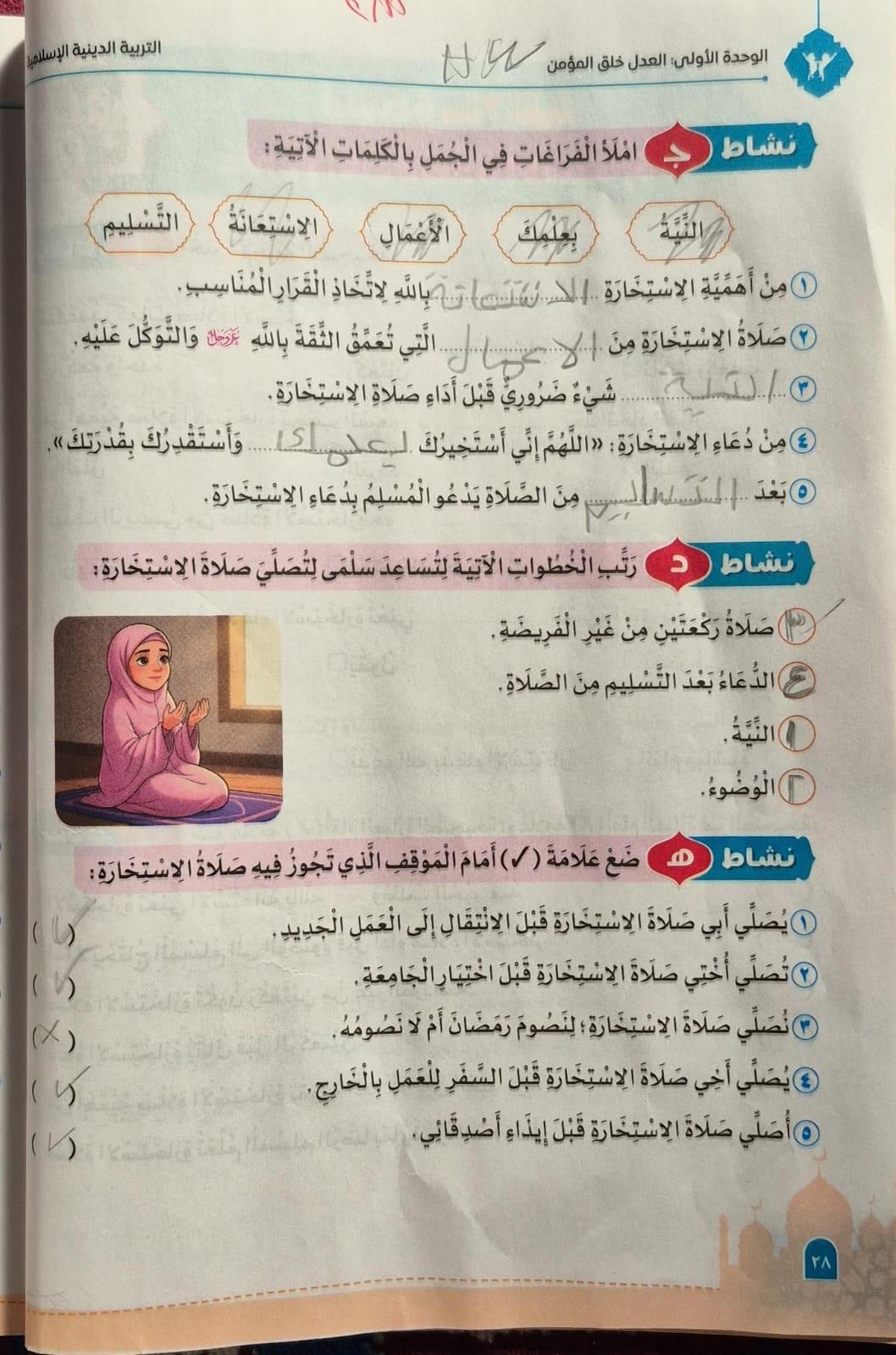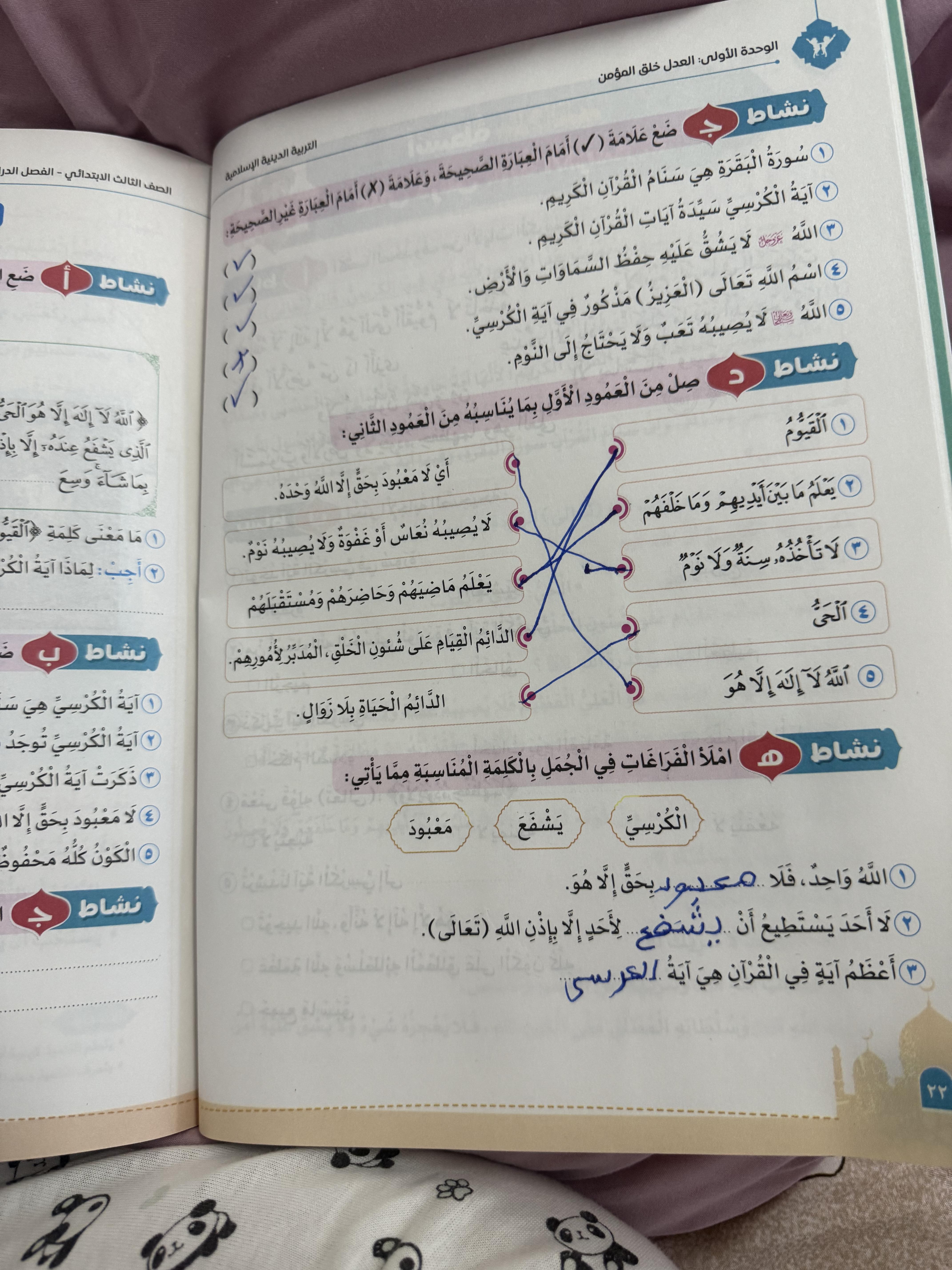 الدرس\ آية الكرسي وصلاة الإستخارة الواجب\ حل تدريبات الكتاب صفحة ( 22و28و29 )
