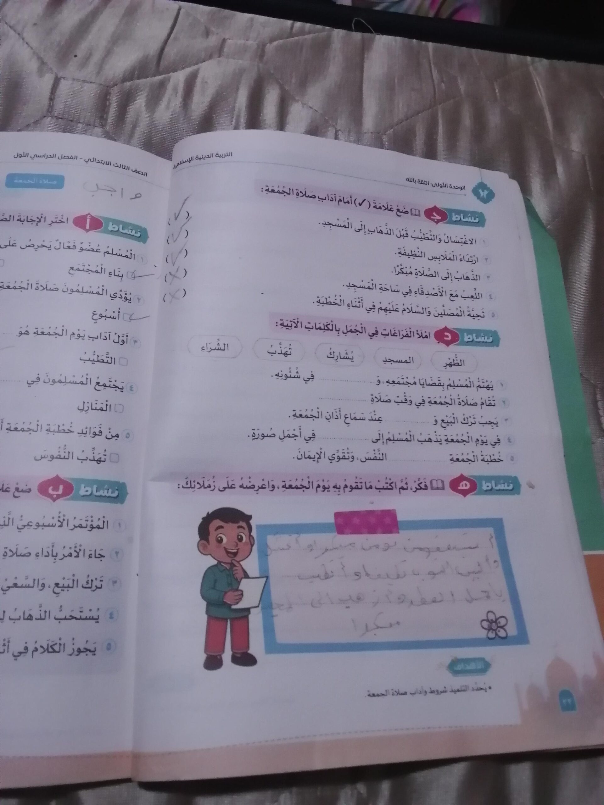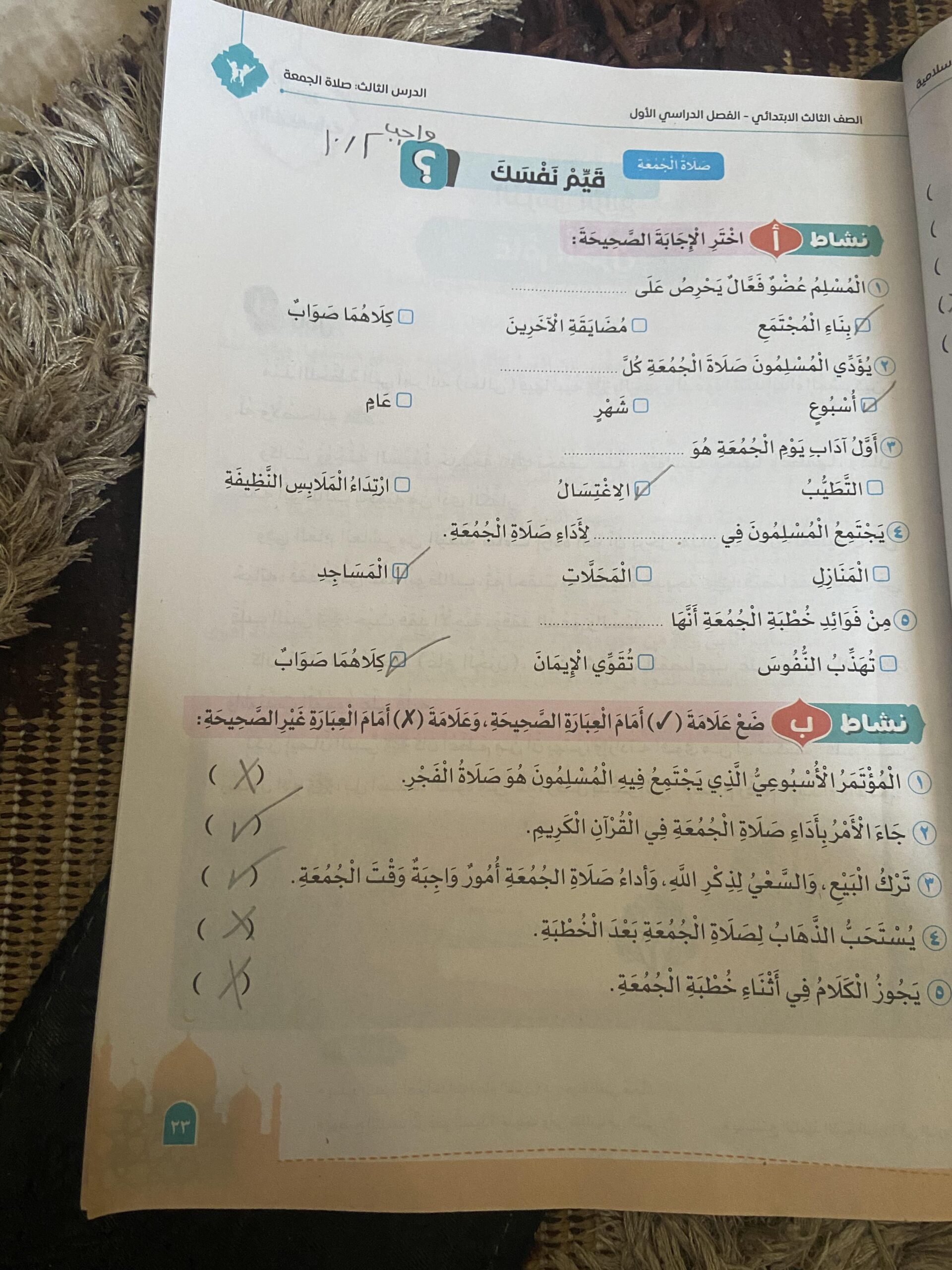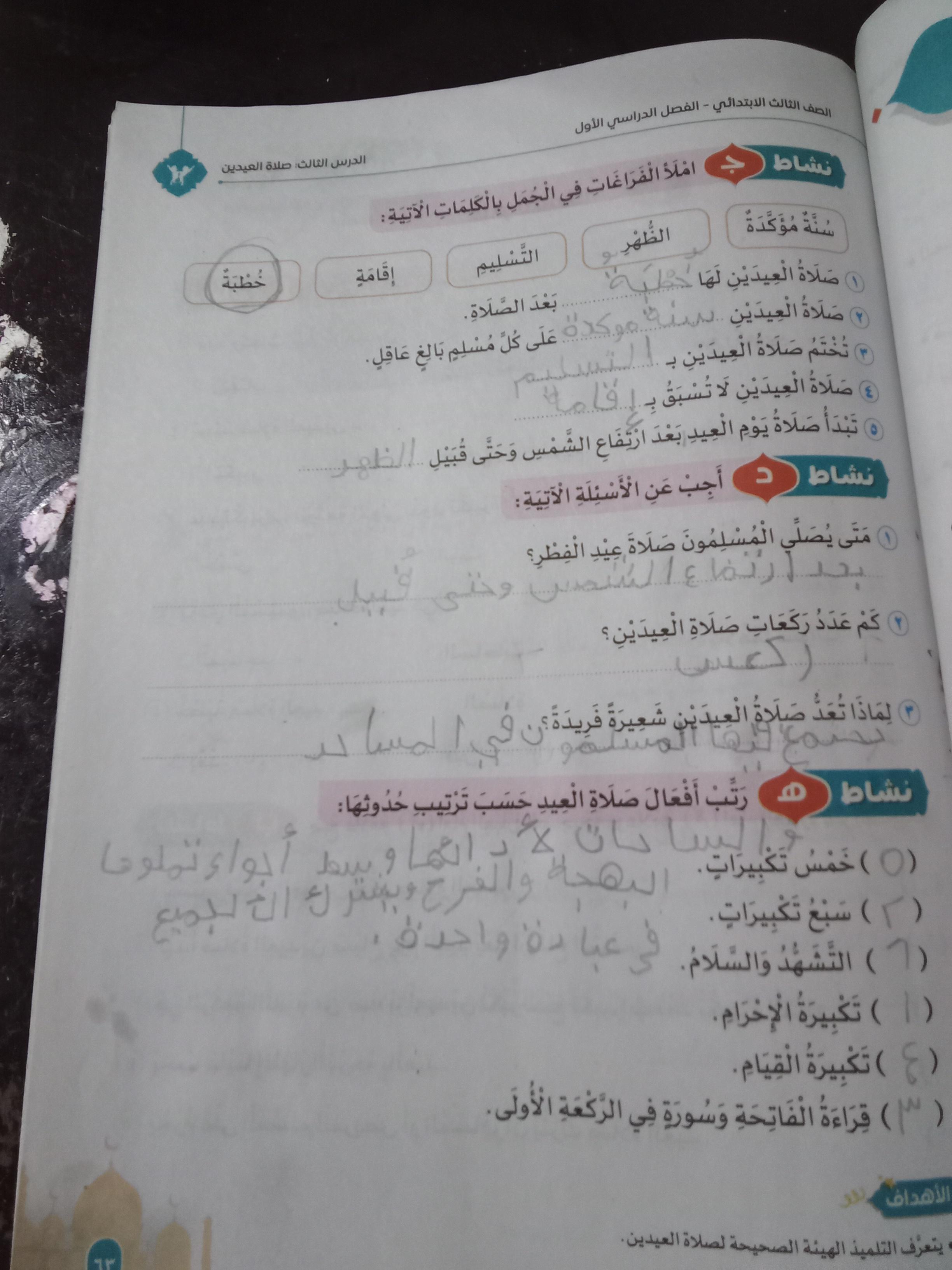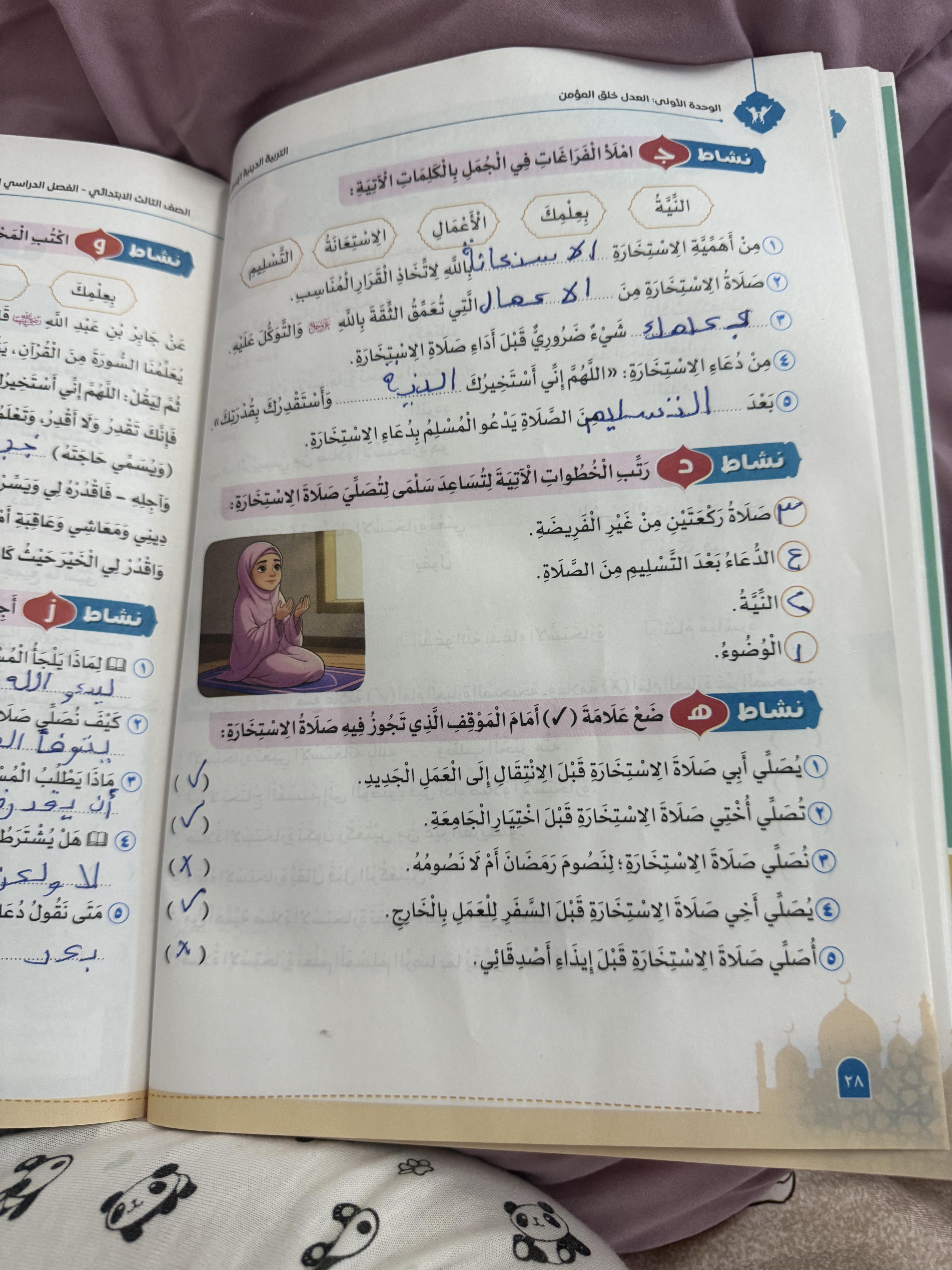 الدرس\ آية الكرسي وصلاة الإستخارة الواجب\ حل تدريبات الكتاب صفحة ( 22و28و29 )