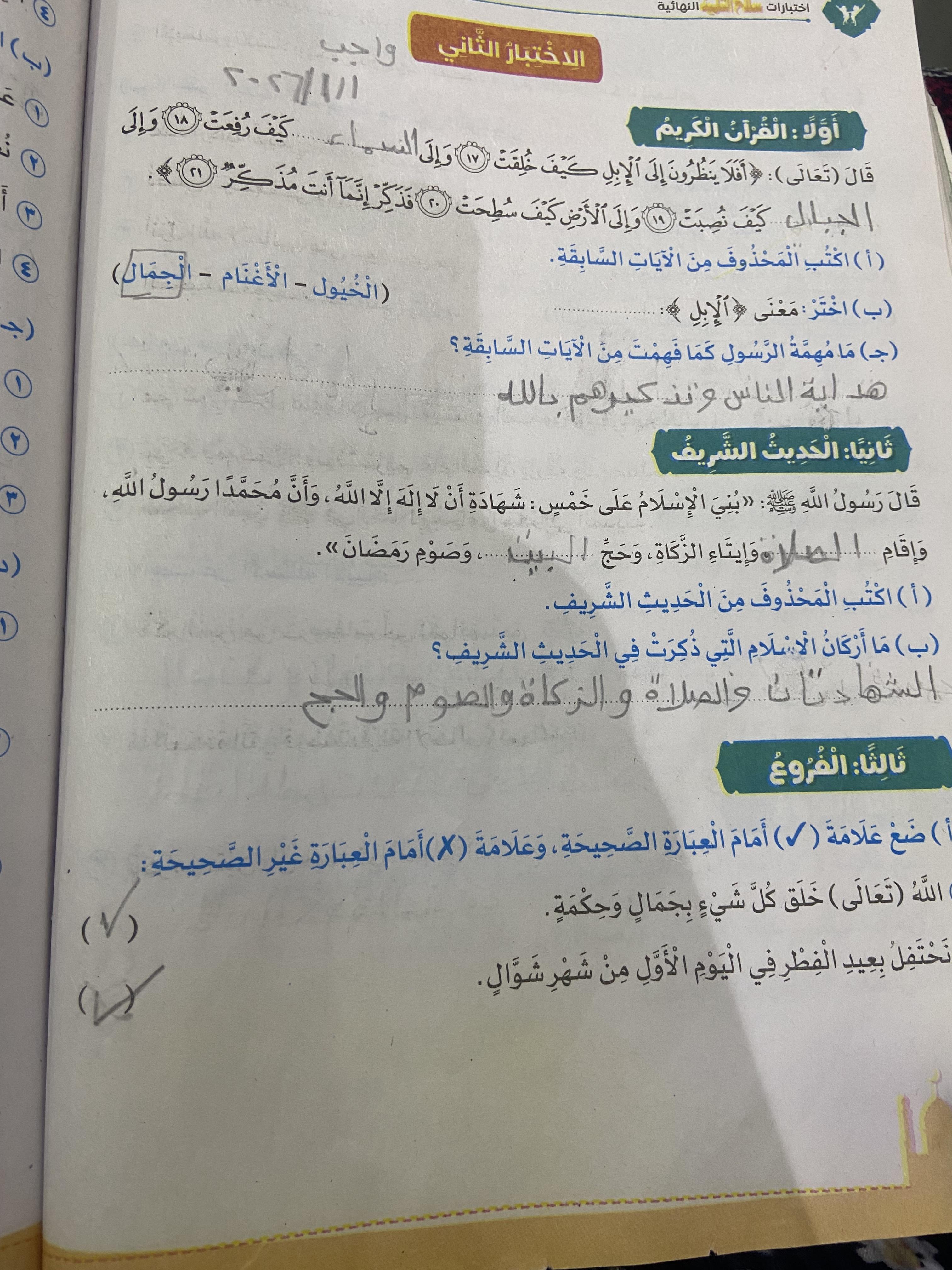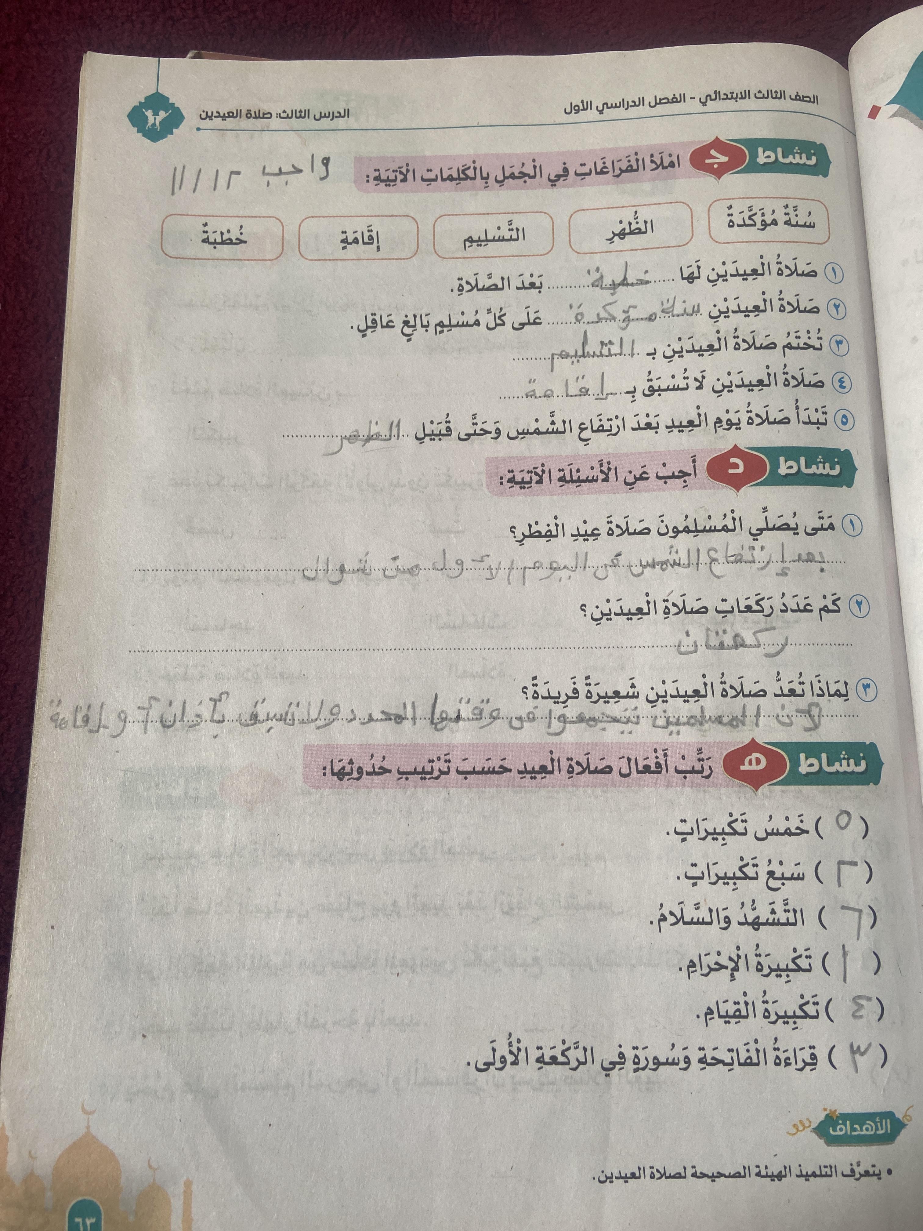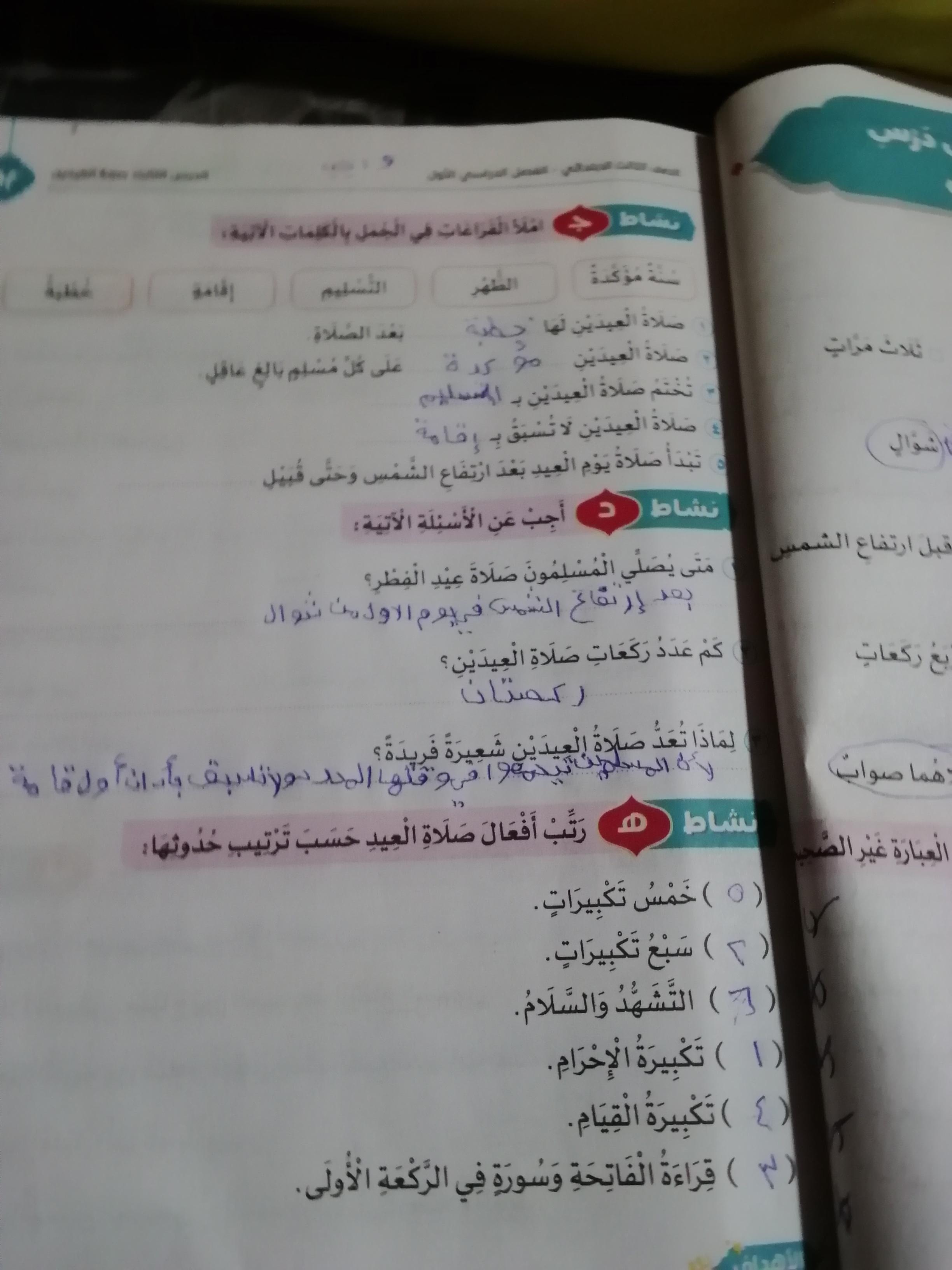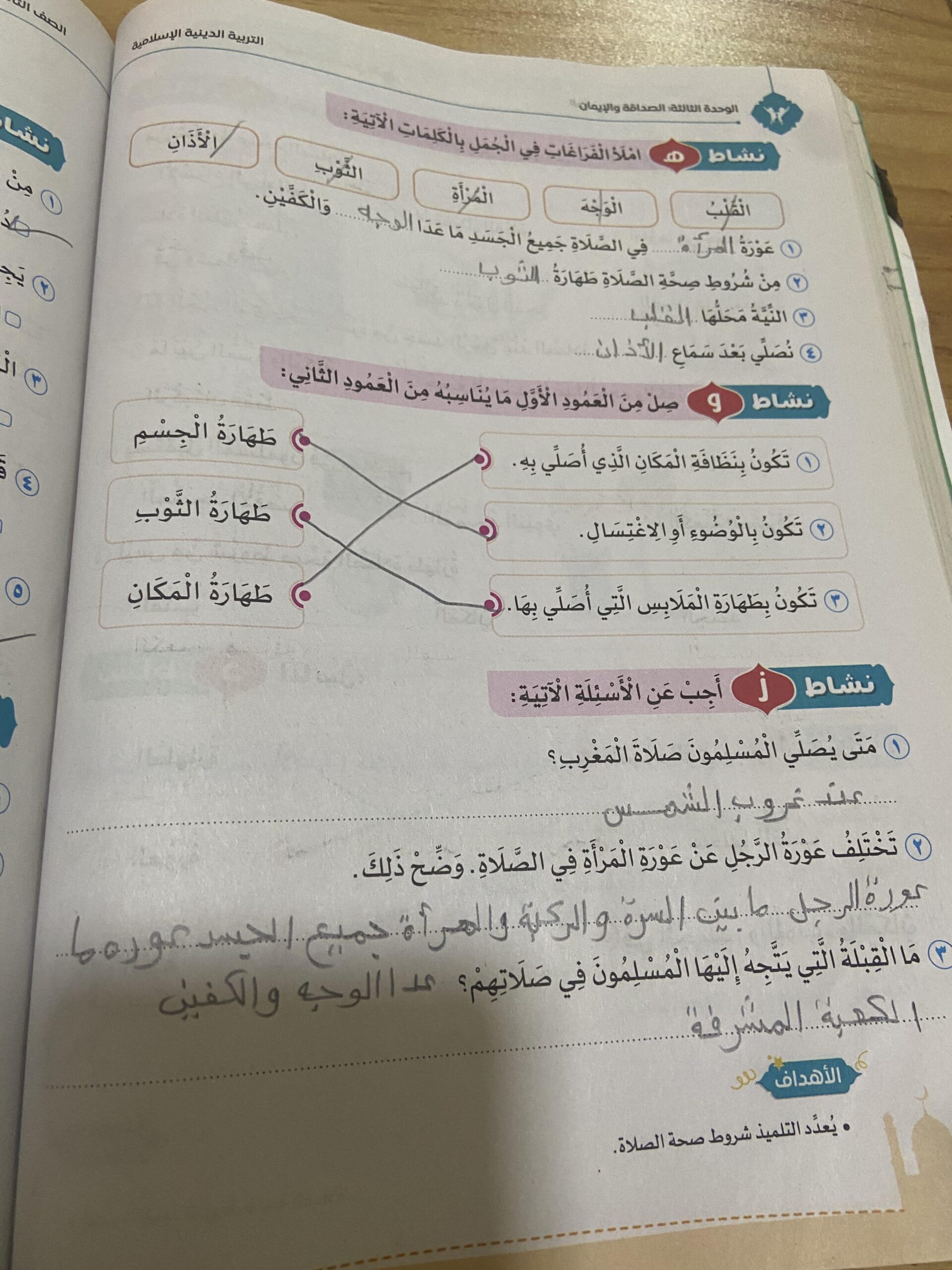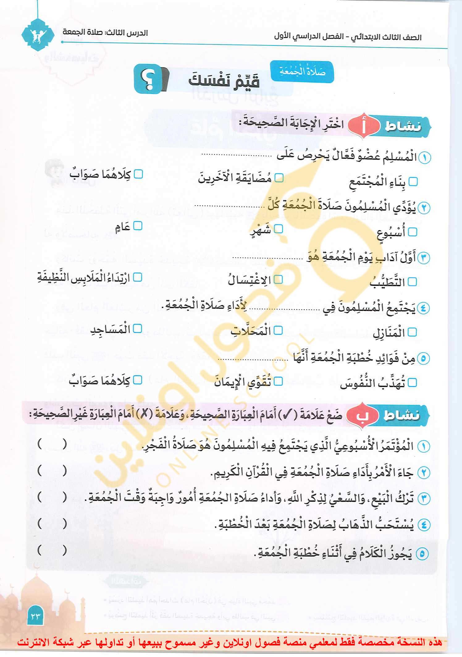 الدرس\ آية الكرسي وصلاة الإستخارة الواجب\ حل تدريبات الكتاب صفحة ( 22و28و29 )