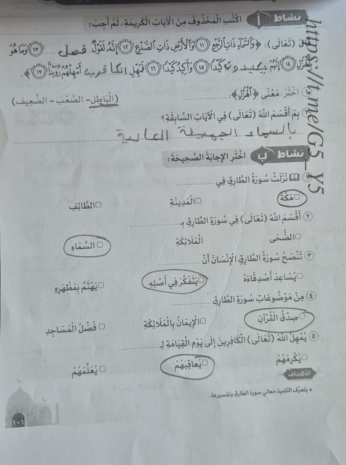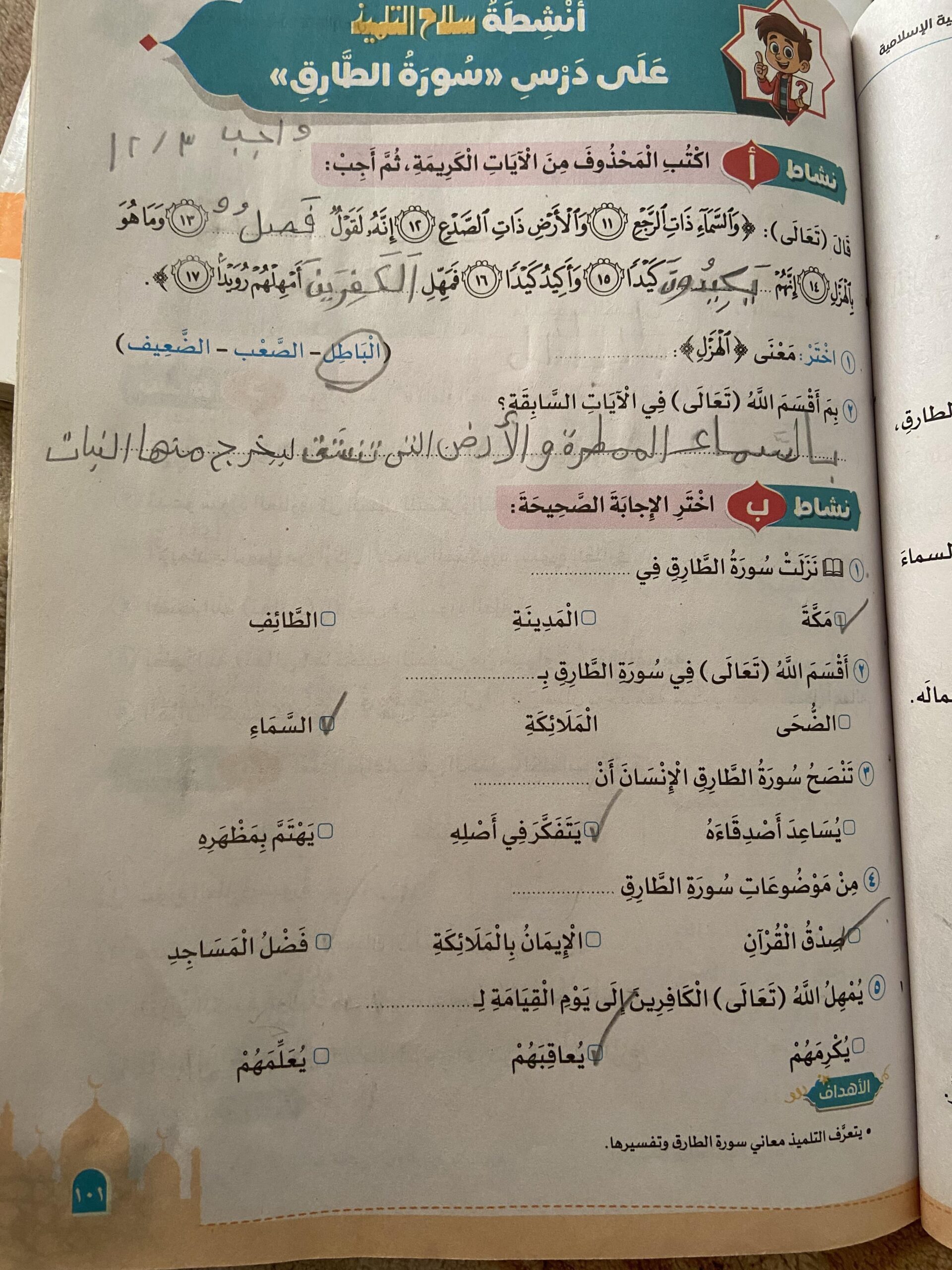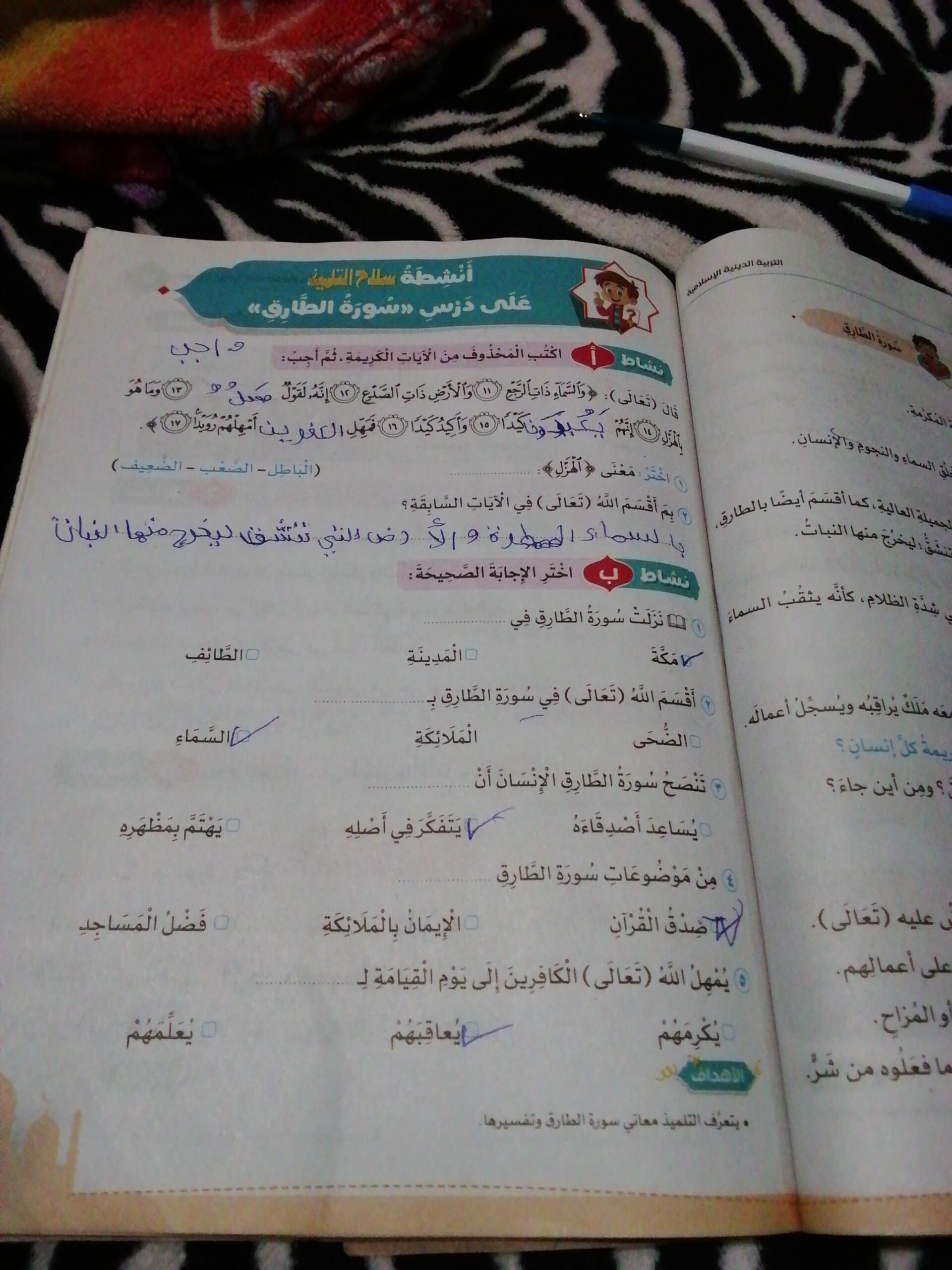 الواجب/ مذاكرة الدرس جيدا وحفظ سورة الطارق