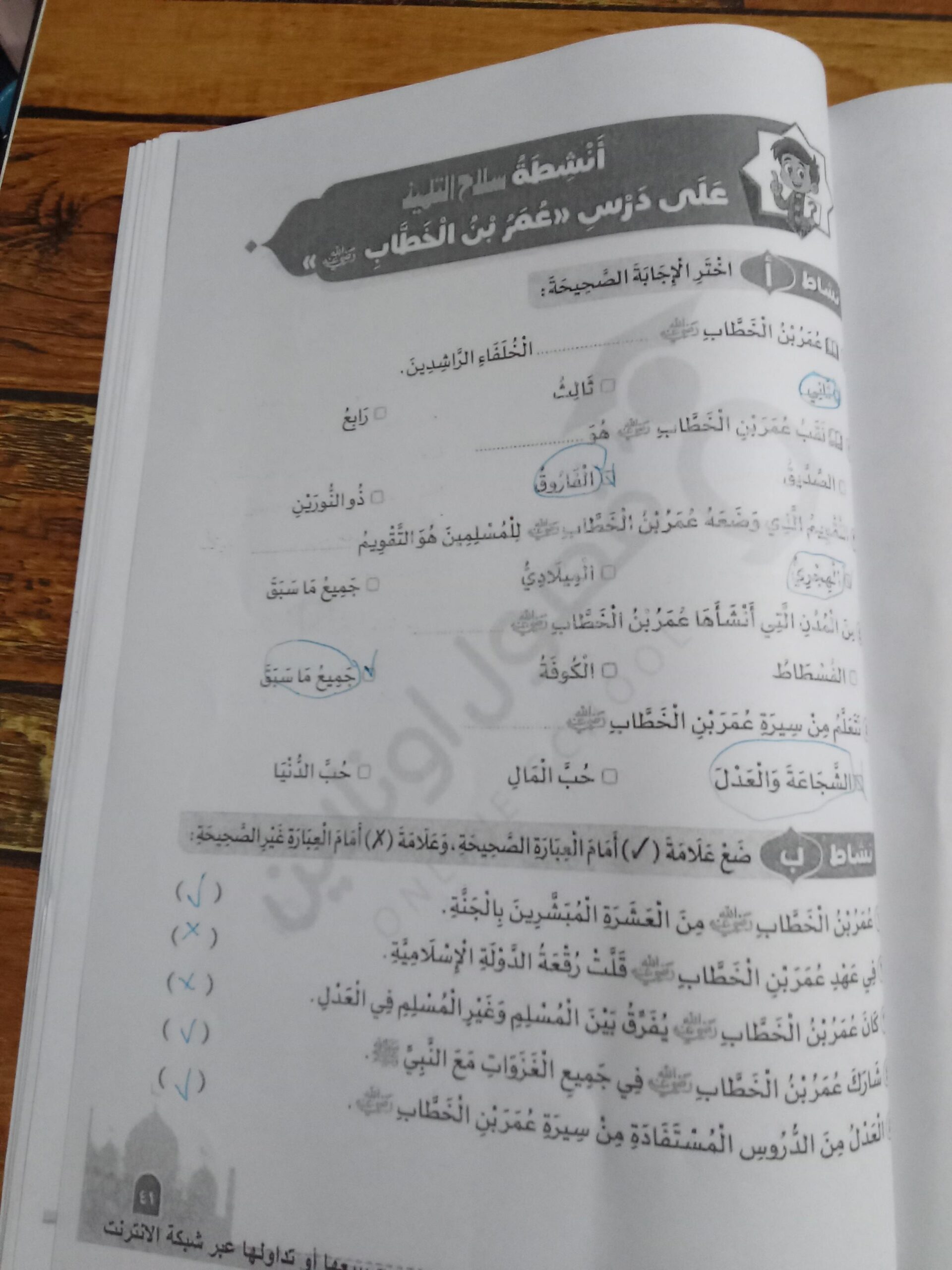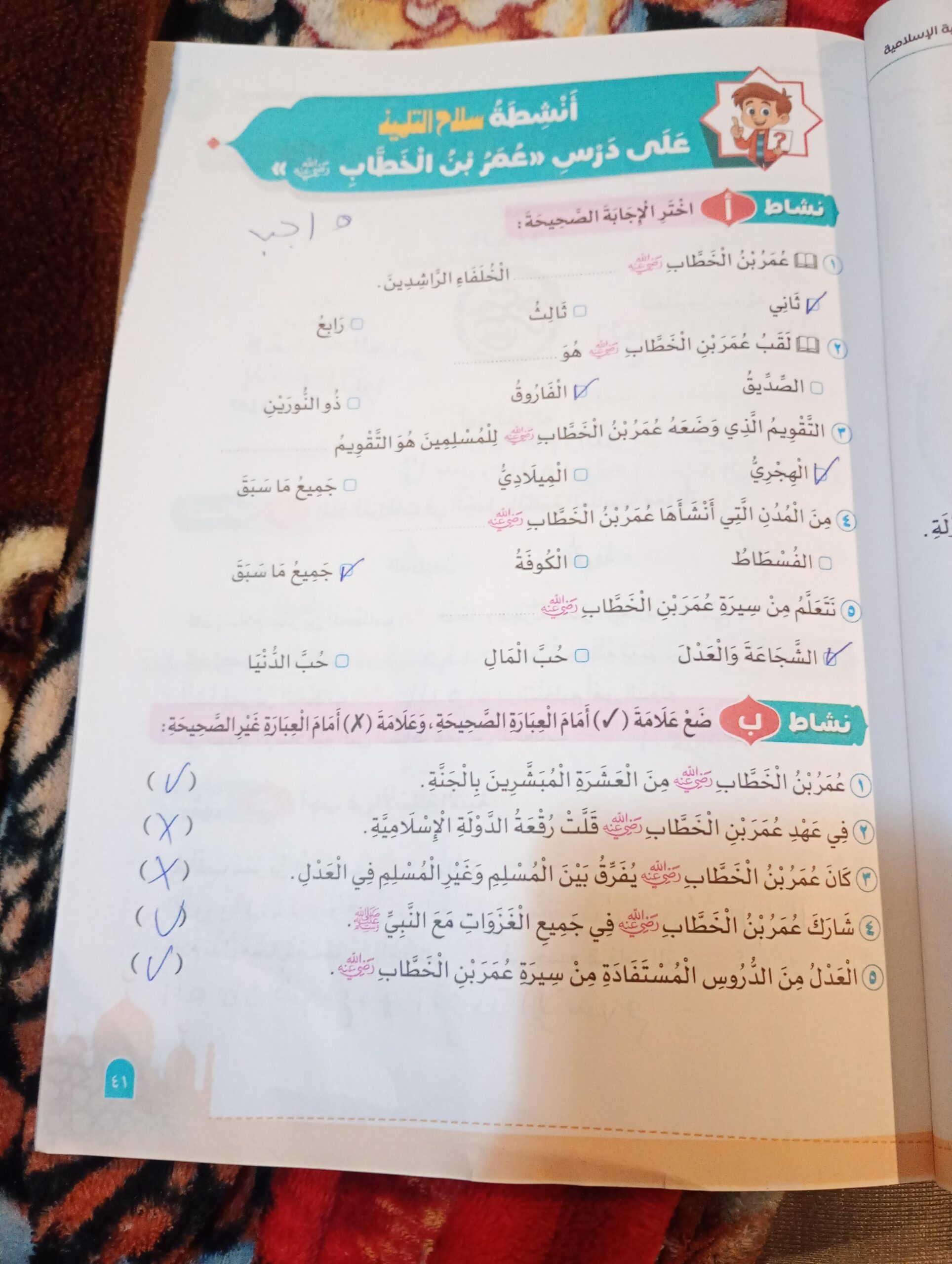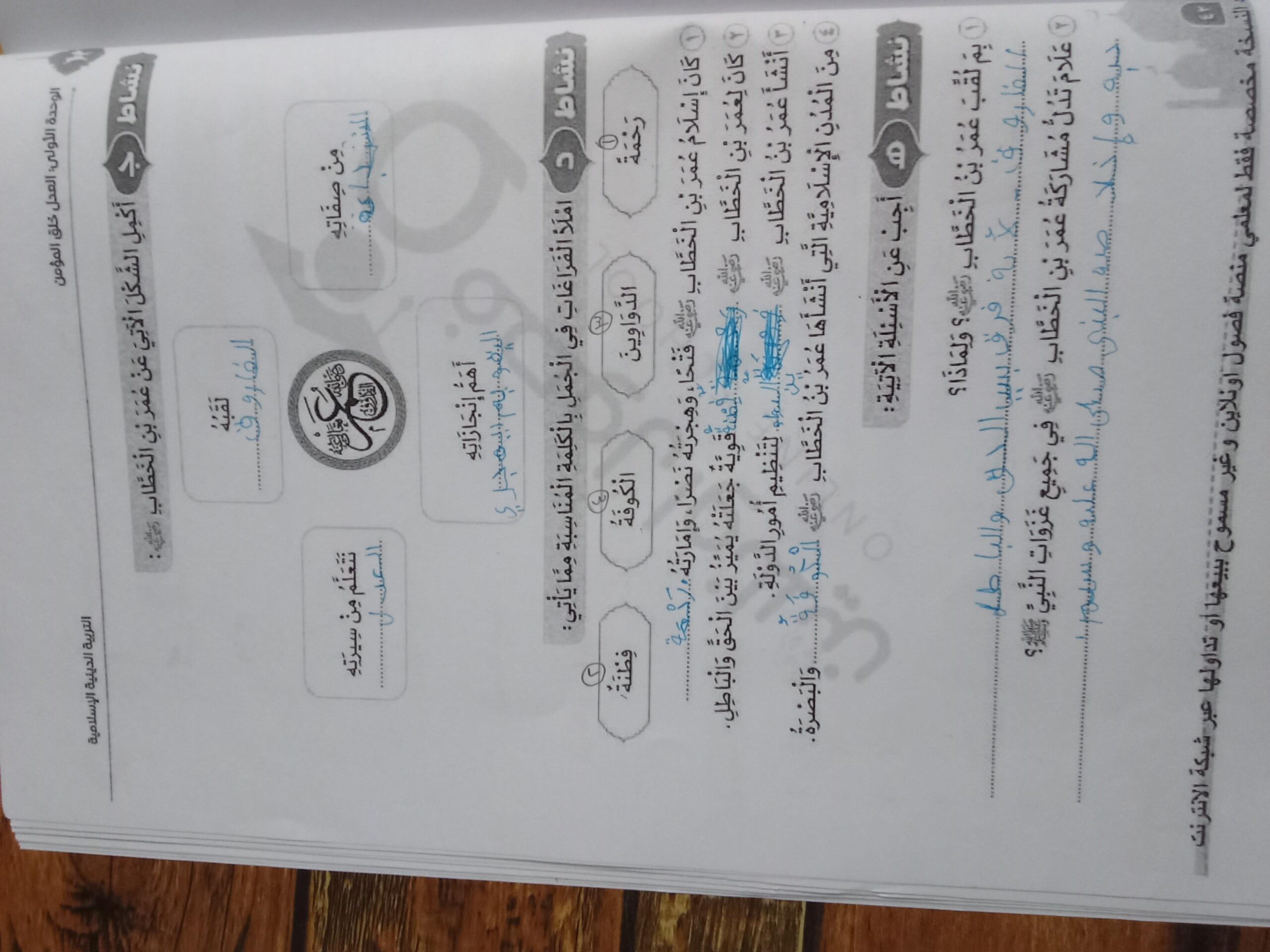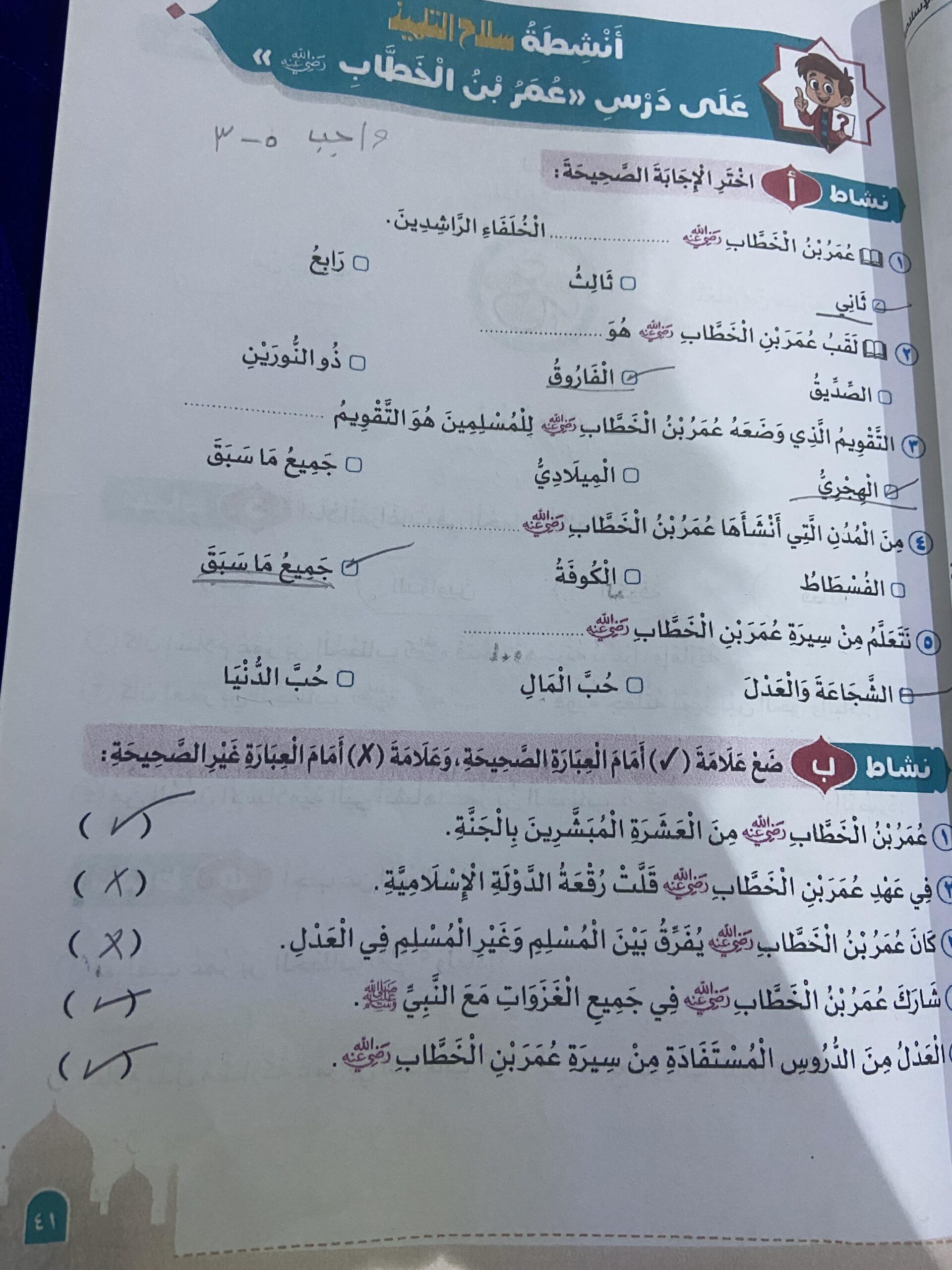 الدرس/عمر بن الخطاب رضي الله عنه الواجب/مذاكرة الدرس جيدا+حل تدريبات الكتاب صفحة ٤١ و ٤٢