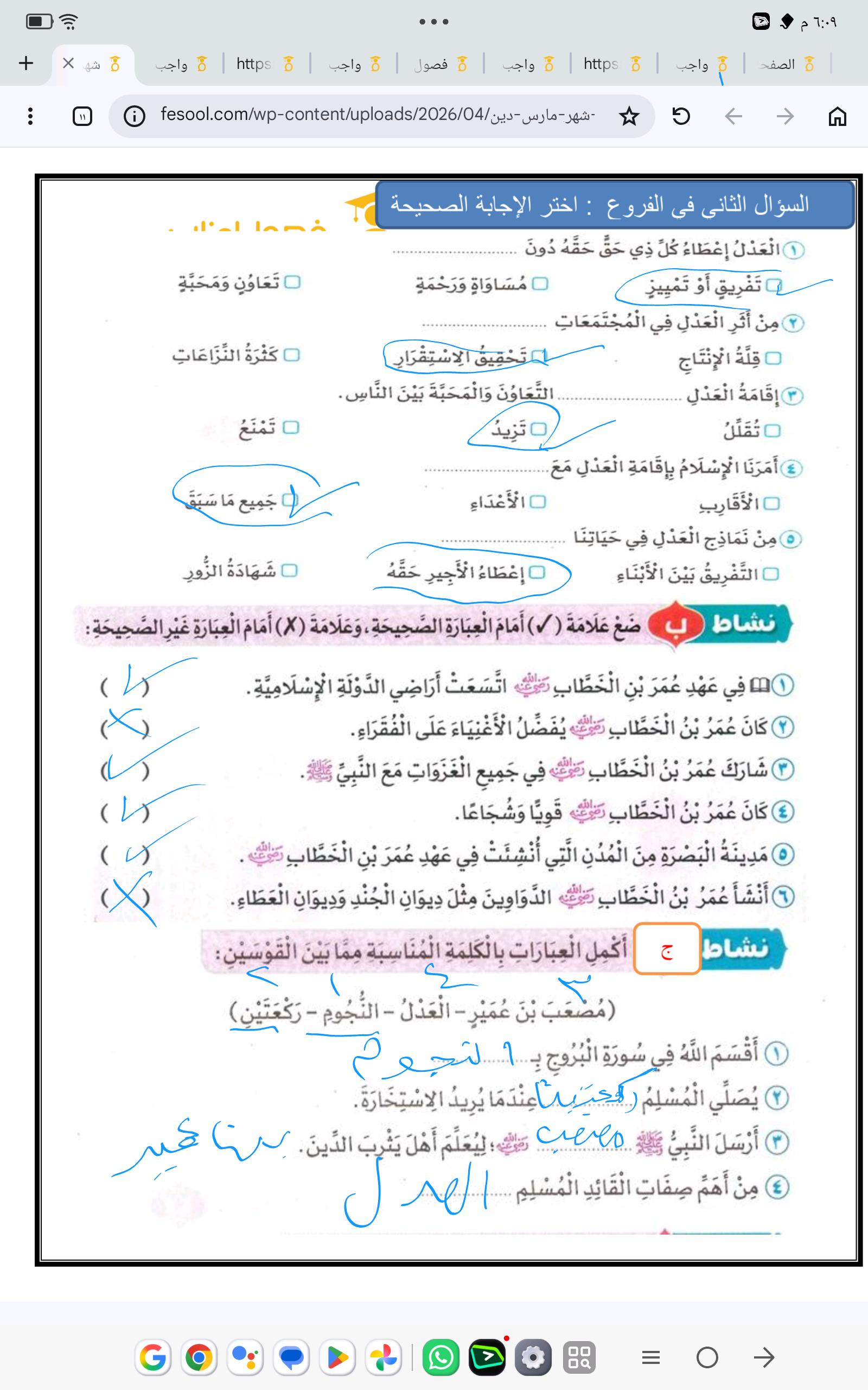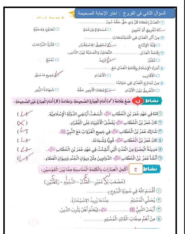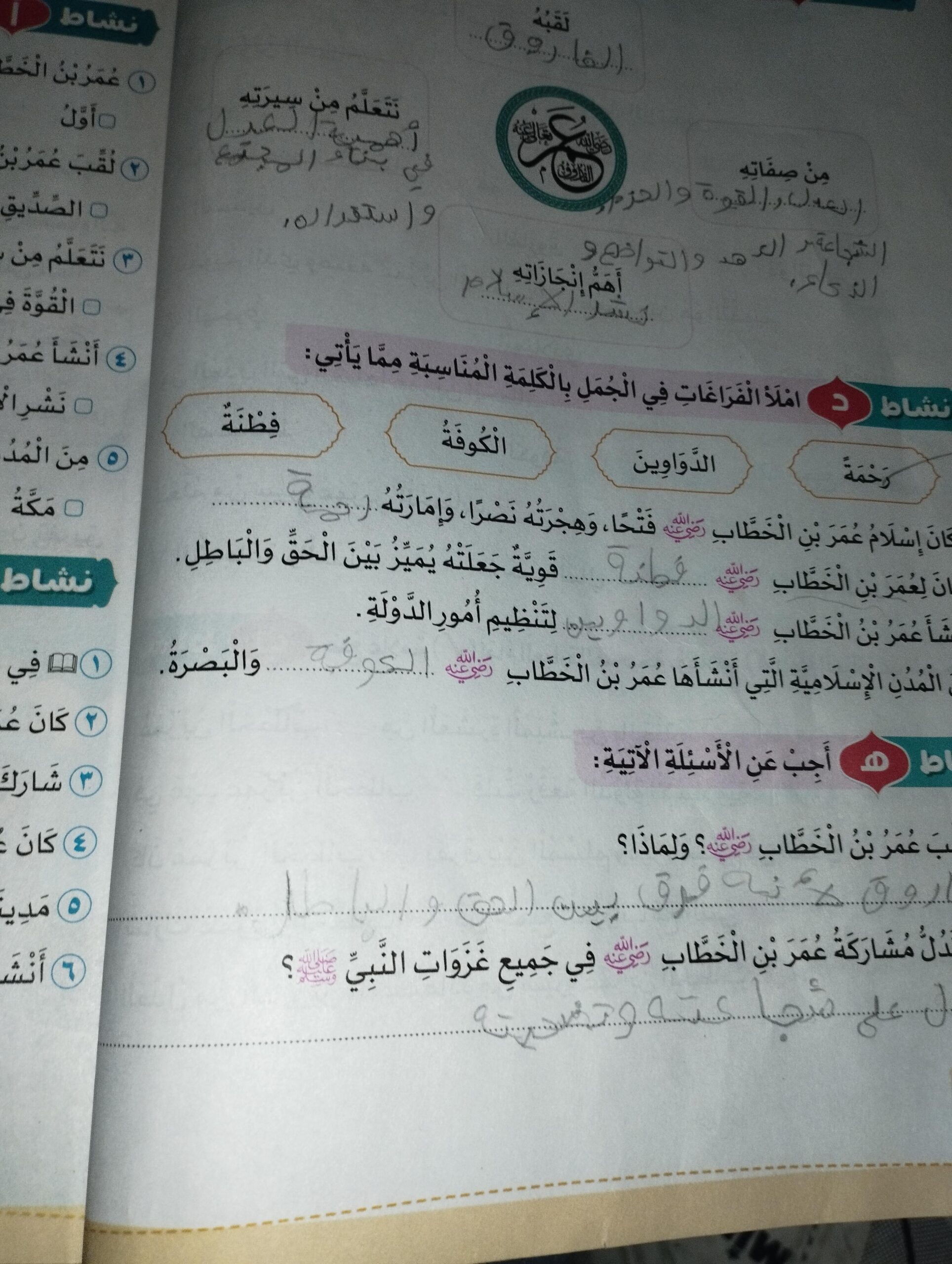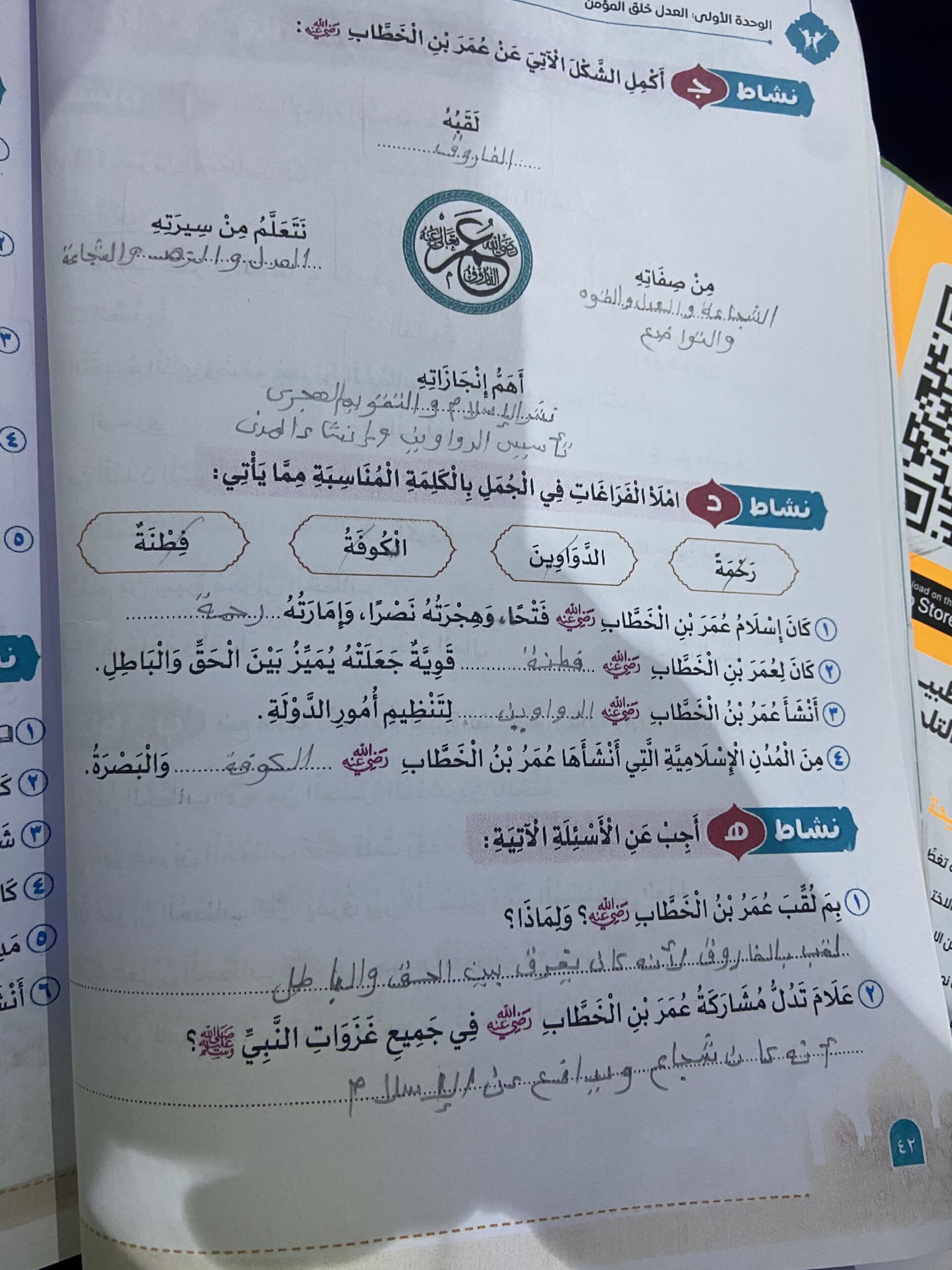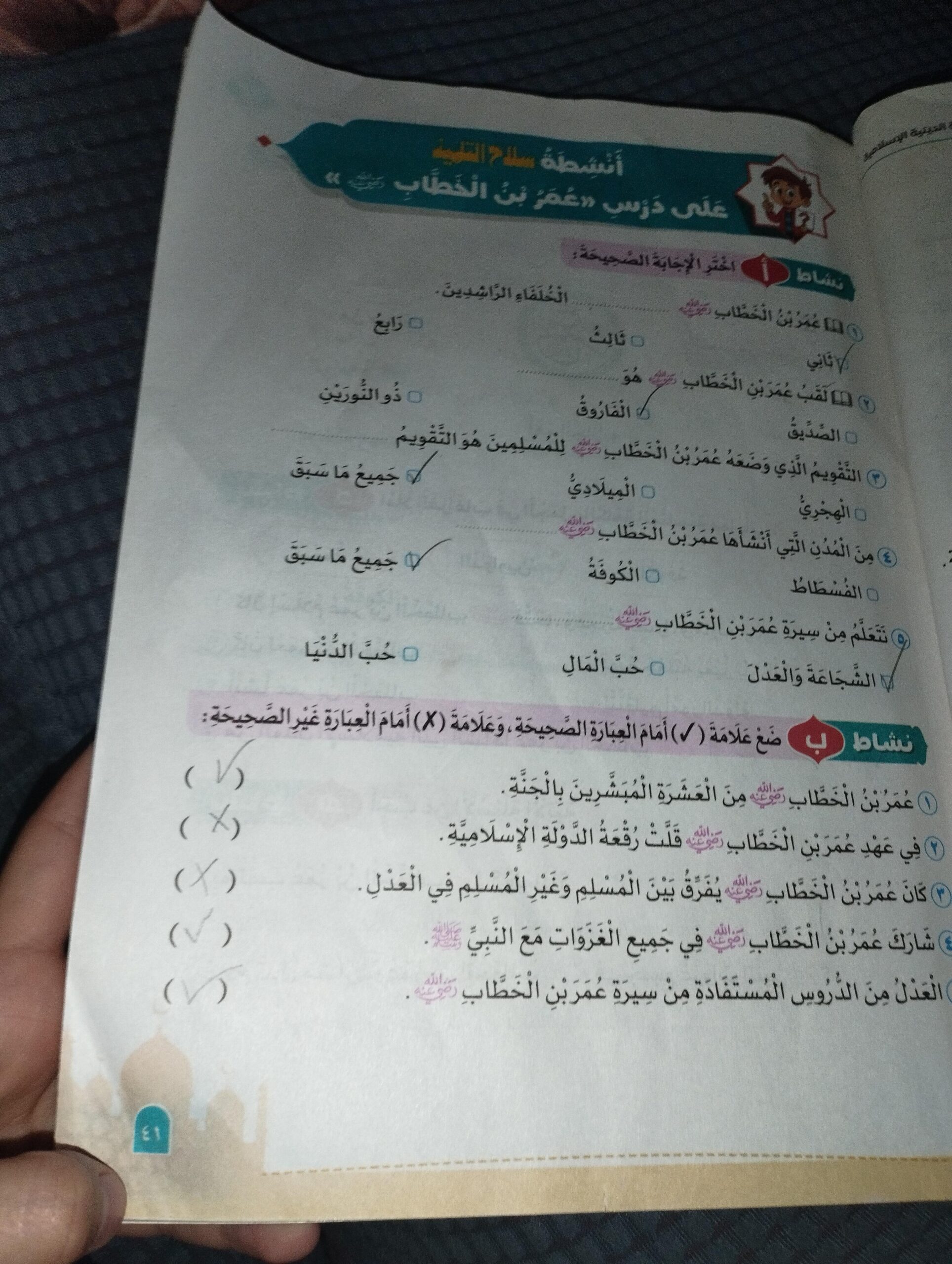 الدرس/عمر بن الخطاب رضي الله عنه الواجب/مذاكرة الدرس جيدا+حل تدريبات الكتاب صفحة ٤١ و ٤٢