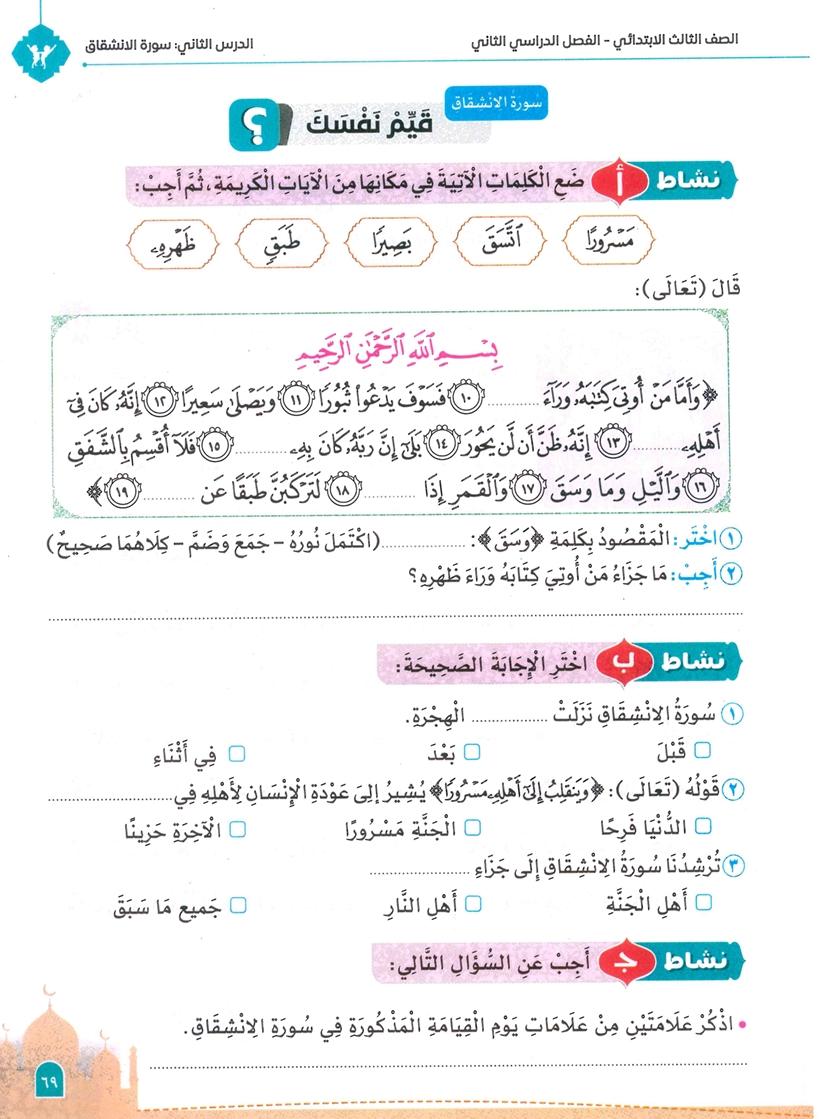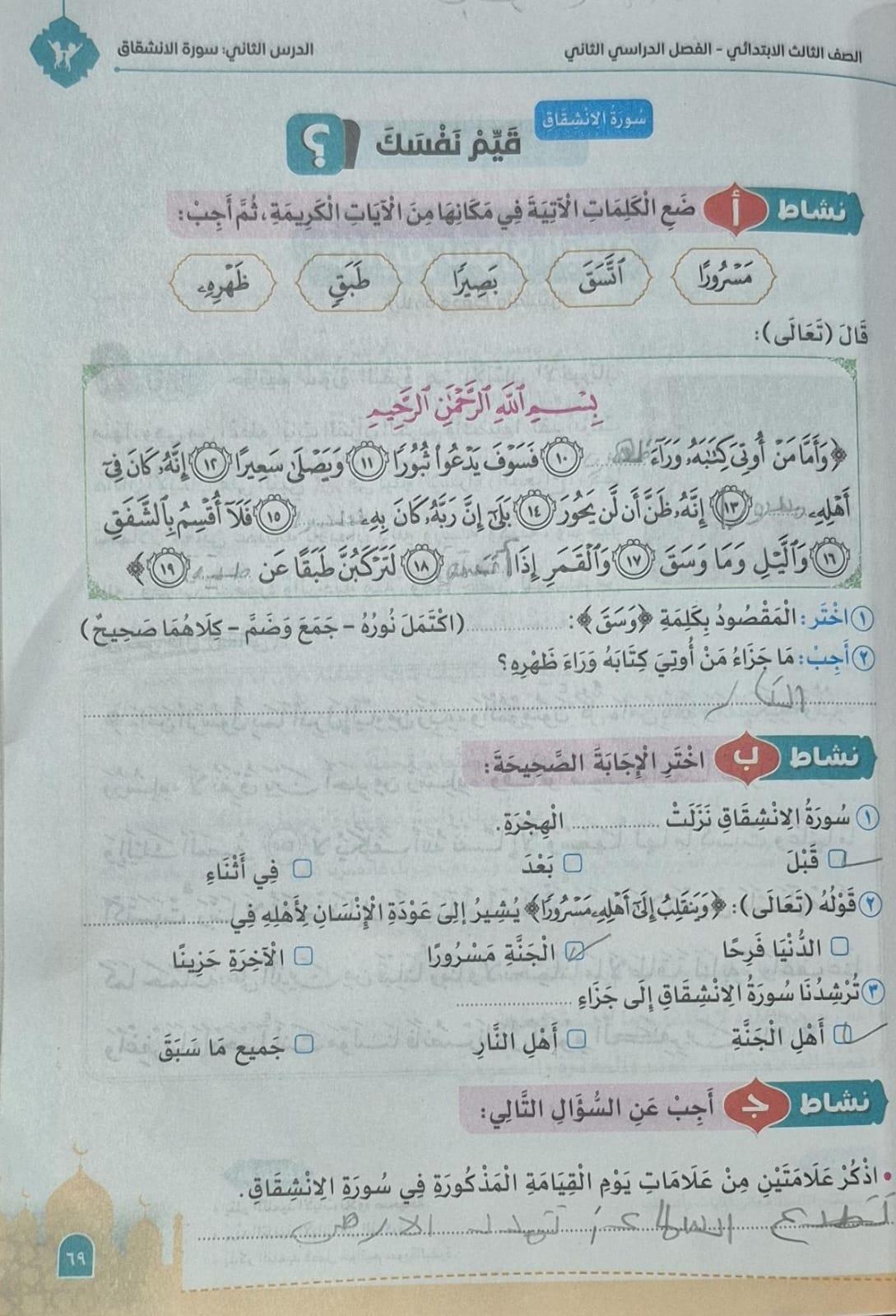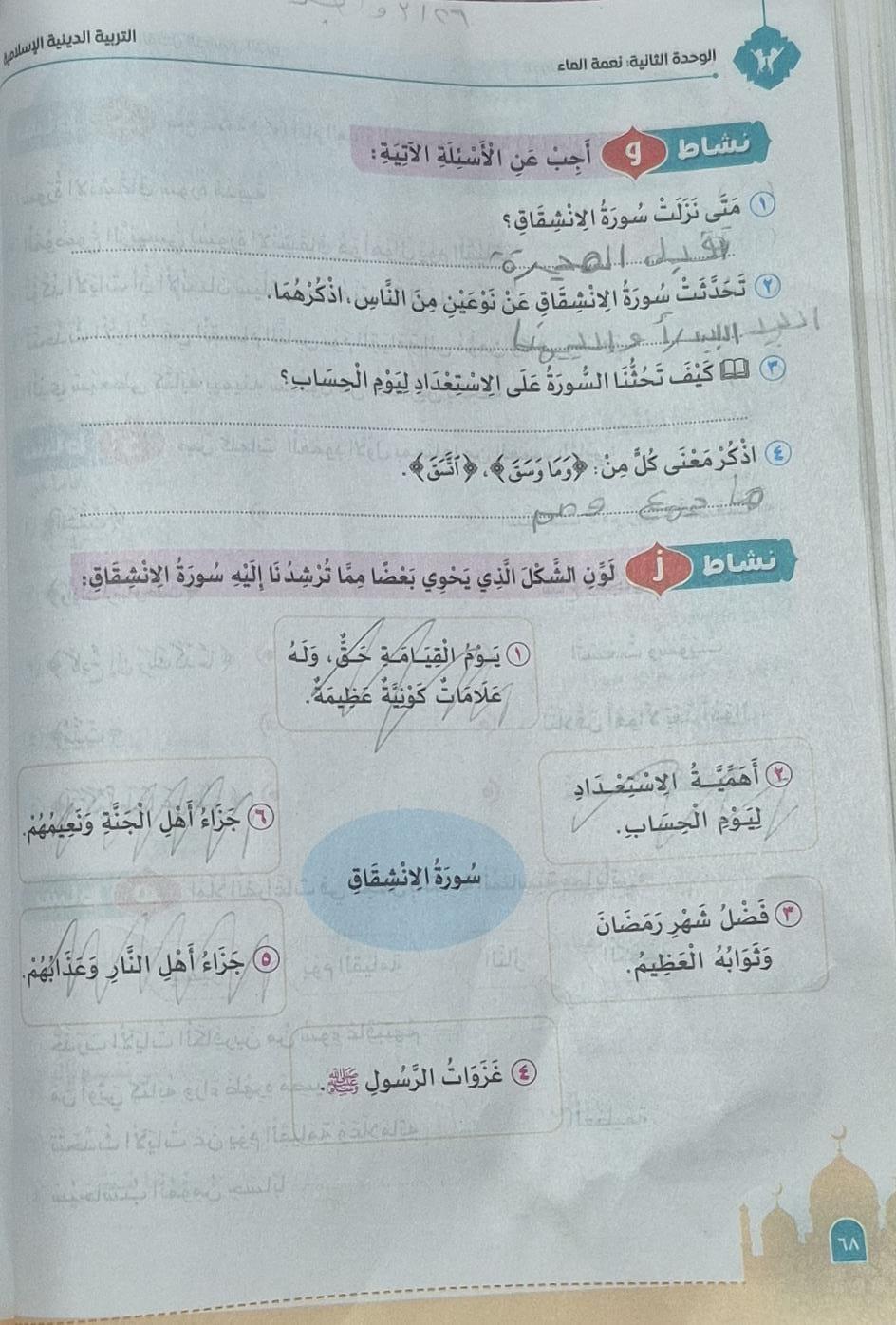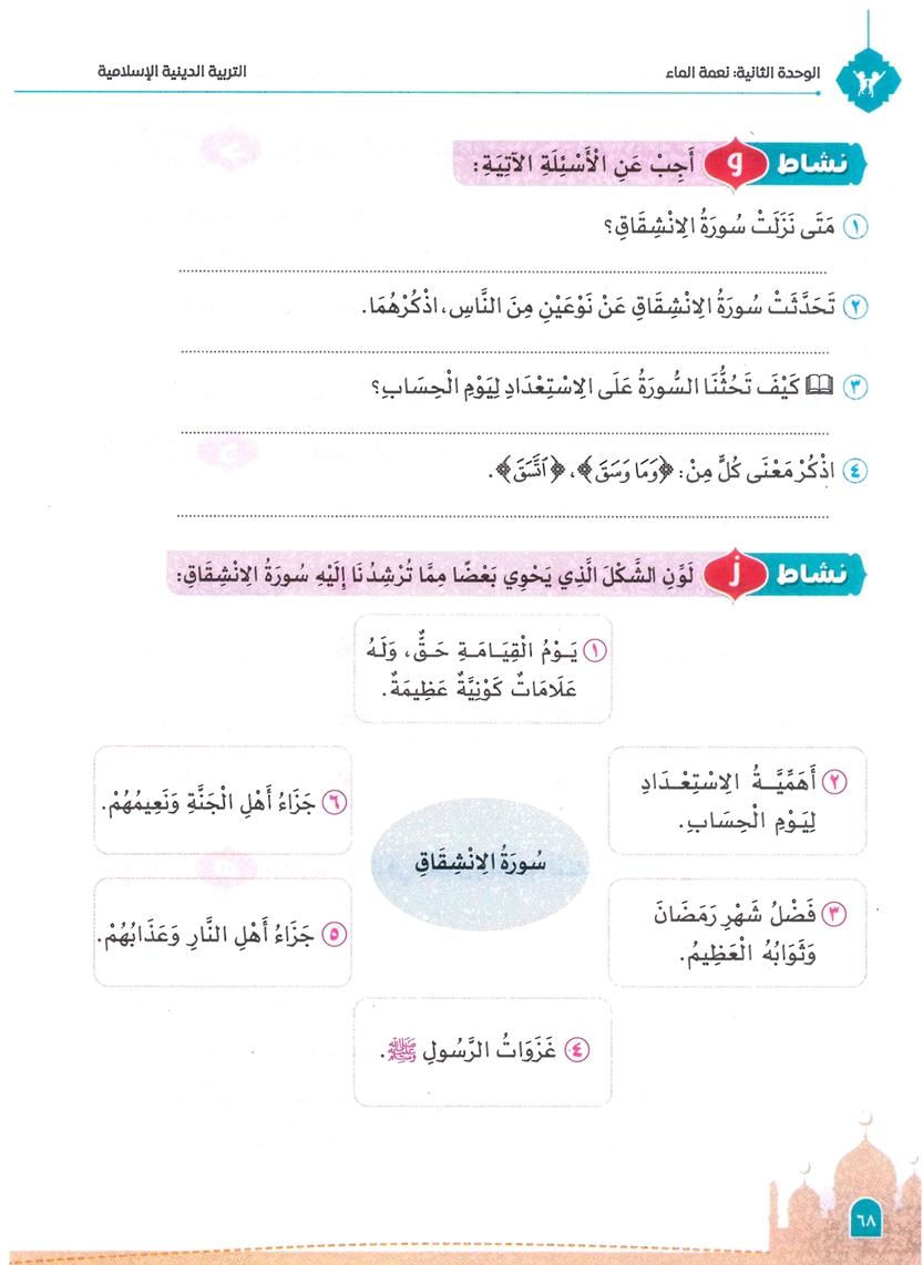 الدرس \ سورة الإنشقاق الواجب \ حل تدريبات الكتاب السؤال الأخير صفحة67 و68 و69