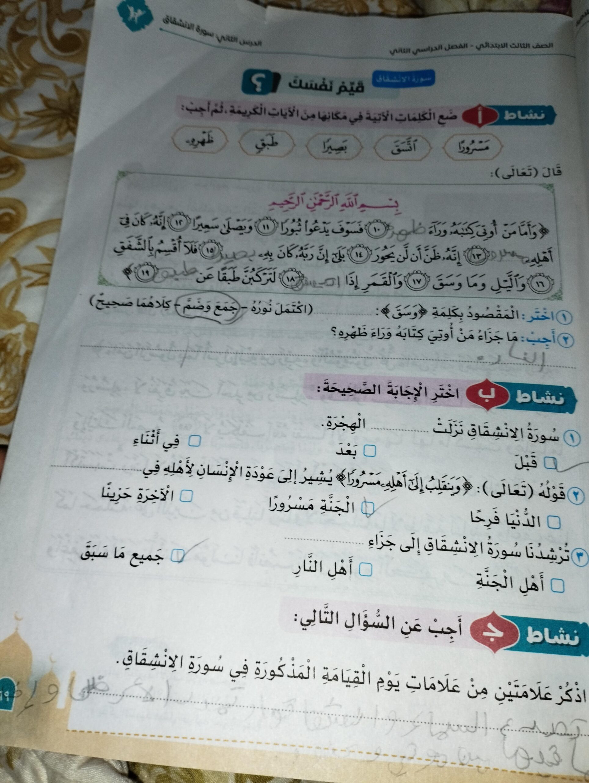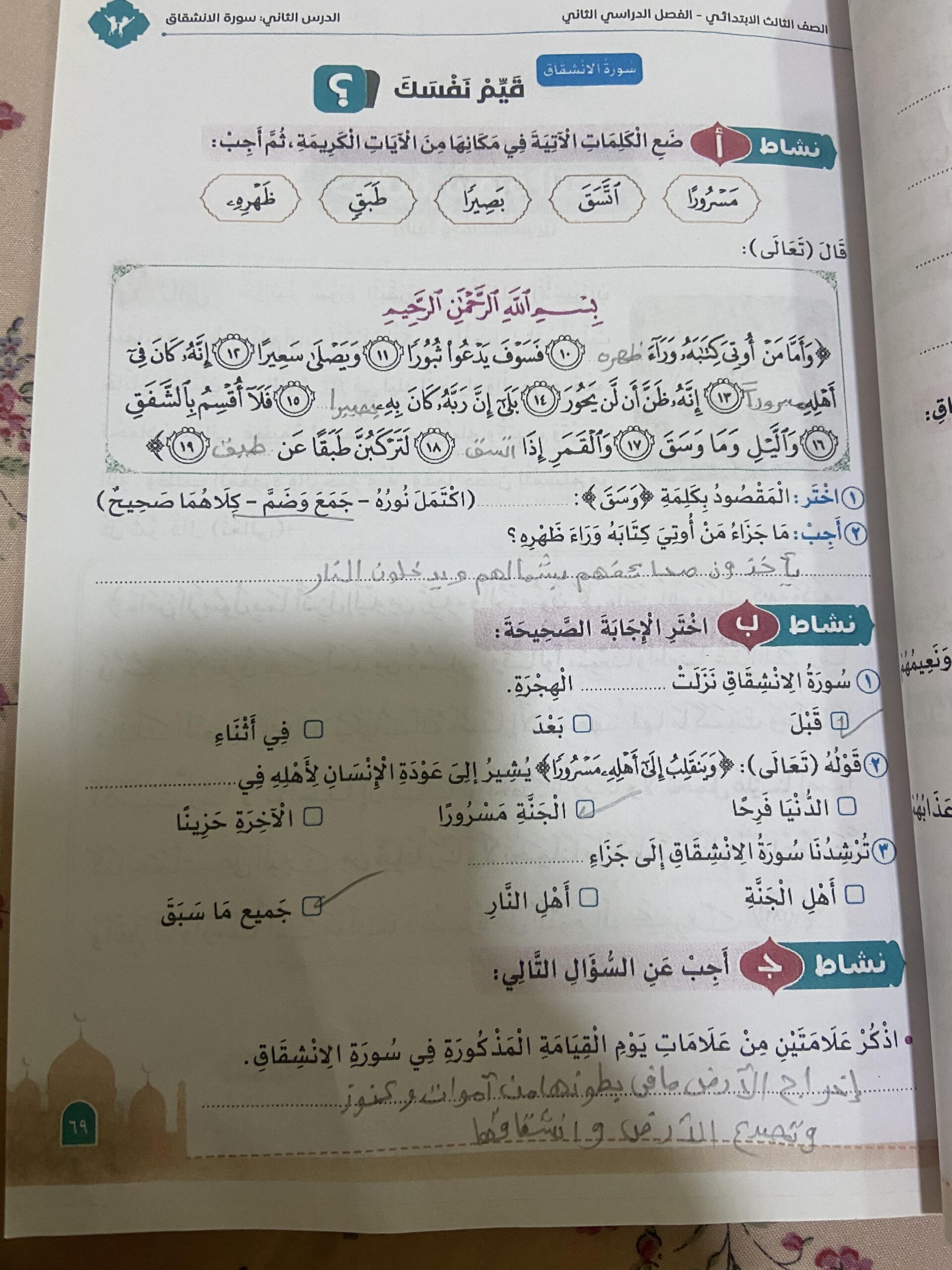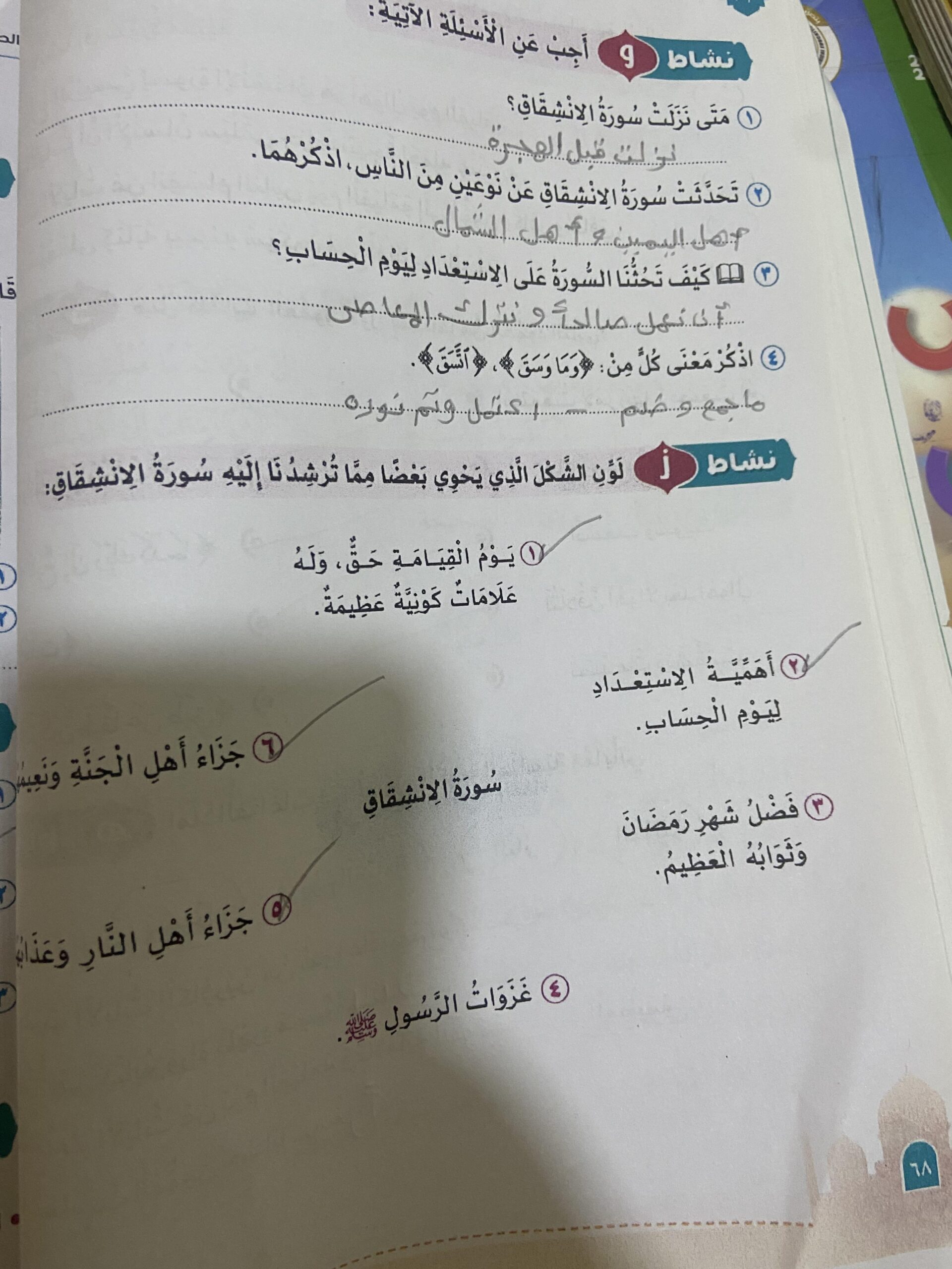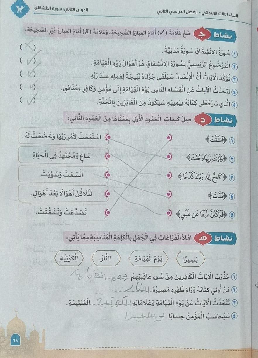 الدرس \ سورة الإنشقاق الواجب \ حل تدريبات الكتاب السؤال الأخير صفحة67 و68 و69