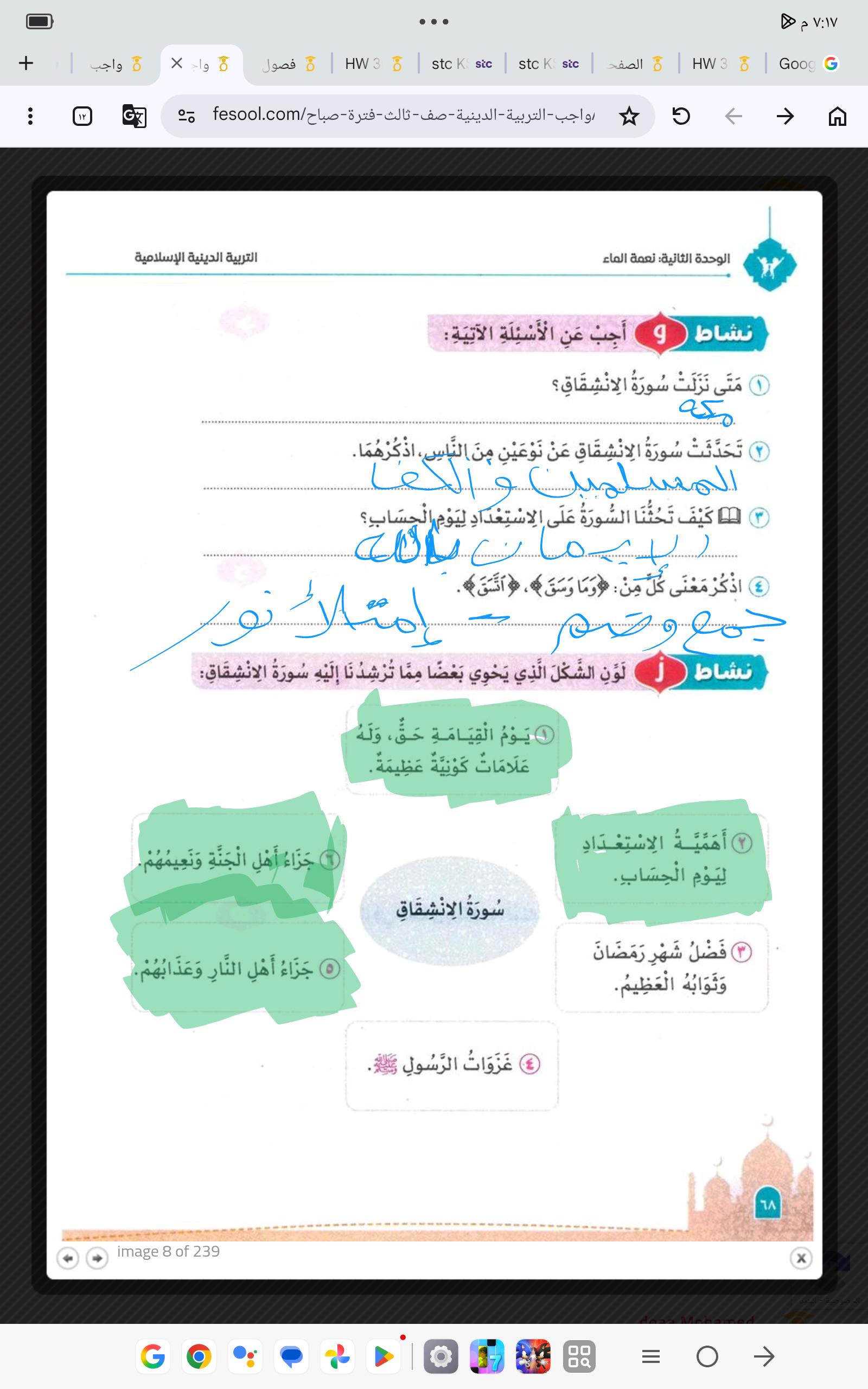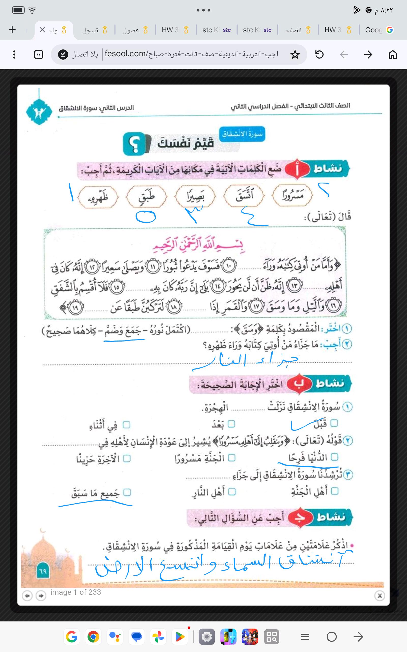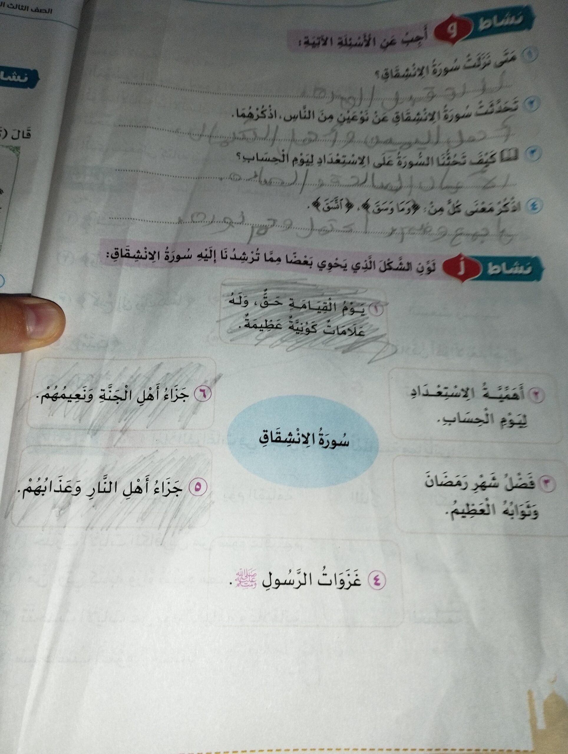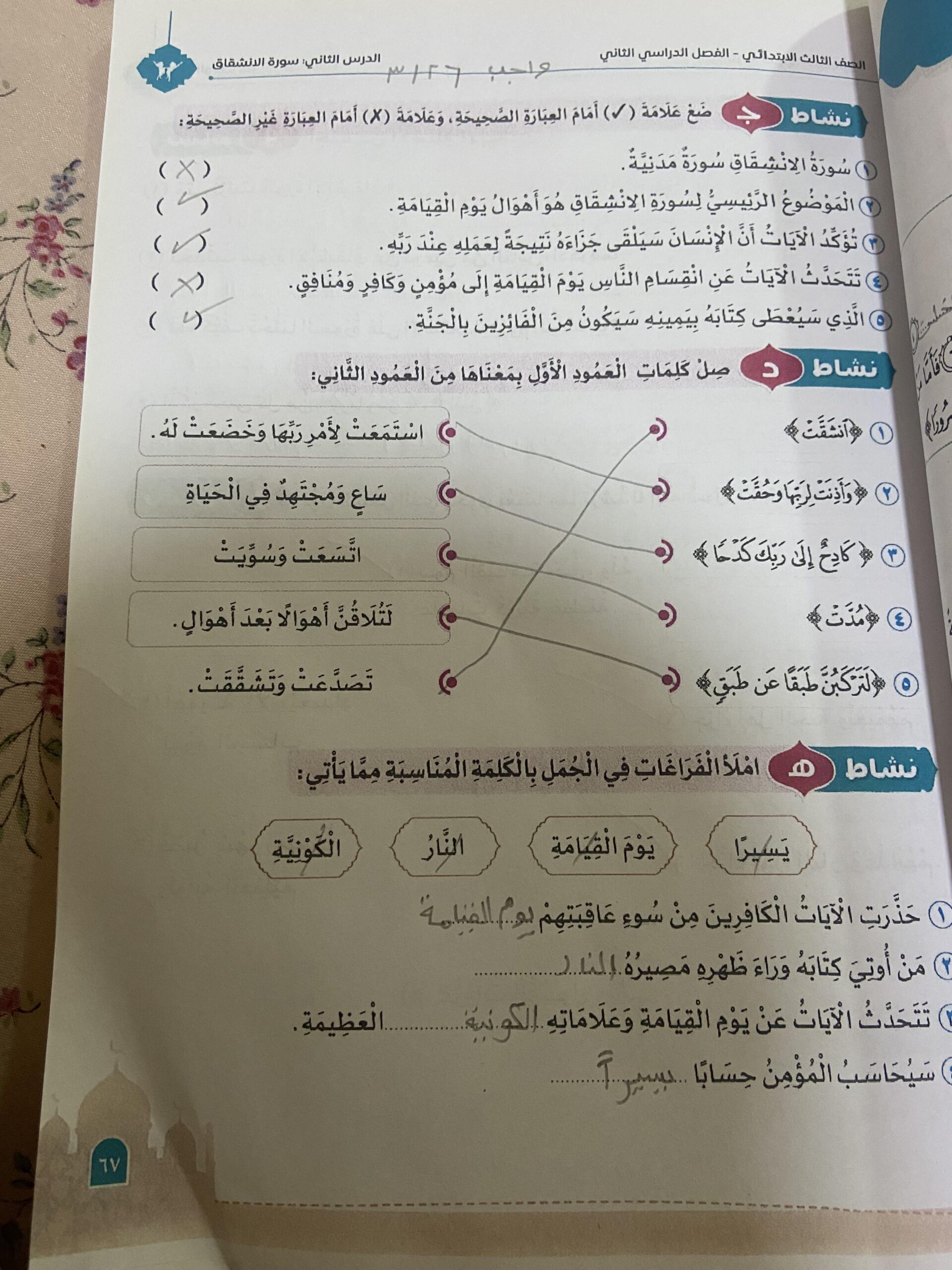 الدرس \ سورة الإنشقاق الواجب \ حل تدريبات الكتاب السؤال الأخير صفحة67 و68 و69