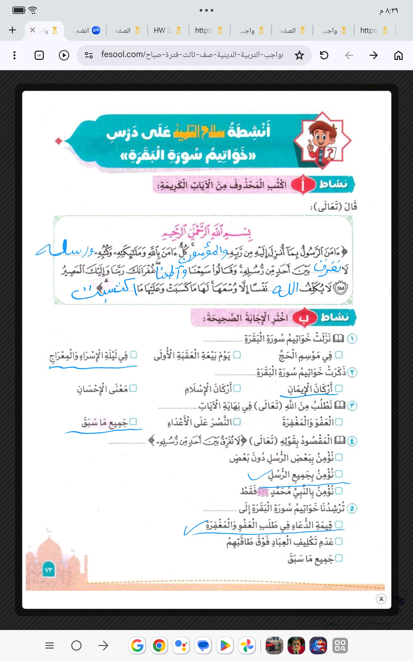الدرس ( خواتيم سورة البقرة الواجب ( حفظ الآيات والمعاني) + حل صفحة 73