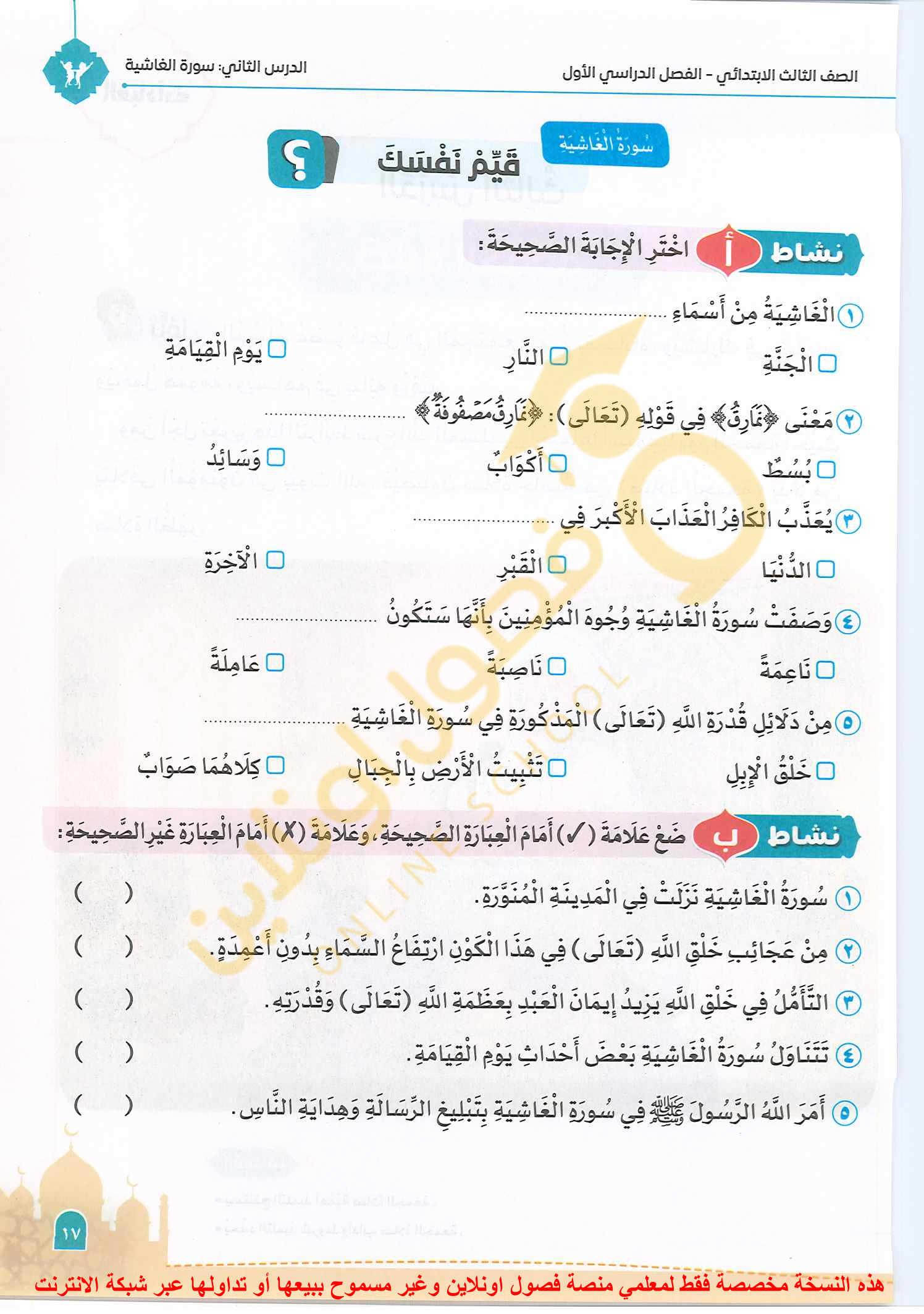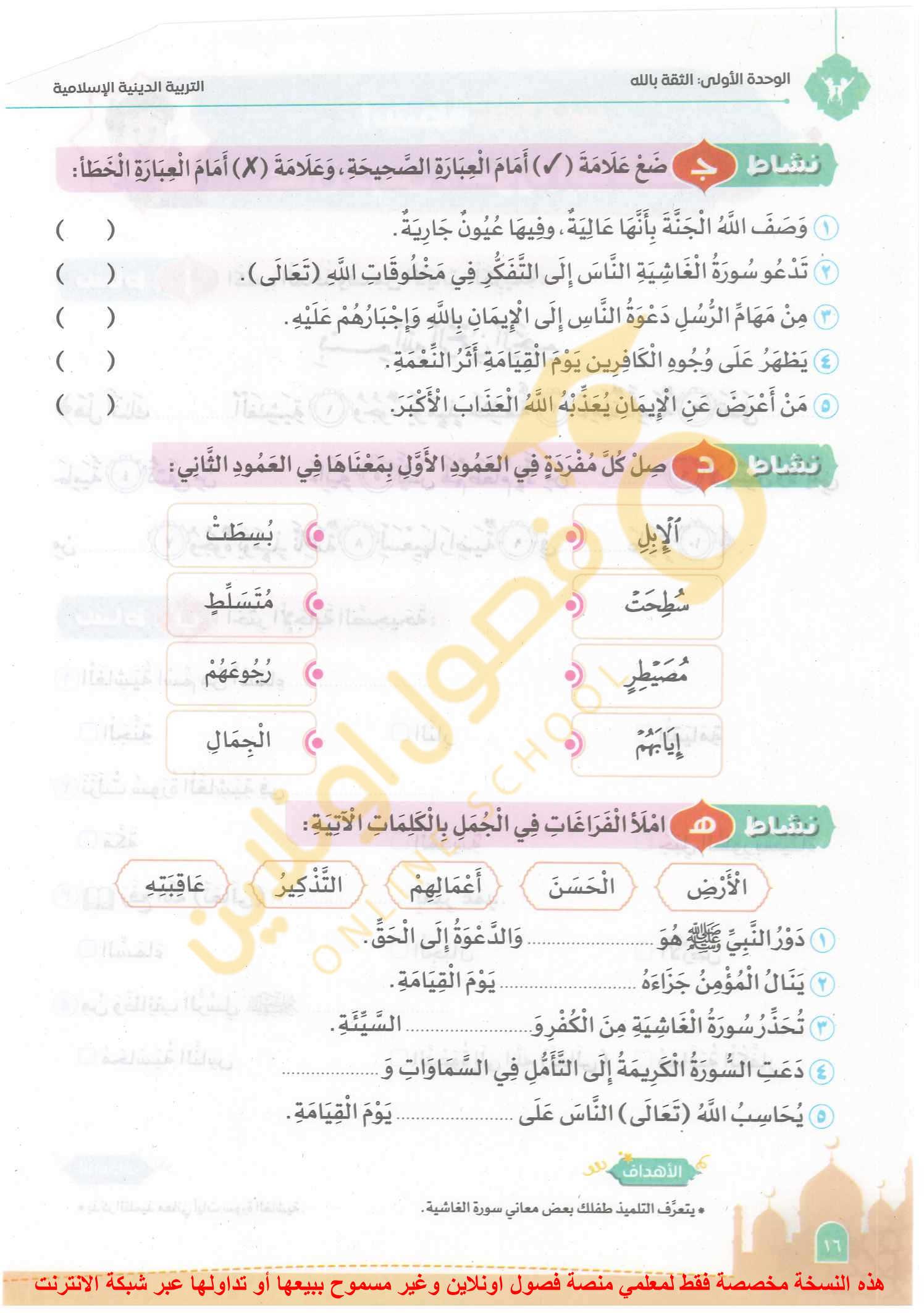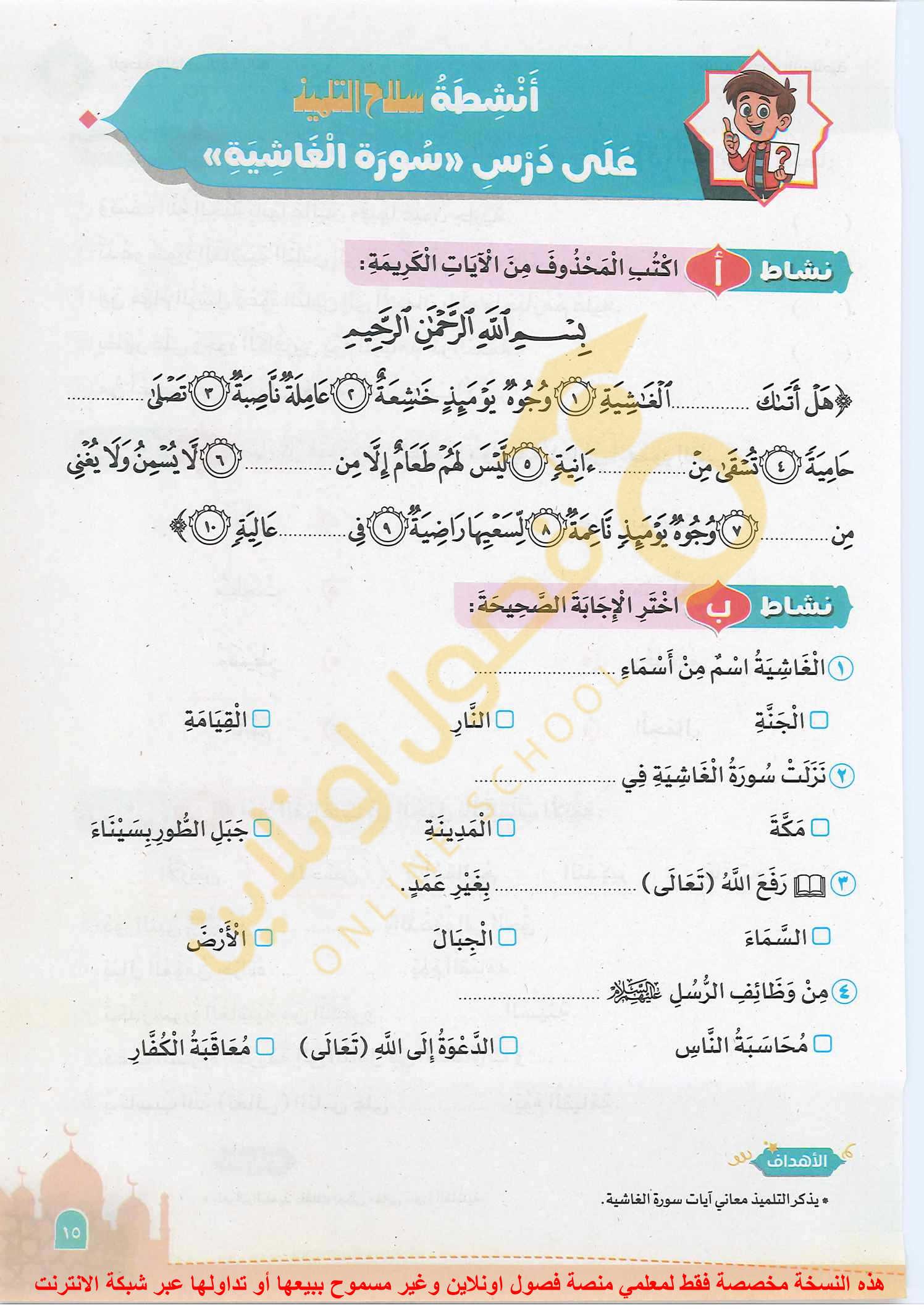 الدرس/ تم مراجعة الوحدة الأولي الواجب / حفظ سورة الغاشية بالمعاني والتفسير