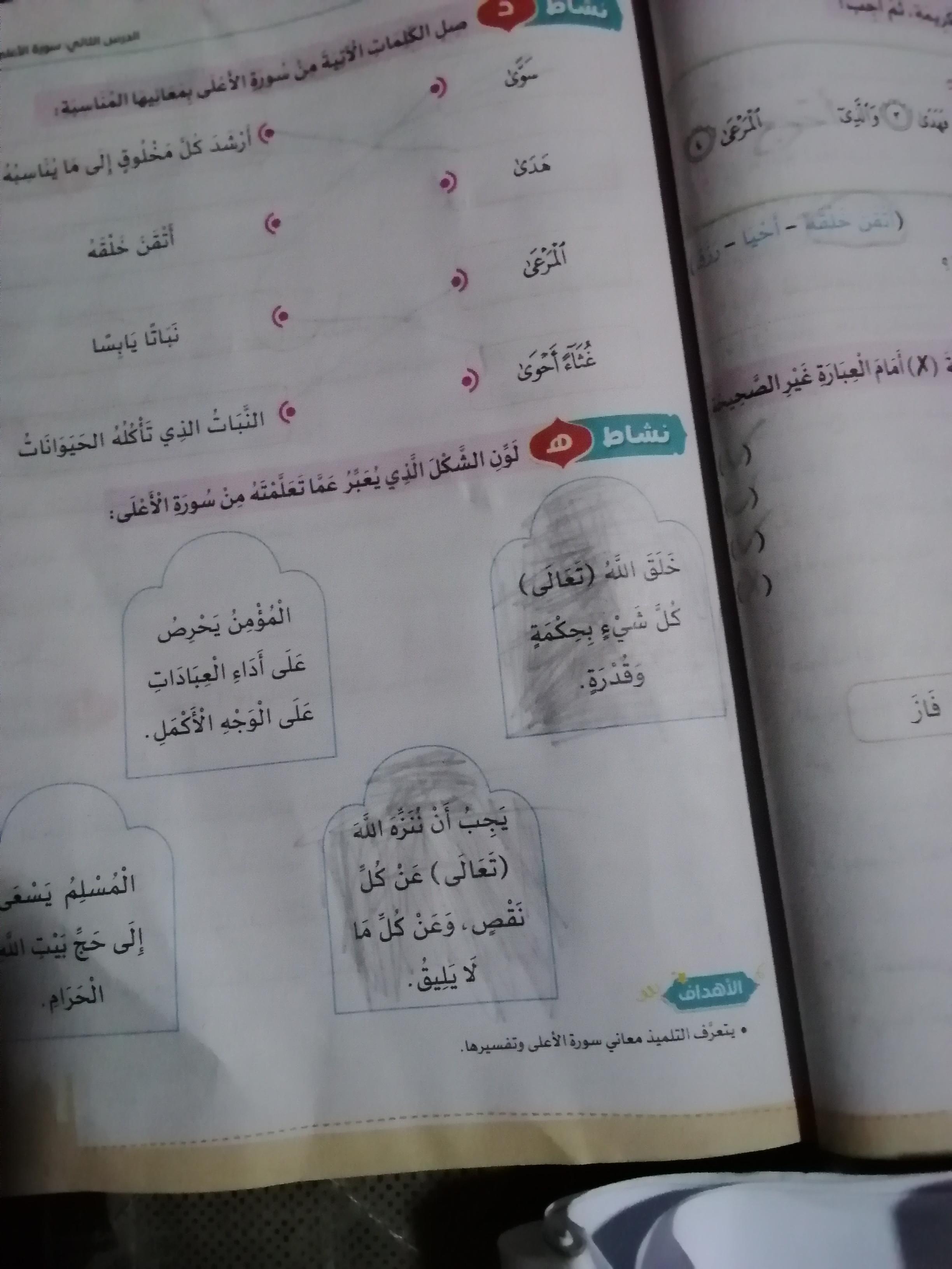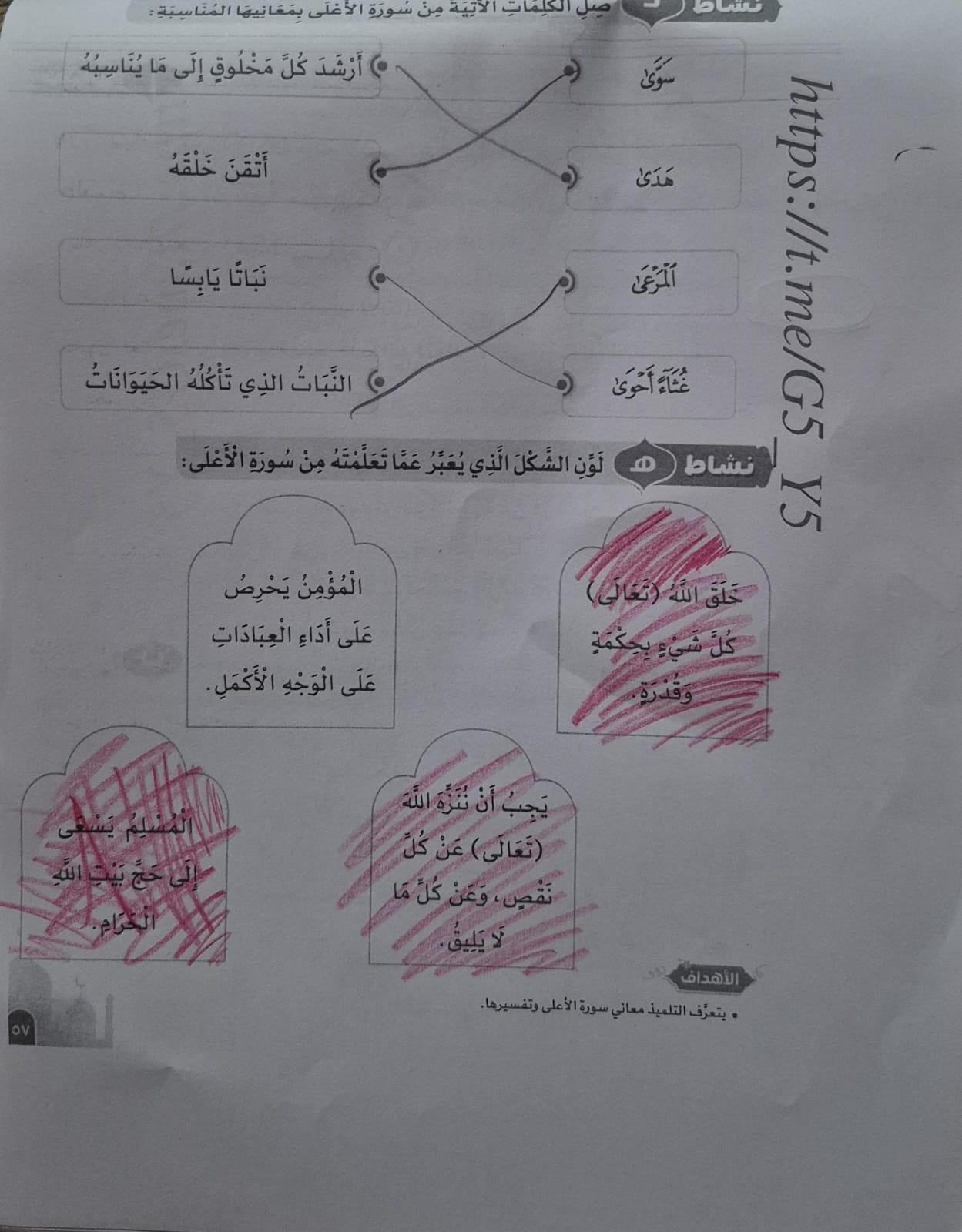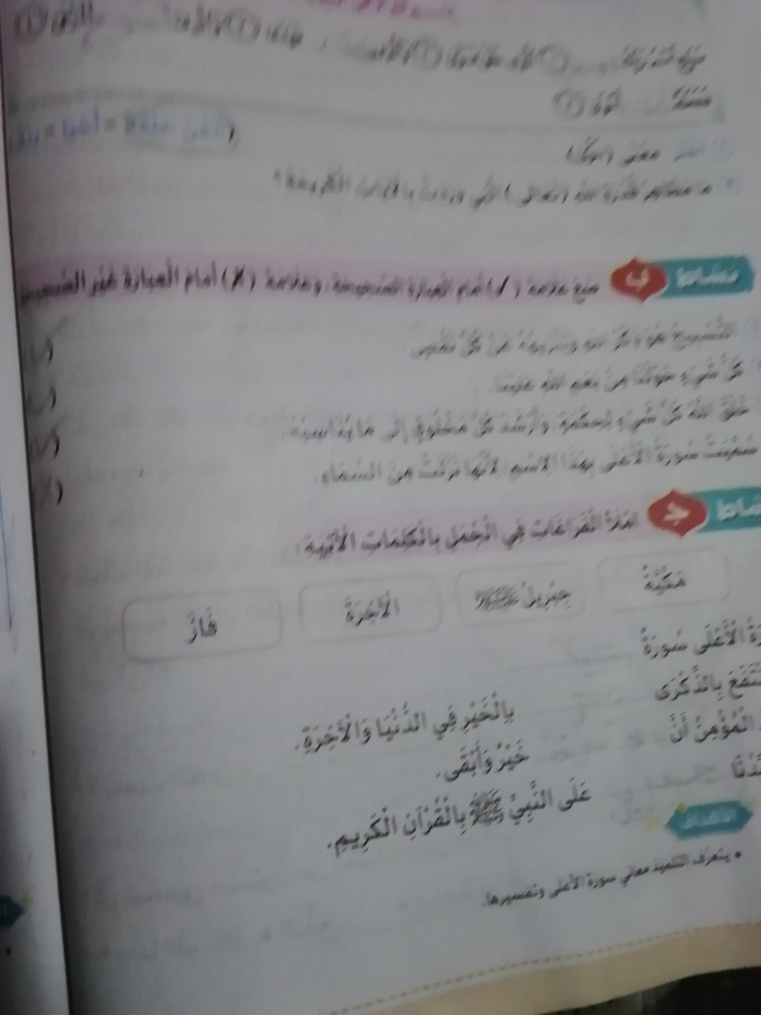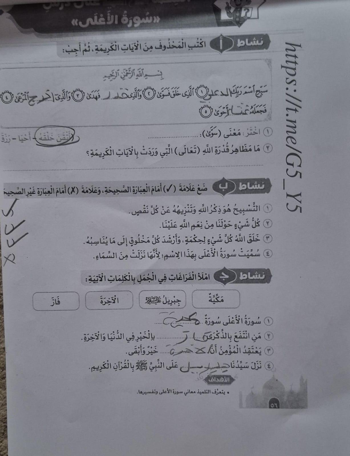 الواجب / أجب ( سورة الأعلي تتحدث عن تسبيح الله تعالي ونعمة في خلق ……………. و…………. ) + حل من صفحة 138 إلي 141