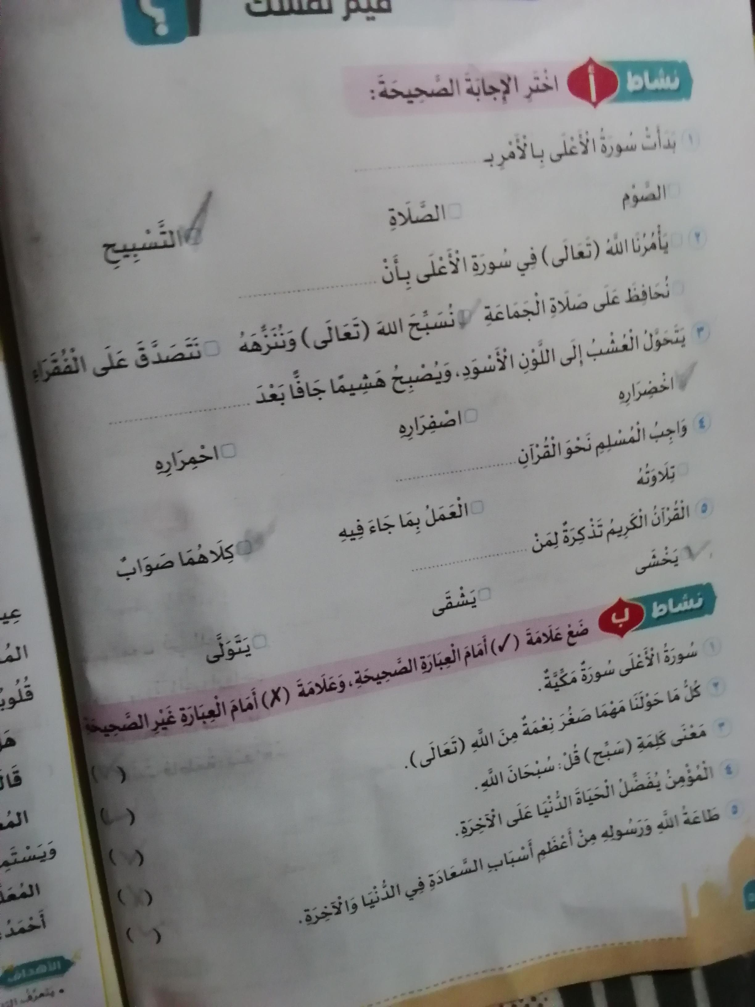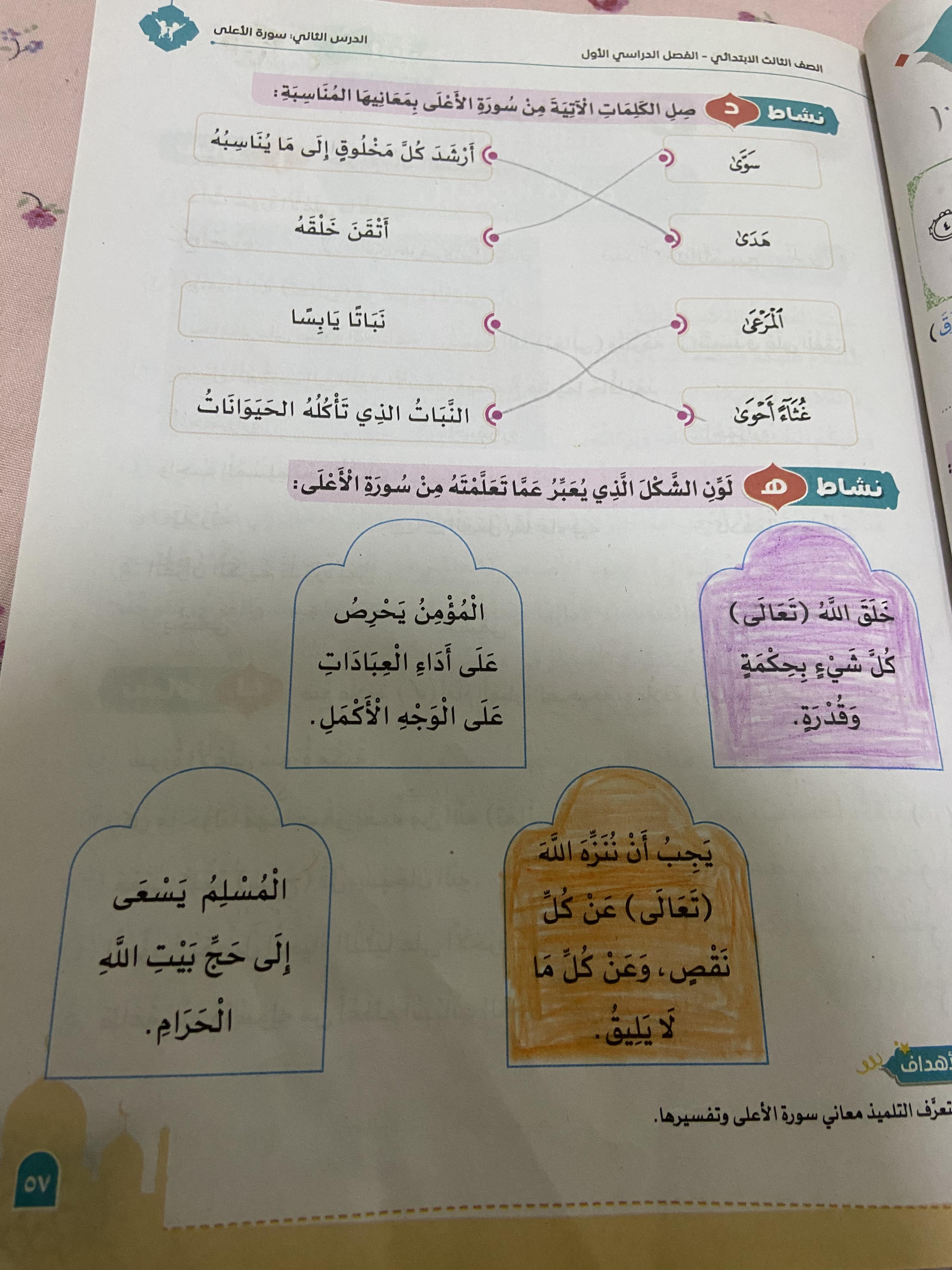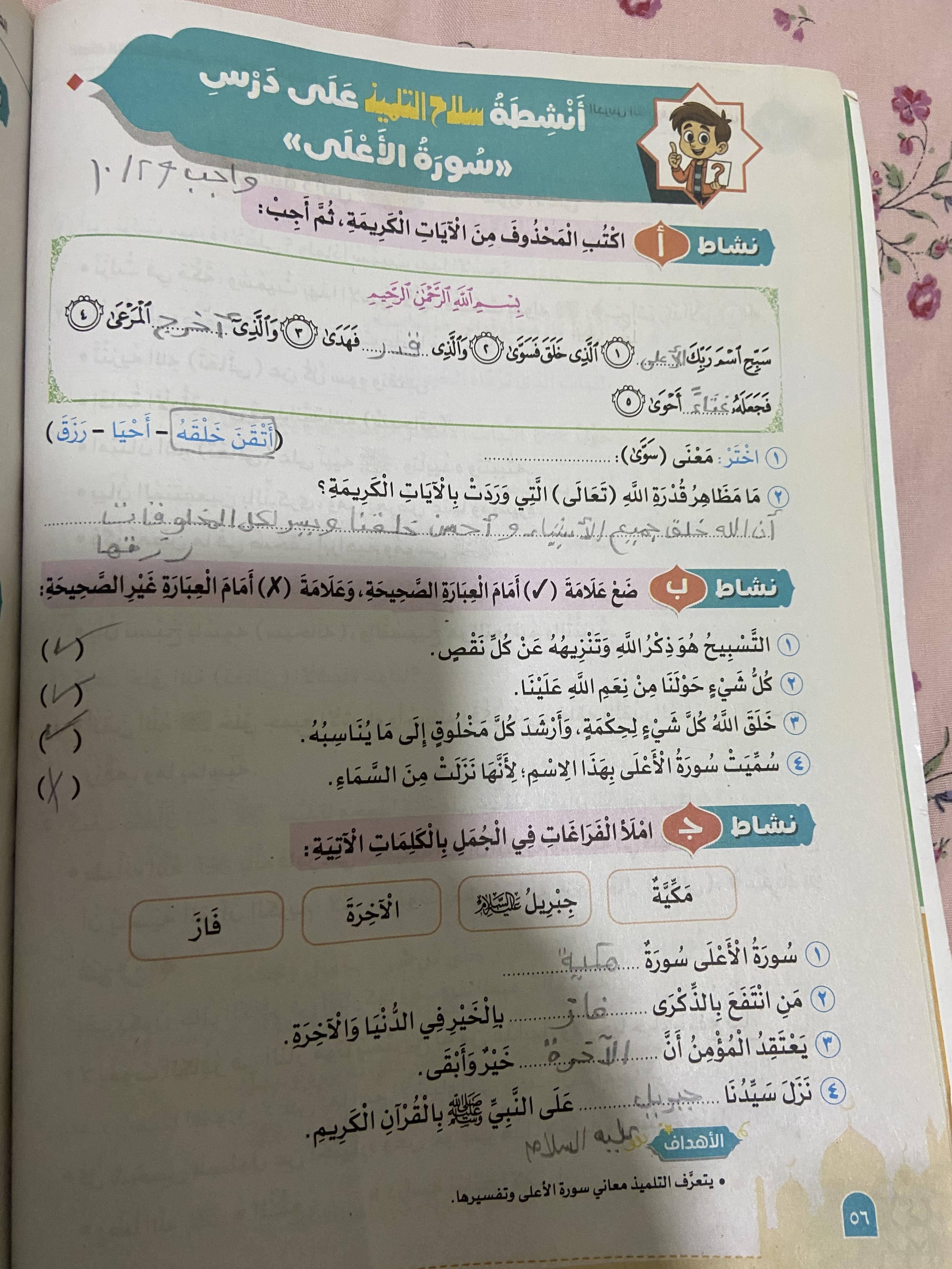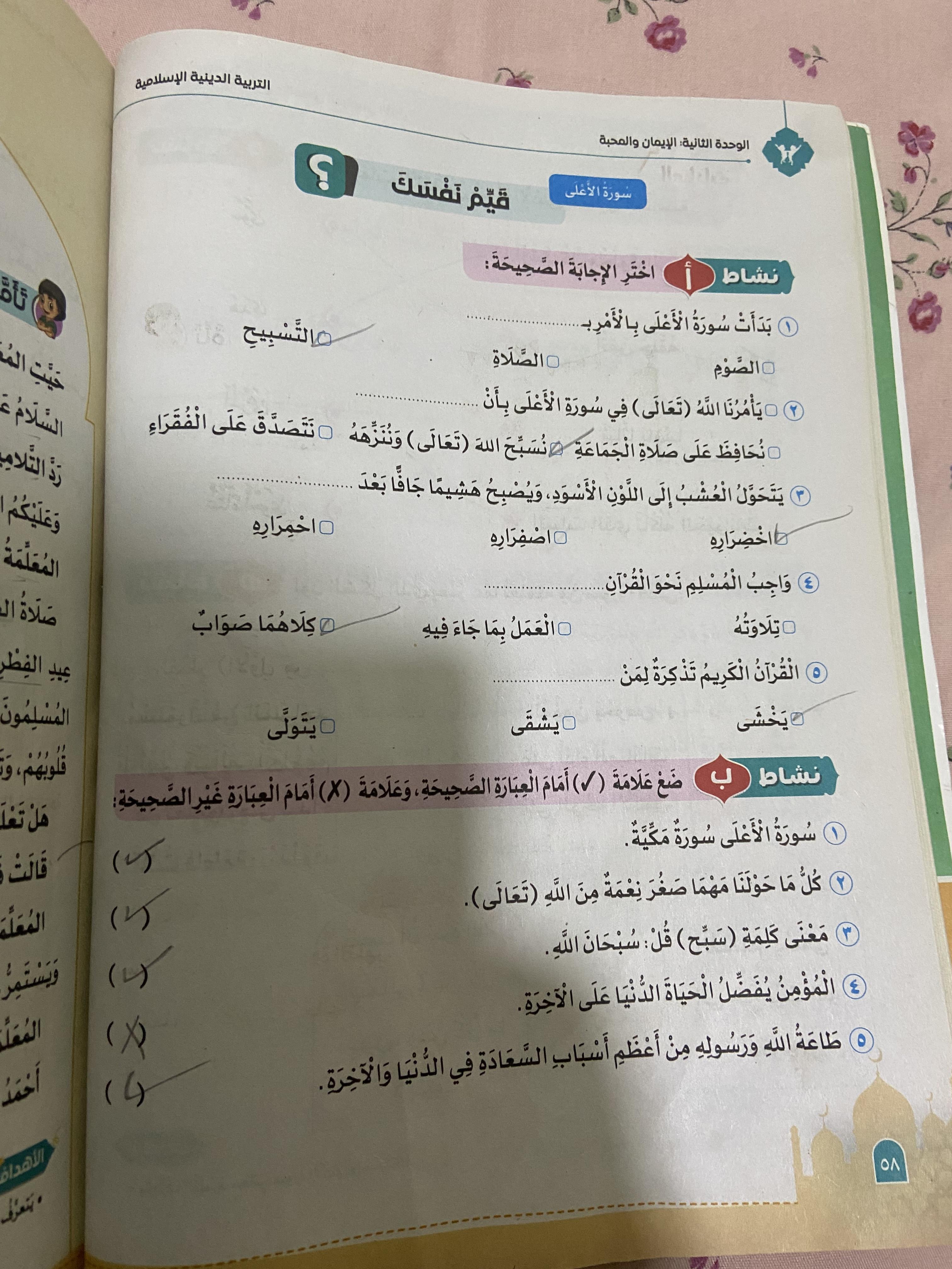 الواجب / أجب ( سورة الأعلي تتحدث عن تسبيح الله تعالي ونعمة في خلق ……………. و…………. ) + حل من صفحة 138 إلي 141