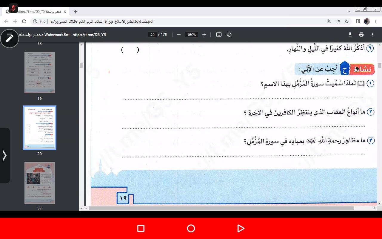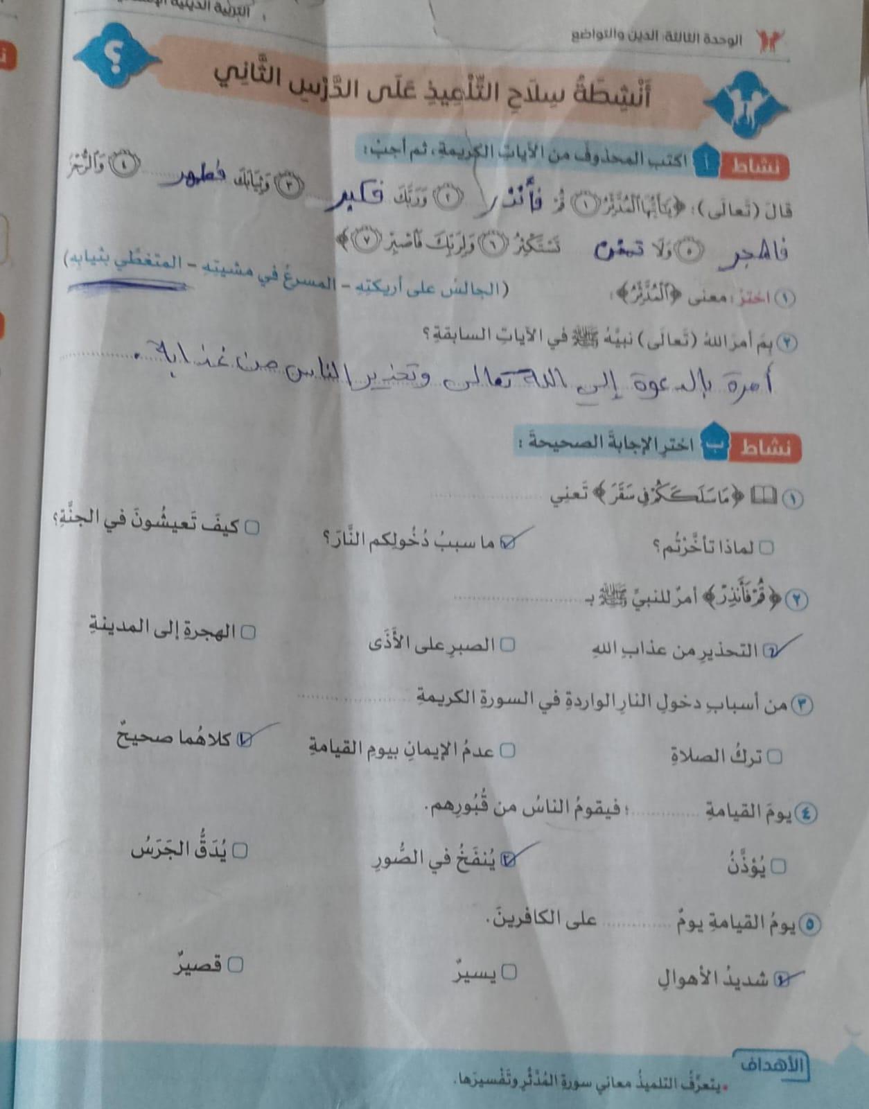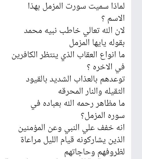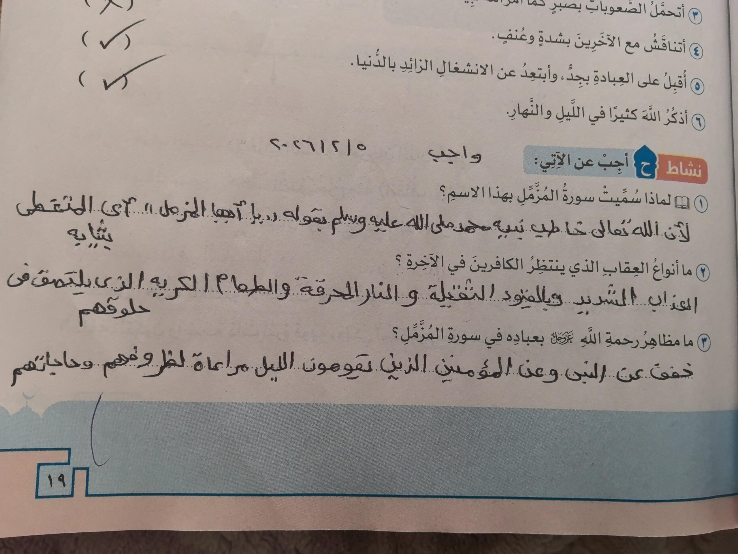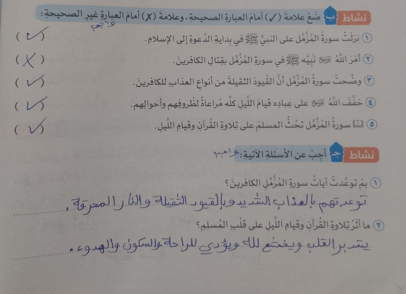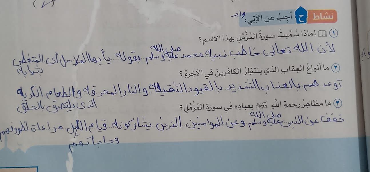 تم اليوم الإيمان بالله / سورة المزمل واجب ص 19 نشاط ح