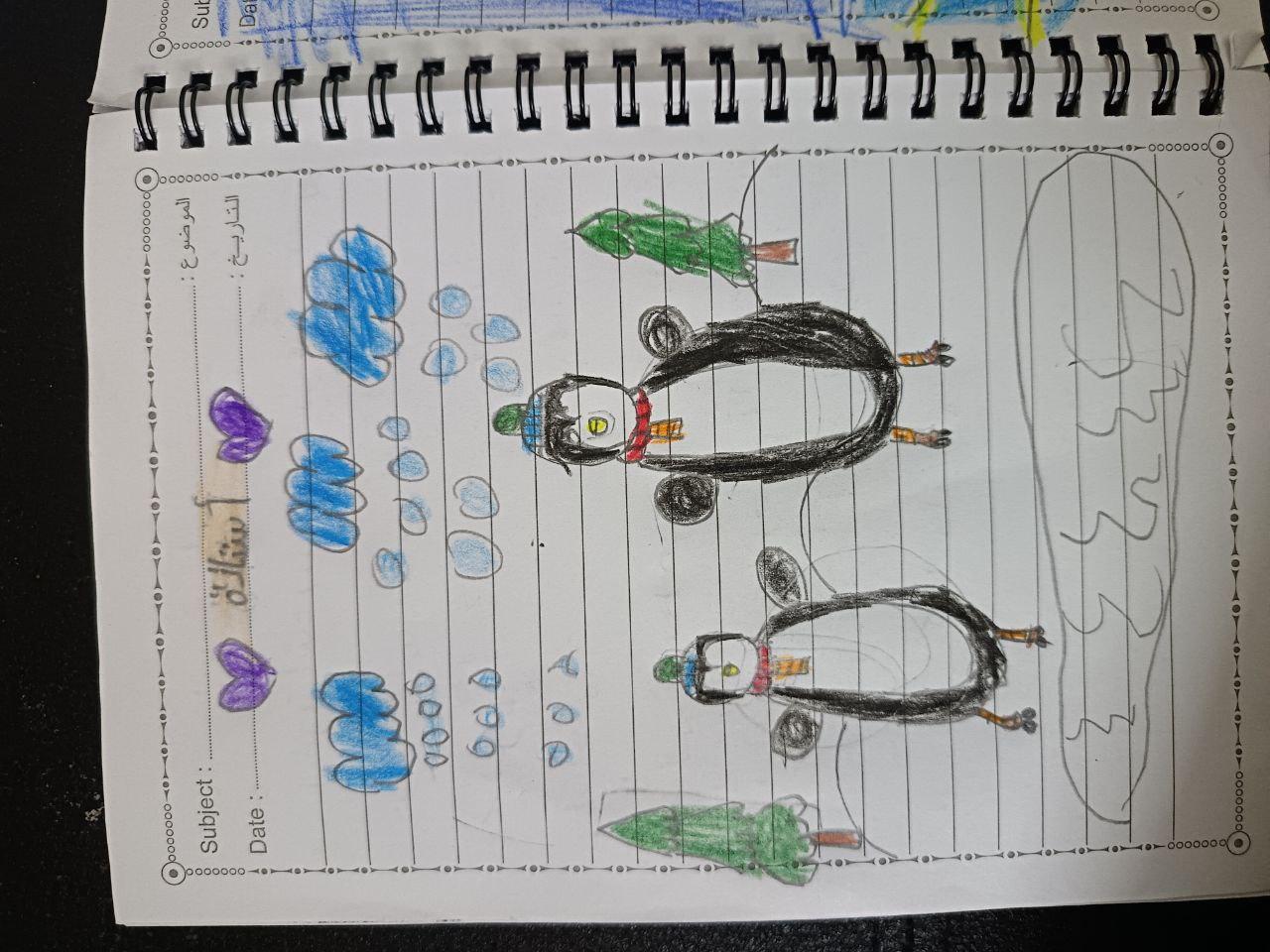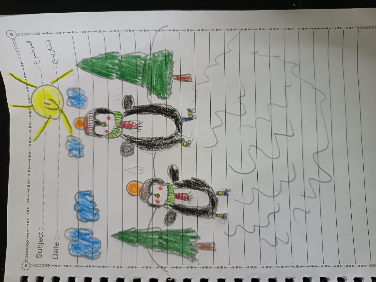 النهاردة رسمنا بطريق كبير وصغير الواجب رسم تساقط الجليد على البطريق
