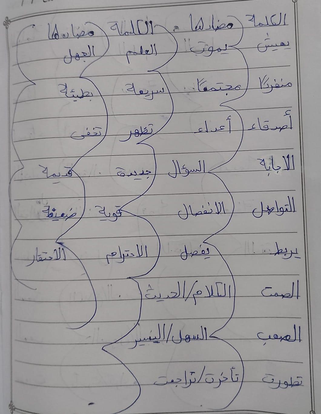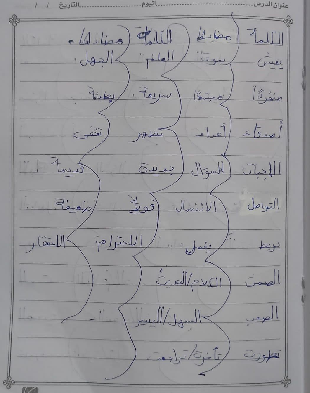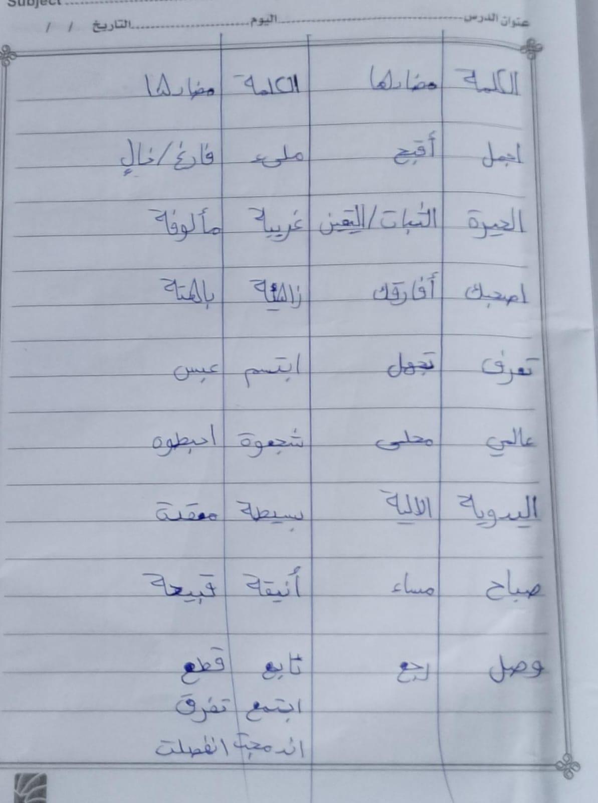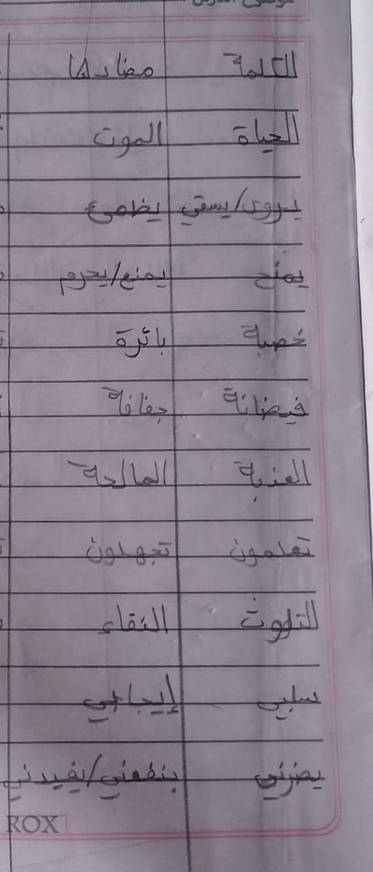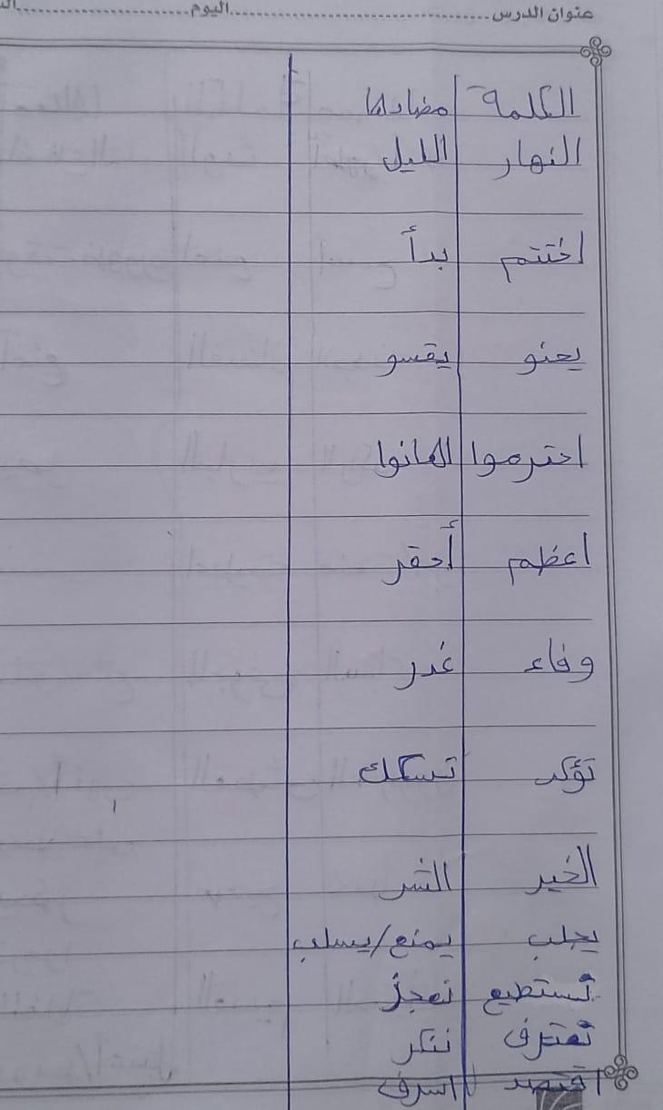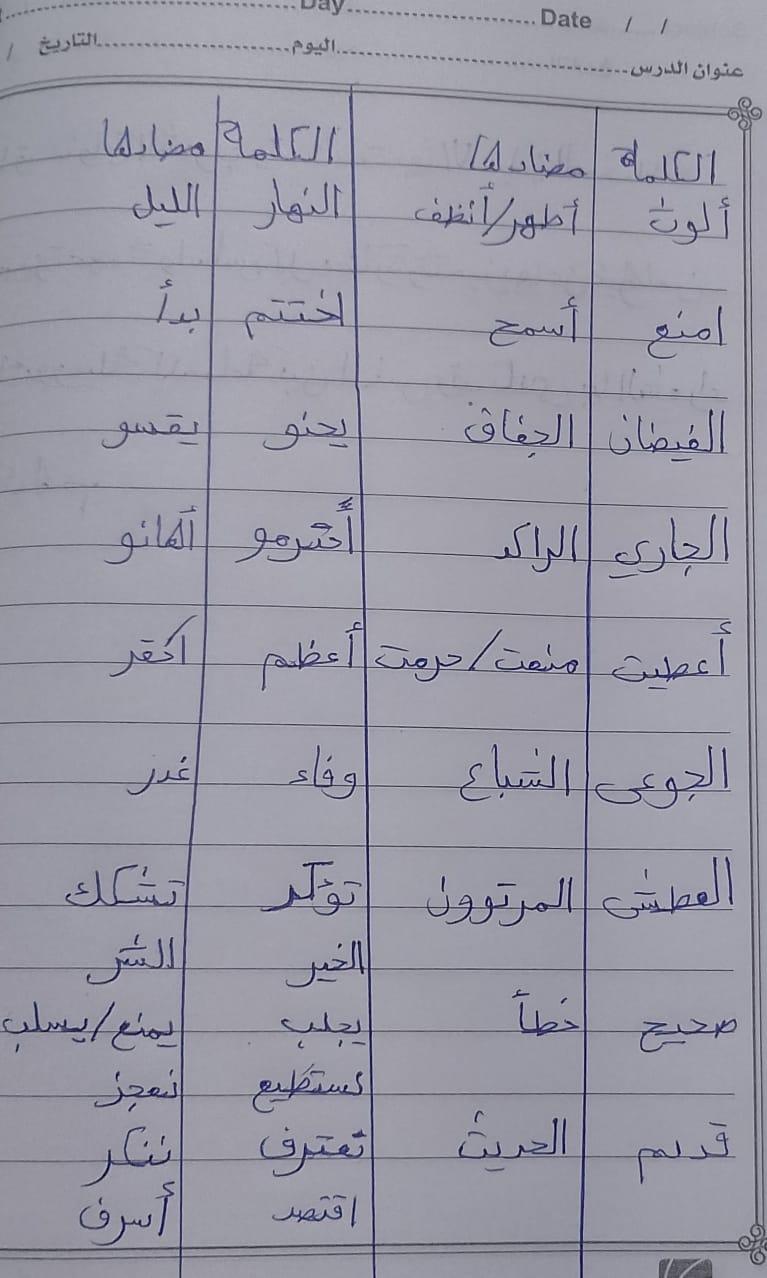 تم اليوم درس سر الحياة والواجب كتابة المعاني والمضاد ص 27