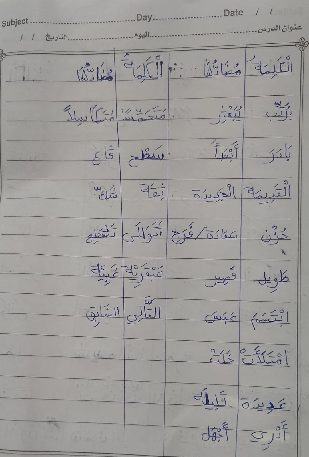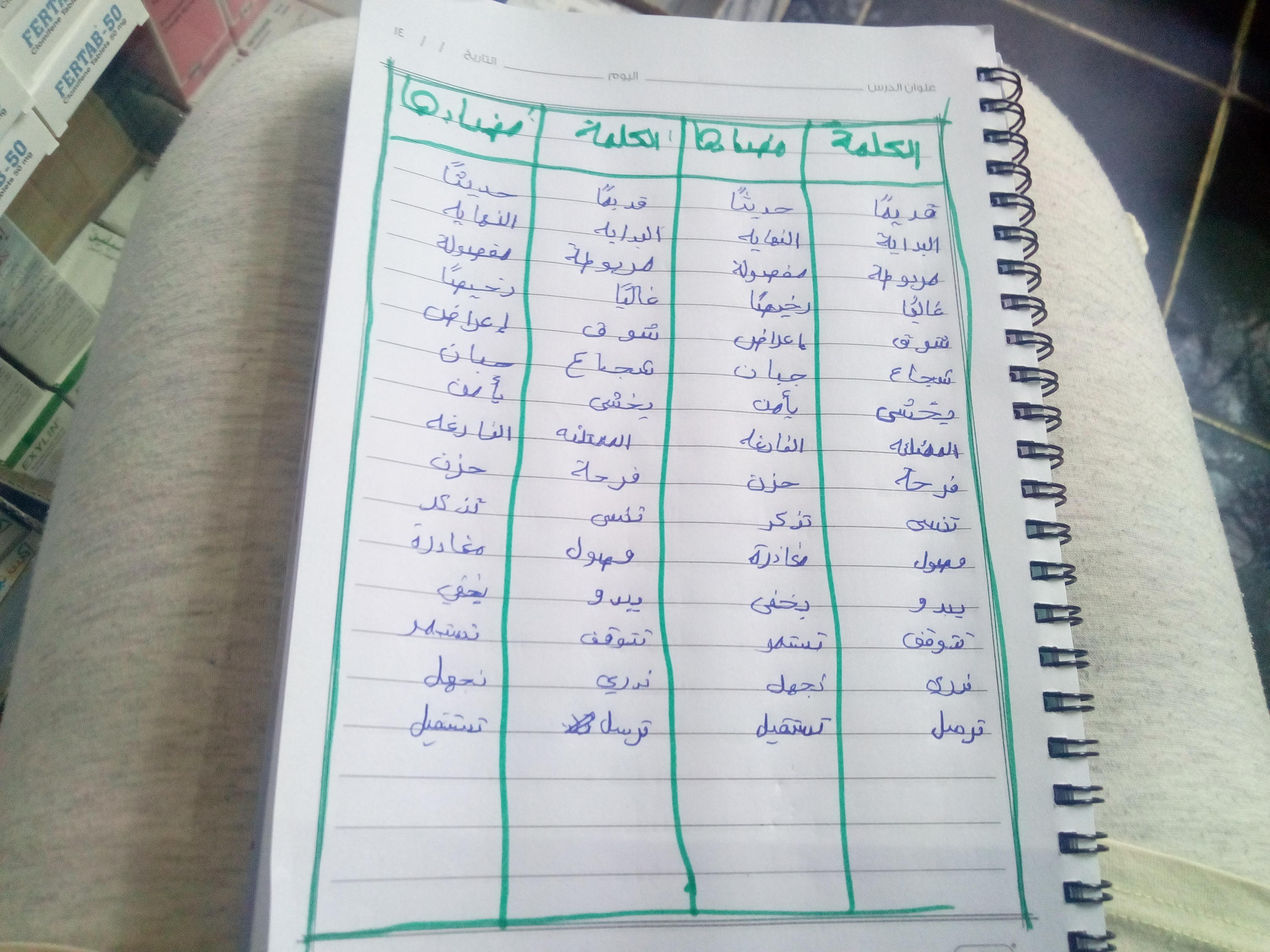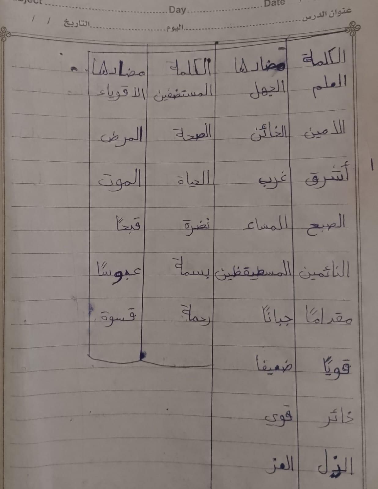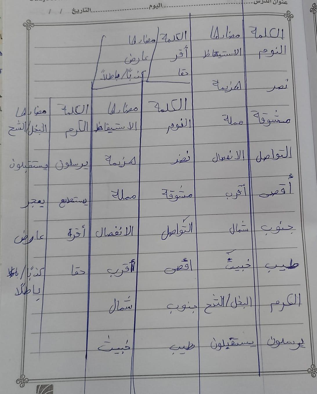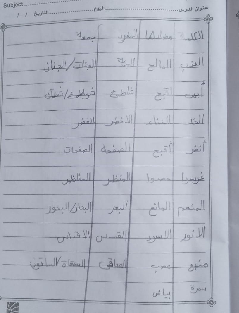 تم اليوم درس سر الحياة والواجب كتابة المعاني والمضاد ص 27