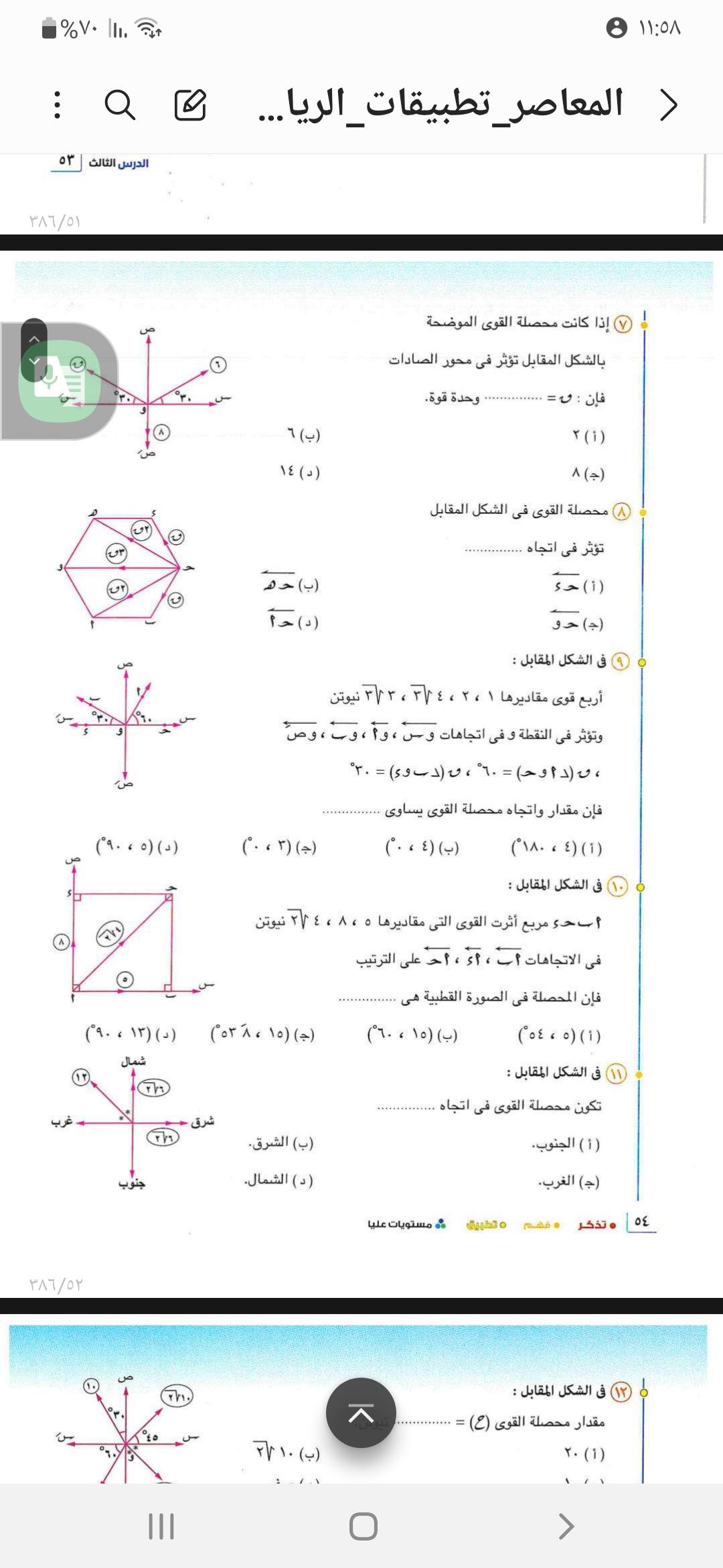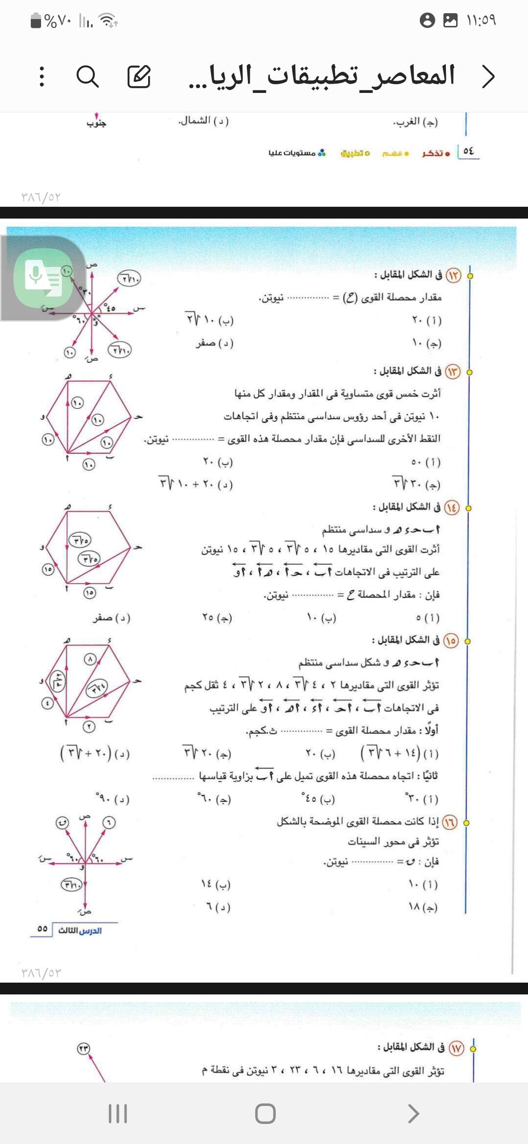 تابع الدرس الاول استاتيكا (محصلة قوتين متلاقيتين في نقطة )وحل تدريبات علي الدرس