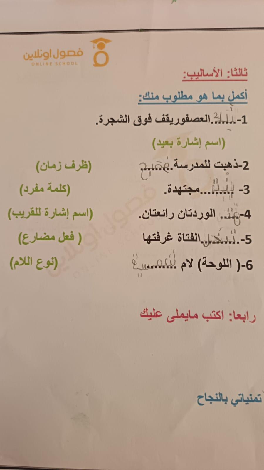 الحصة مراجعة اساليب+ تدريبات الواجب هات من عندك في جمل ( اسم غشارة للقريب وابعيد