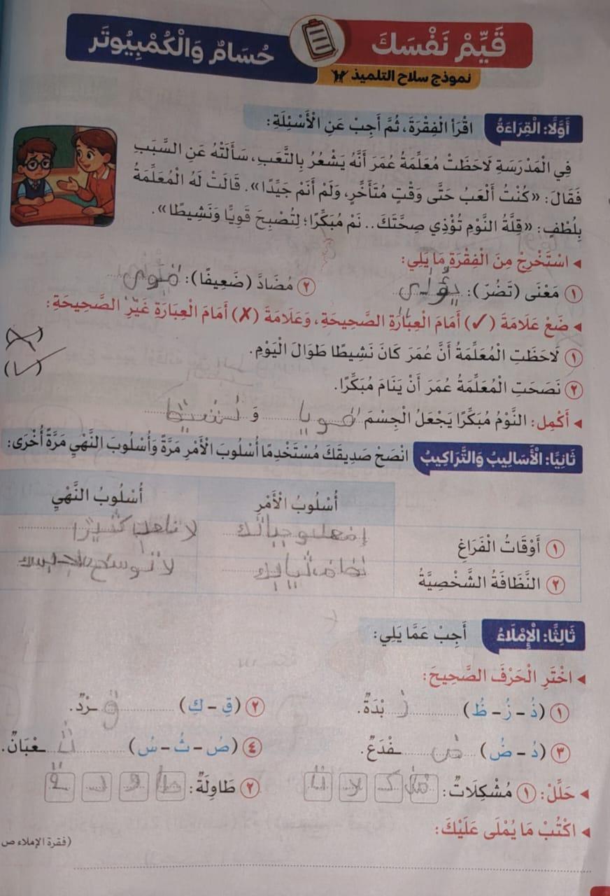 الثلاثاء القادم اختبار( طعام صحي إلى حسام والكمبوتر ) + جميع ماتم دراسته من الاساليب