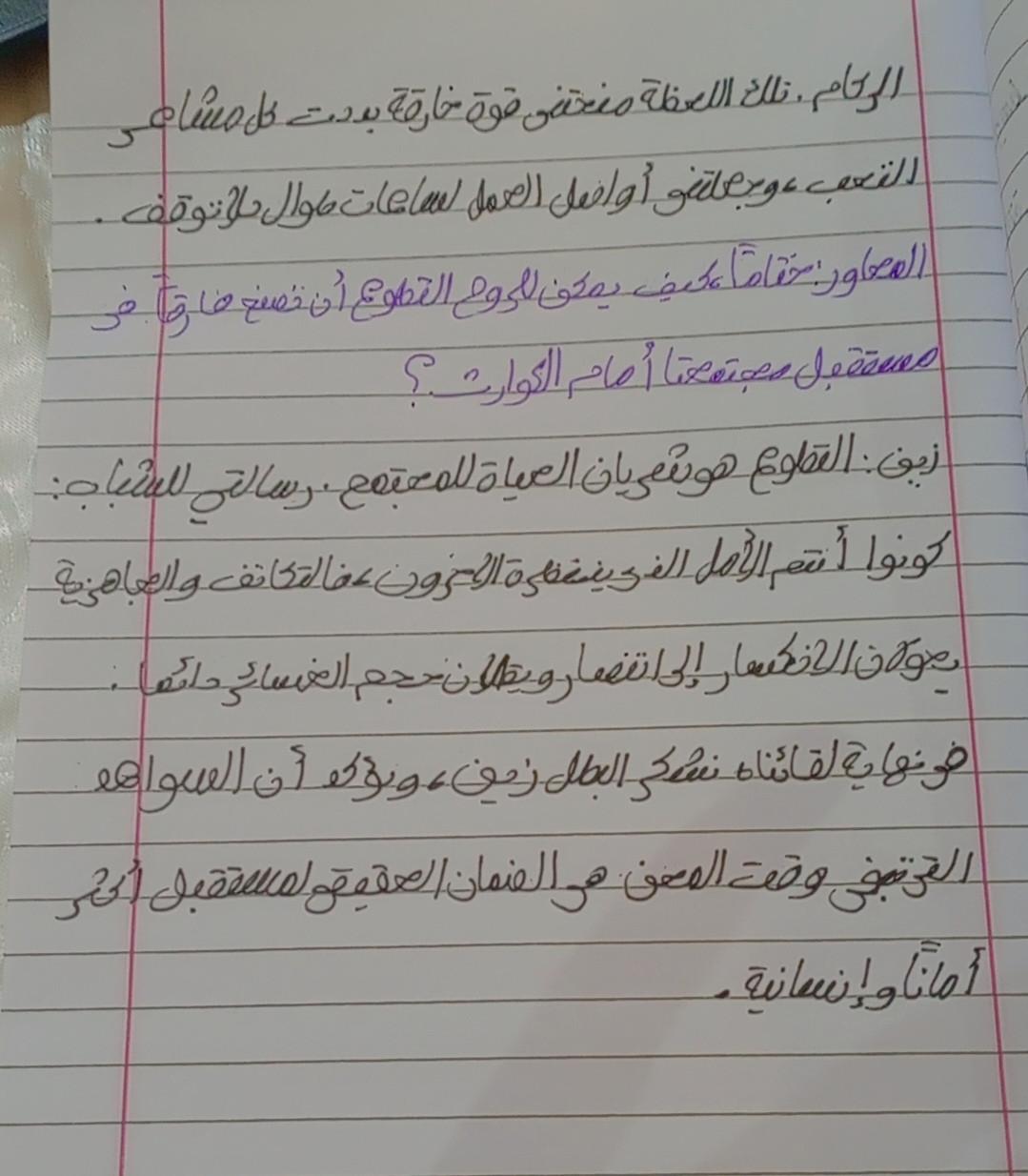 المتطوع: أدعو الجميع للتطوع والمساعدة، فكل جهد صغير قد يصنع فرقًا كبيرًا.