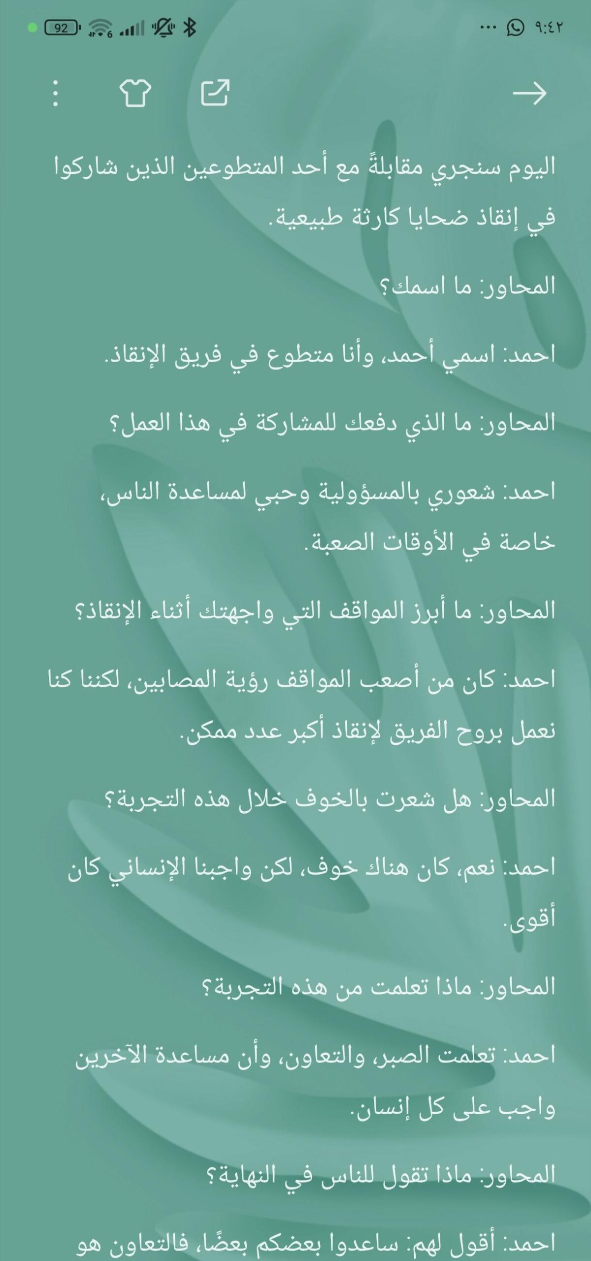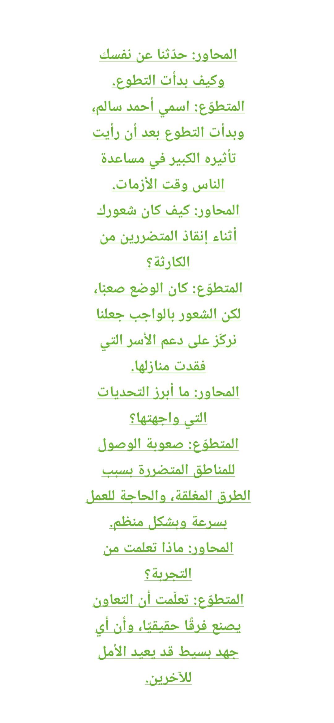 المتطوع: أنا أحمد، متطوع في فريق الإغاثة، شاركت في إنقاذ ضحايا فيضانات العام الماضي.