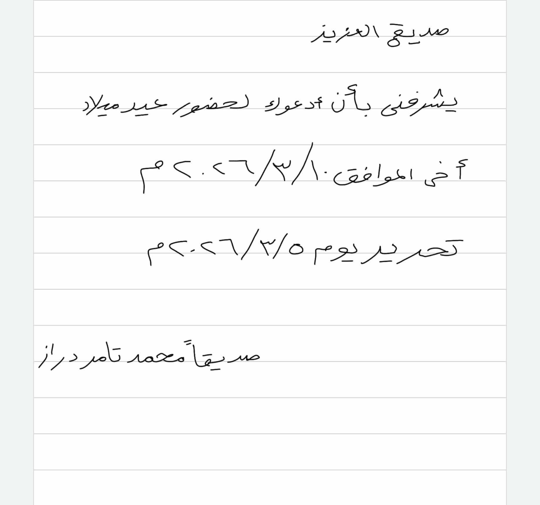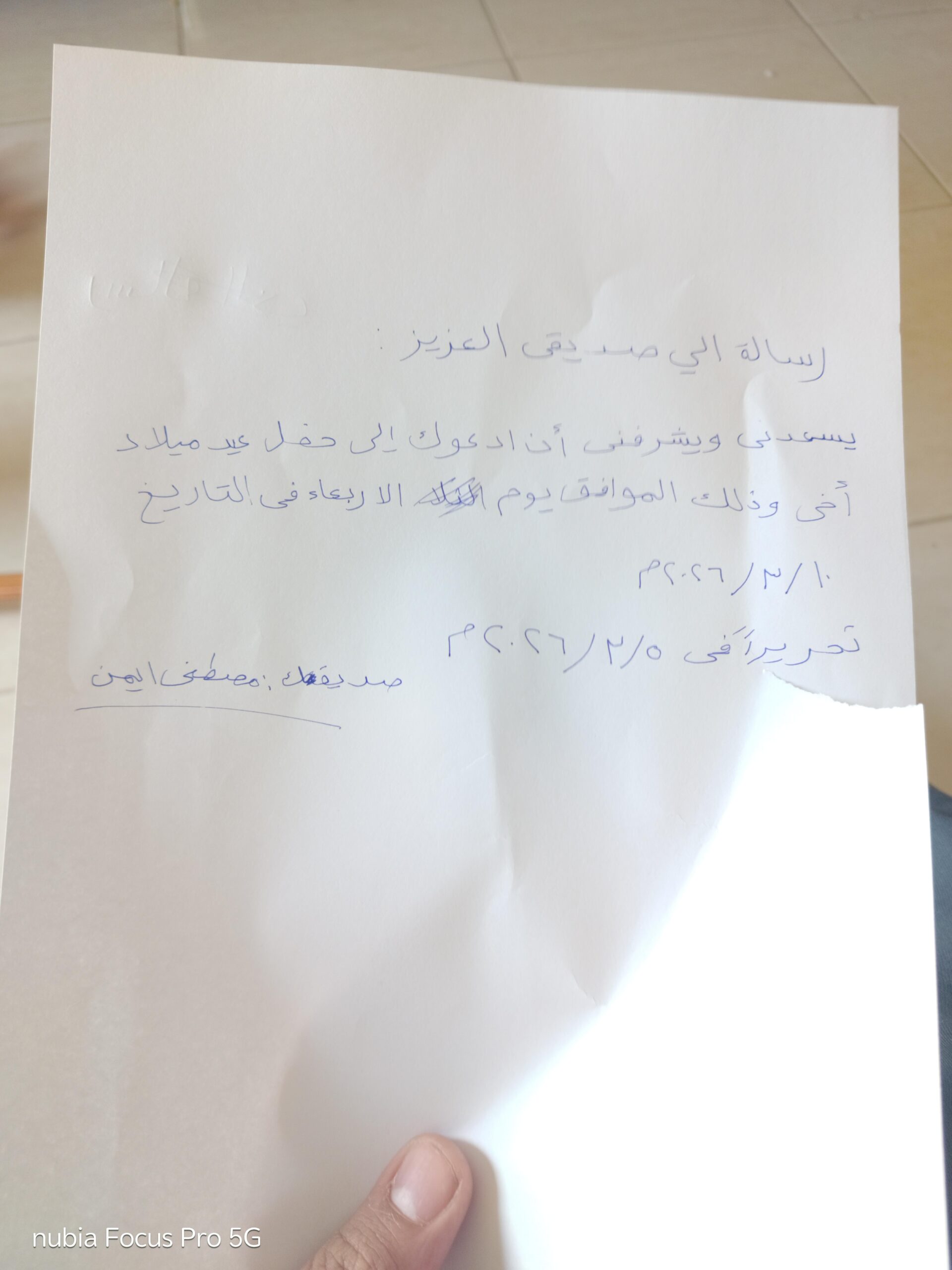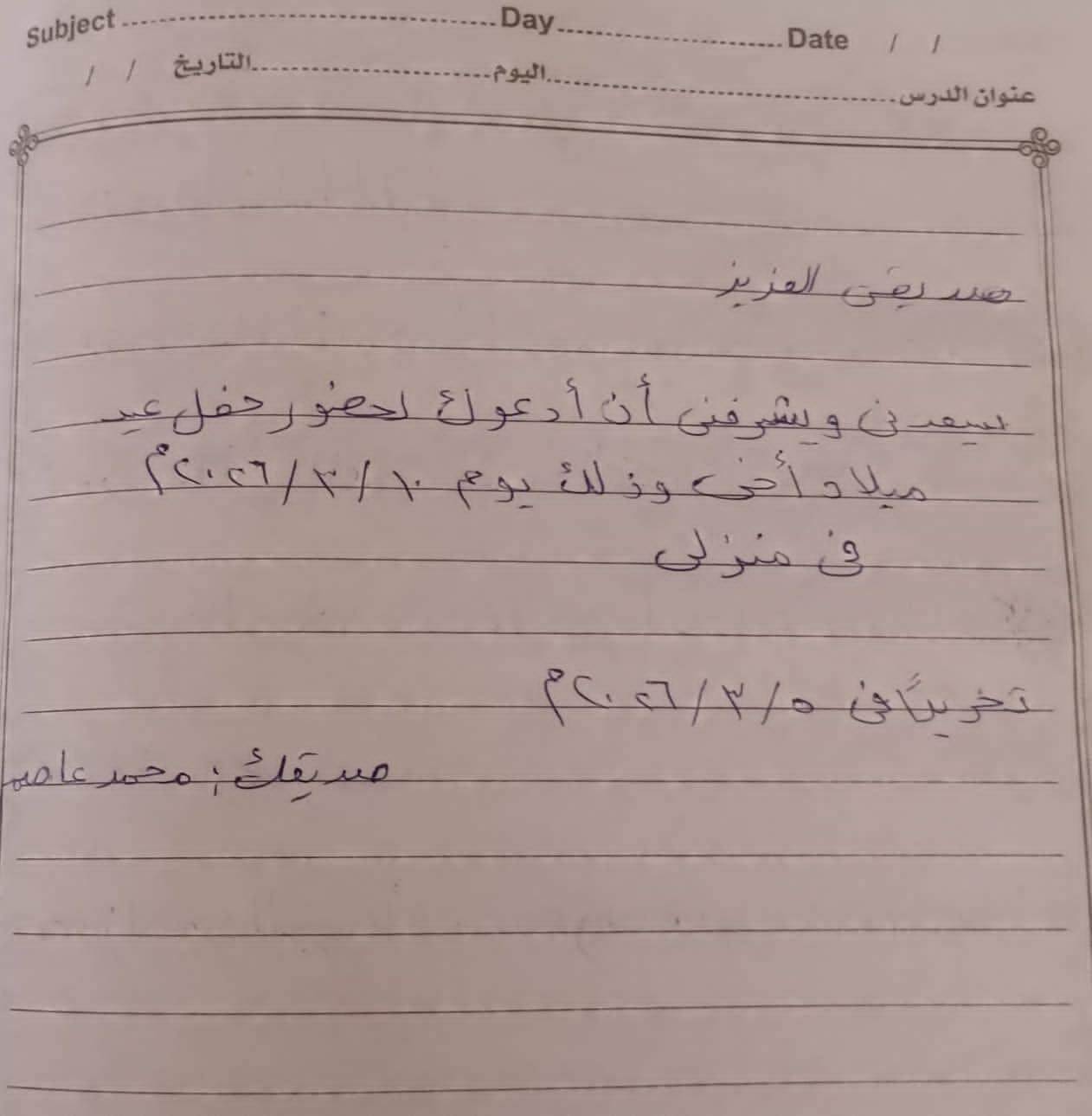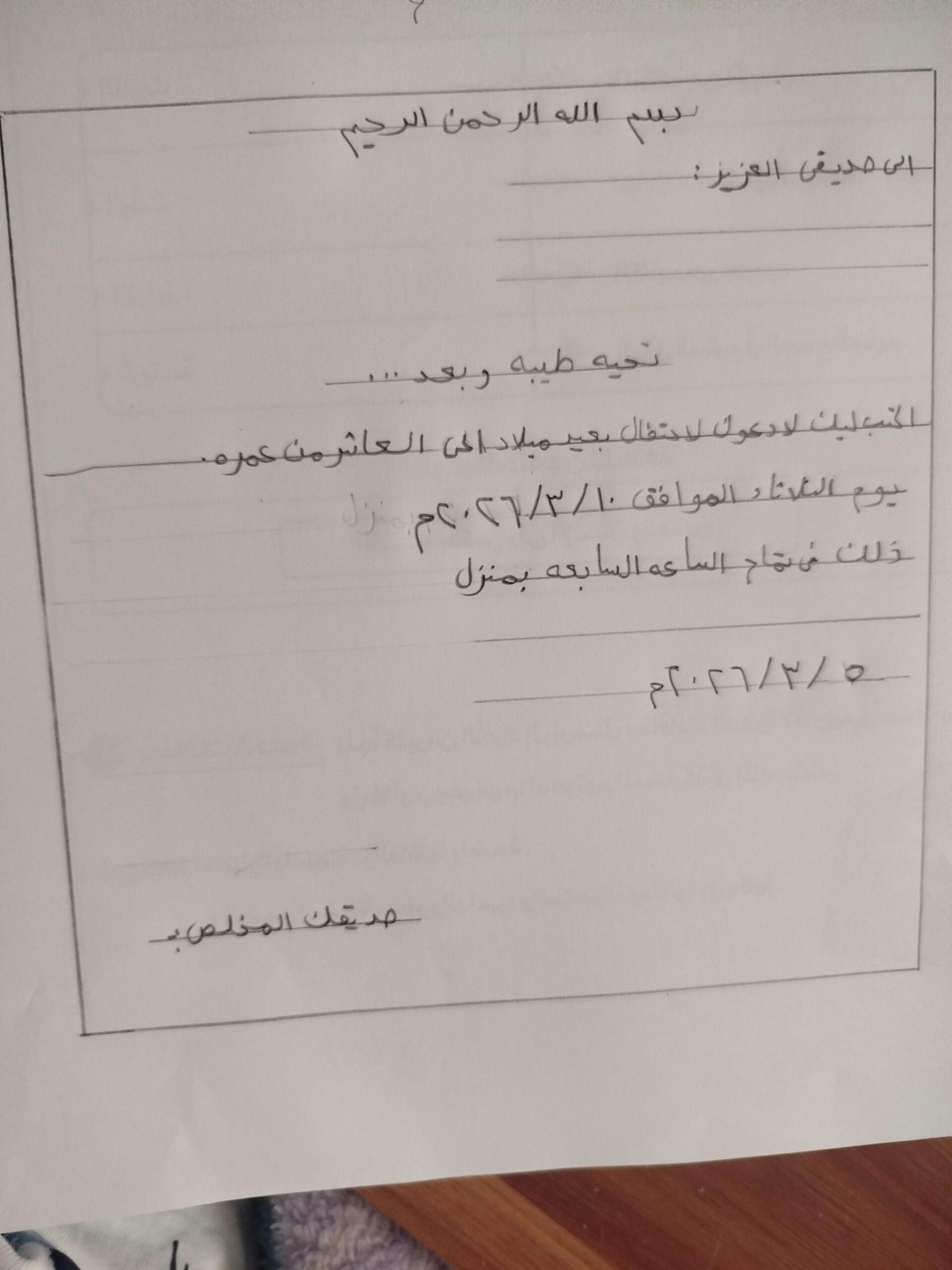 الواجب اكتب رساله الي صديقك تتدعوه لحضور عفل عيد ميلاد اخيك يوم 10 مارس