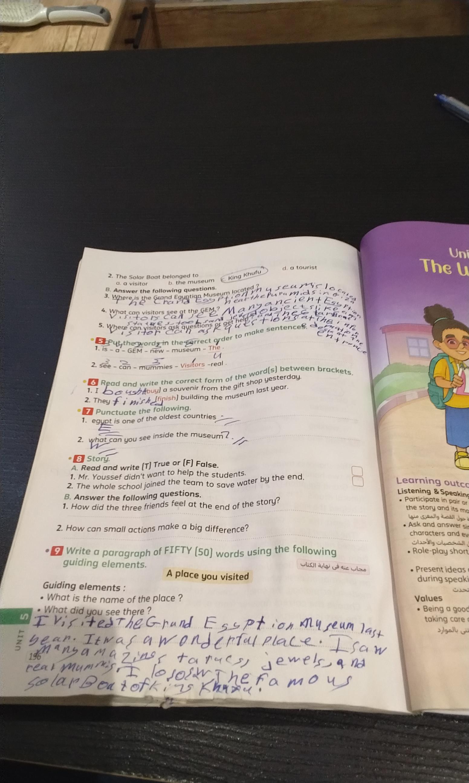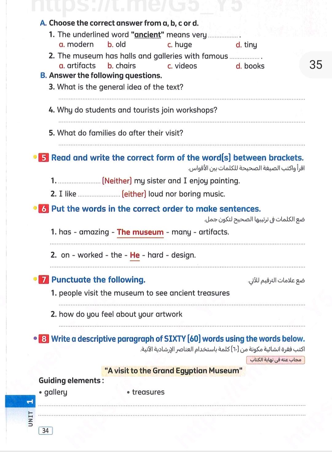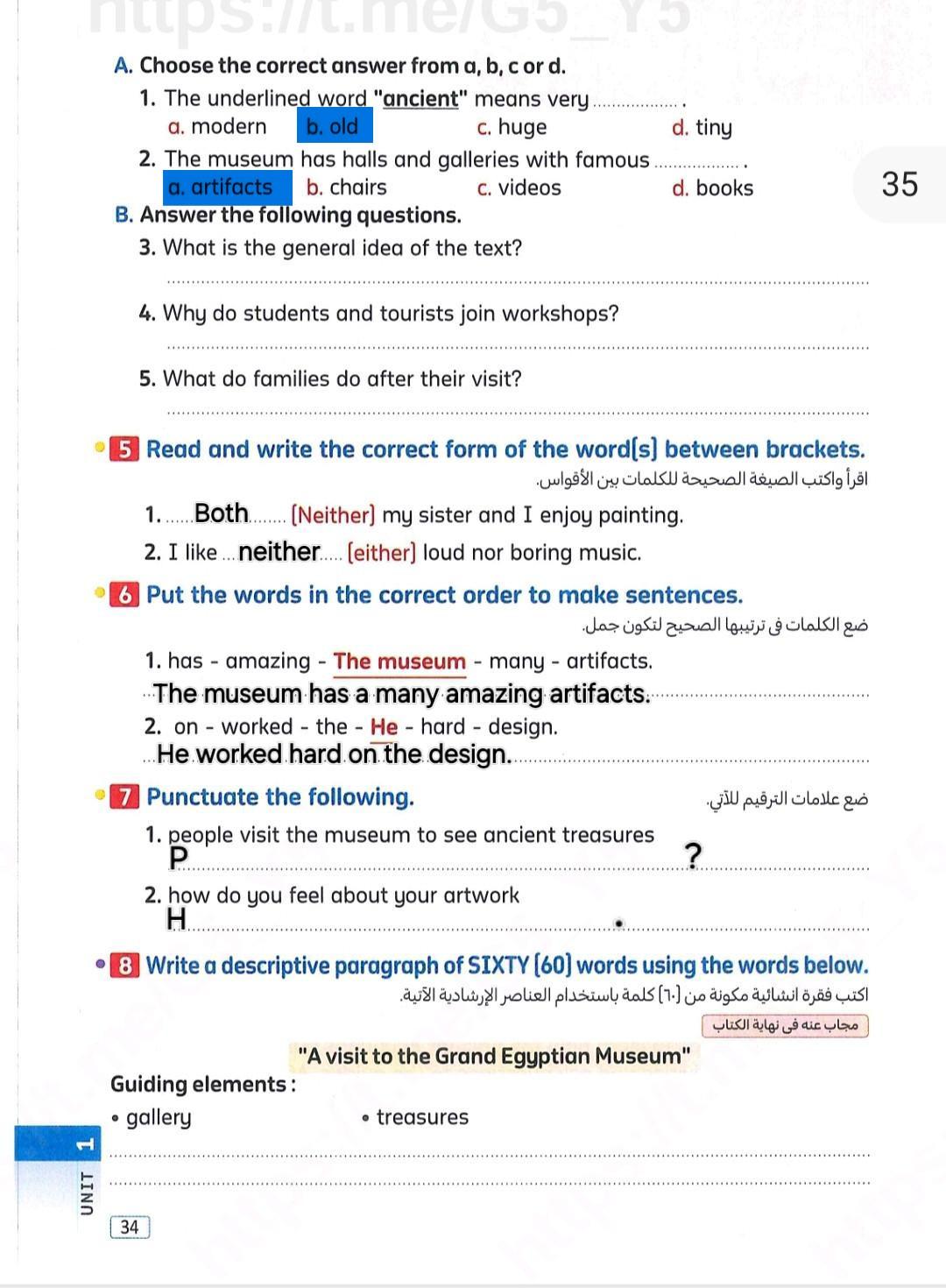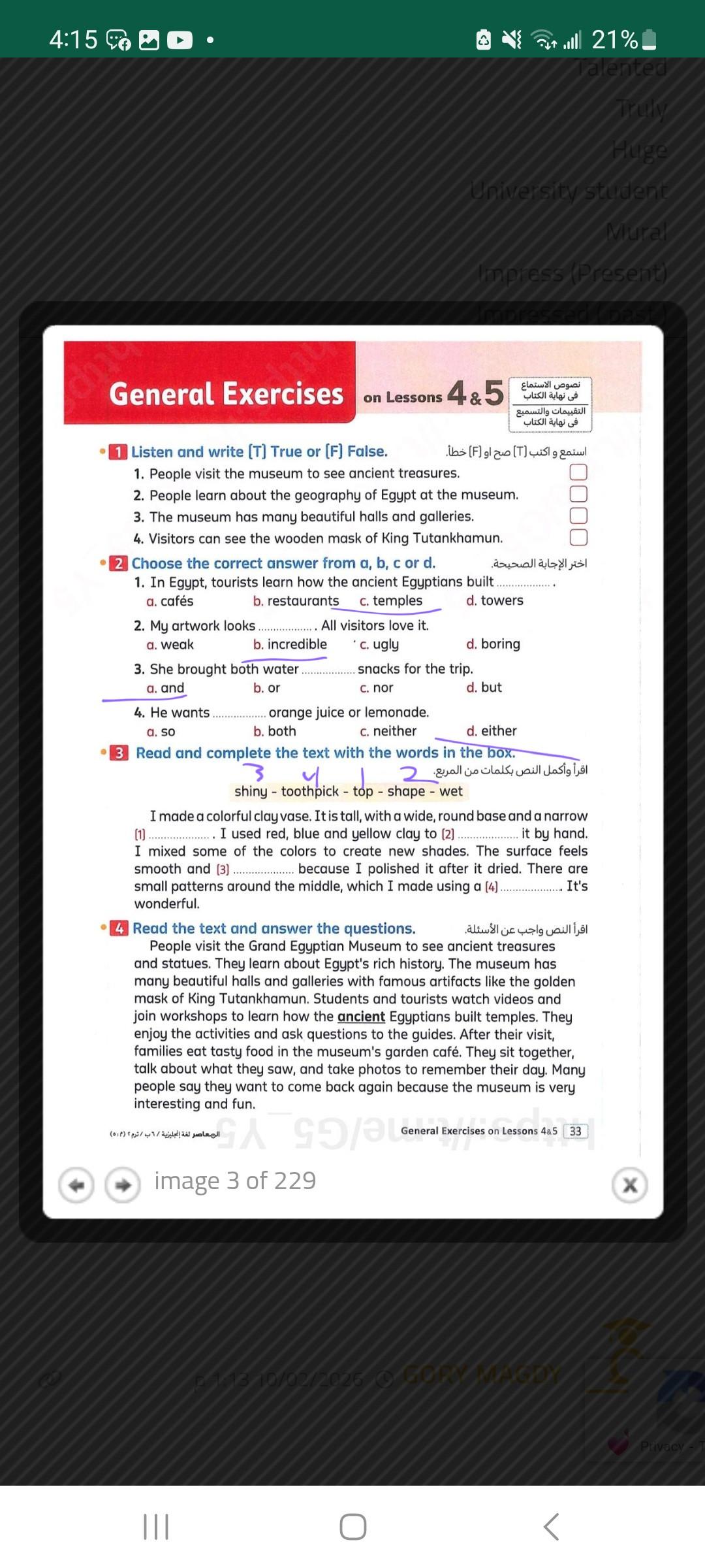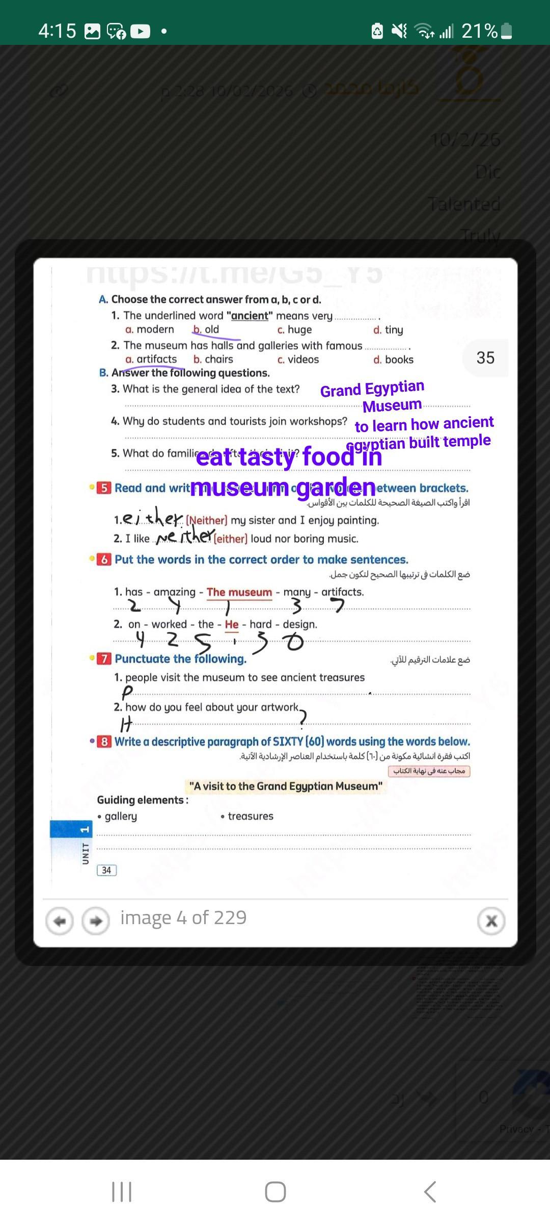 During my visit to the Grand Egyptian Museum, I walked into a big gallery full of history. I saw many statues, tools, and beautiful treasures from ancient Egypt. The gallery was quiet and well organized. The treasures showed how people lived long ago. I enjoyed learning new things and felt proud of Egypt’s great past. It was a nice and interesting visit for me.