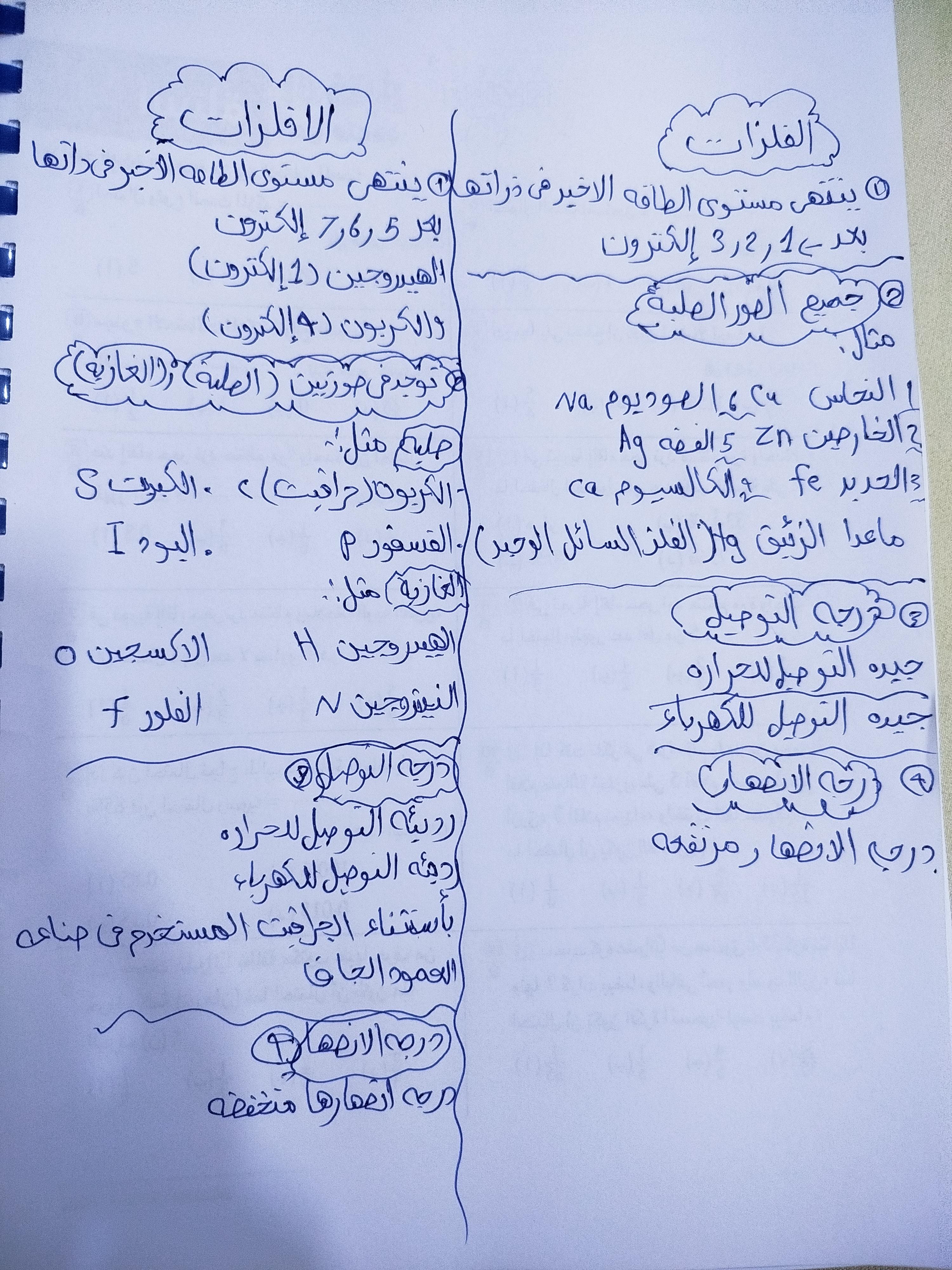 الفلزات . هي الواد الذي لها بريق💎معدني ويمكن السحب والطرق و التشكيل 🦠. وينتهي مستواها أقل من 4. الافلزات ليس لها بريق 🤎 ولا يمكن سحبها سحبها أو طرقها ، وينتهي مستواها أقل من 8 . لا فلزات لا توصل كهرباء 🤖 أما الفلزات توصل.