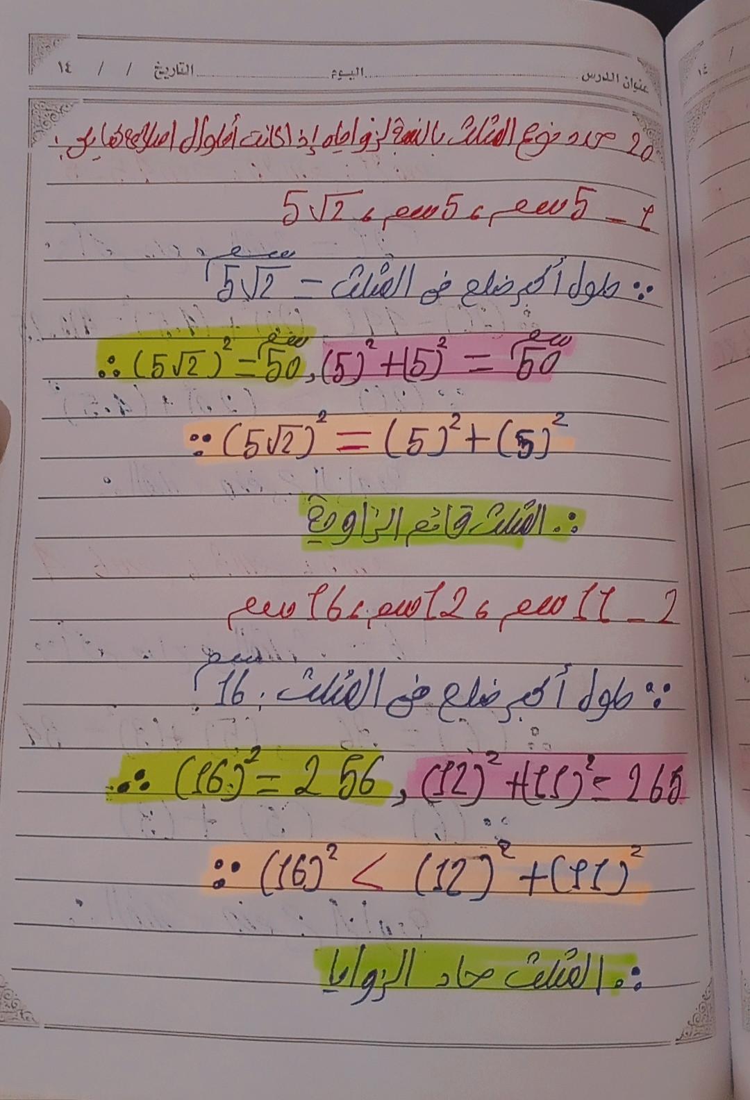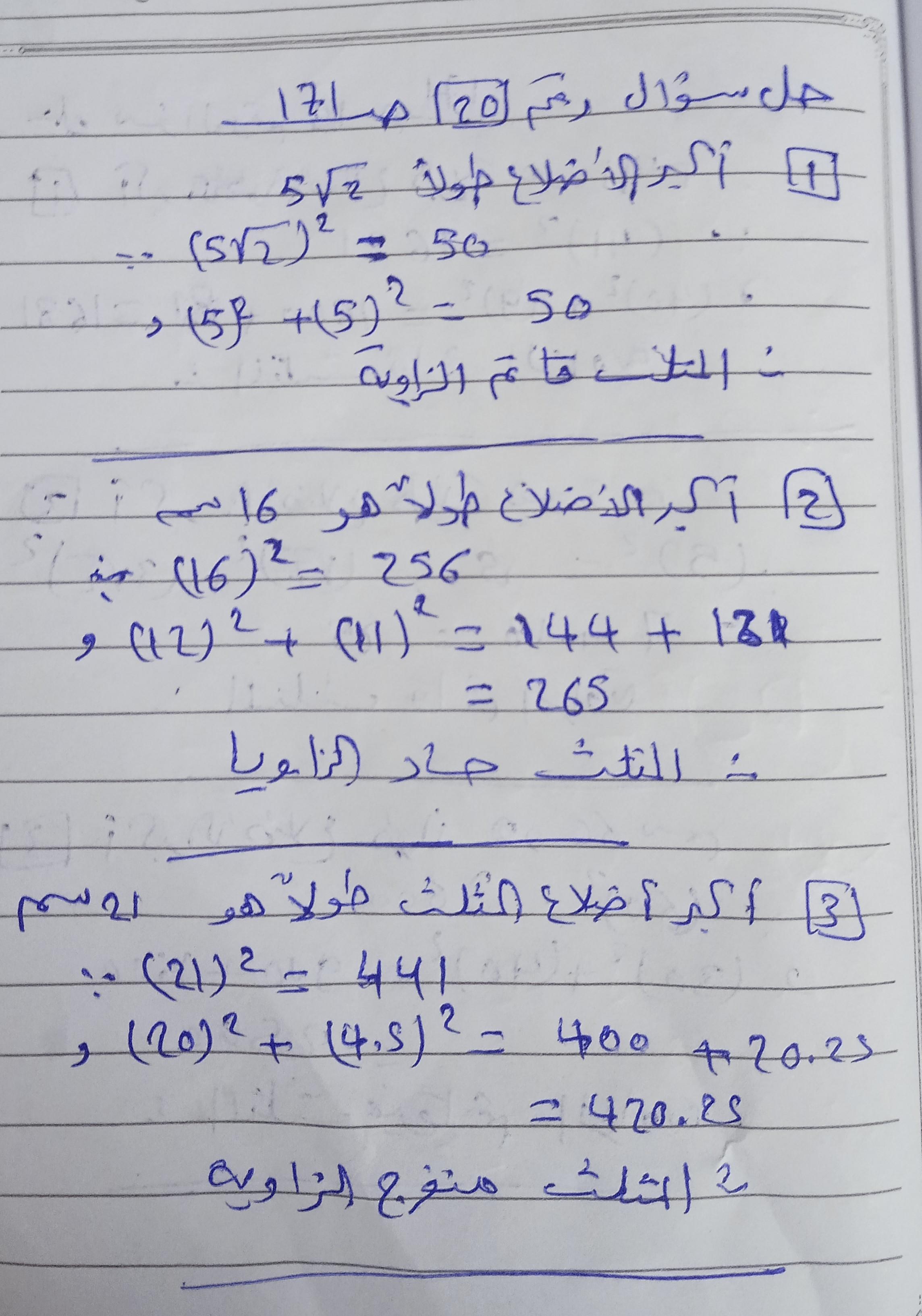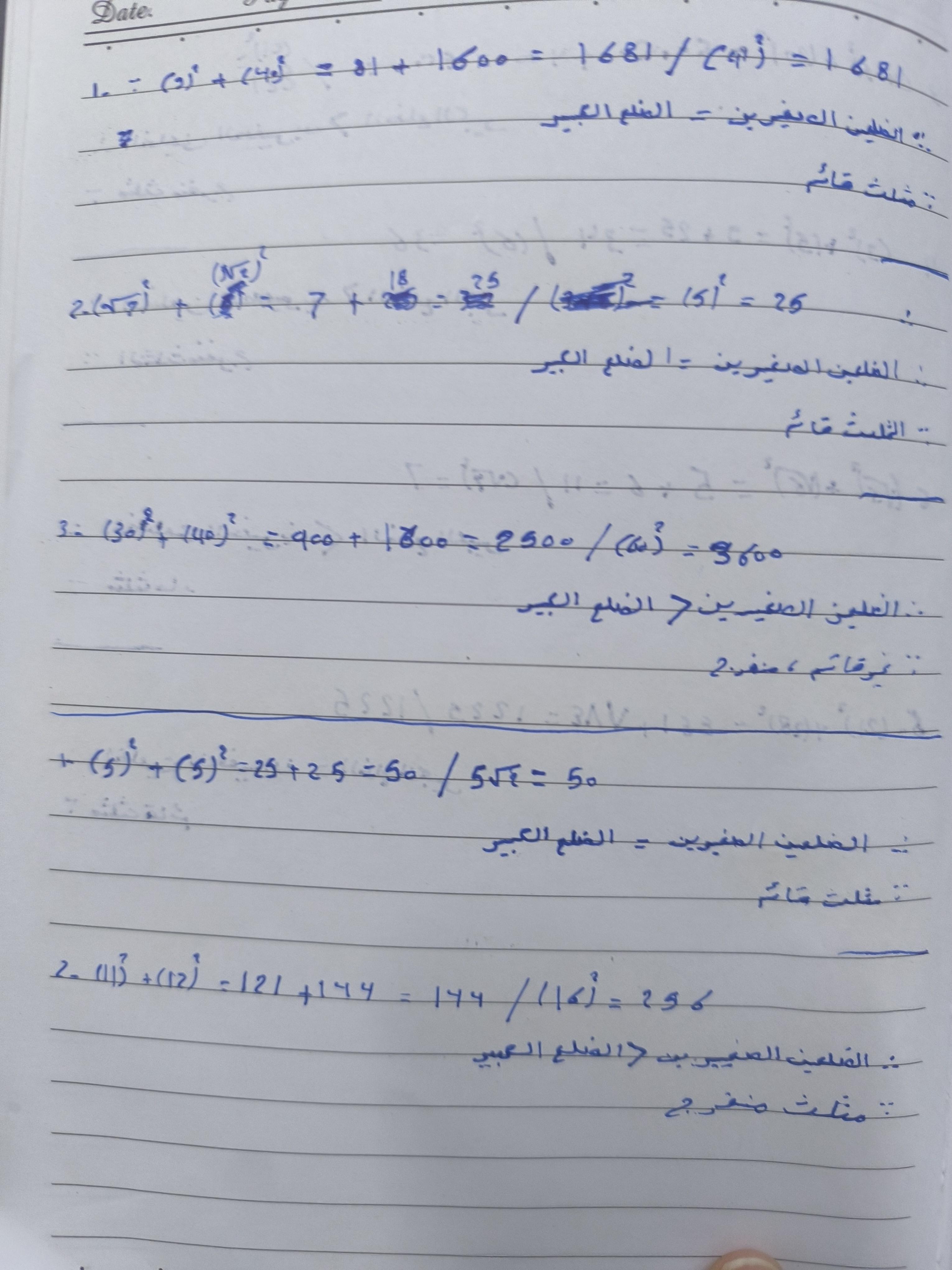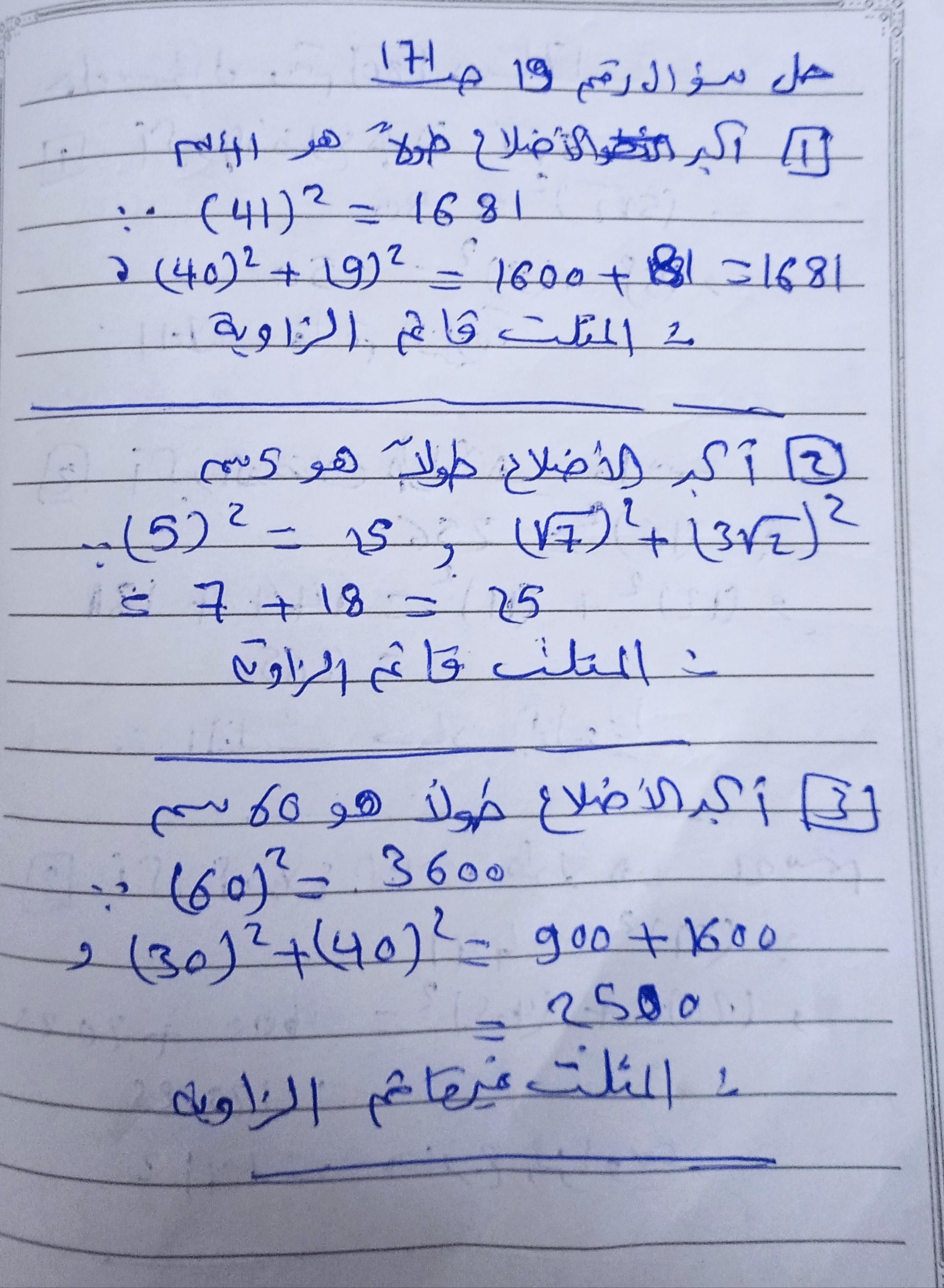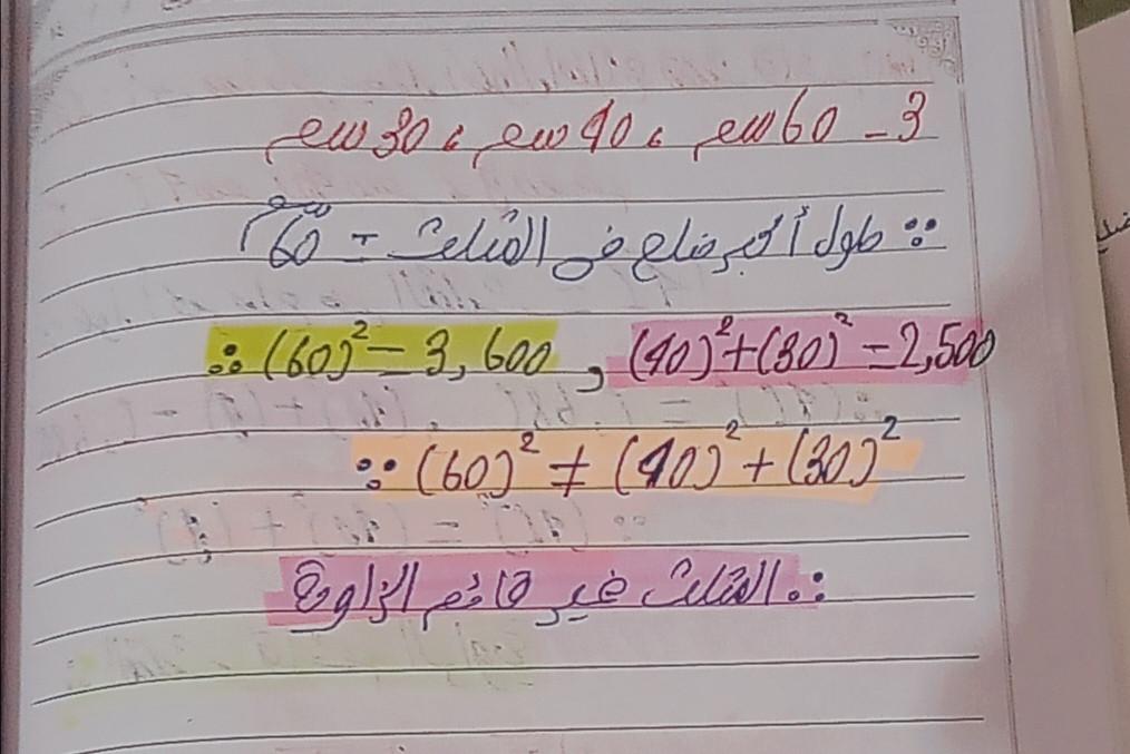تم حل واجب الرياضيات الاختياري كامل لنظرية فيثاغورس وعكسها ومتباينتها