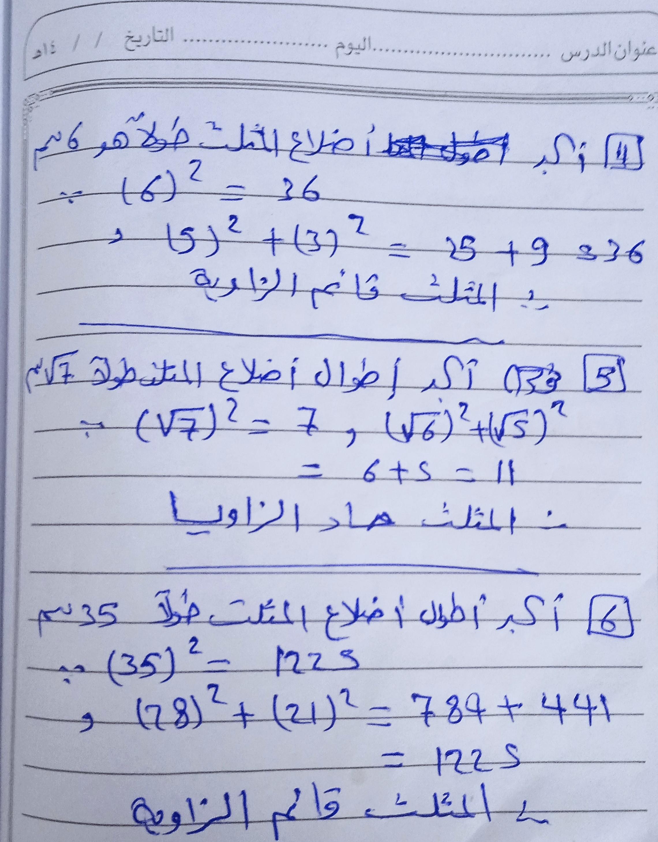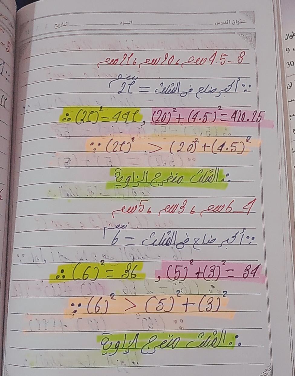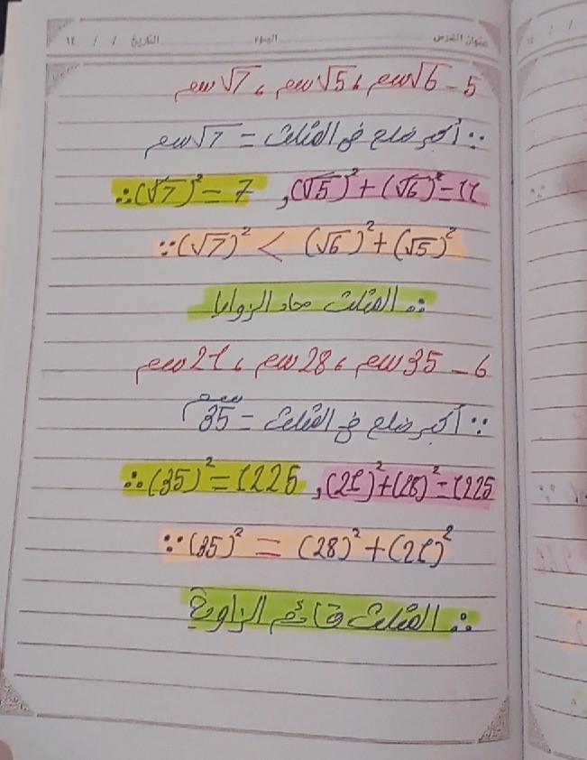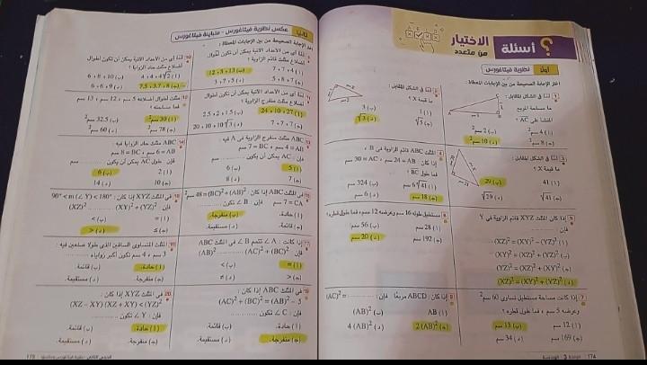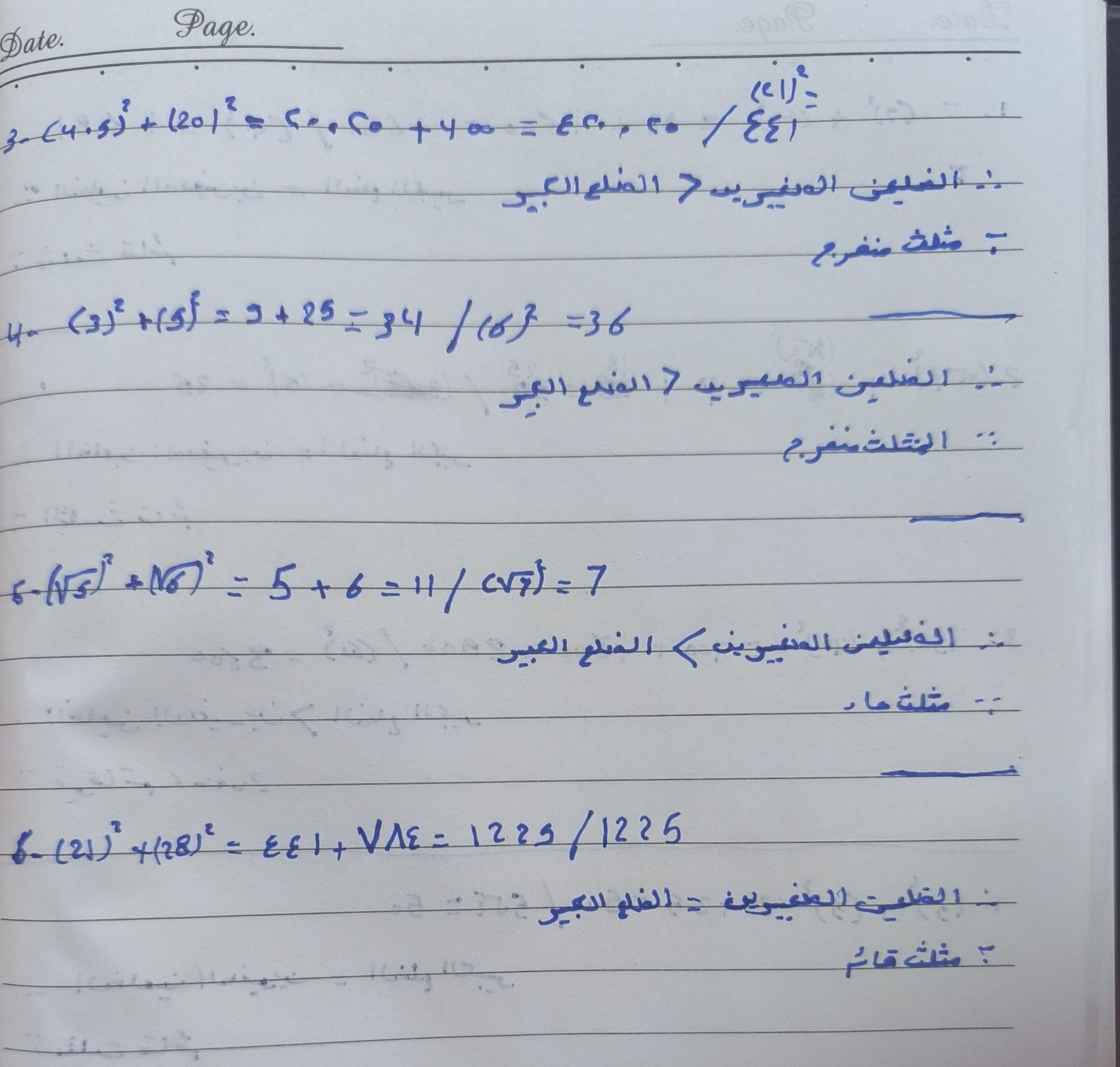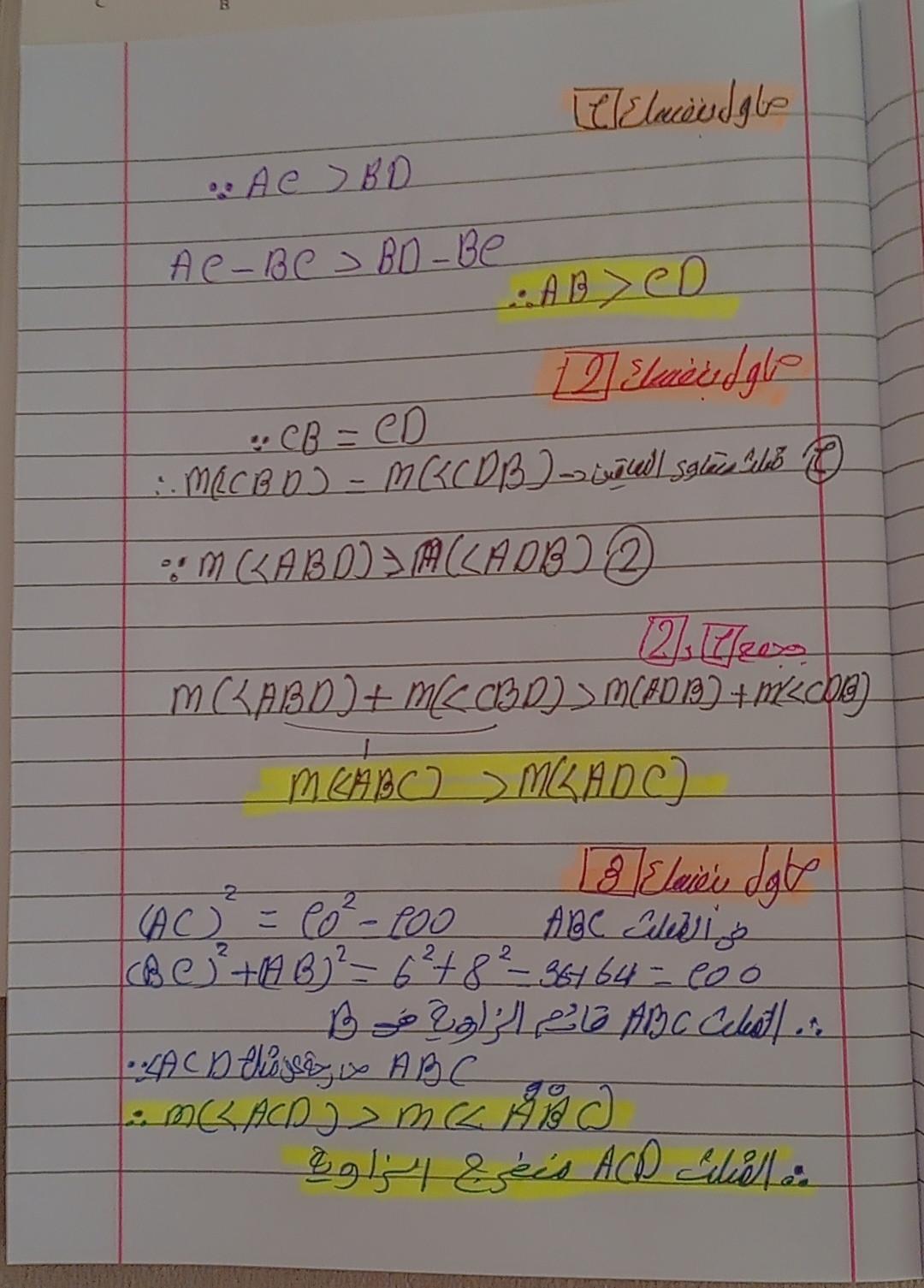 تم حل واجب الرياضيات الاختياري كامل لنظرية فيثاغورس وعكسها ومتباينتها