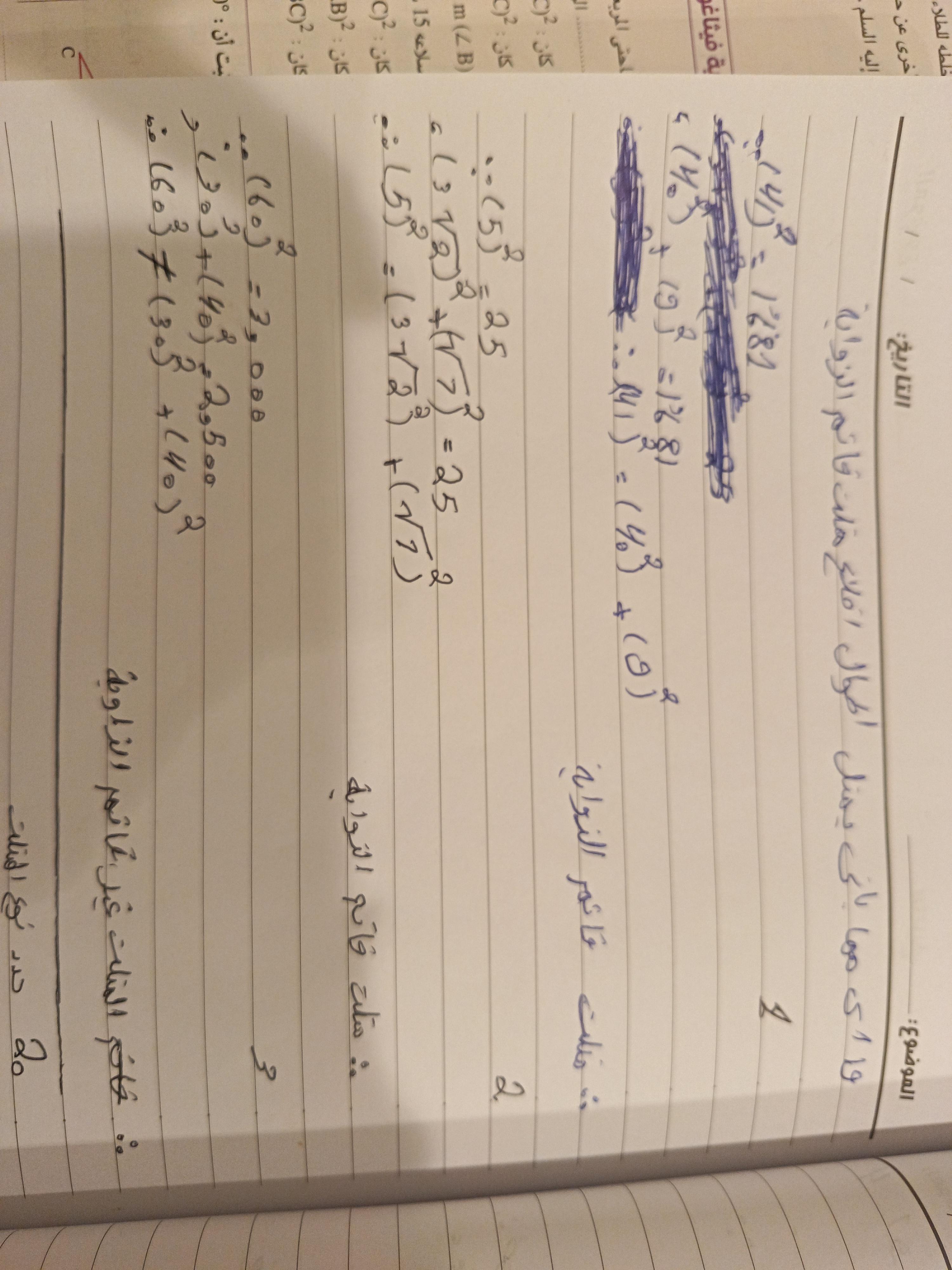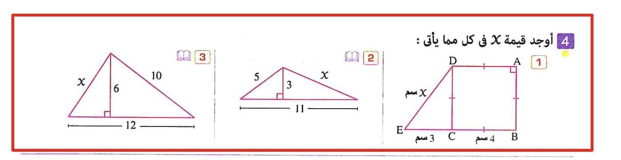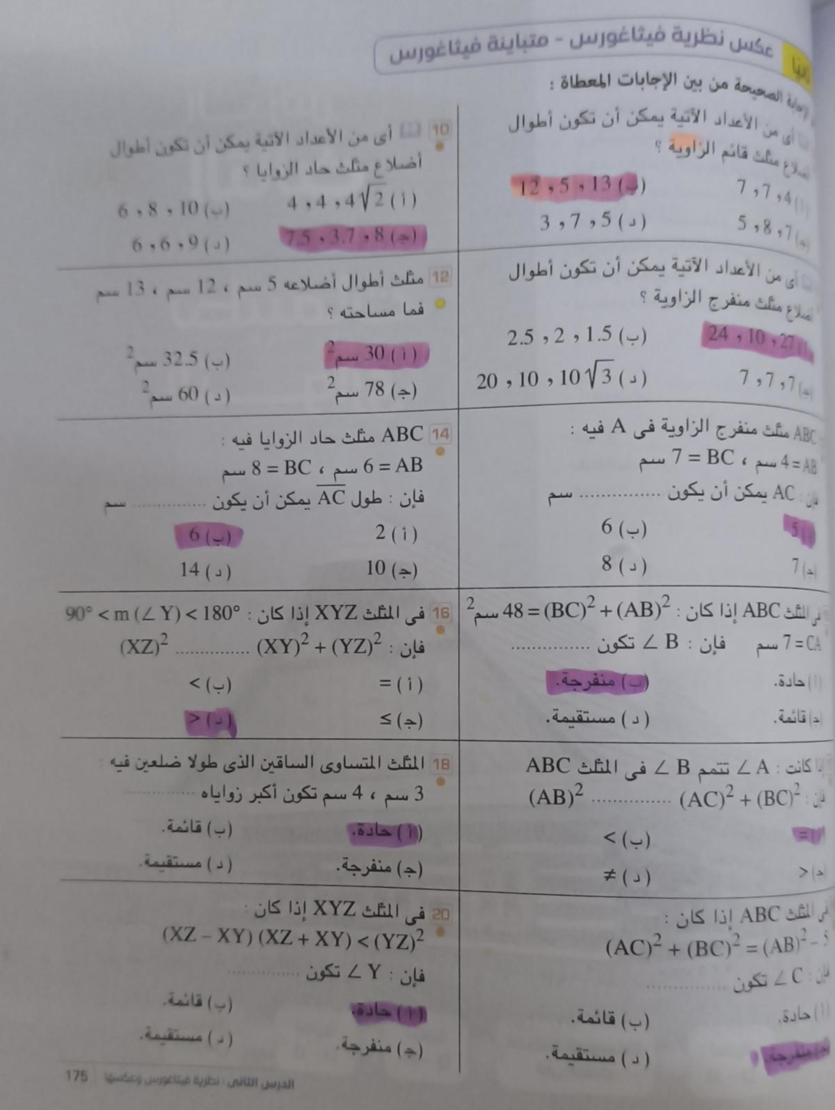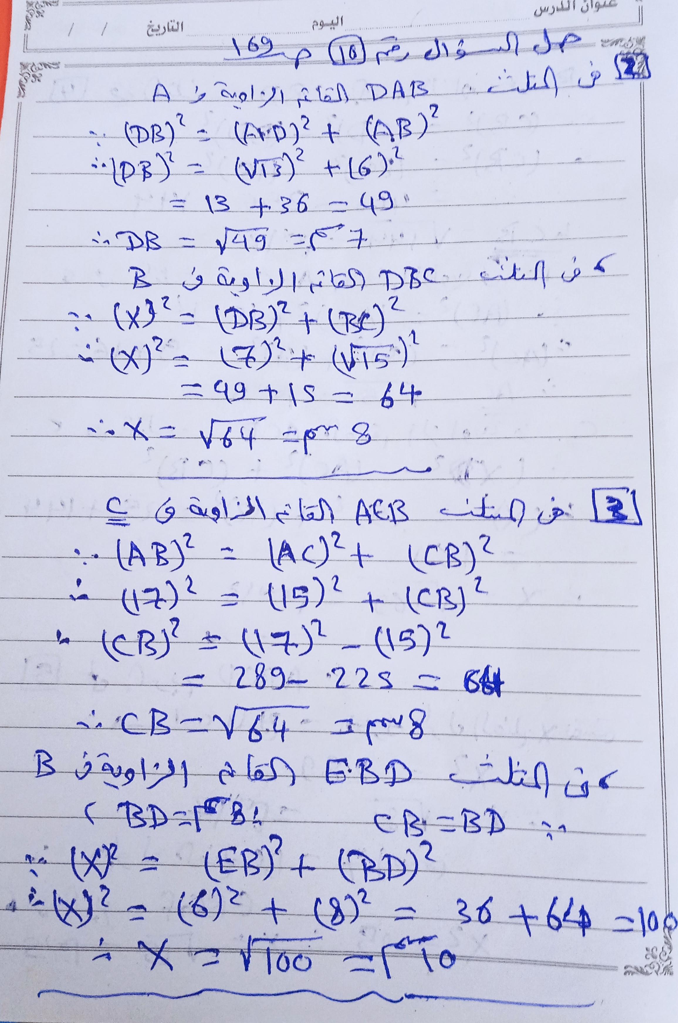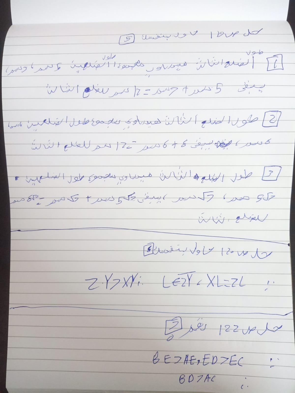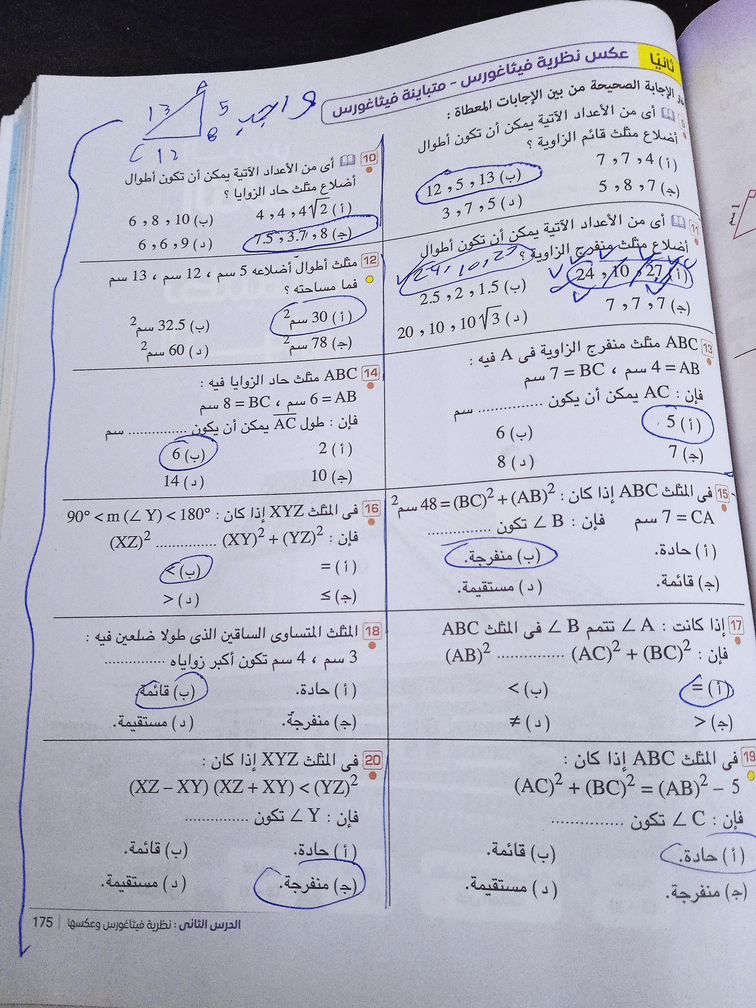 تم حل واجب الرياضيات الاختياري كامل لنظرية فيثاغورس وعكسها ومتباينتها