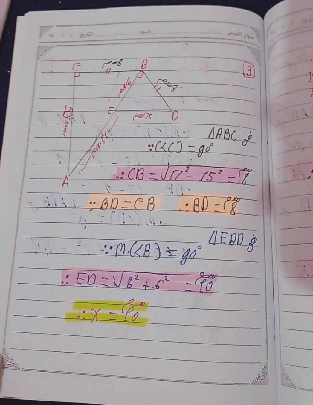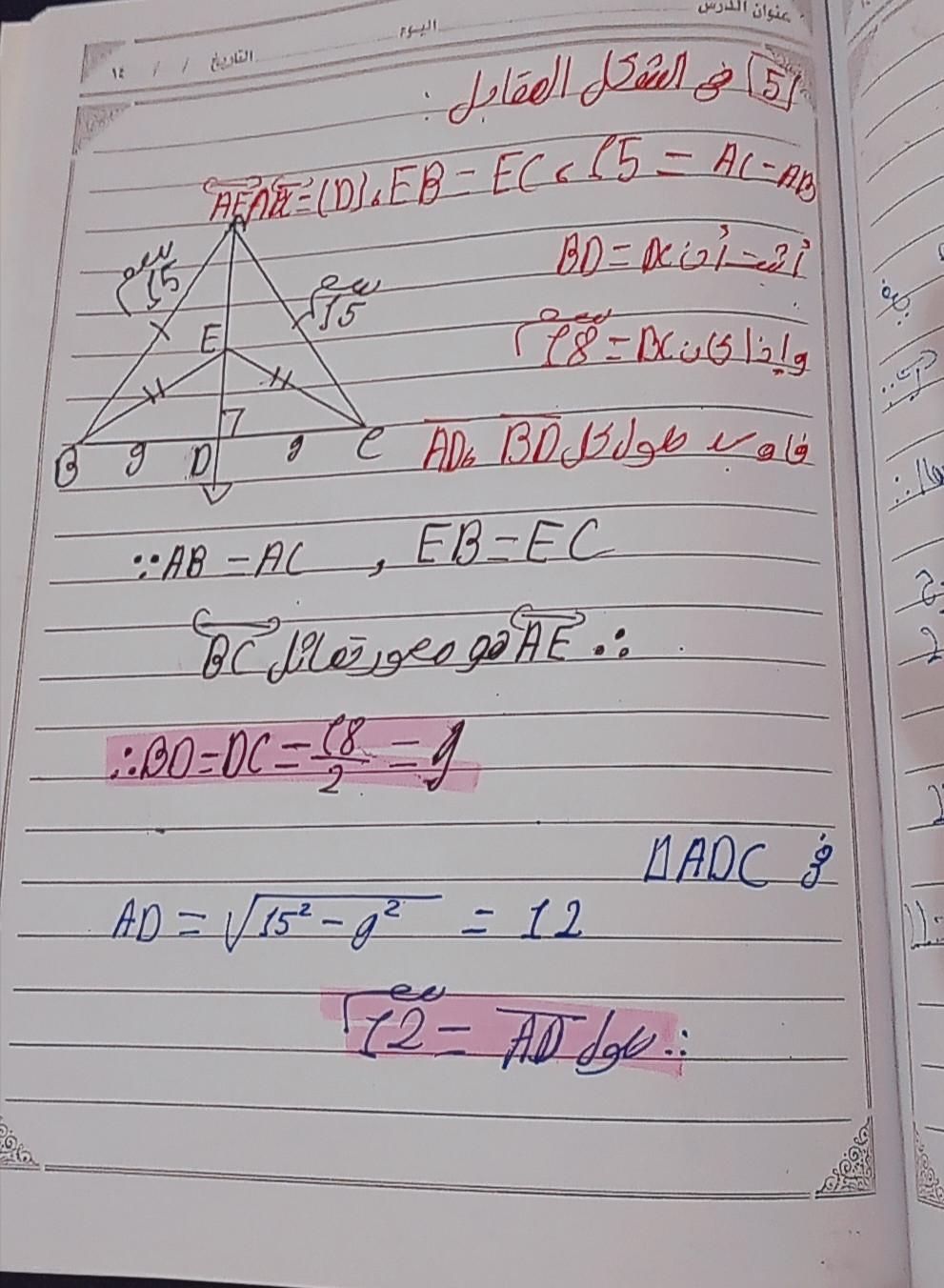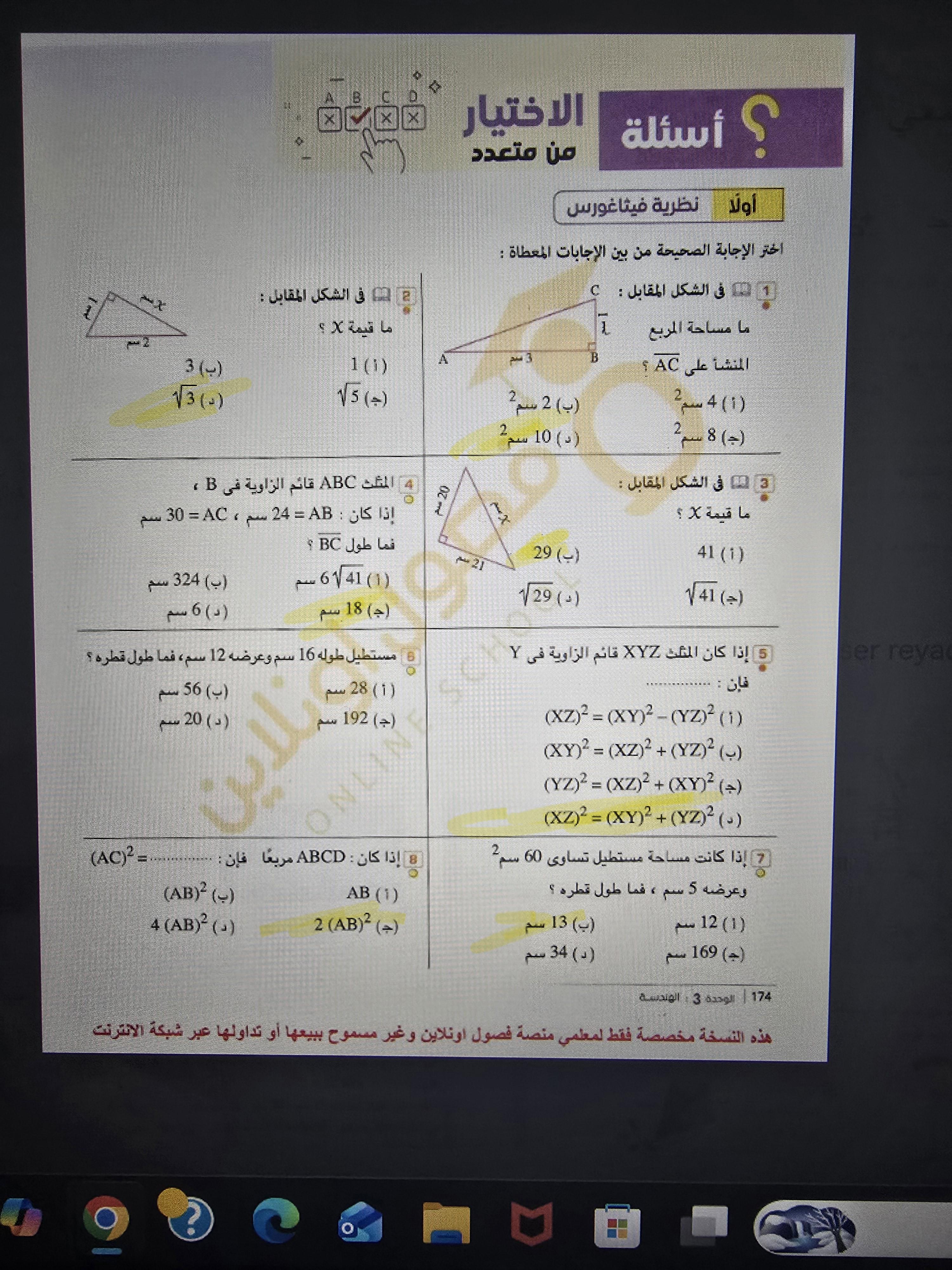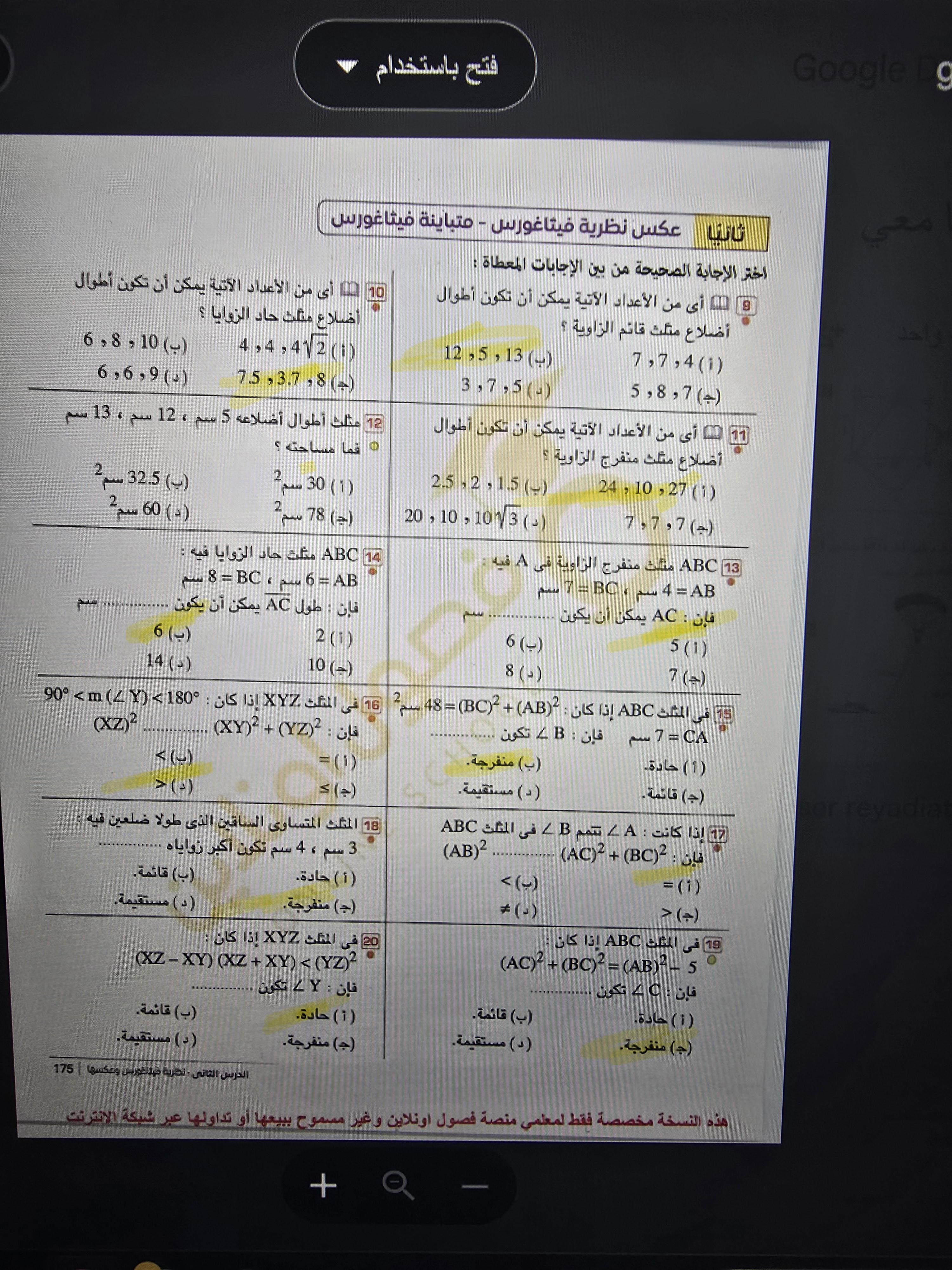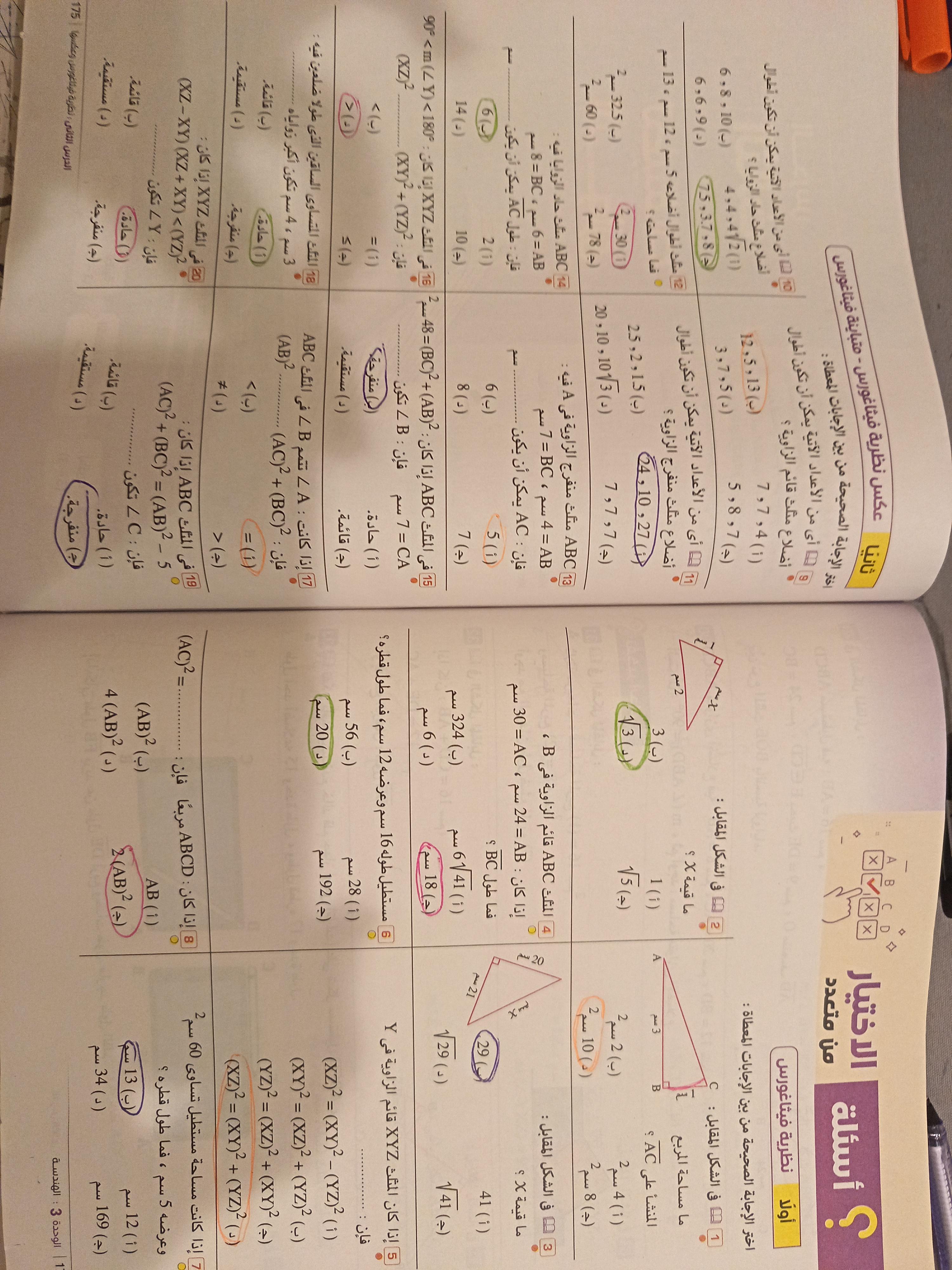 تم حل واجب الرياضيات الاختياري كامل لنظرية فيثاغورس وعكسها ومتباينتها