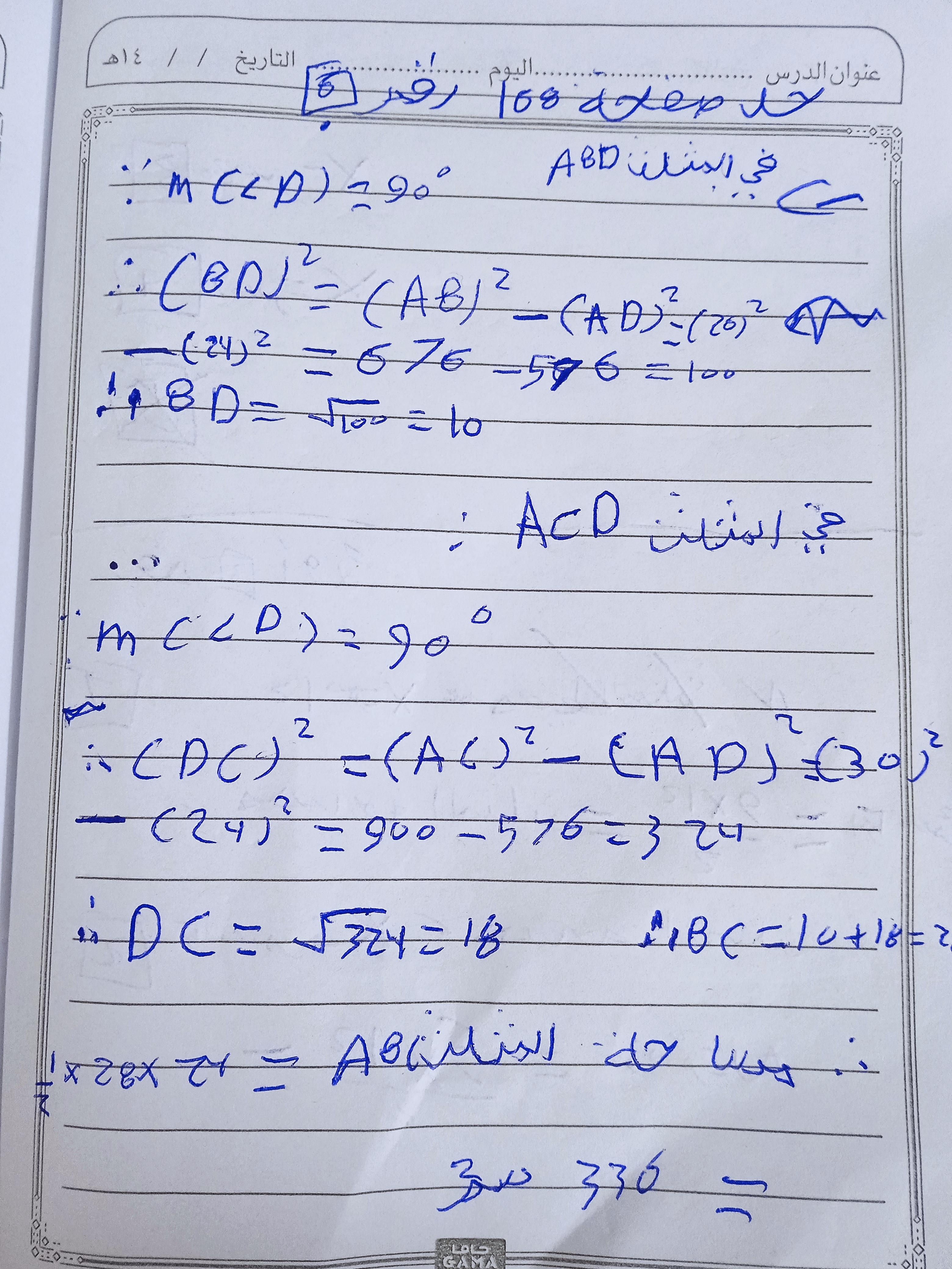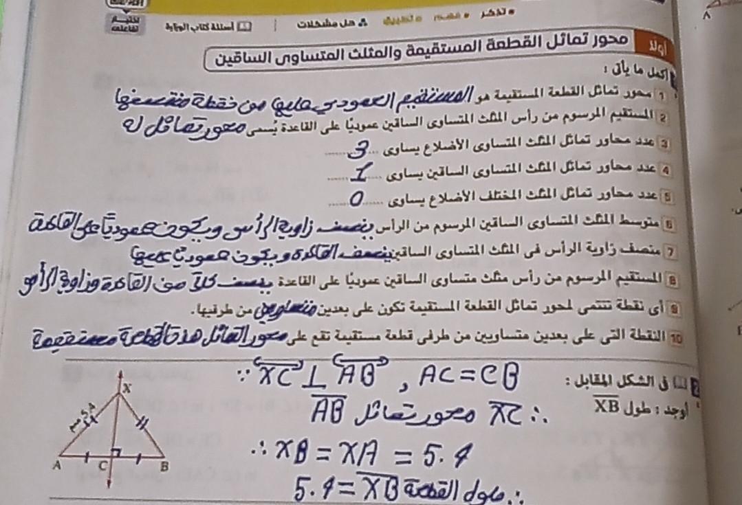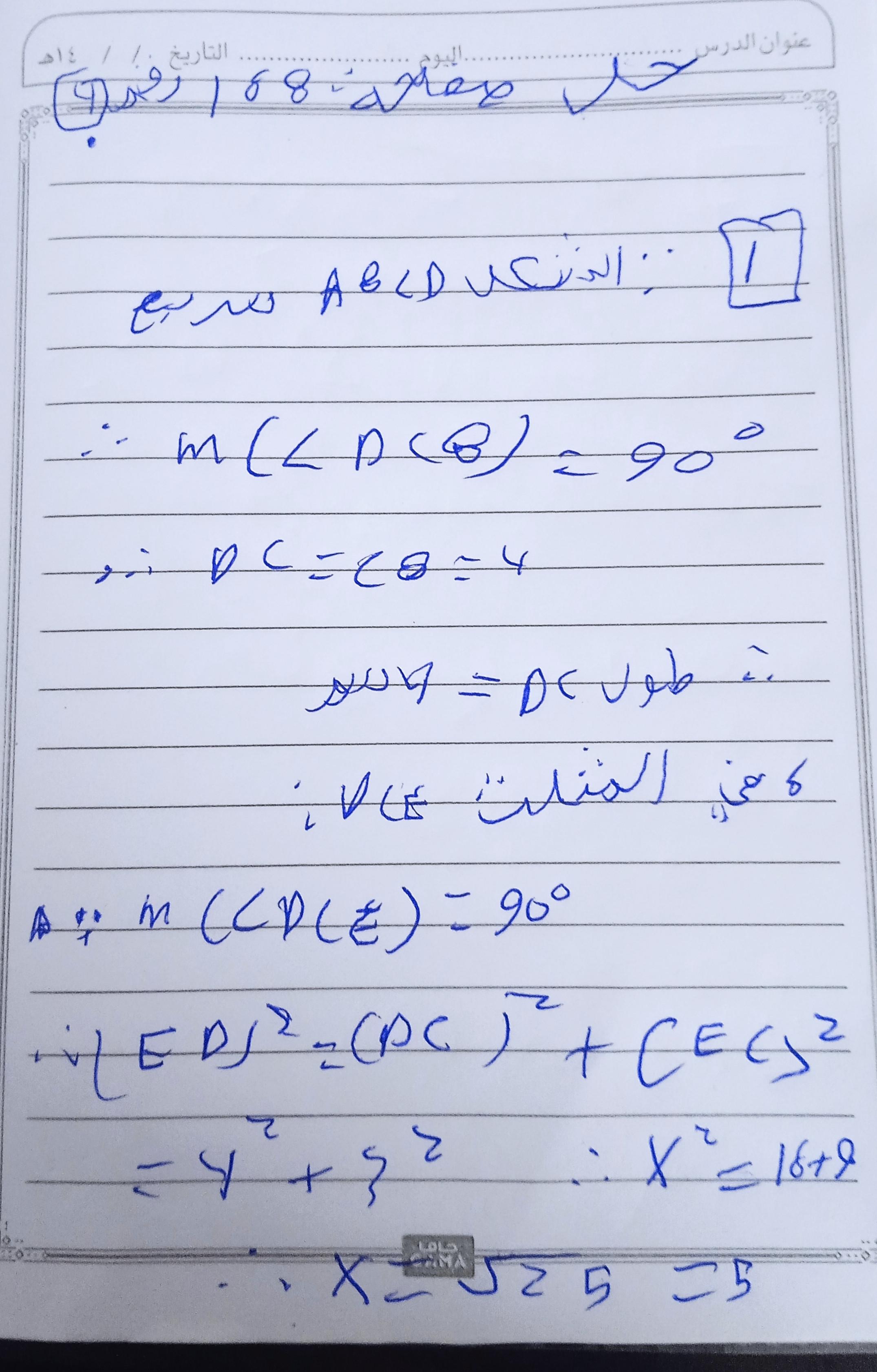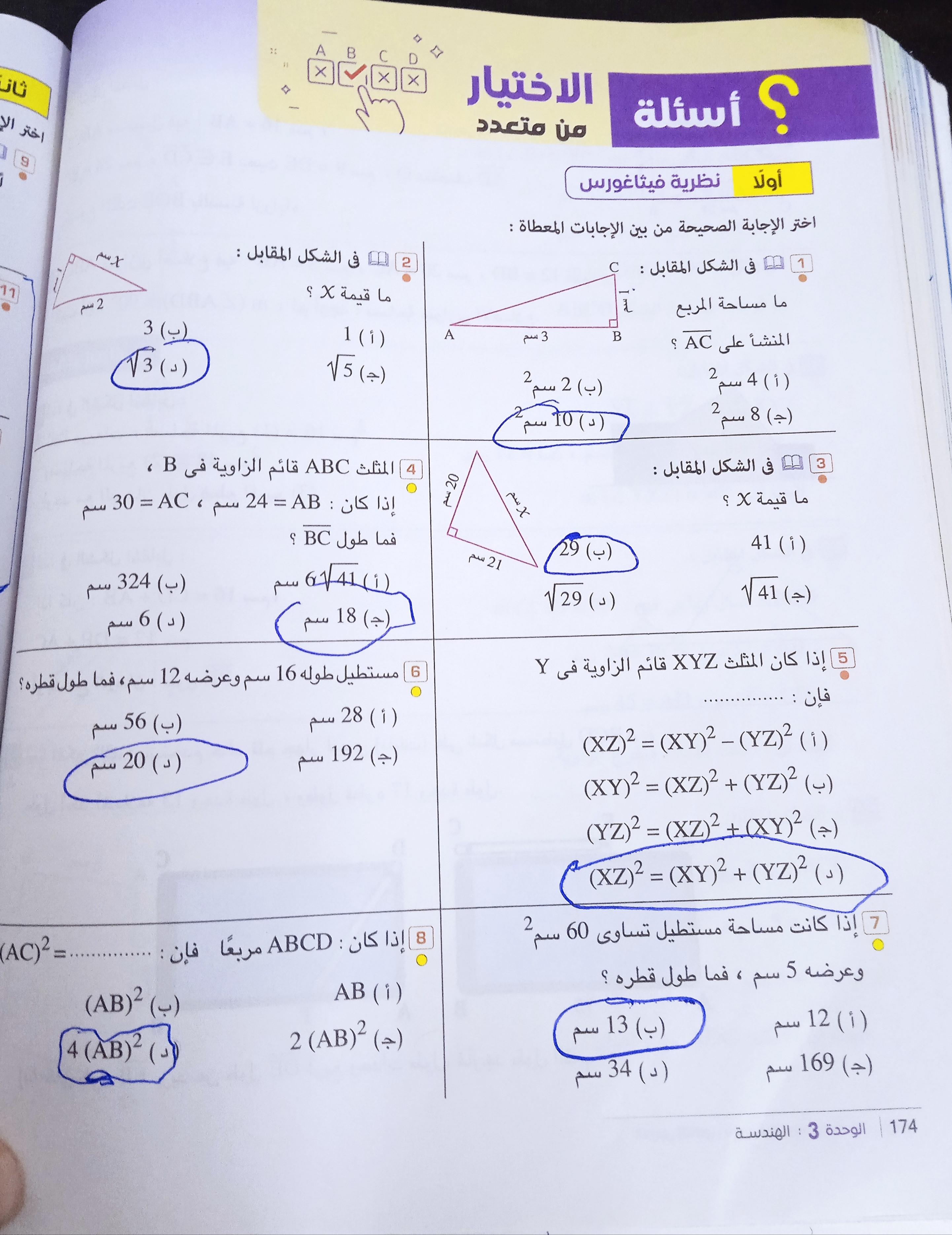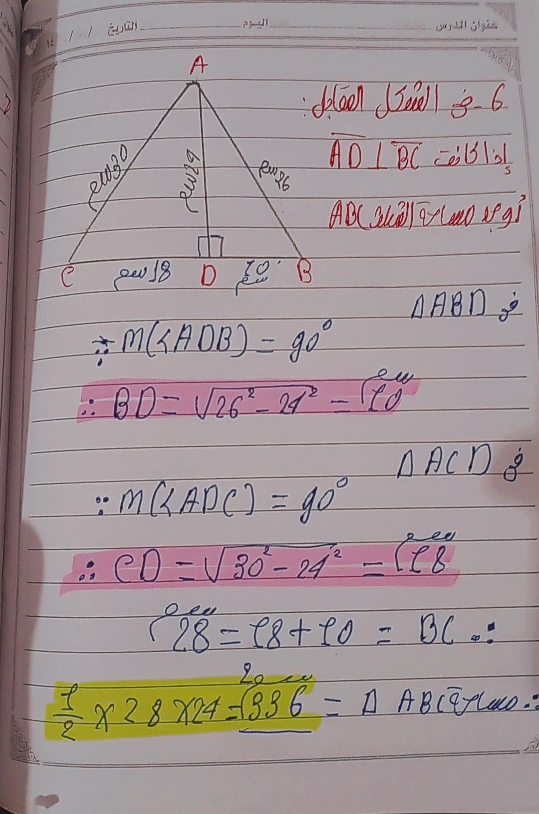 تم حل واجب الرياضيات الاختياري كامل لنظرية فيثاغورس وعكسها ومتباينتها