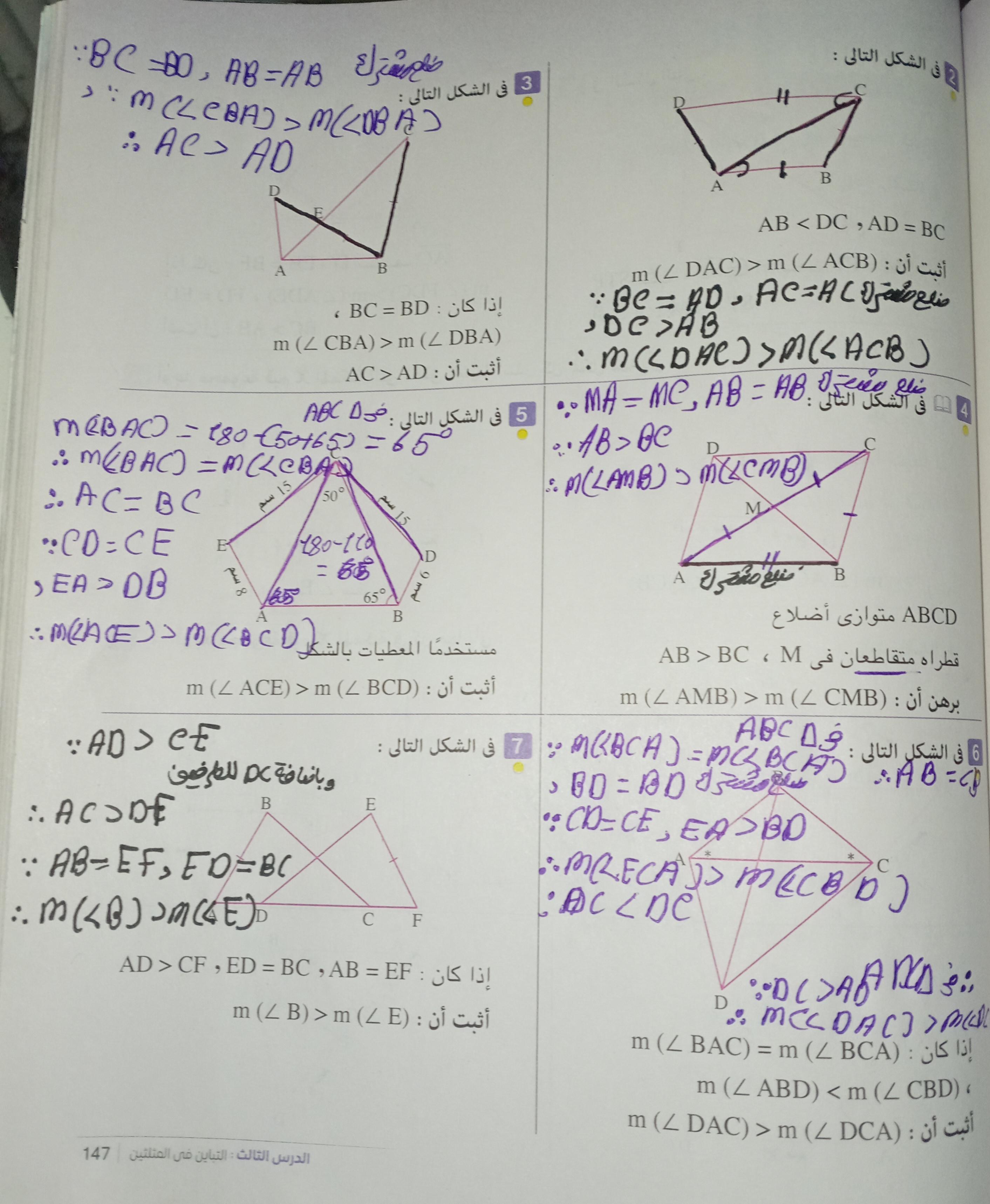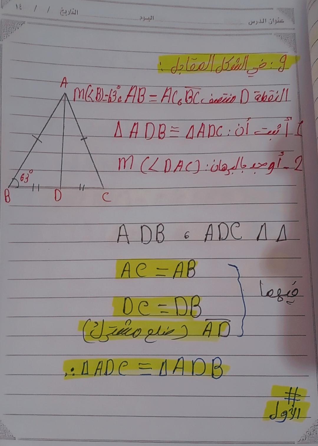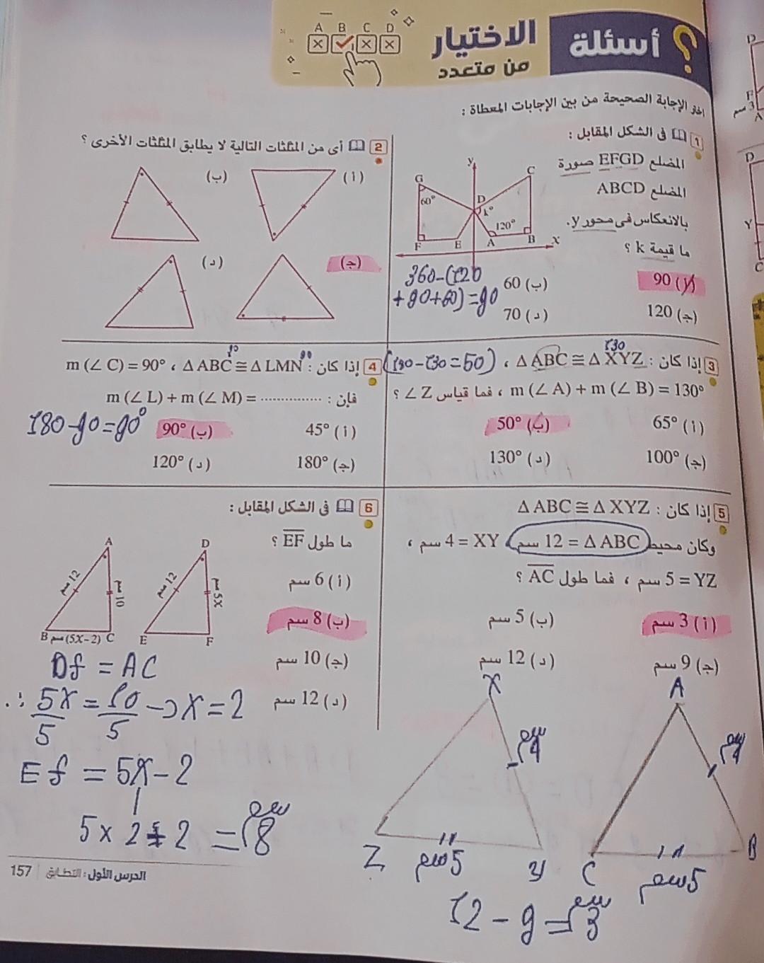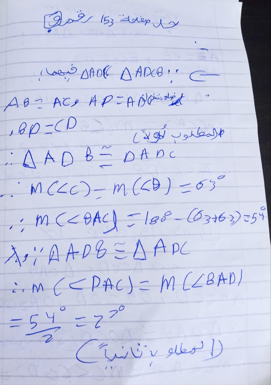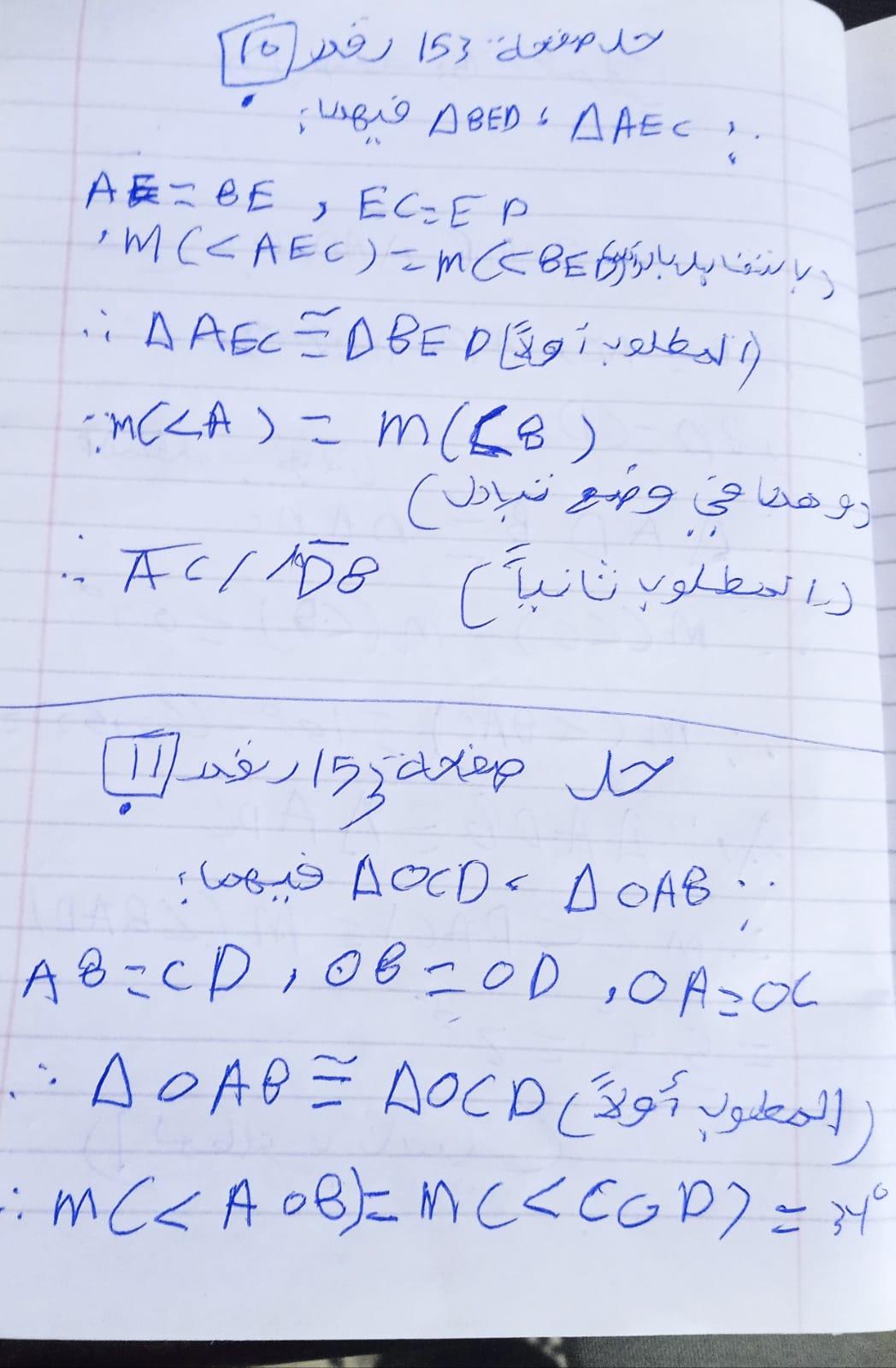 تم شرح حالات تطابق مثلثين والحل على اول حالتين ٣ اضلاع و وضلعان وزاويه محصوره و الواجب ص ١٥٣ رقم ٩و١٠ و١١