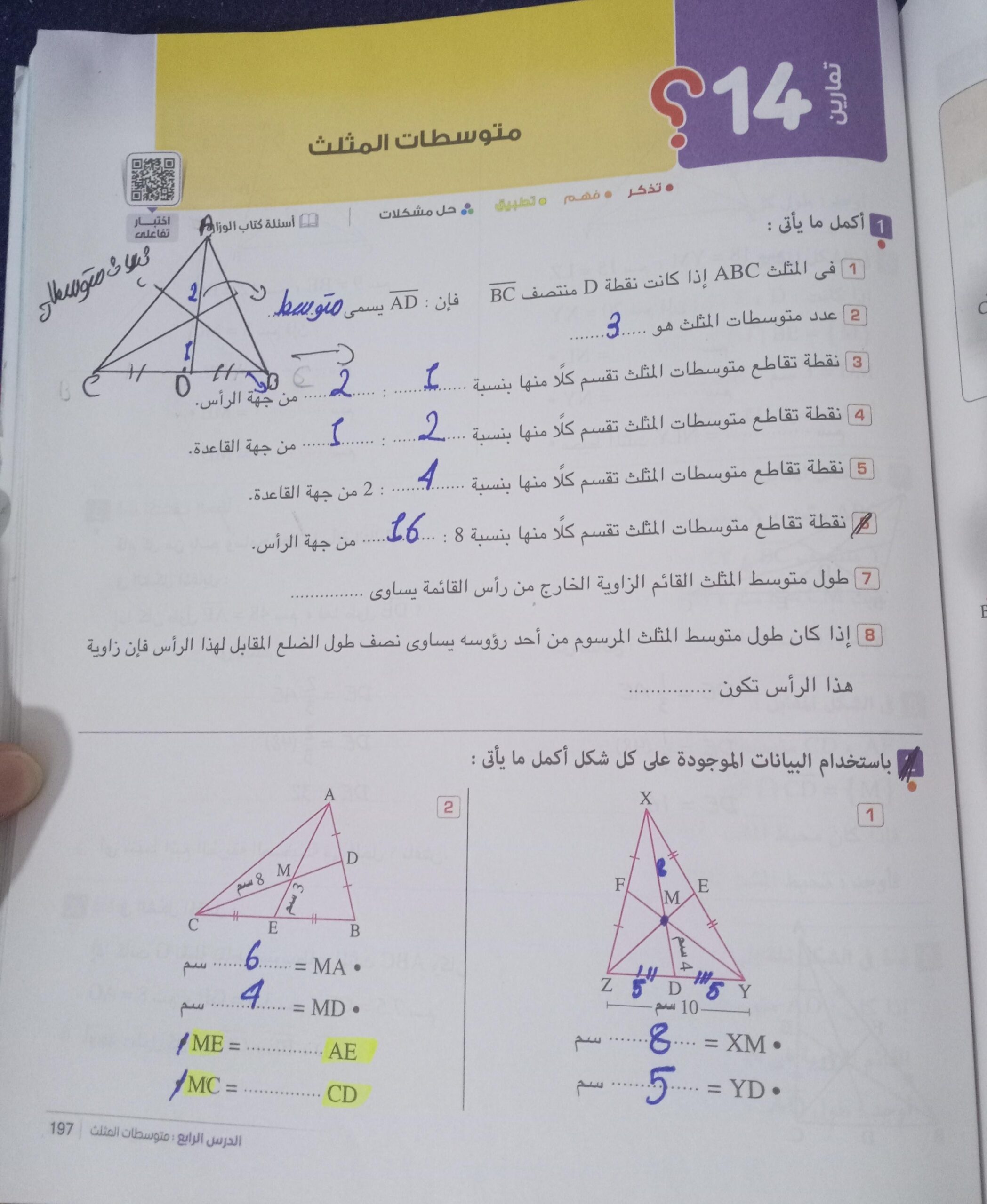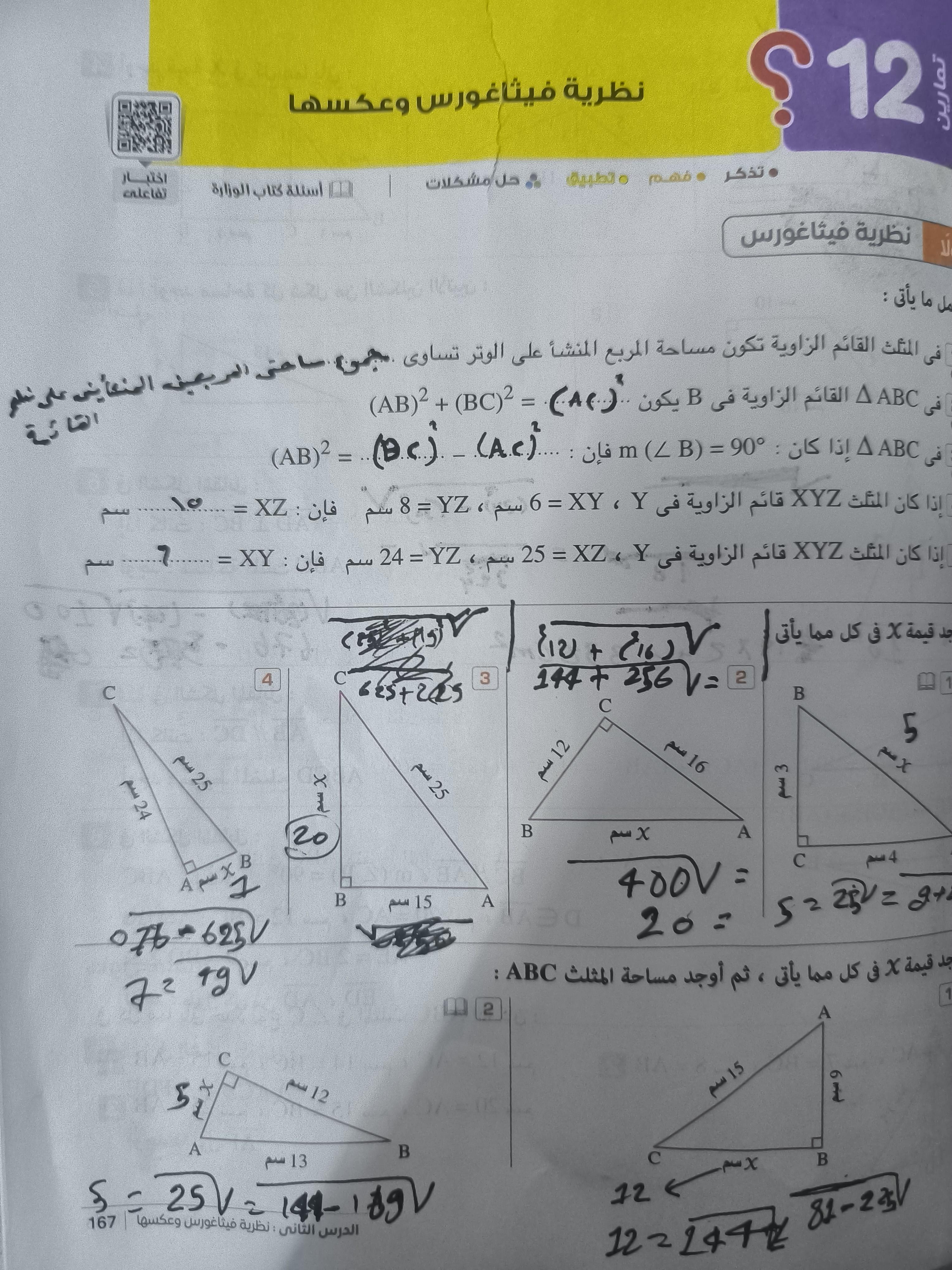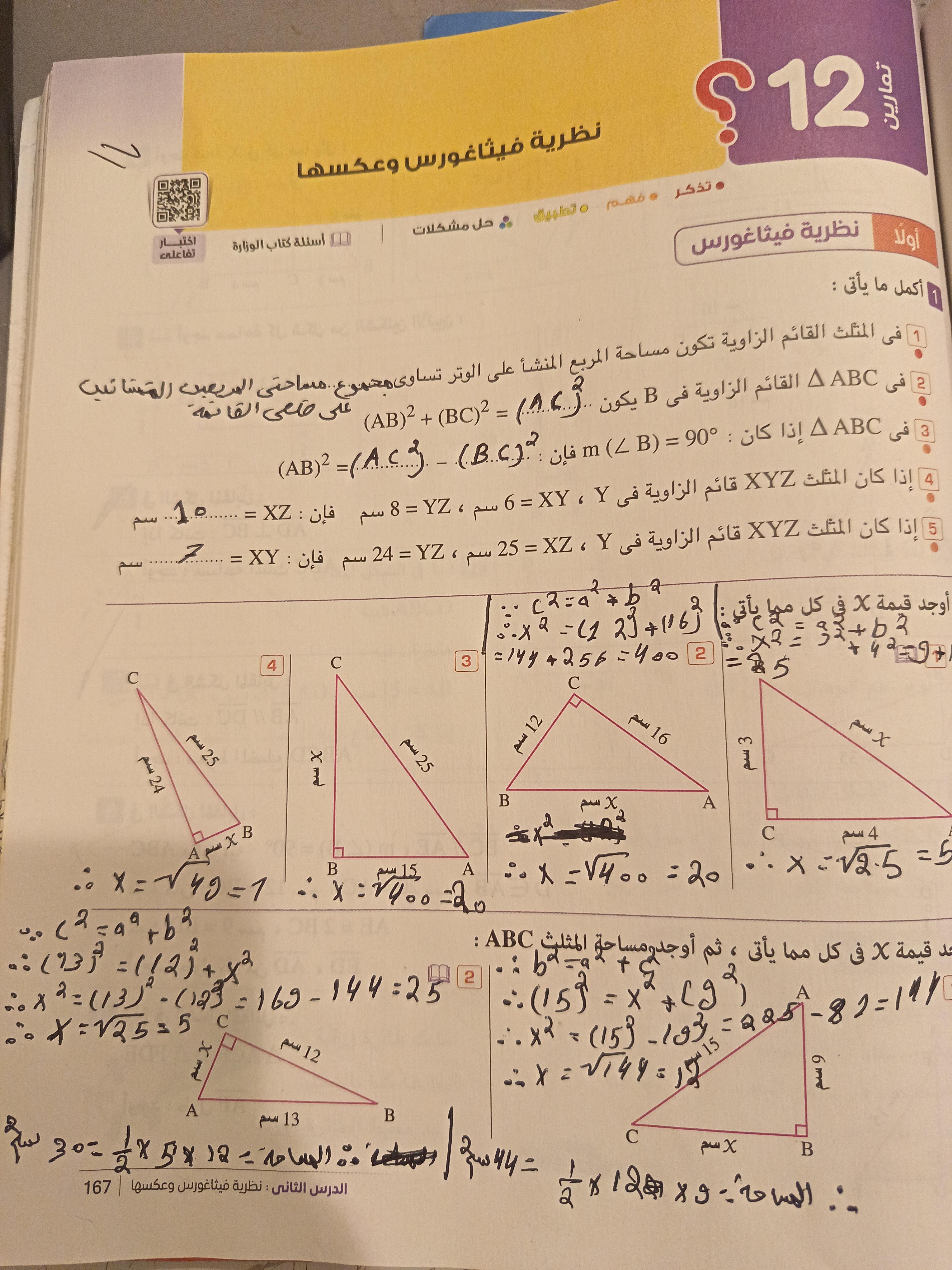 تم حل تدريبات على نظريه فيساغورث وعكسها ومتابينه المثلث