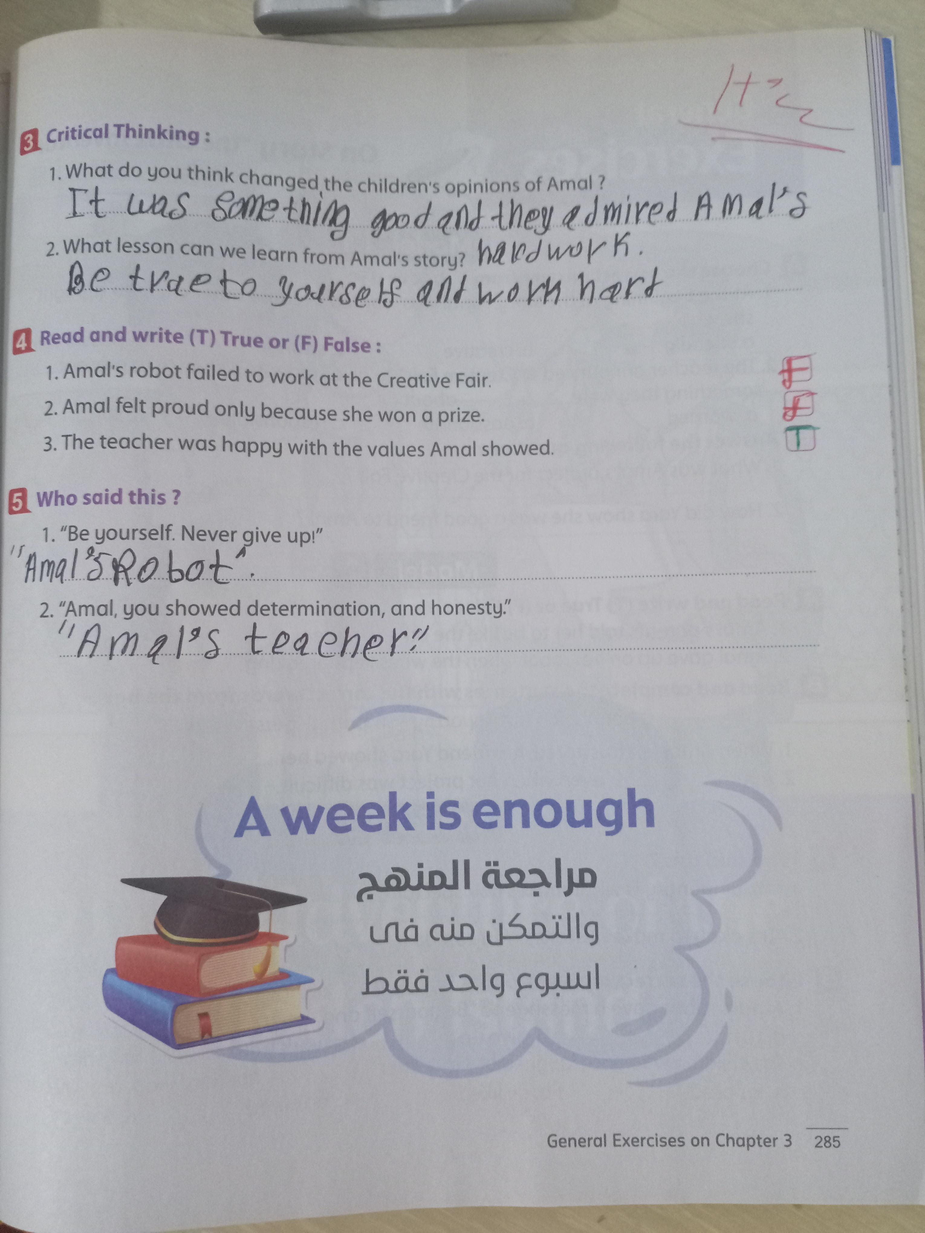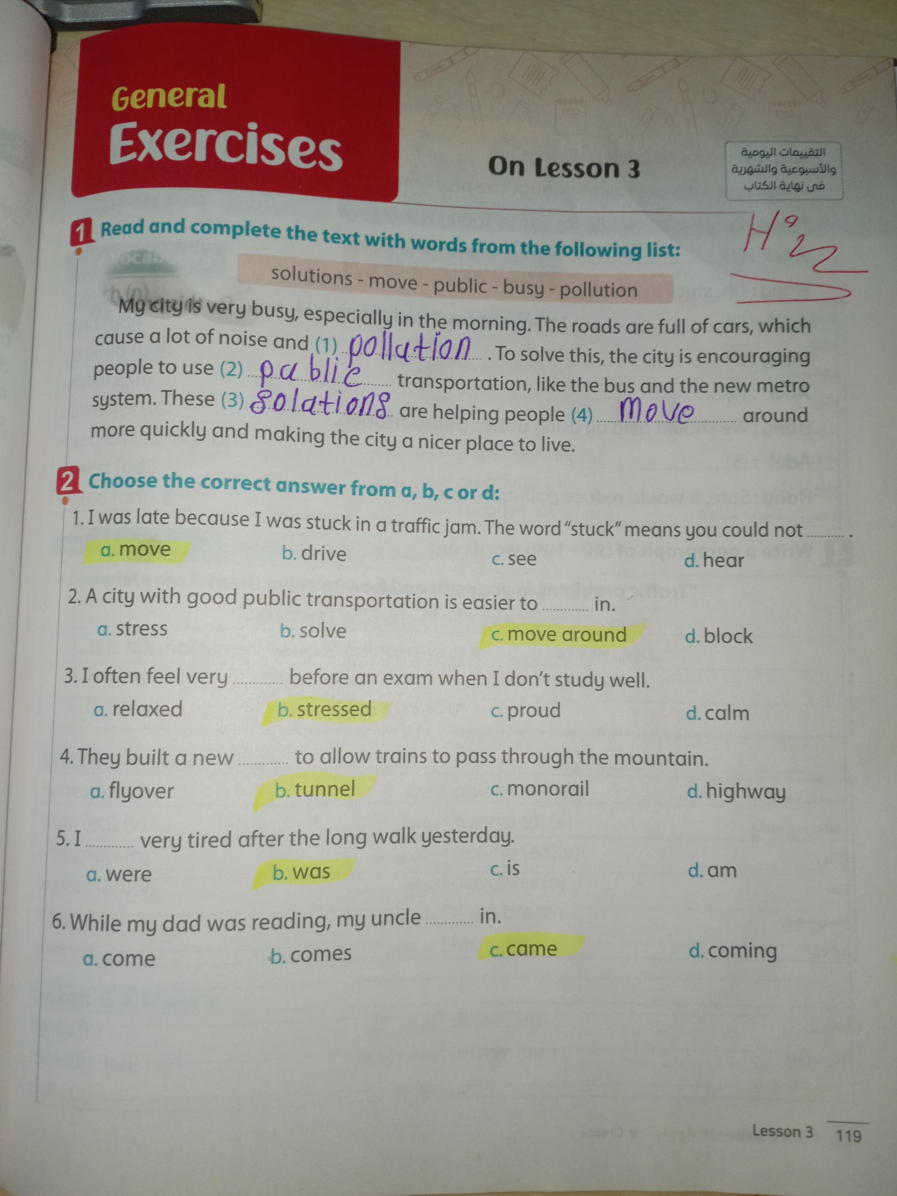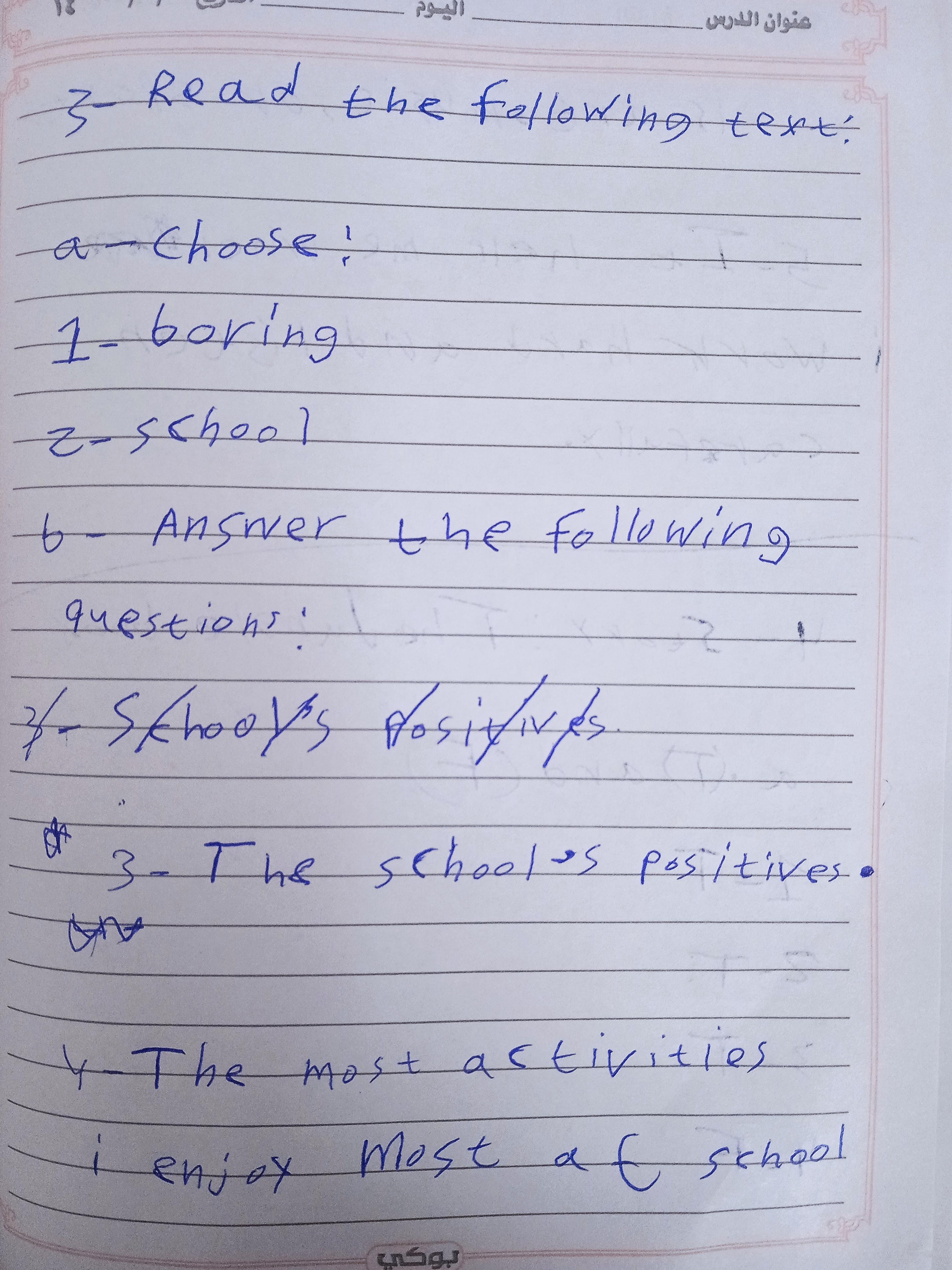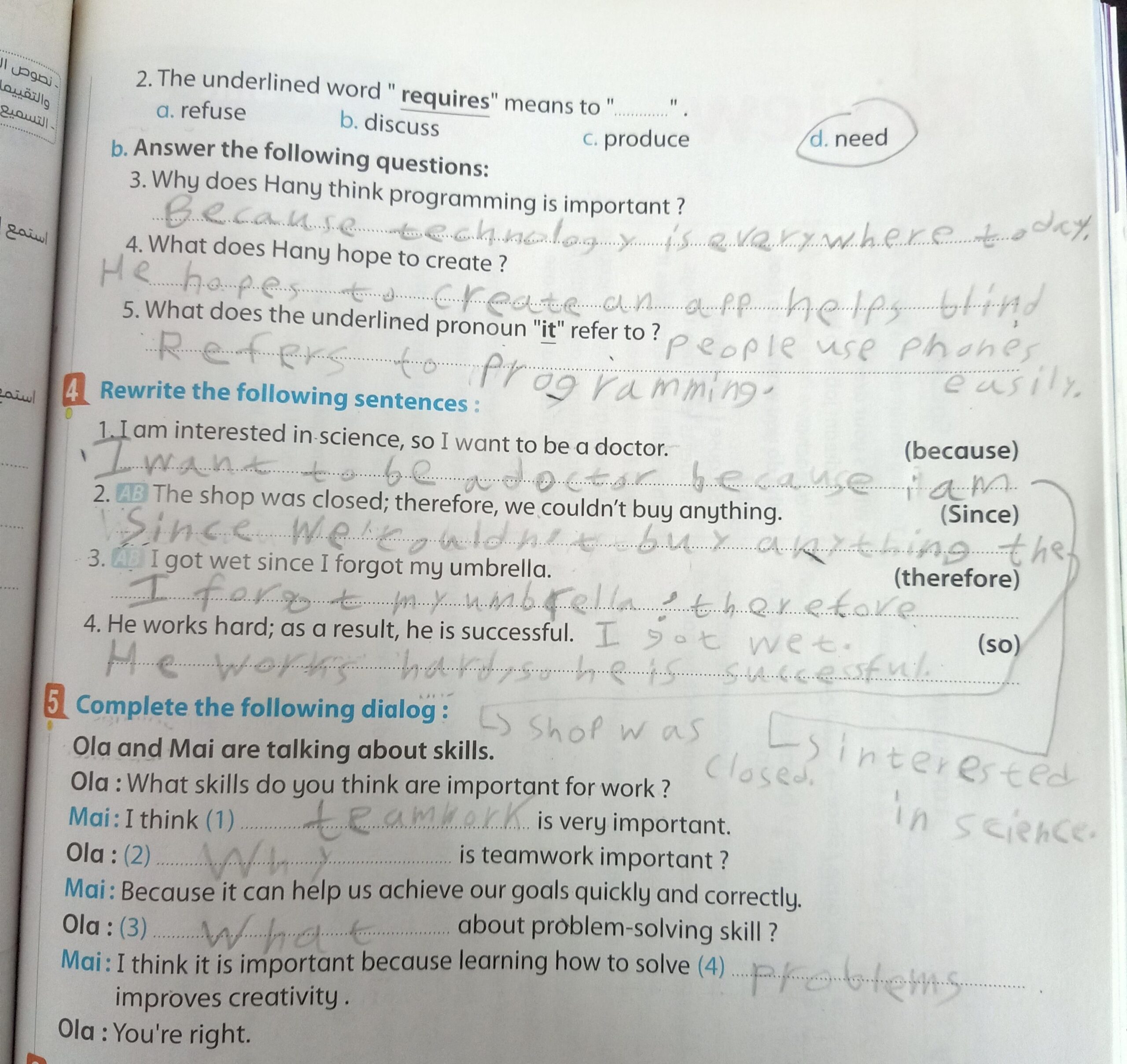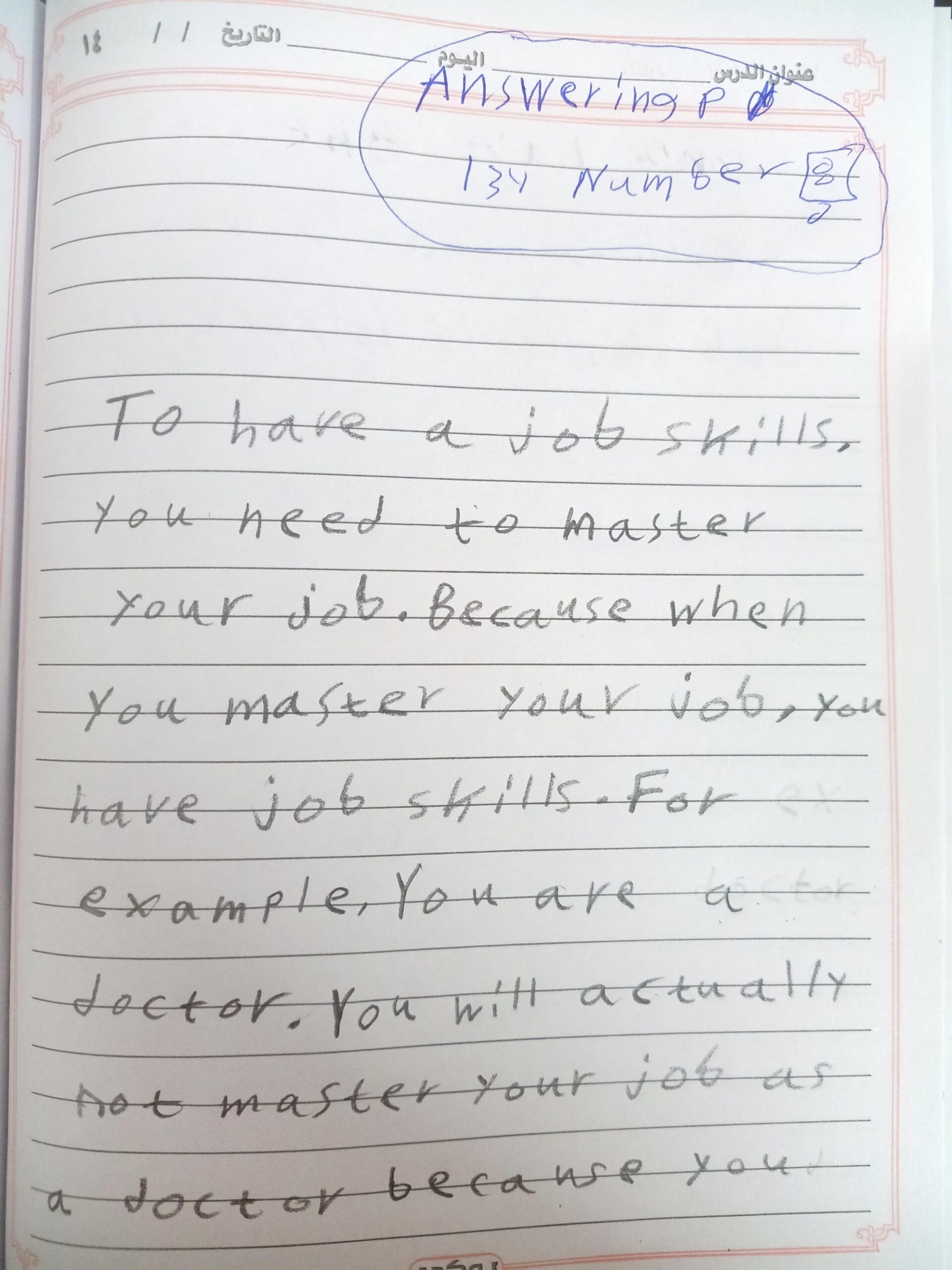 Today, we answered the test on U.9 on pages (132,133, and 134) and the general exercise on Review 3 on pages (137, 138, 139)… Page 140 is left for next time in sha’allah. Our homework for today is to write a paragraph (page 134) on job skills