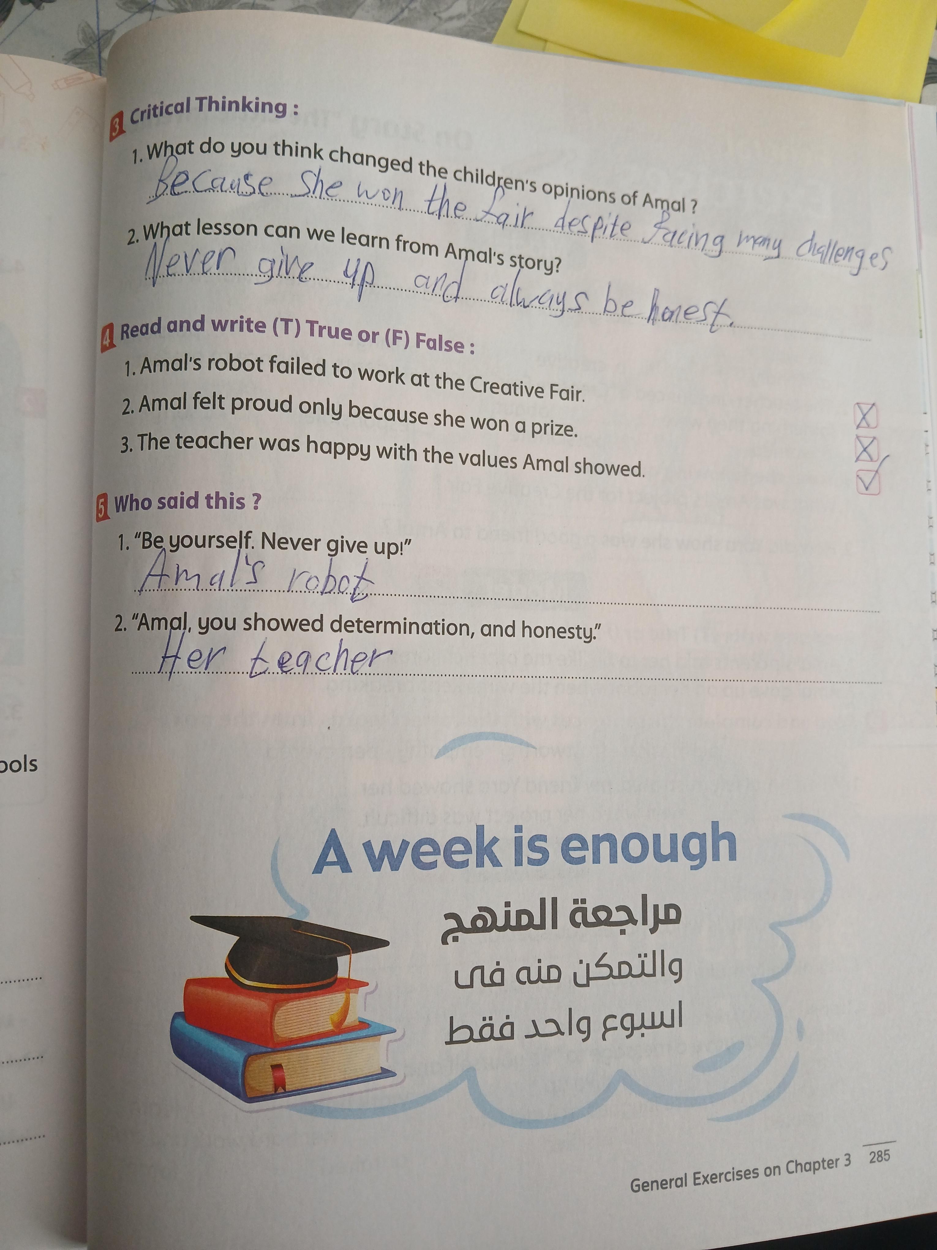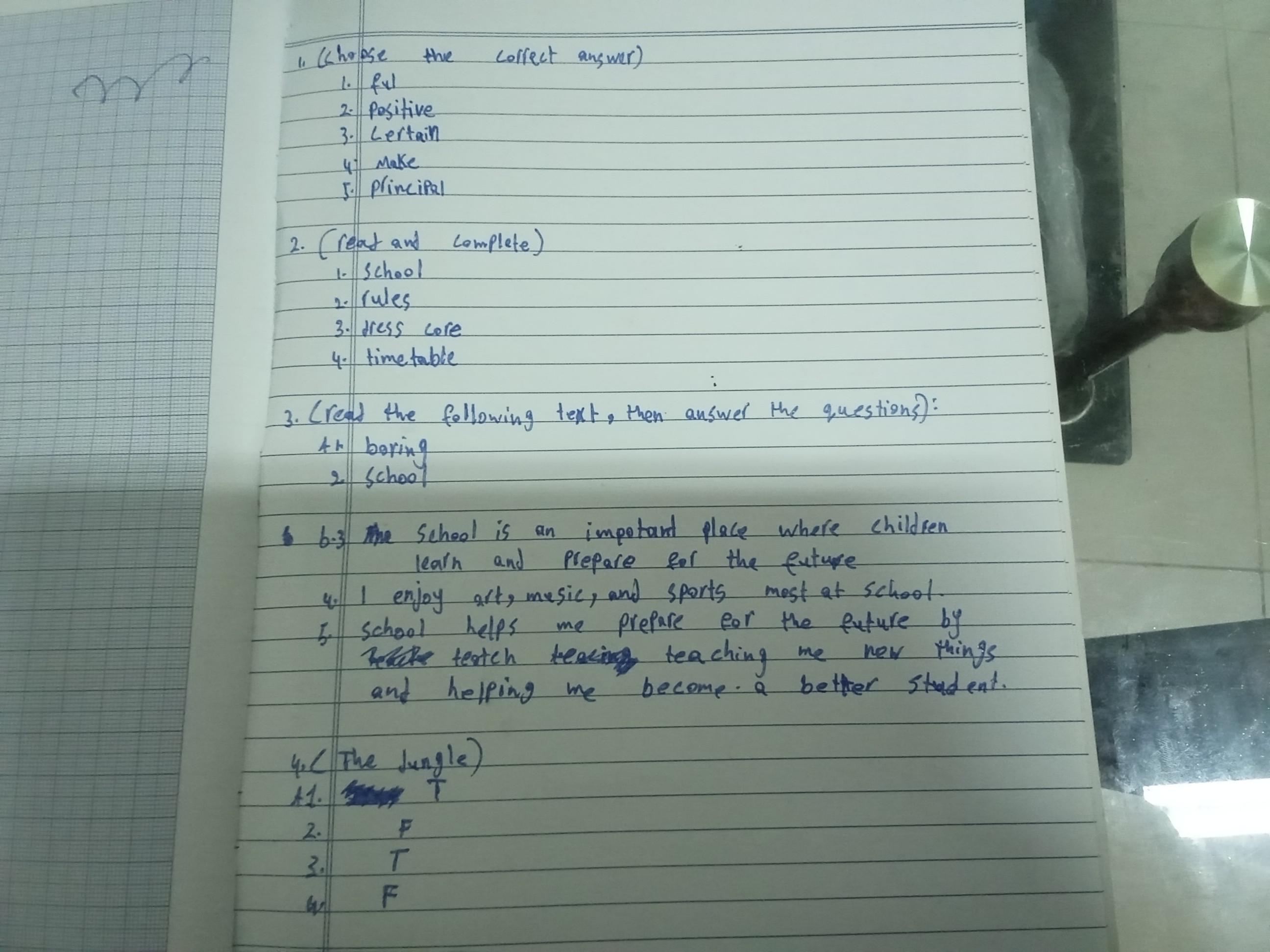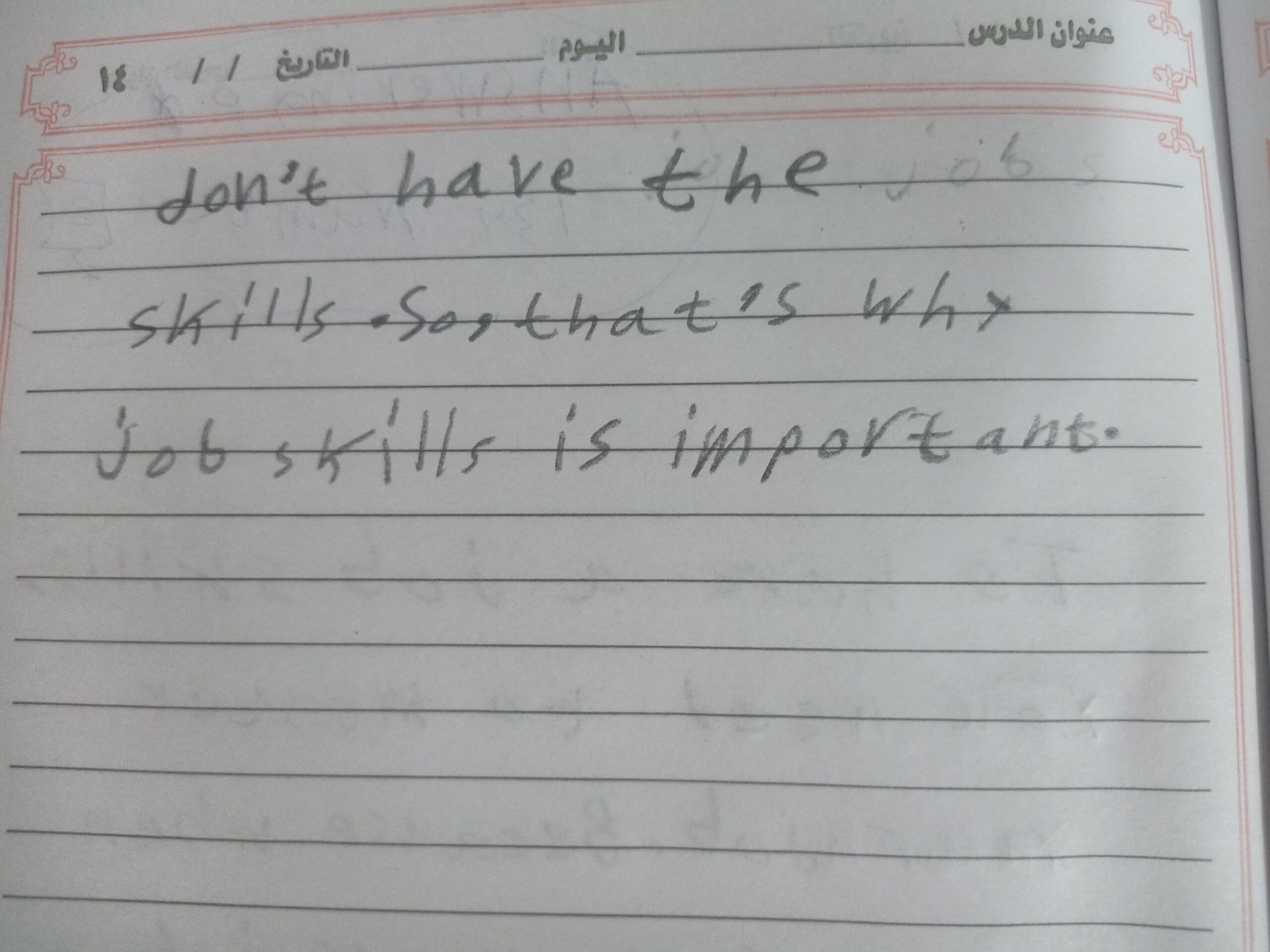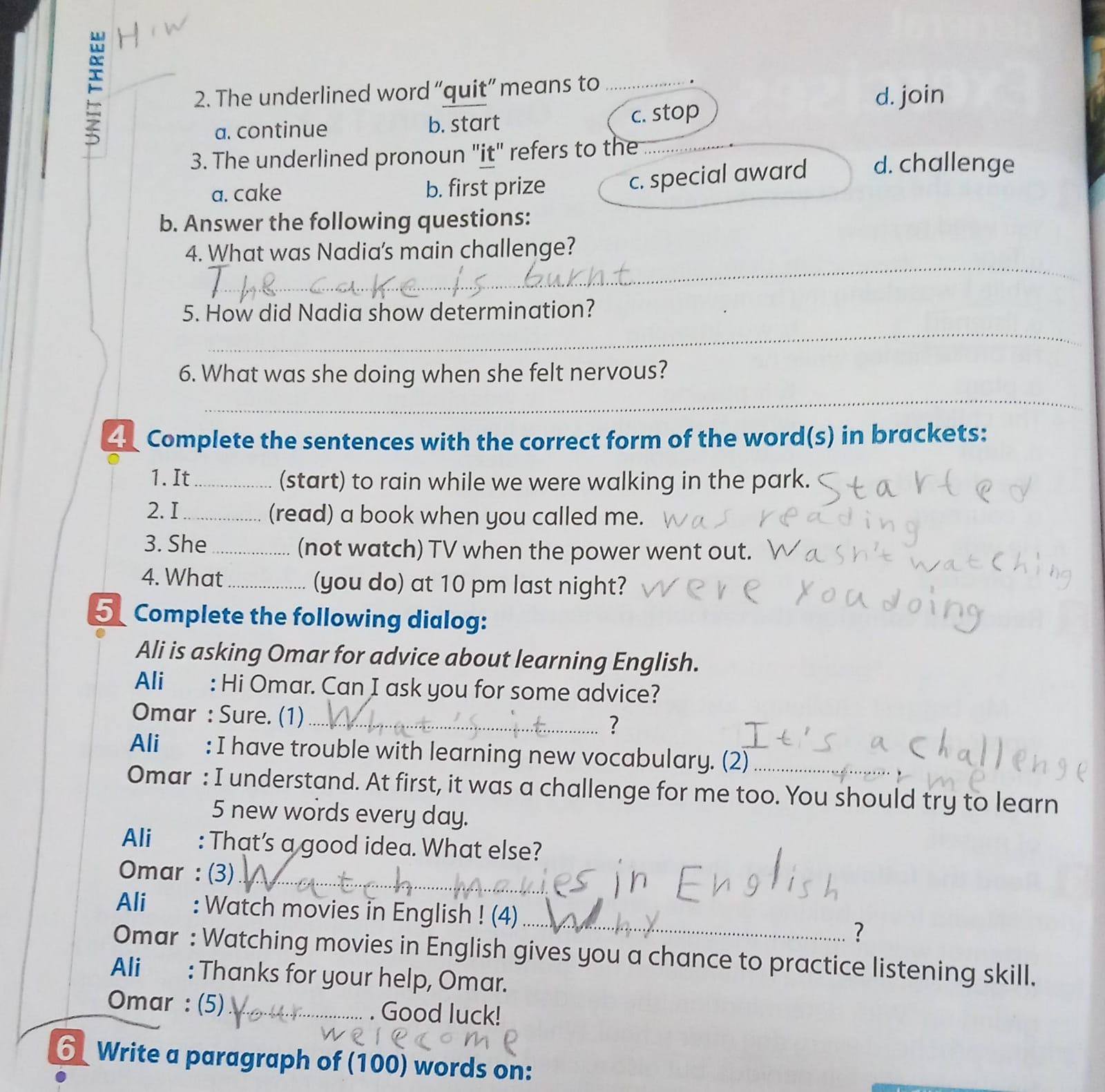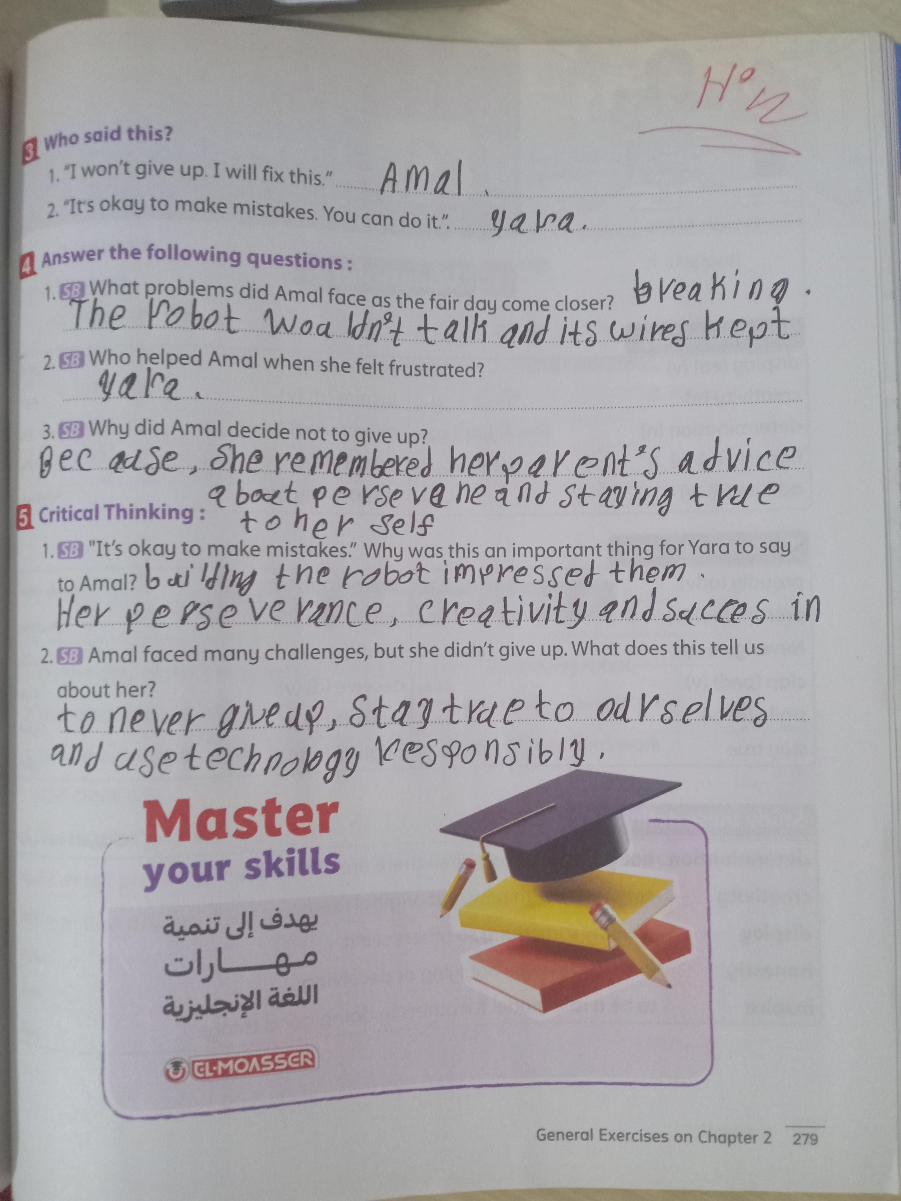 Today, we answered the test on U.9 on pages (132,133, and 134) and the general exercise on Review 3 on pages (137, 138, 139)… Page 140 is left for next time in sha’allah. Our homework for today is to write a paragraph (page 134) on job skills