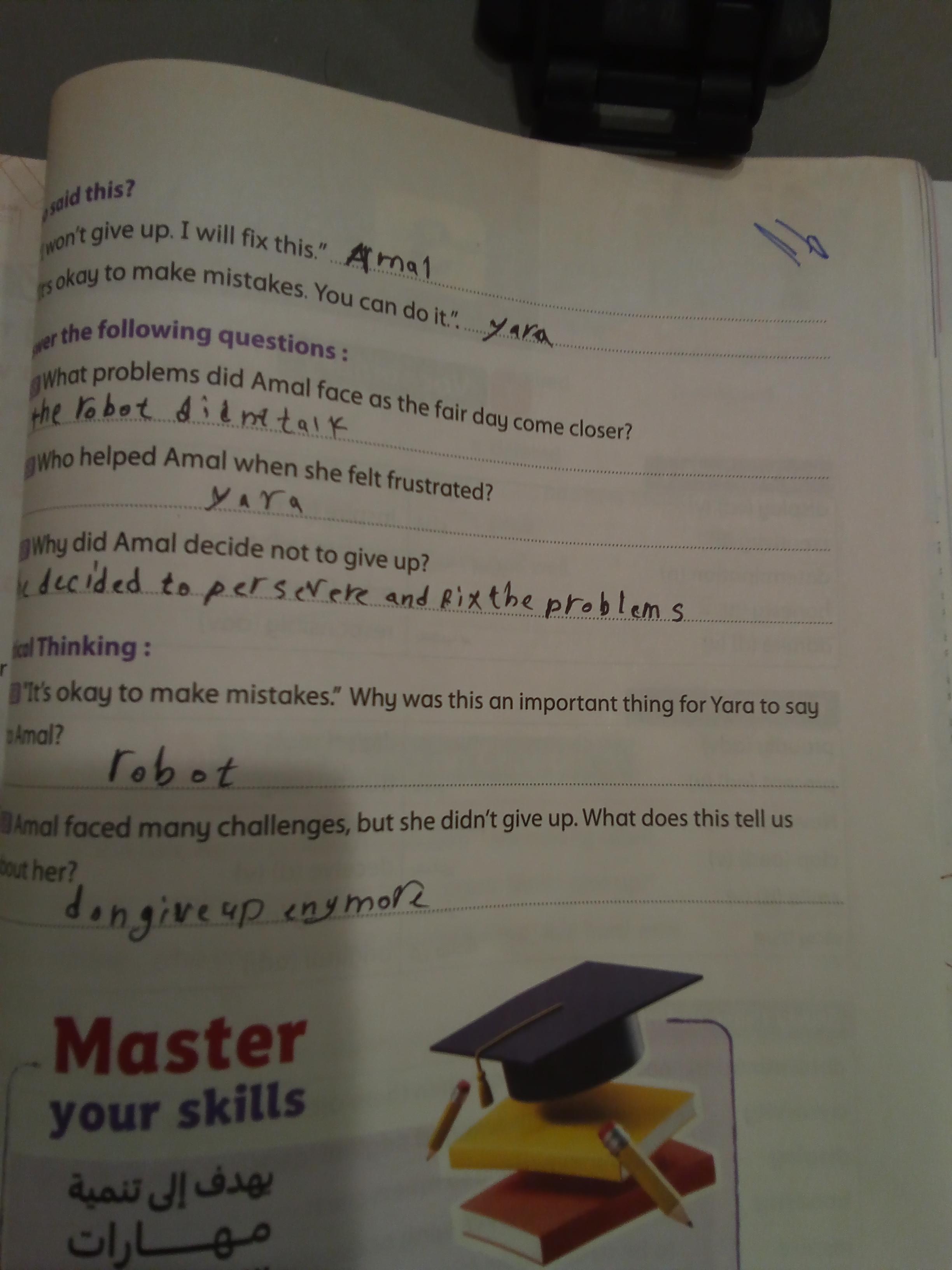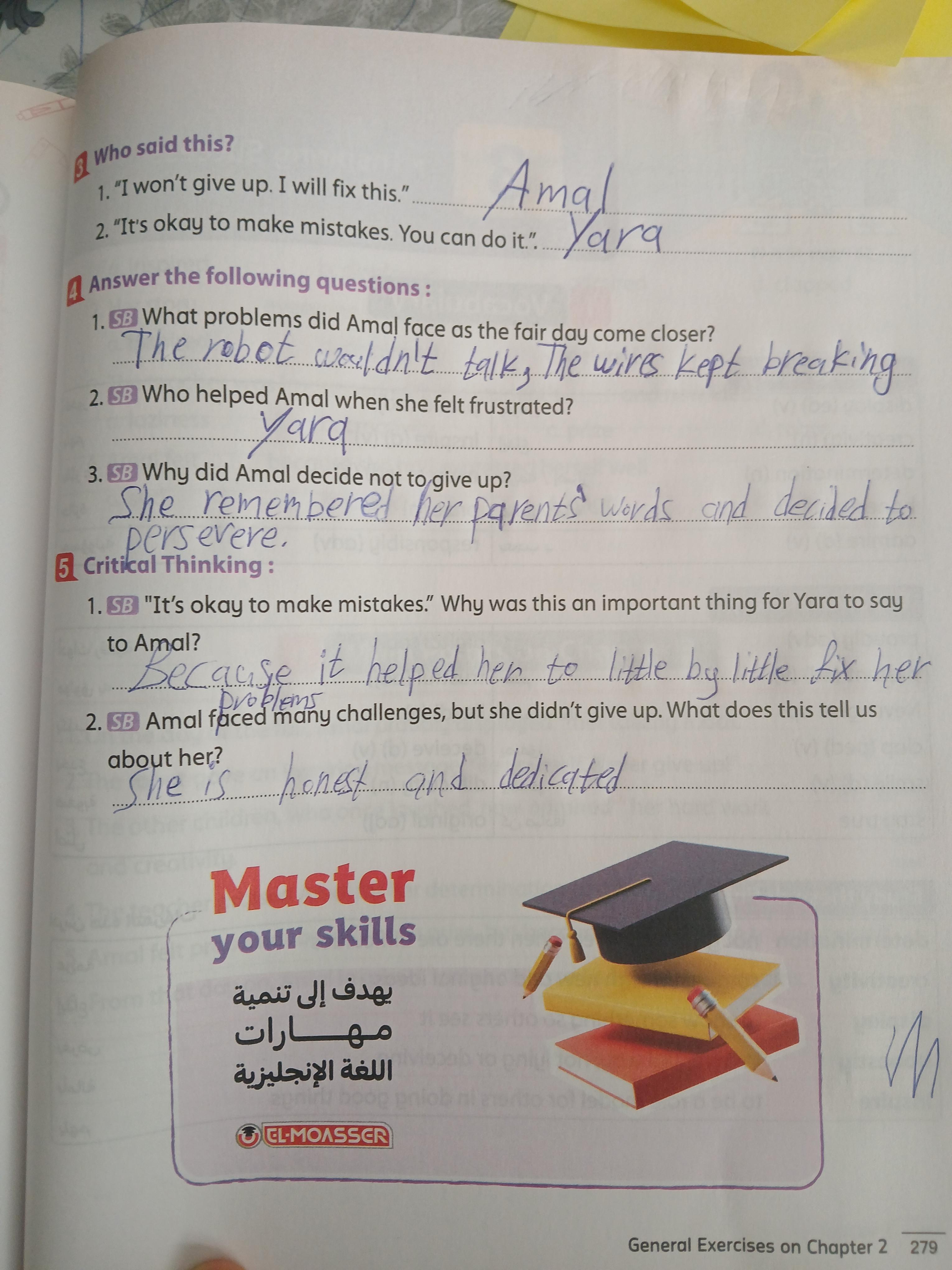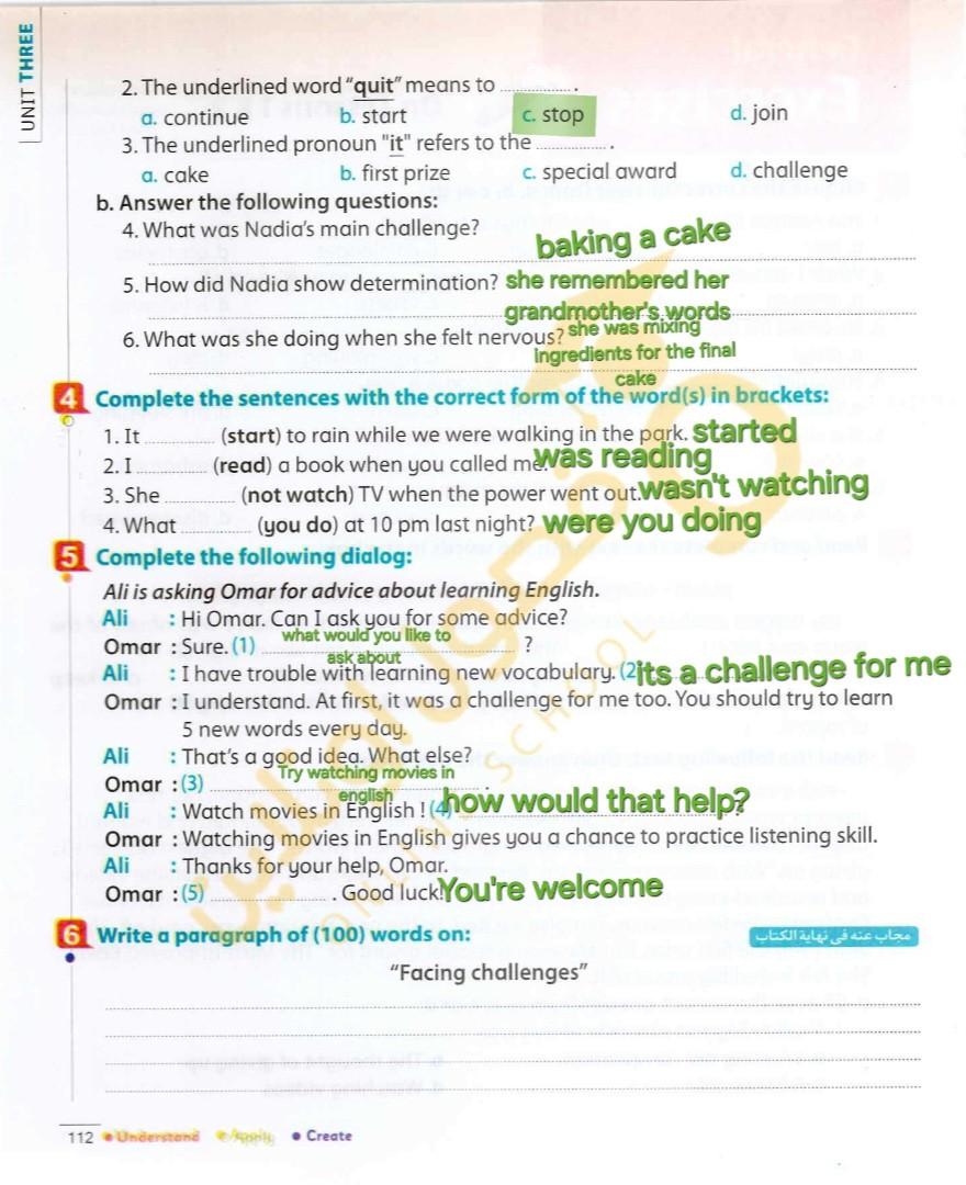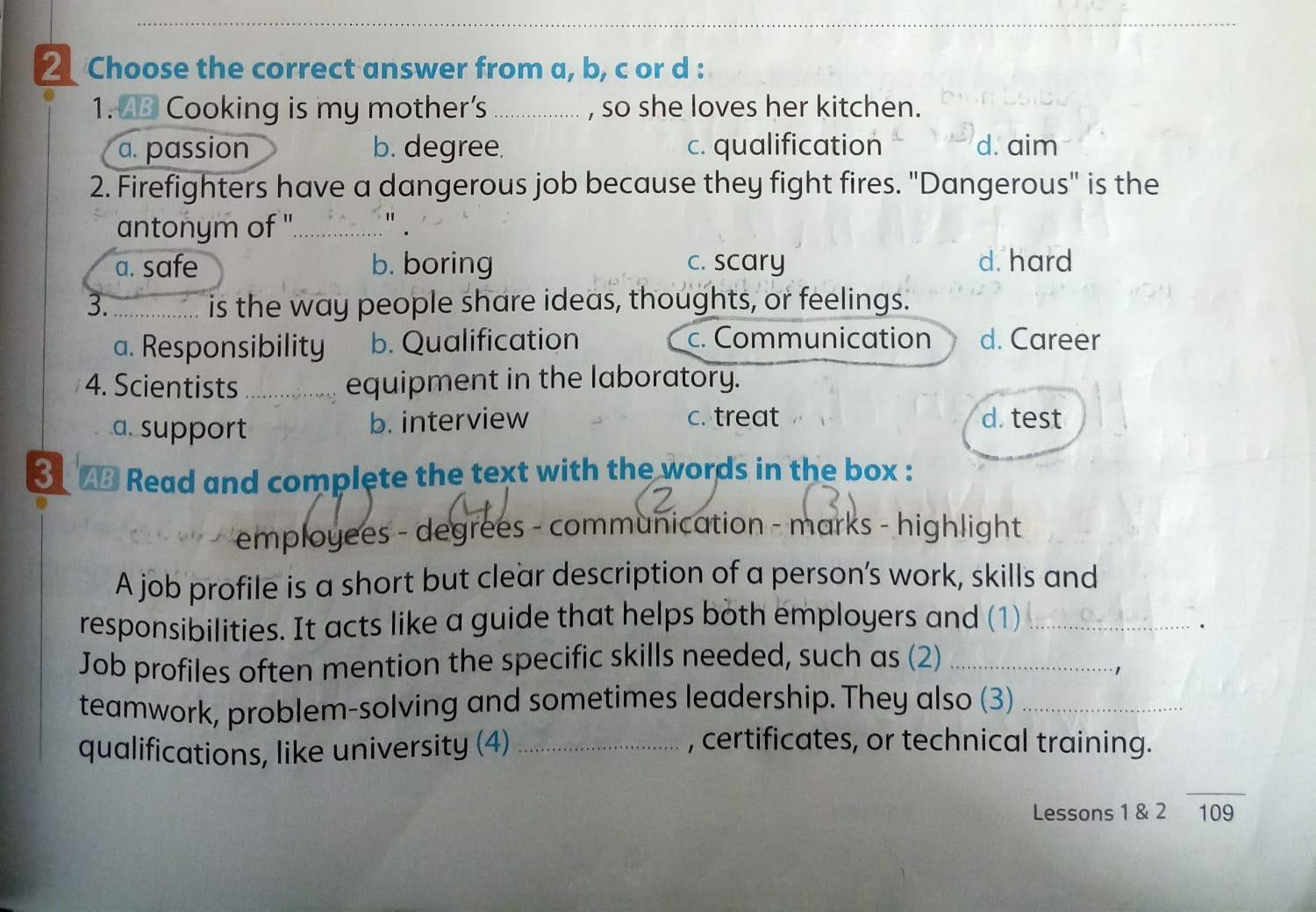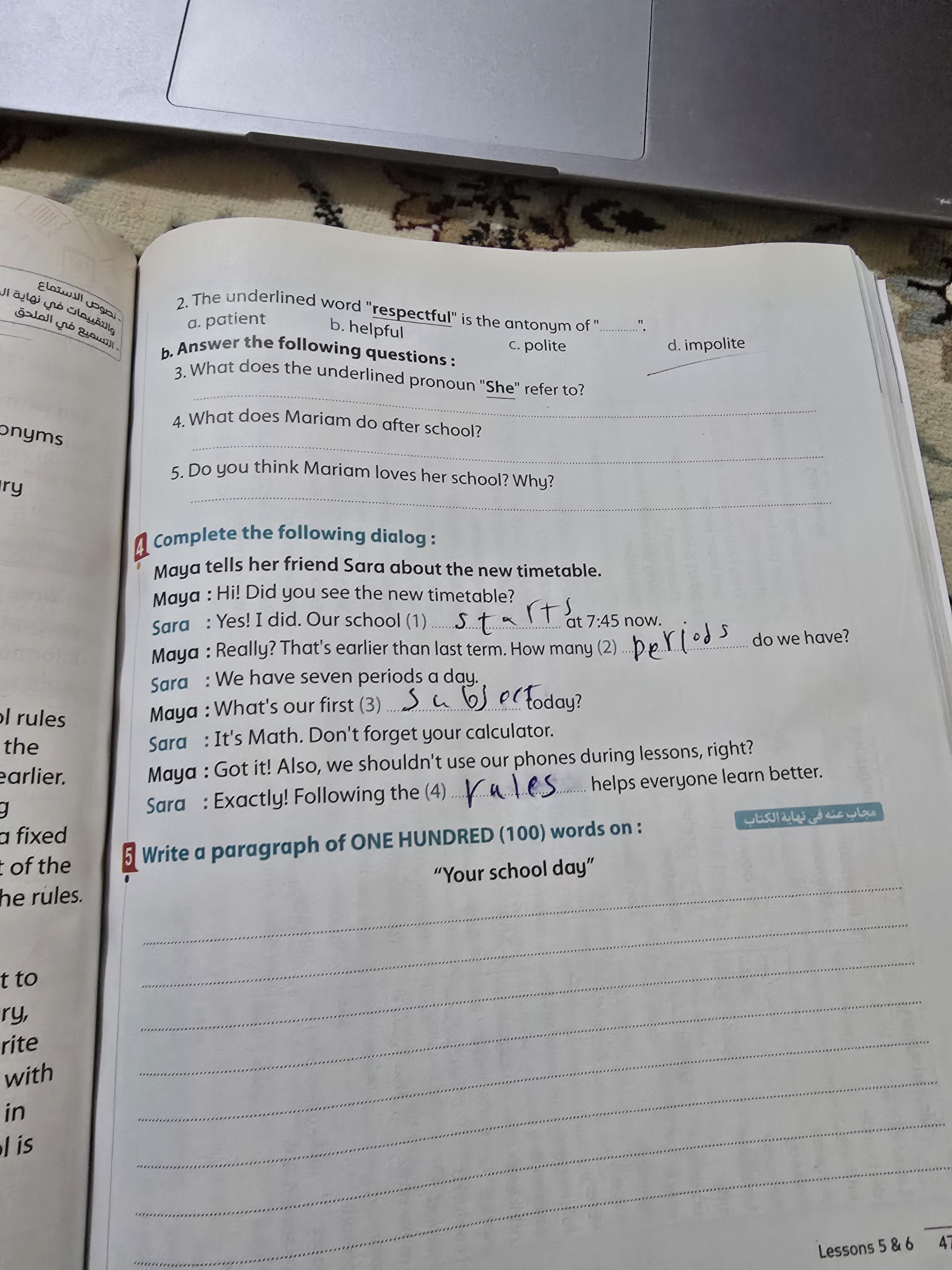 Today, we answered the test on U.9 on pages (132,133, and 134) and the general exercise on Review 3 on pages (137, 138, 139)… Page 140 is left for next time in sha’allah. Our homework for today is to write a paragraph (page 134) on job skills