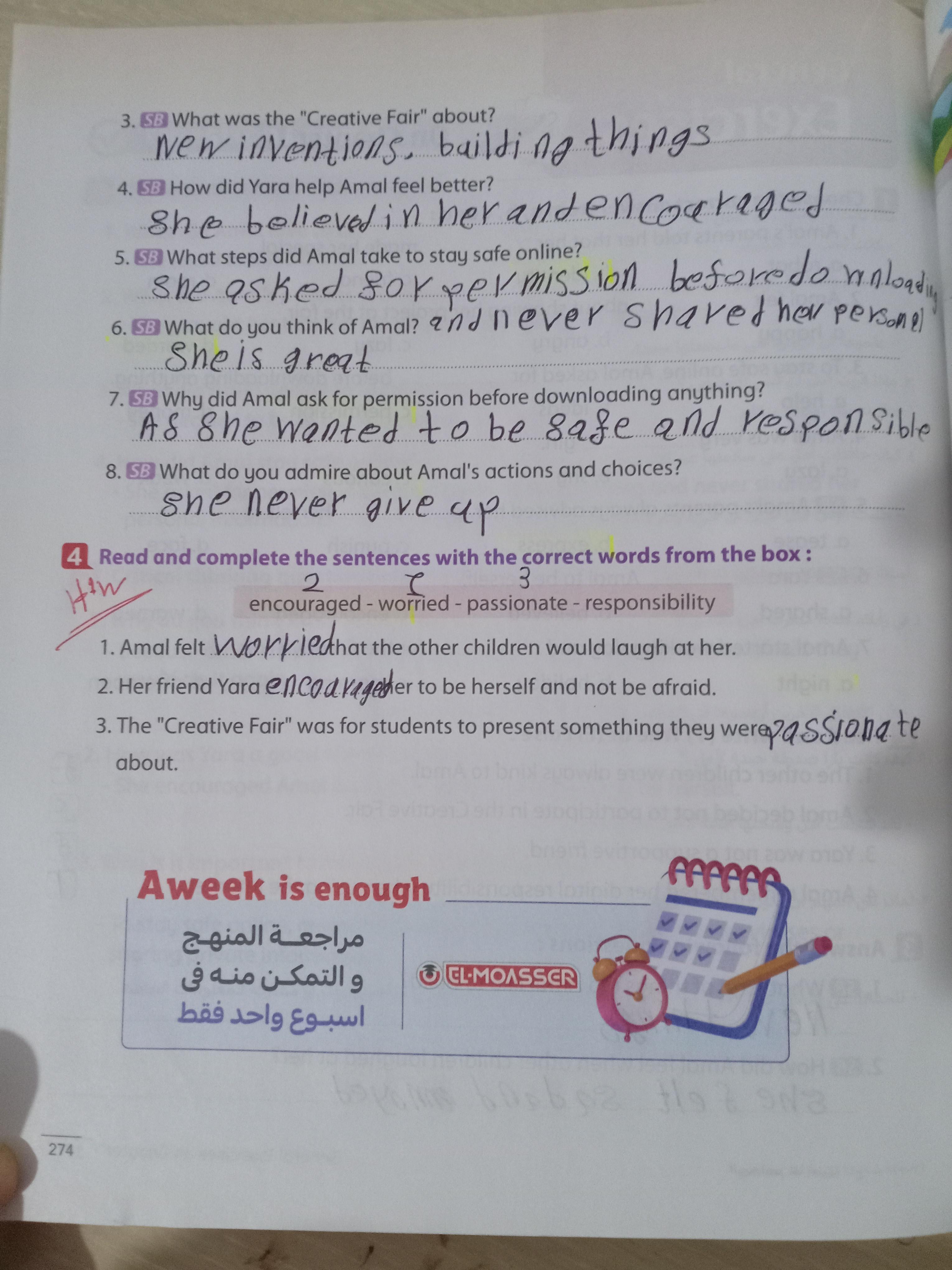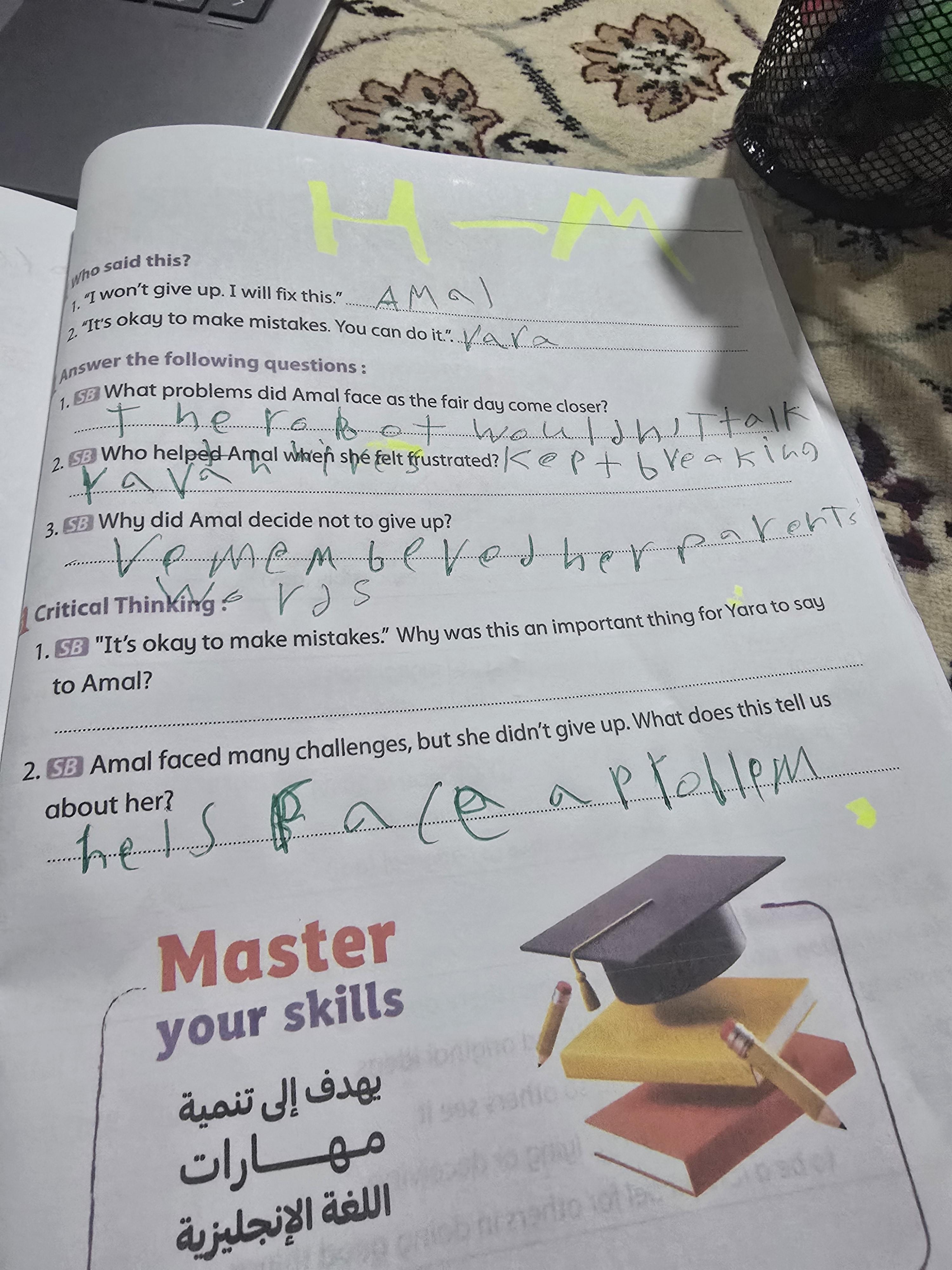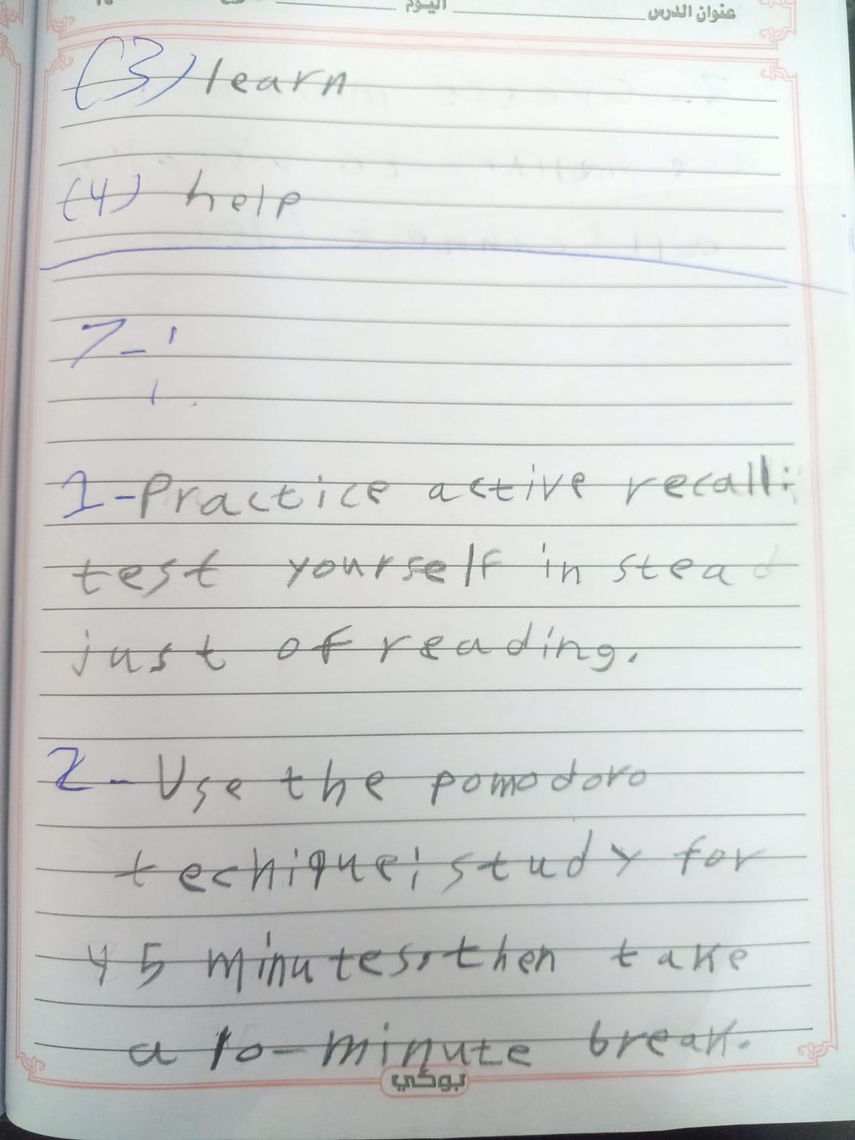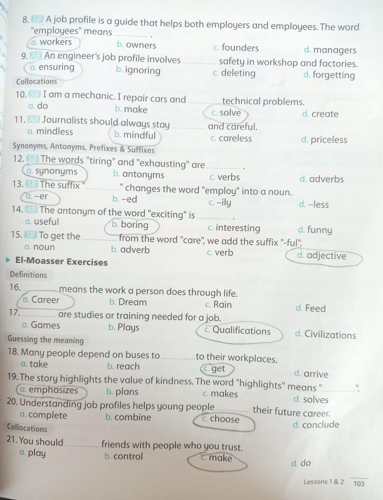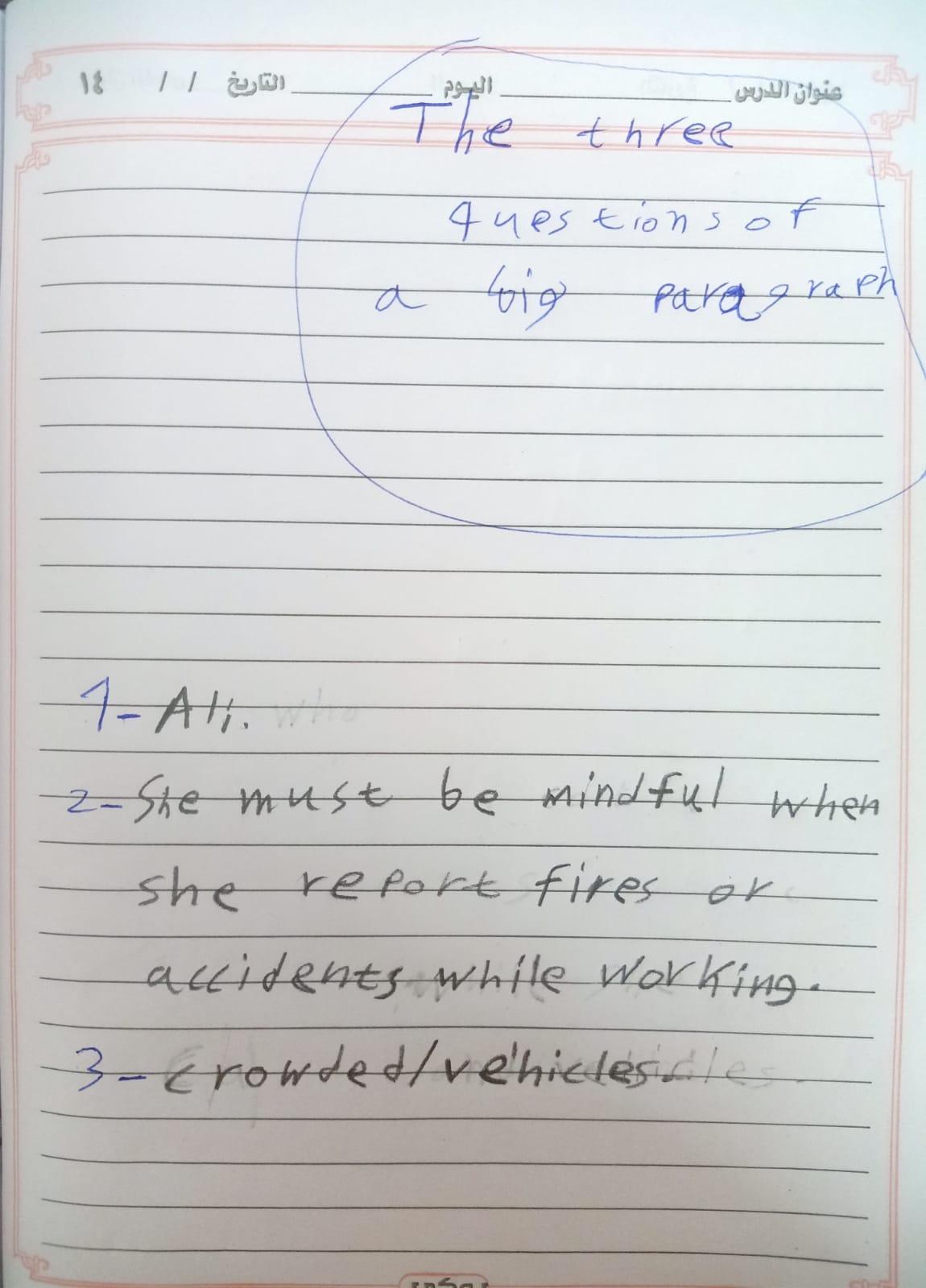 Today, we answered the test on U.9 on pages (132,133, and 134) and the general exercise on Review 3 on pages (137, 138, 139)… Page 140 is left for next time in sha’allah. Our homework for today is to write a paragraph (page 134) on job skills