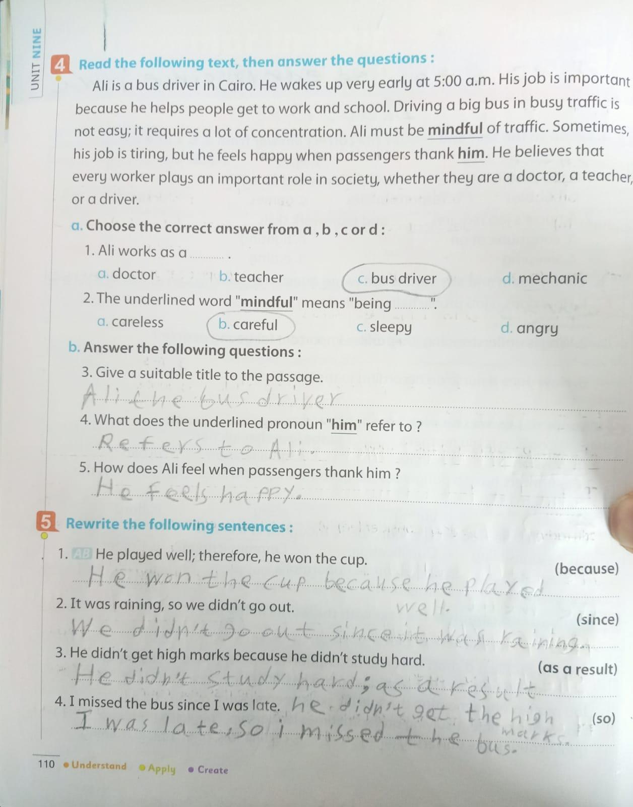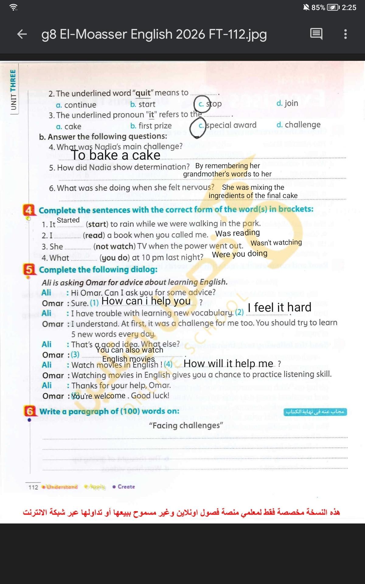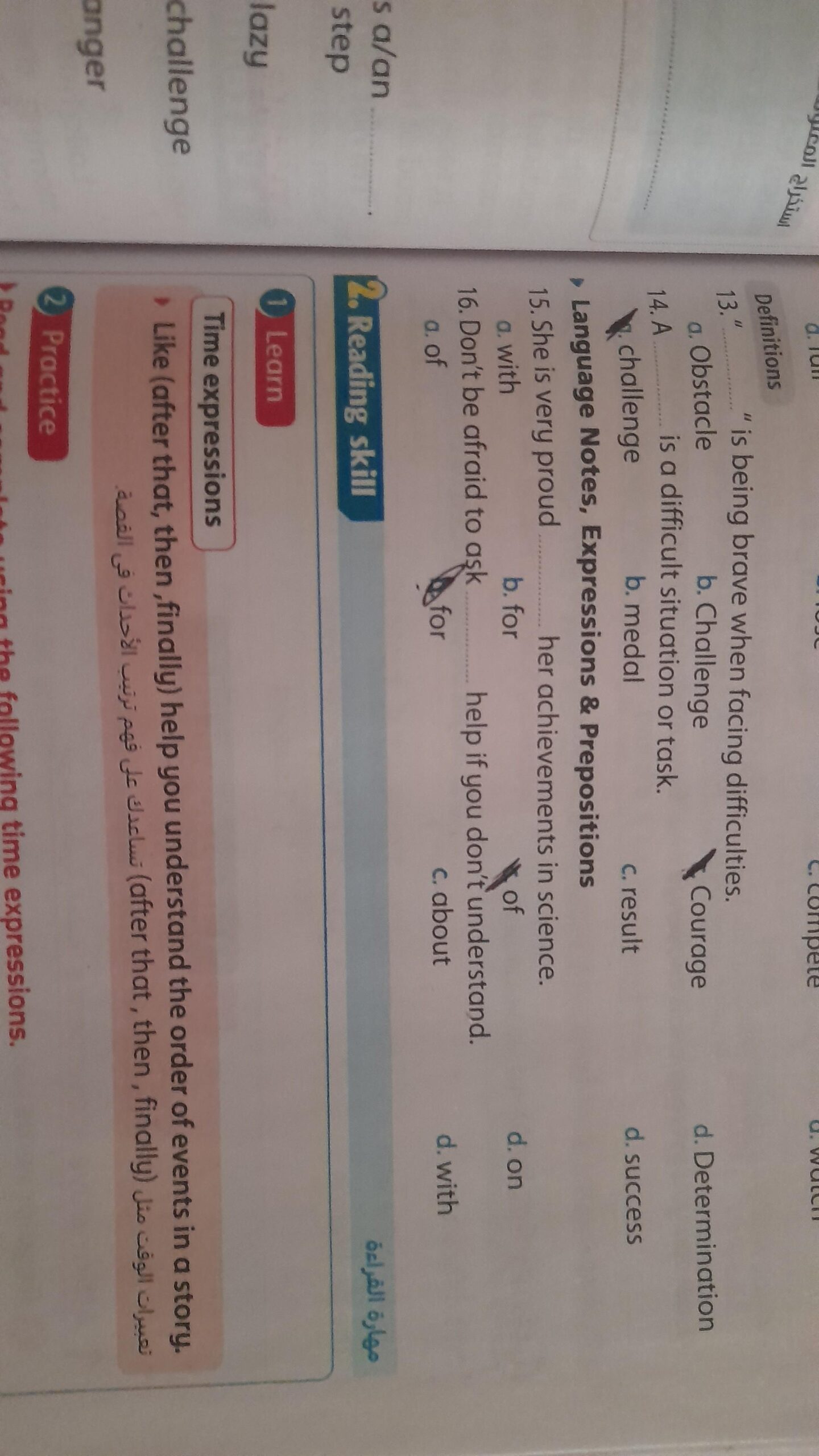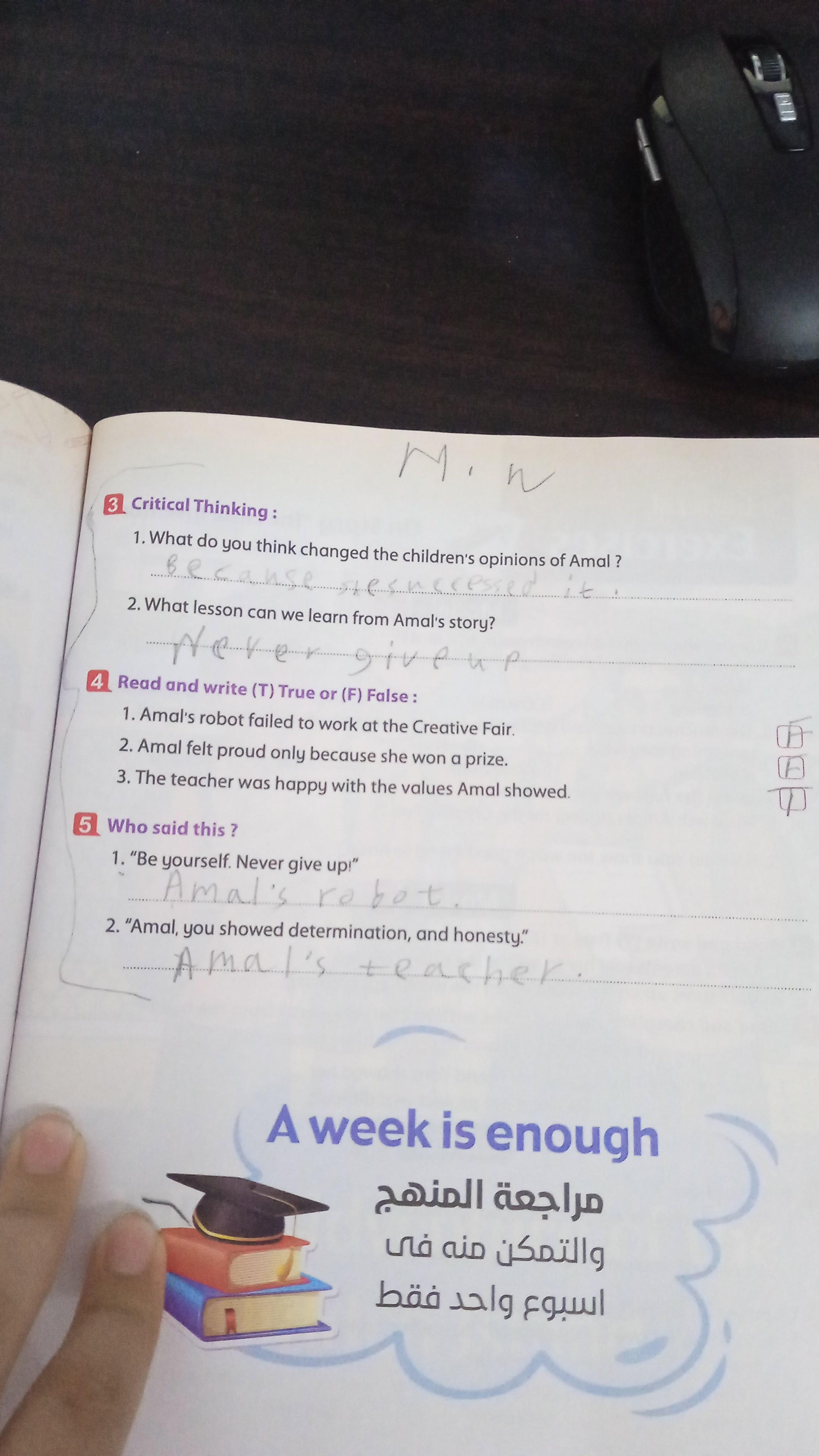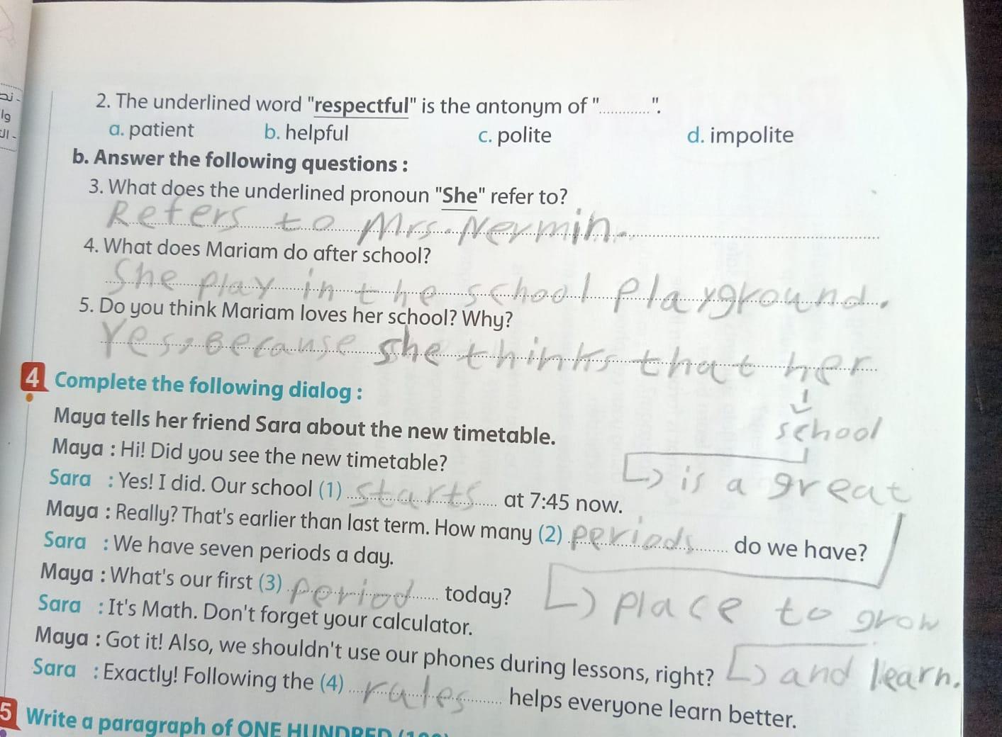 Today, we answered the test on U.9 on pages (132,133, and 134) and the general exercise on Review 3 on pages (137, 138, 139)… Page 140 is left for next time in sha’allah. Our homework for today is to write a paragraph (page 134) on job skills