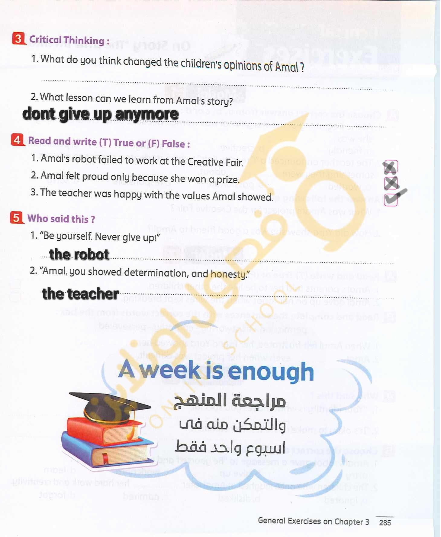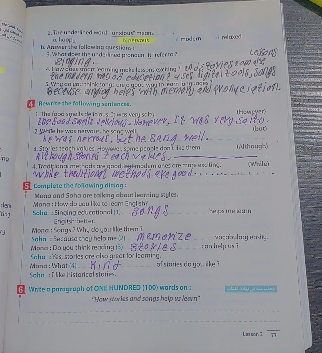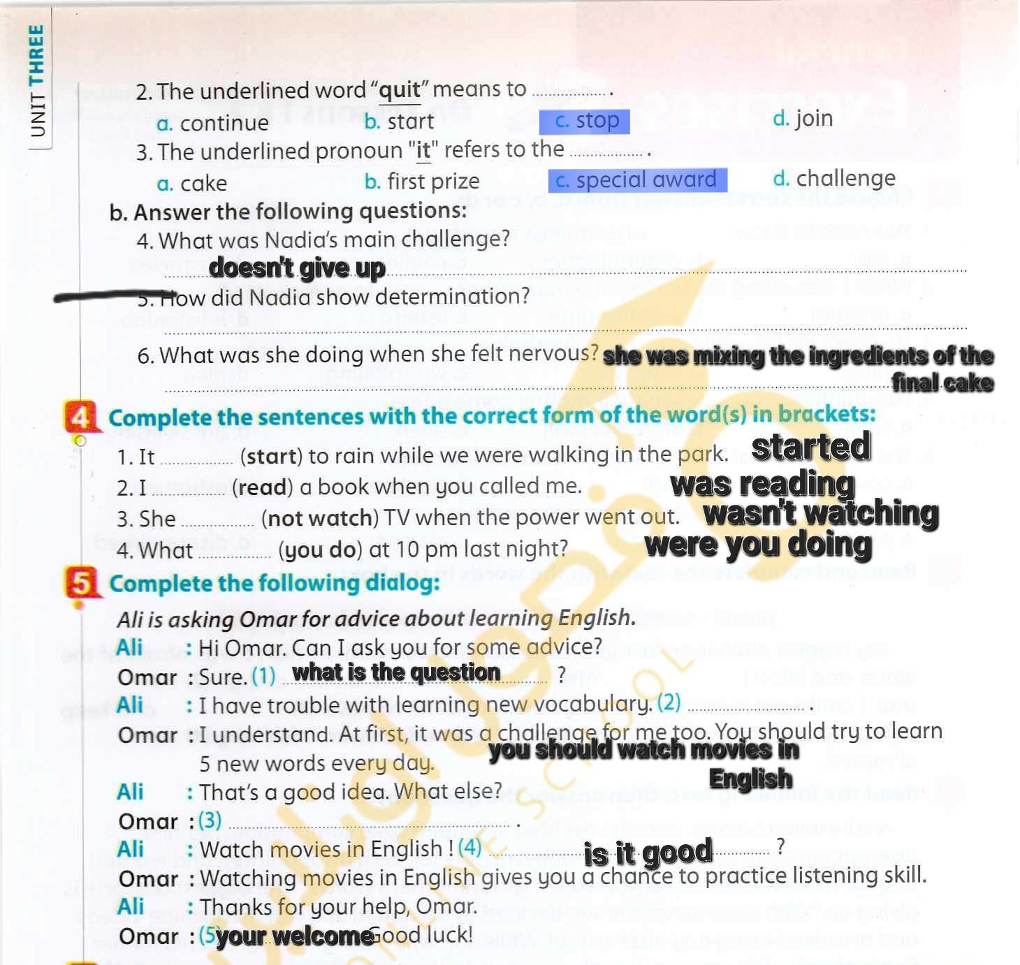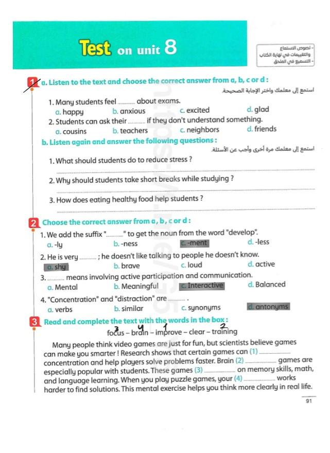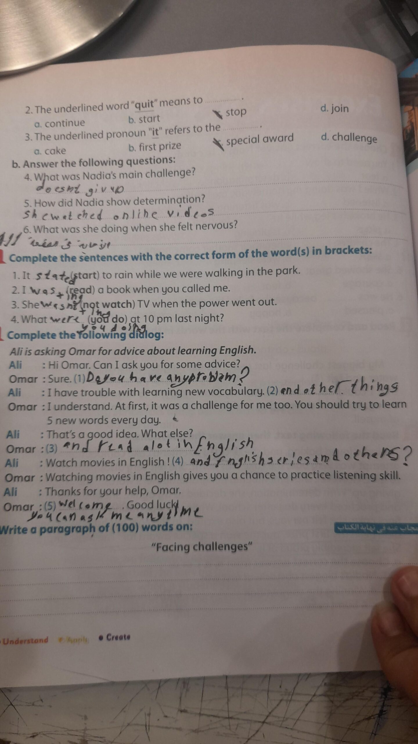 Today, we answered the test on U.9 on pages (132,133, and 134) and the general exercise on Review 3 on pages (137, 138, 139)… Page 140 is left for next time in sha’allah. Our homework for today is to write a paragraph (page 134) on job skills