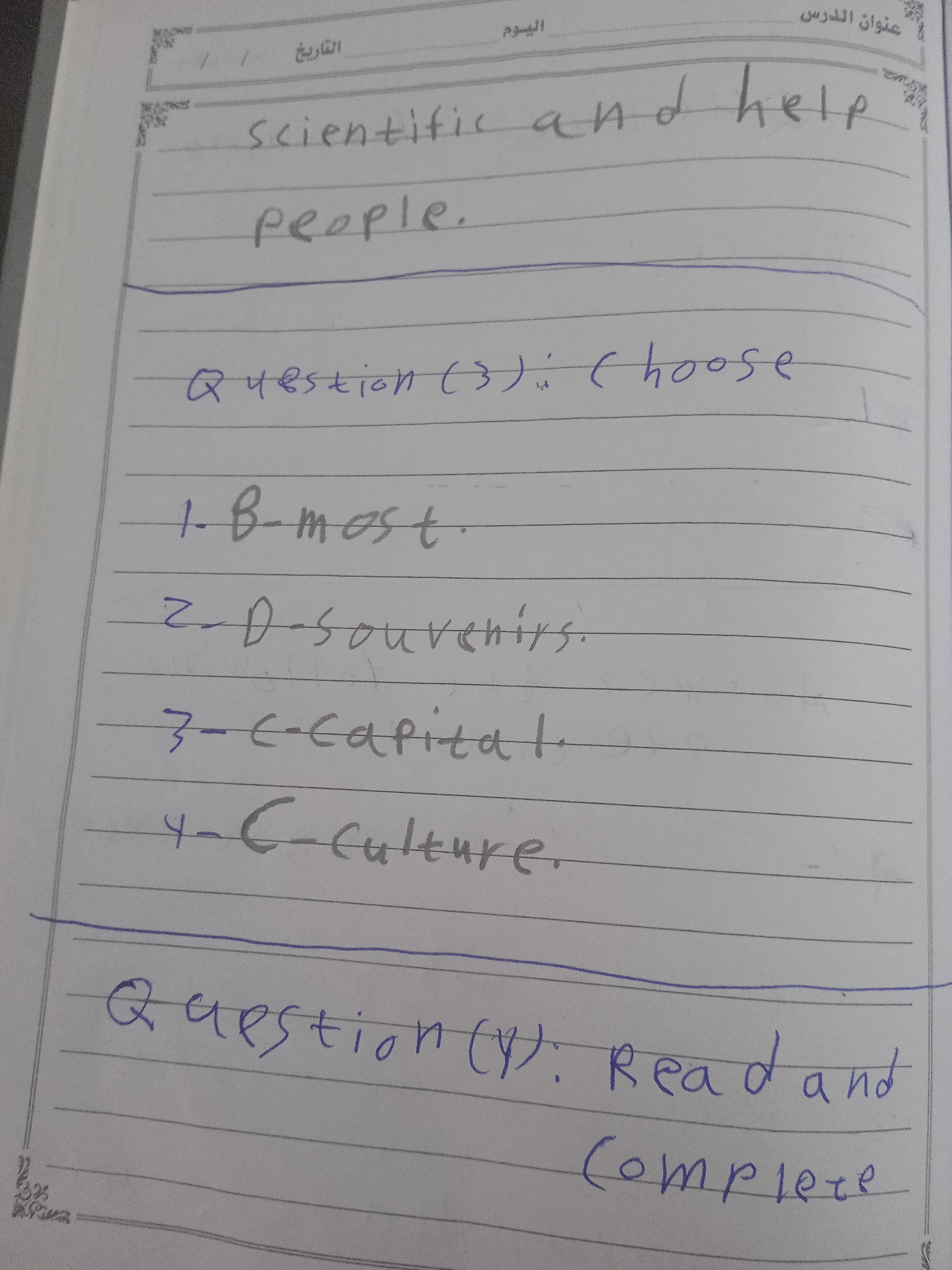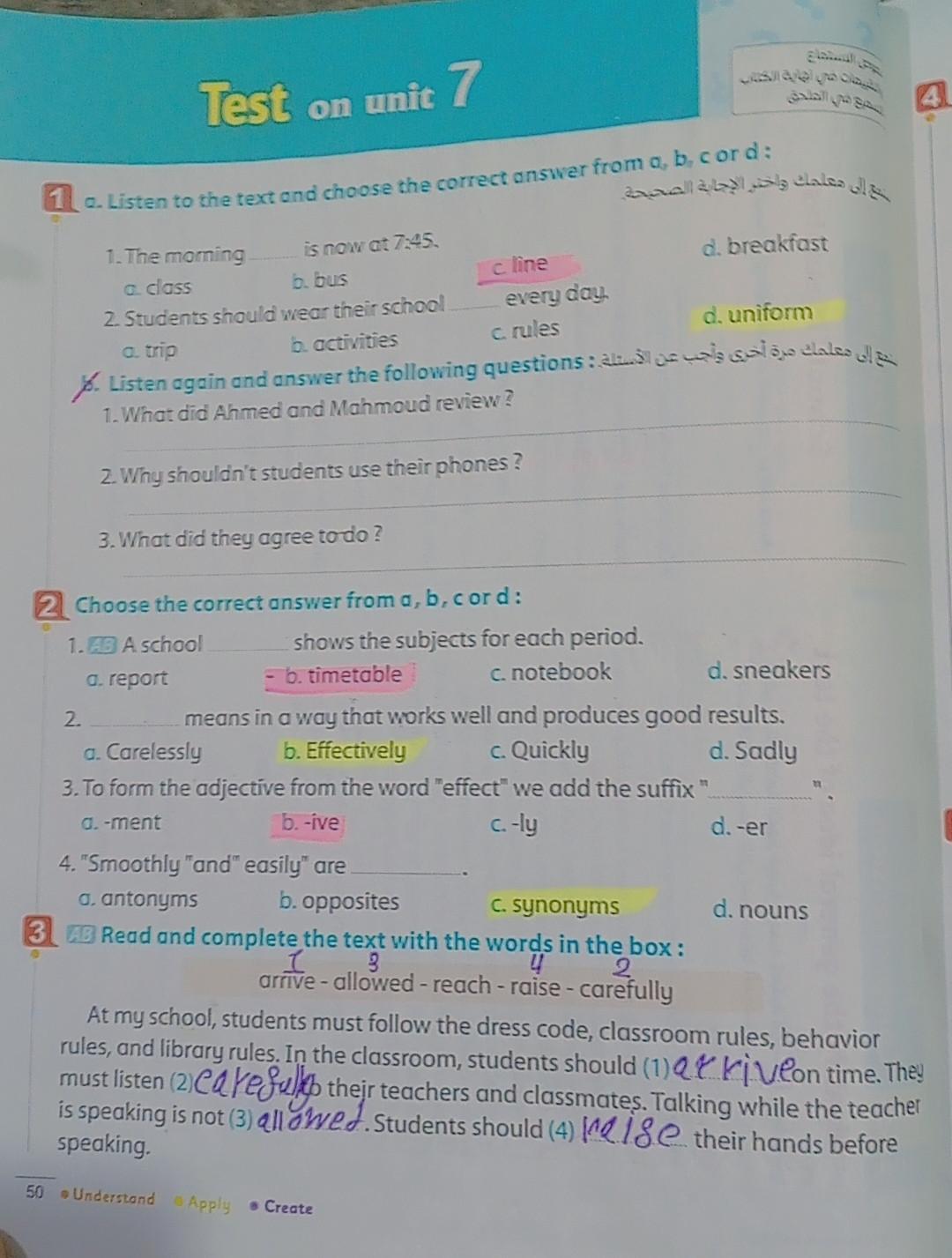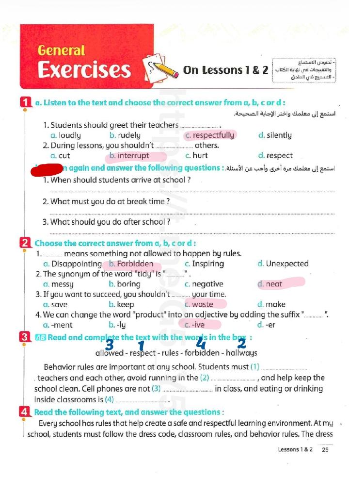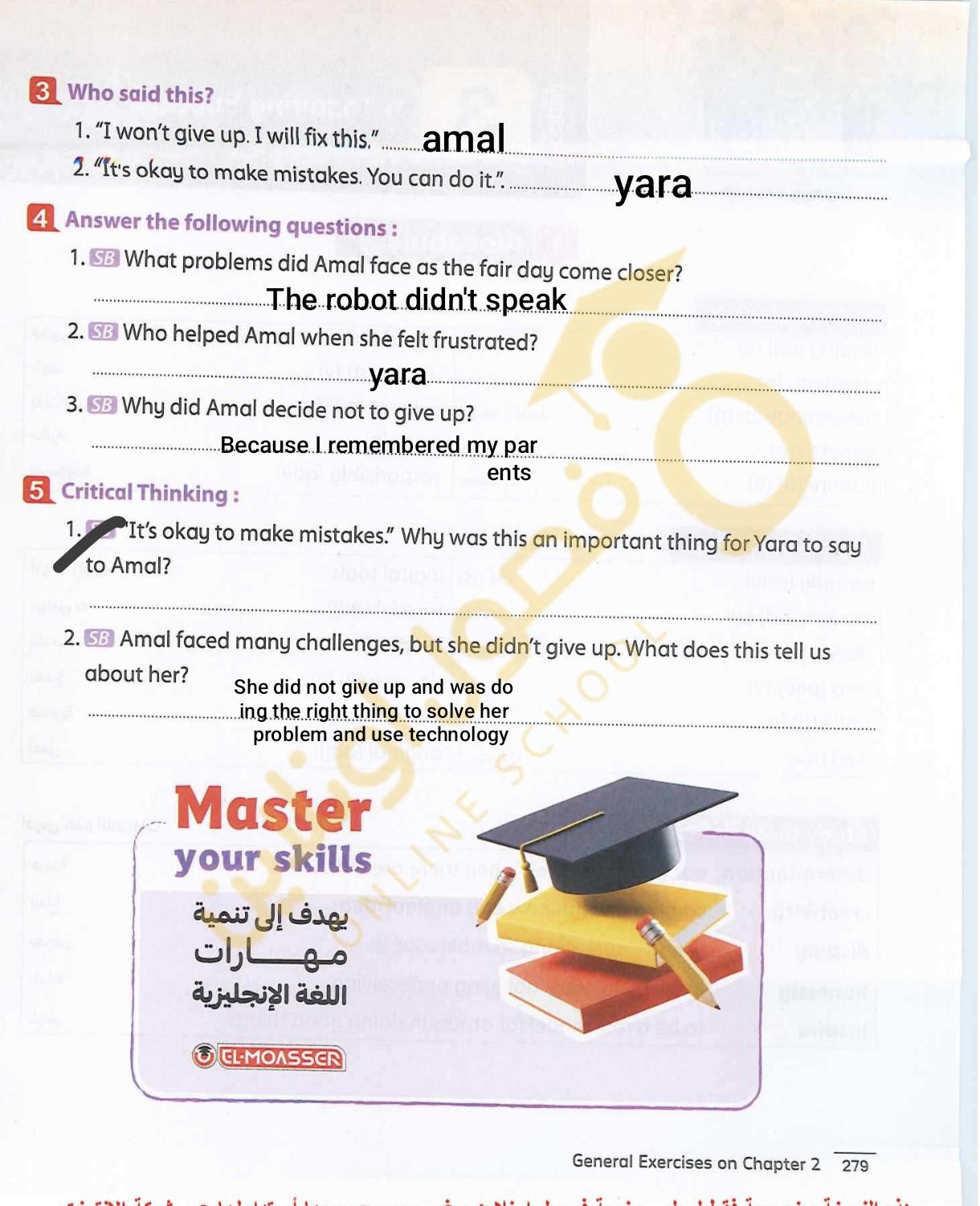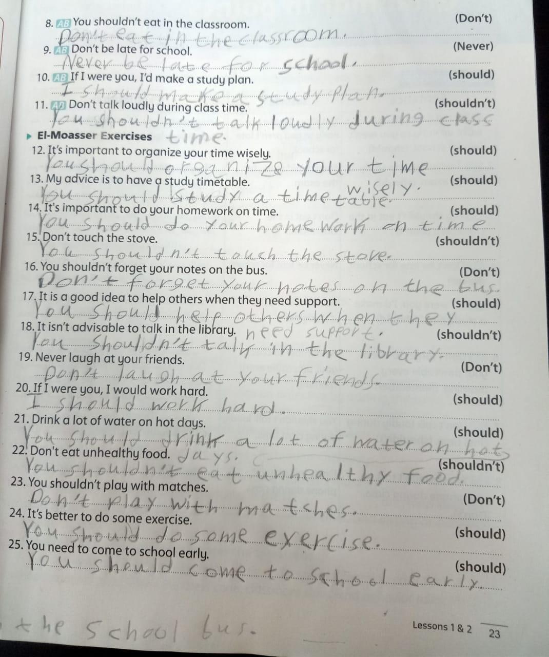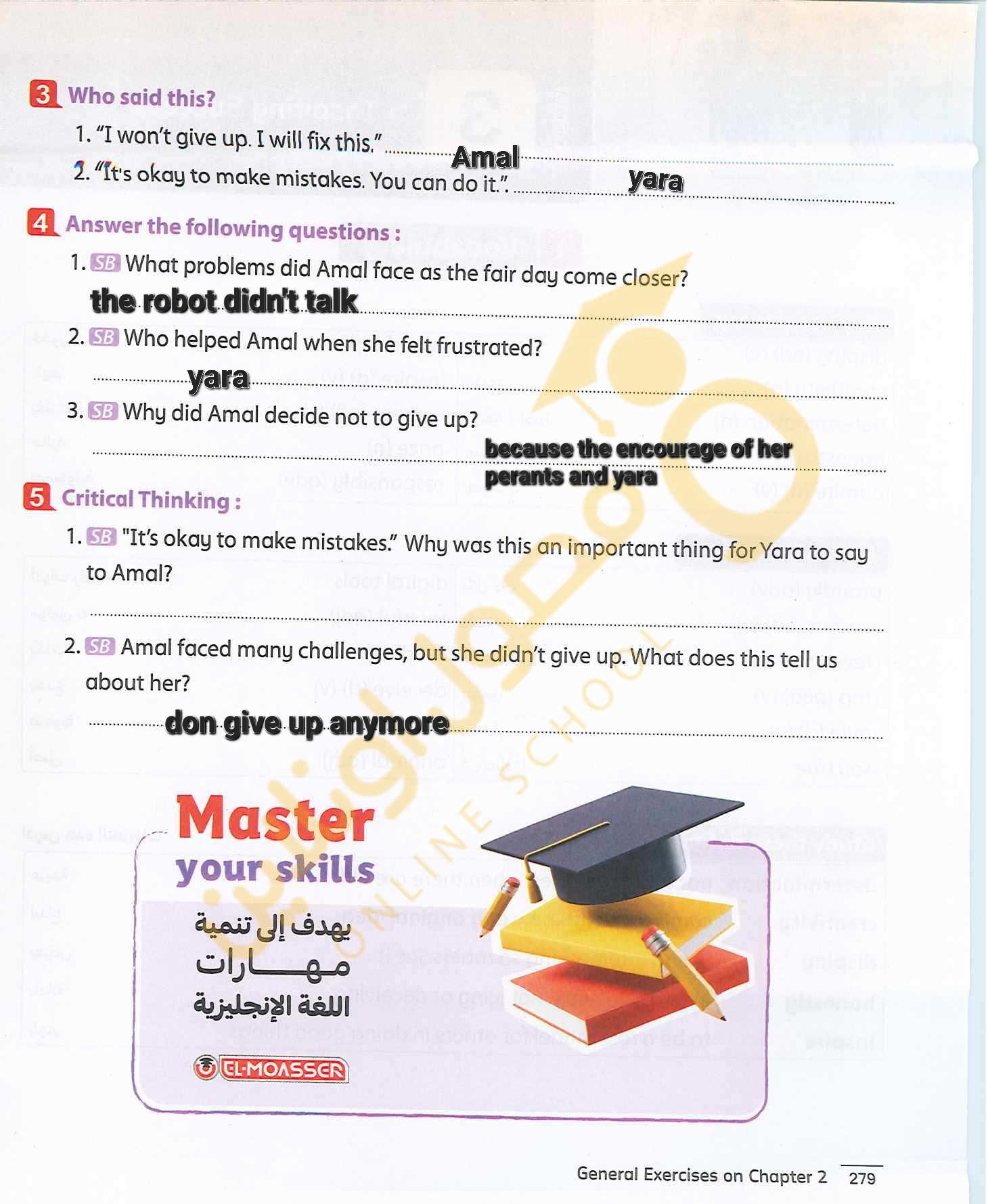 Today, we answered the test on U.9 on pages (132,133, and 134) and the general exercise on Review 3 on pages (137, 138, 139)… Page 140 is left for next time in sha’allah. Our homework for today is to write a paragraph (page 134) on job skills
