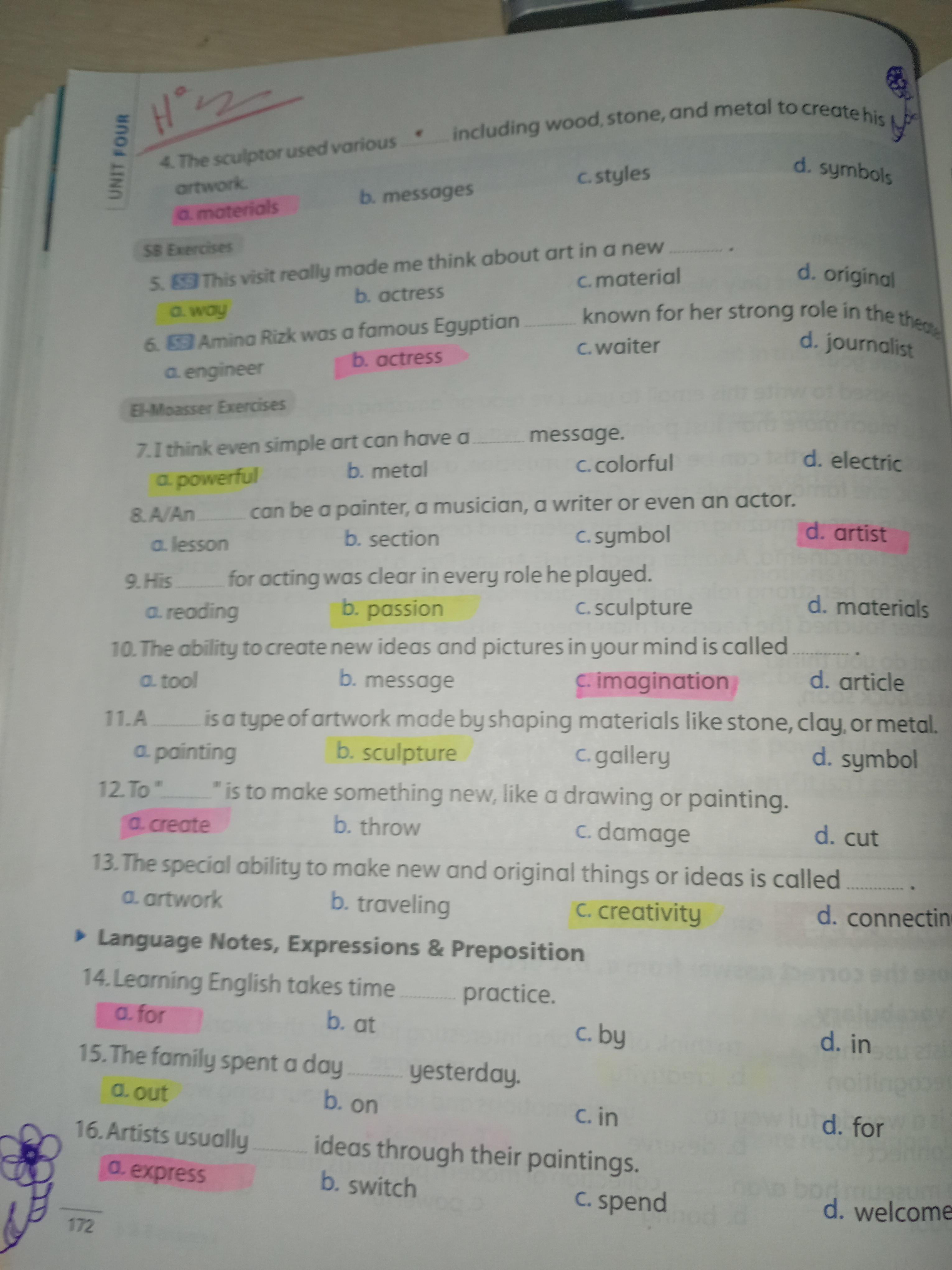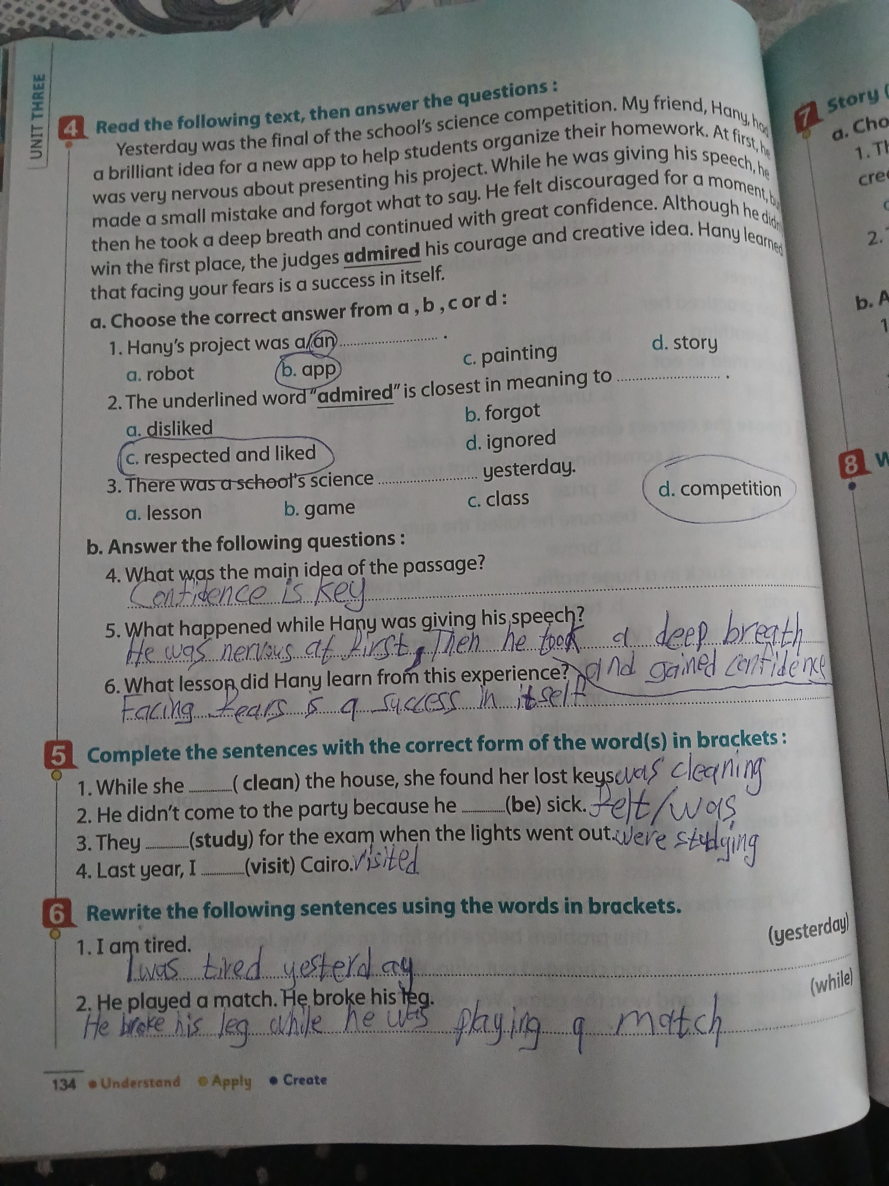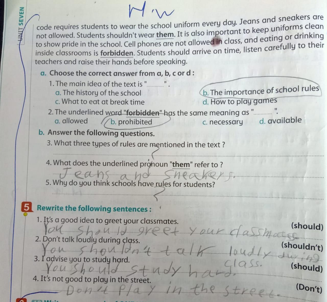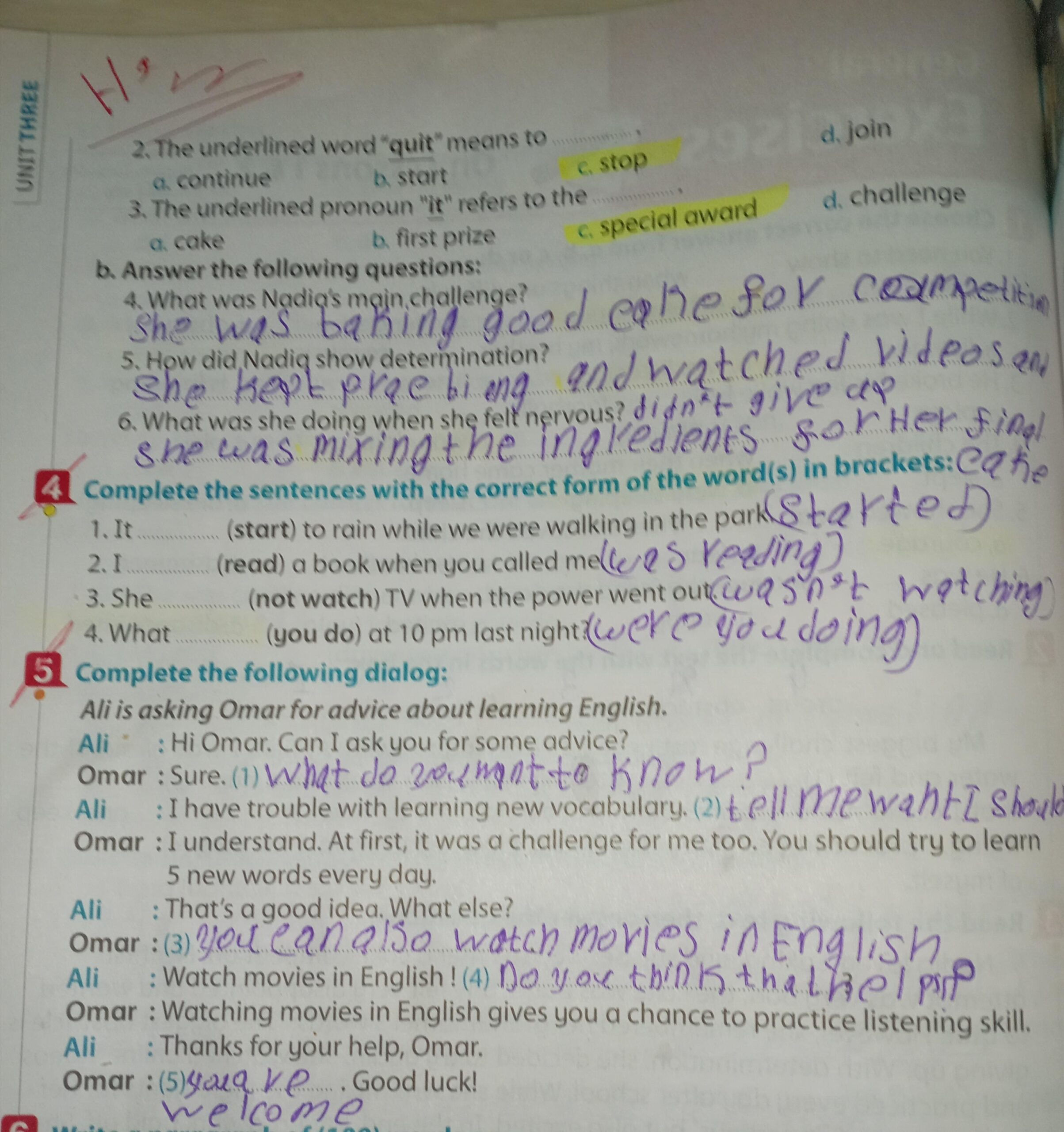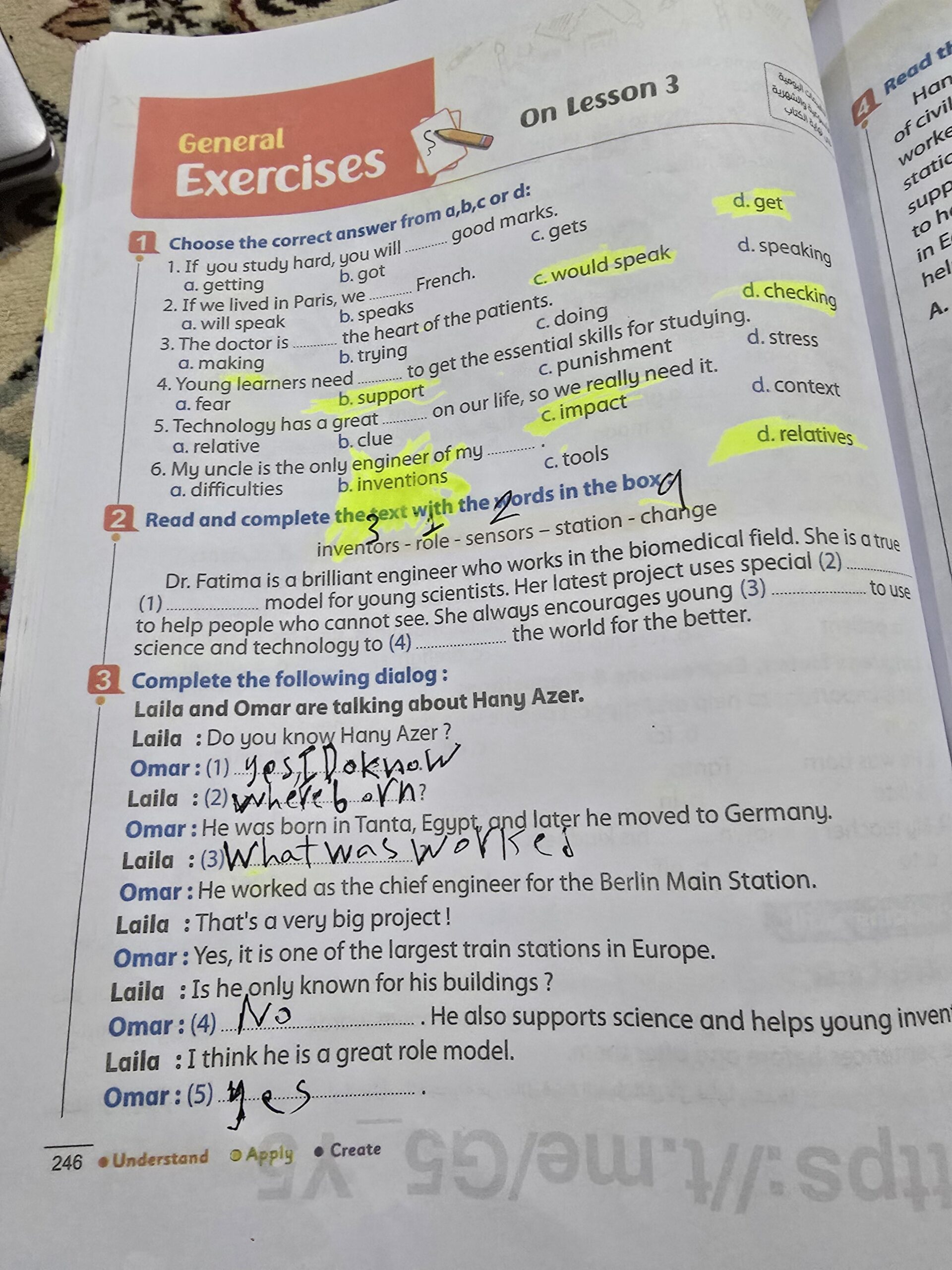 Today, we answered the test on U.9 on pages (132,133, and 134) and the general exercise on Review 3 on pages (137, 138, 139)… Page 140 is left for next time in sha’allah. Our homework for today is to write a paragraph (page 134) on job skills
