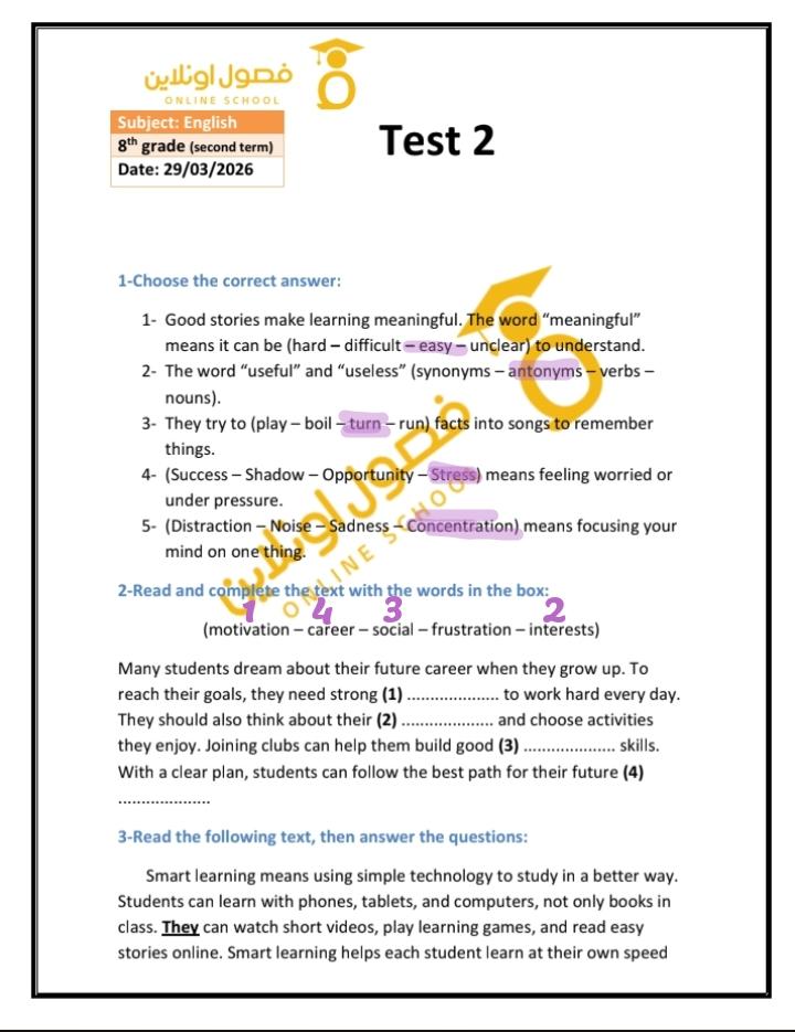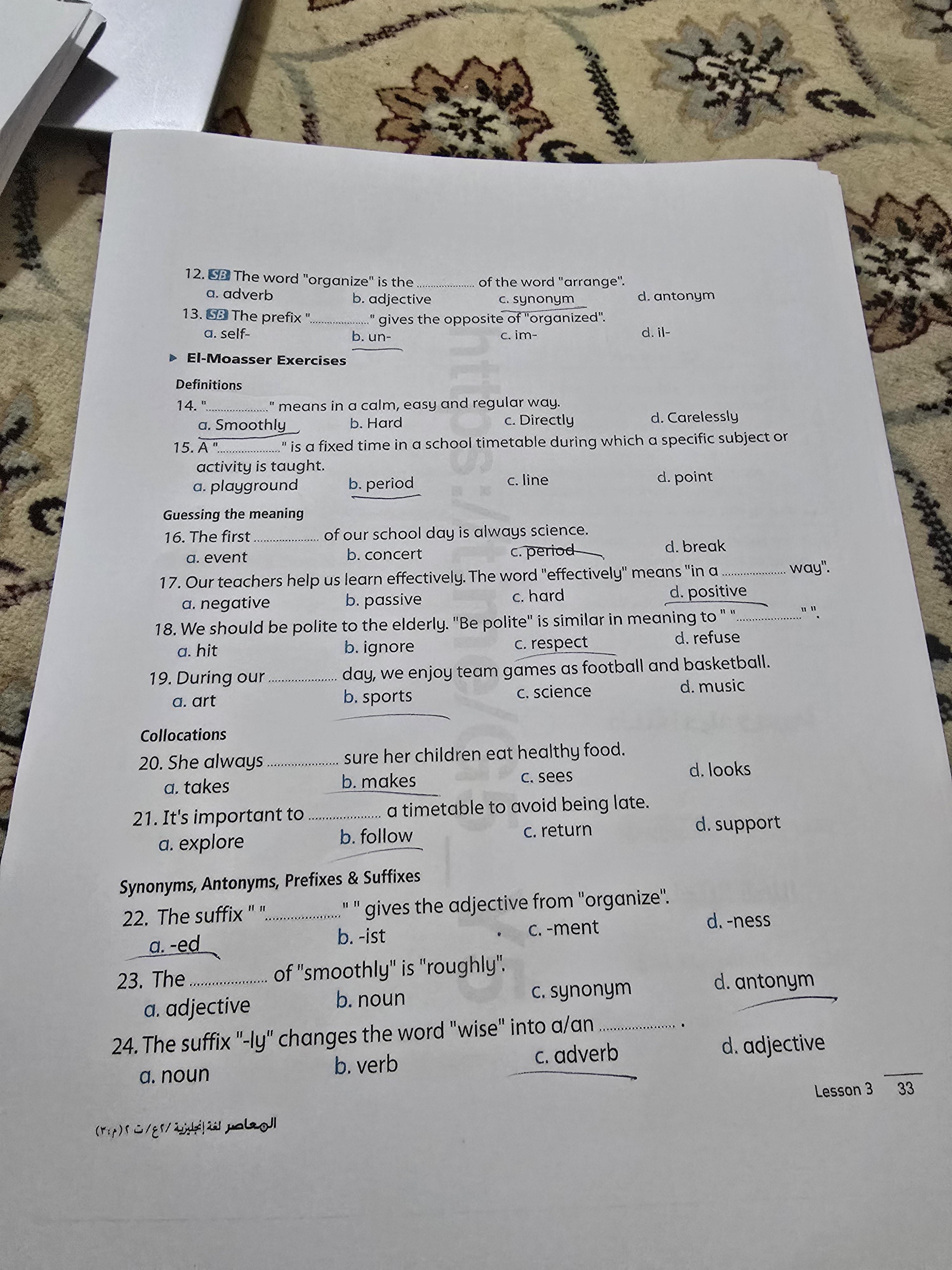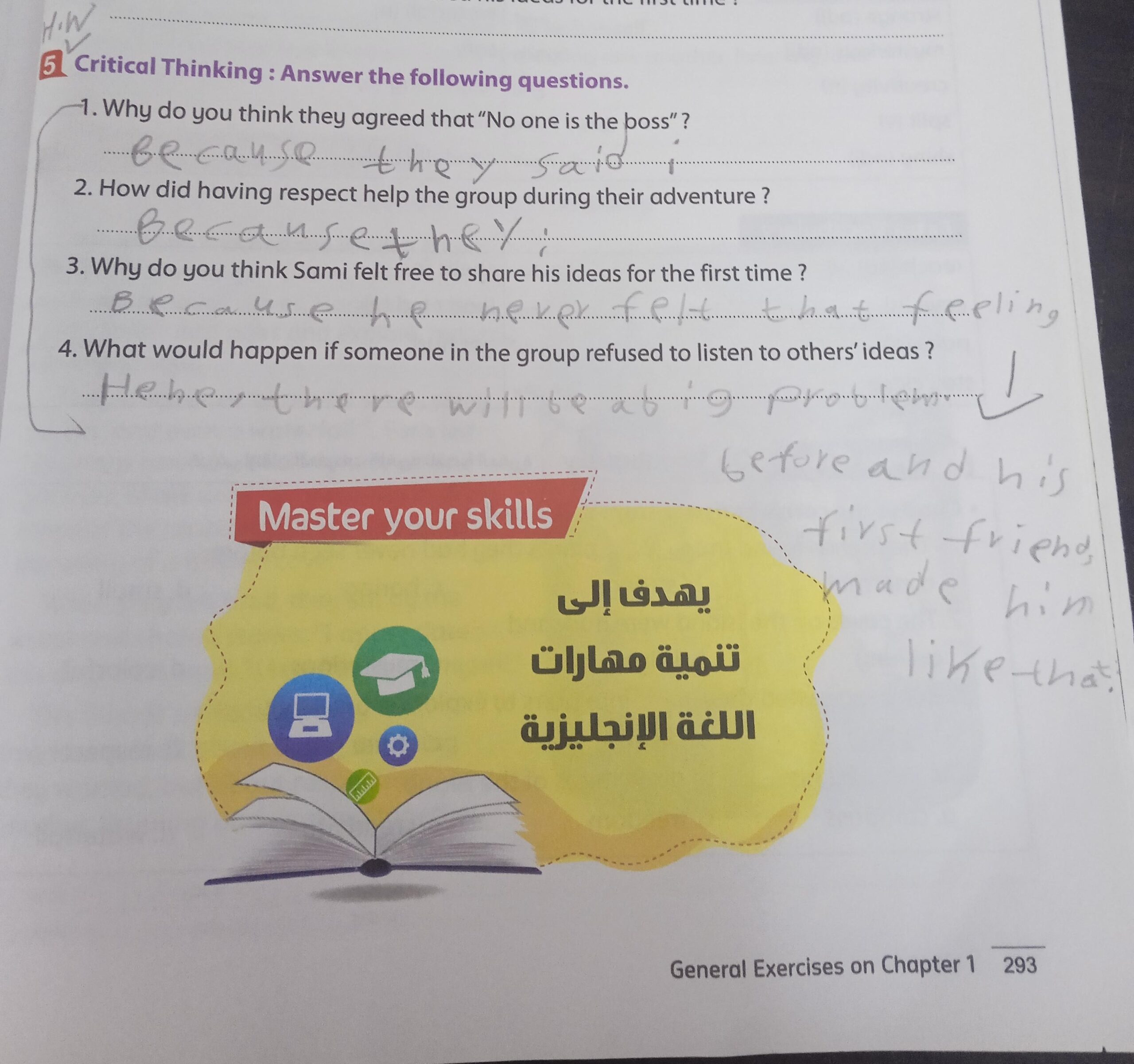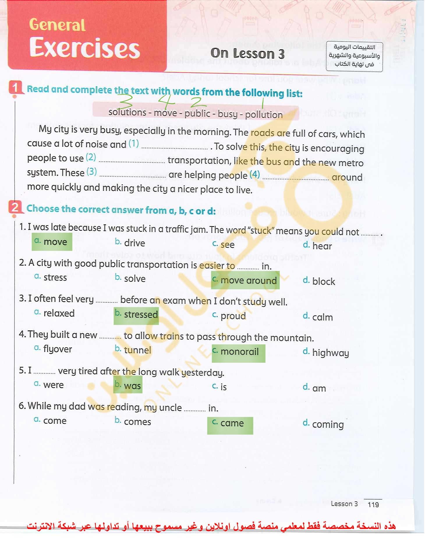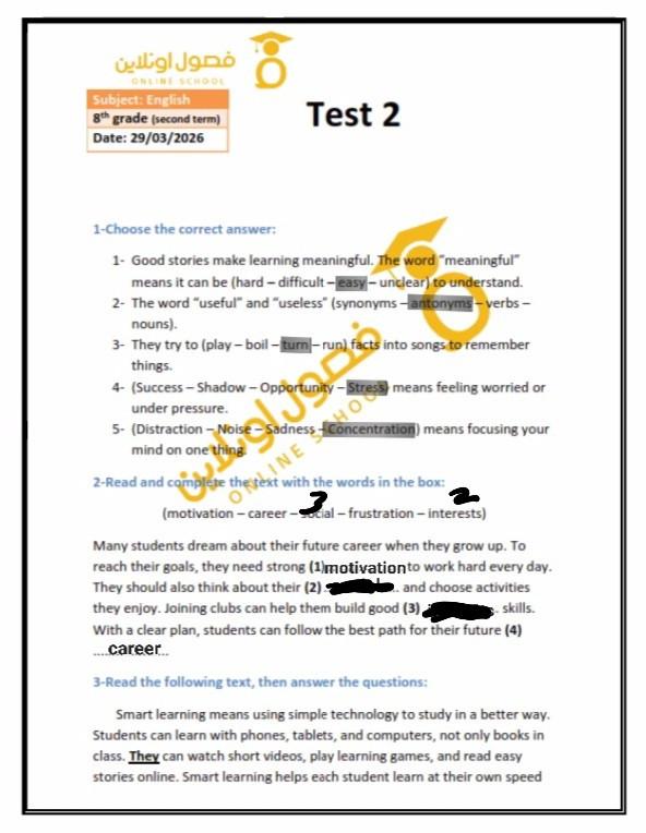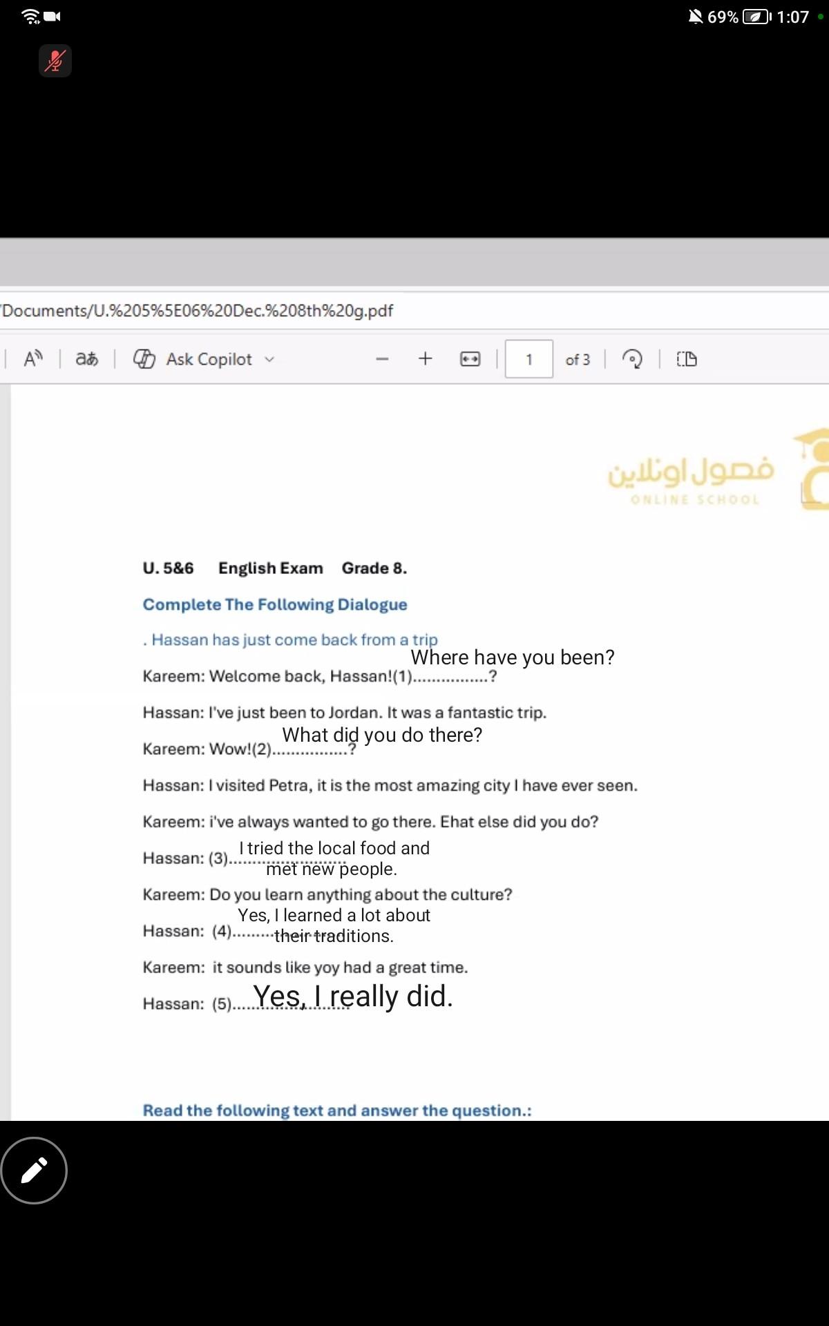 Today, we answered the test on U.9 on pages (132,133, and 134) and the general exercise on Review 3 on pages (137, 138, 139)… Page 140 is left for next time in sha’allah. Our homework for today is to write a paragraph (page 134) on job skills