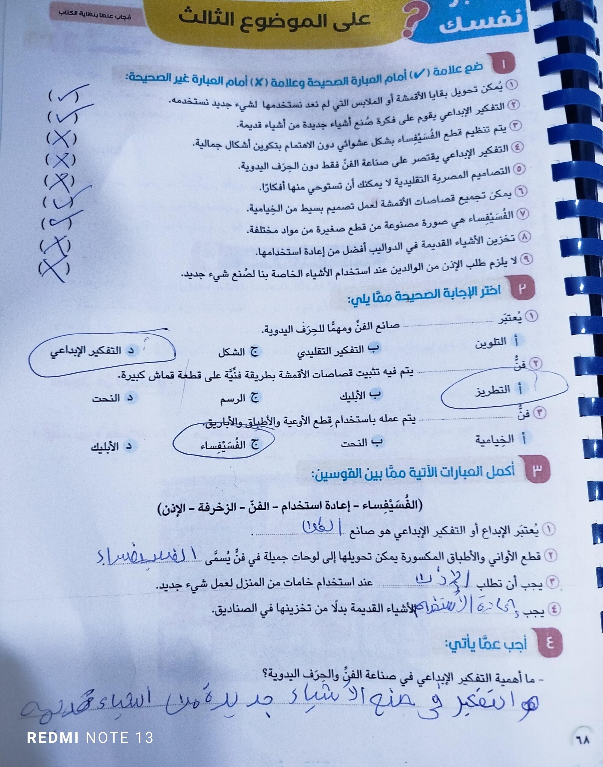 اخدنا اليوم الموض وع التالت والرابع وحلينا تدريبات الموضوع الرابع والواجب تدريبات الموضوع التالت ص 68