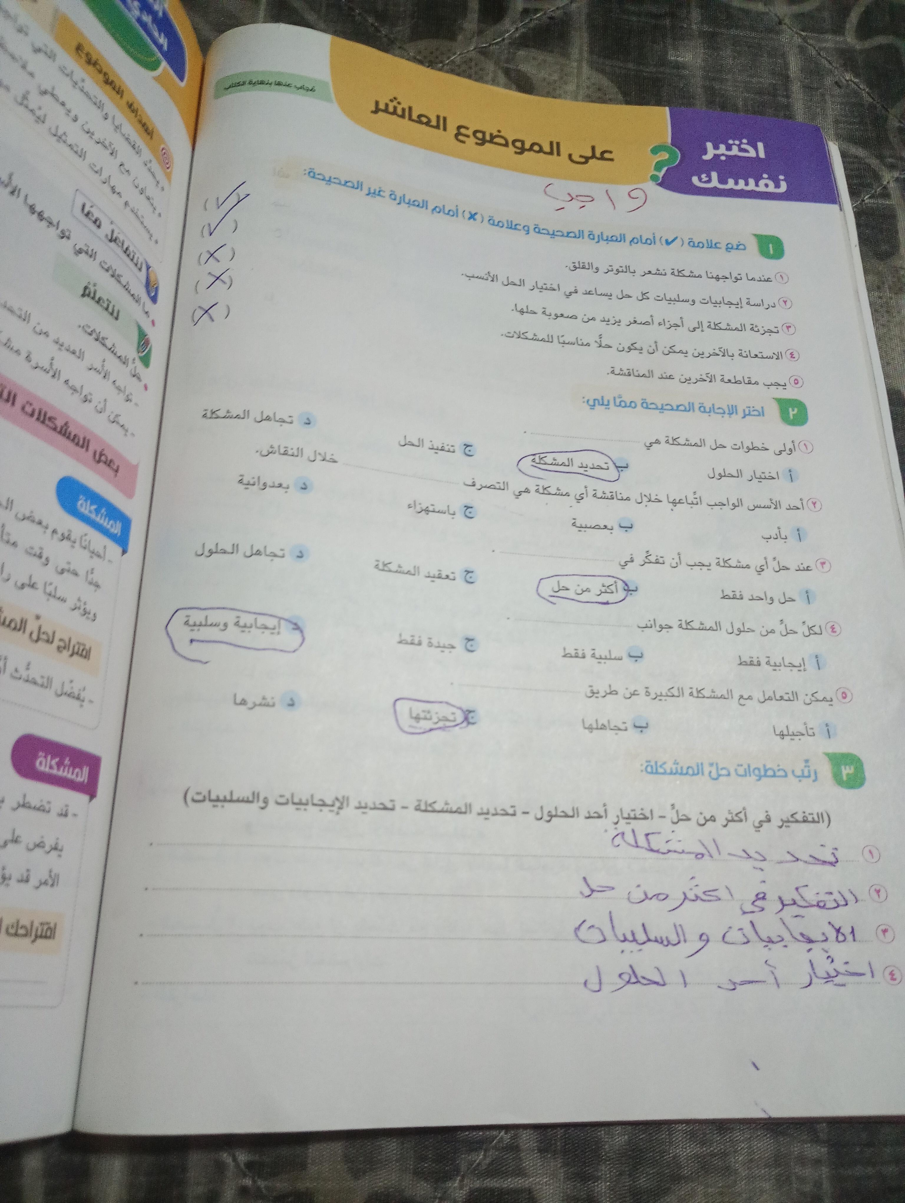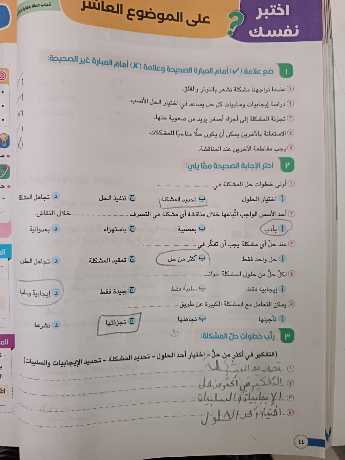 اخدنا اليوم الموضوع العاشر طرق حل المشكلات والواجب ص 44