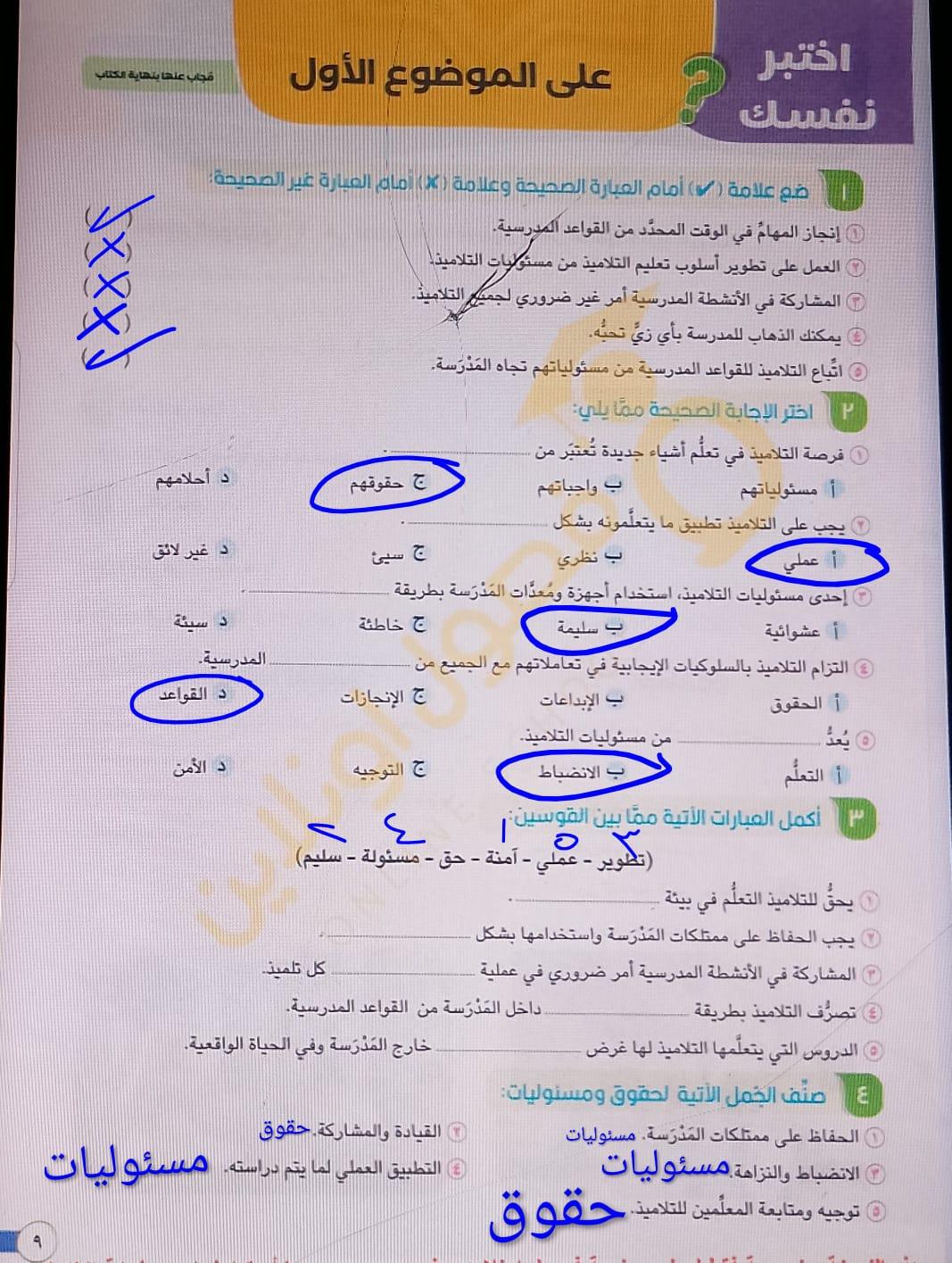 اخدنا اليوم الموضوع الاول الحقوق والمسئوليات والواجب التدريبات ص 9