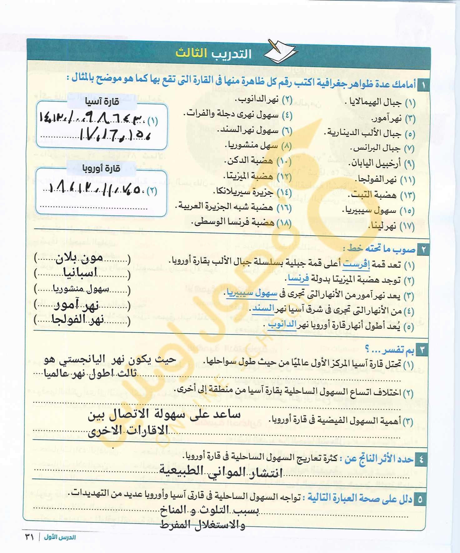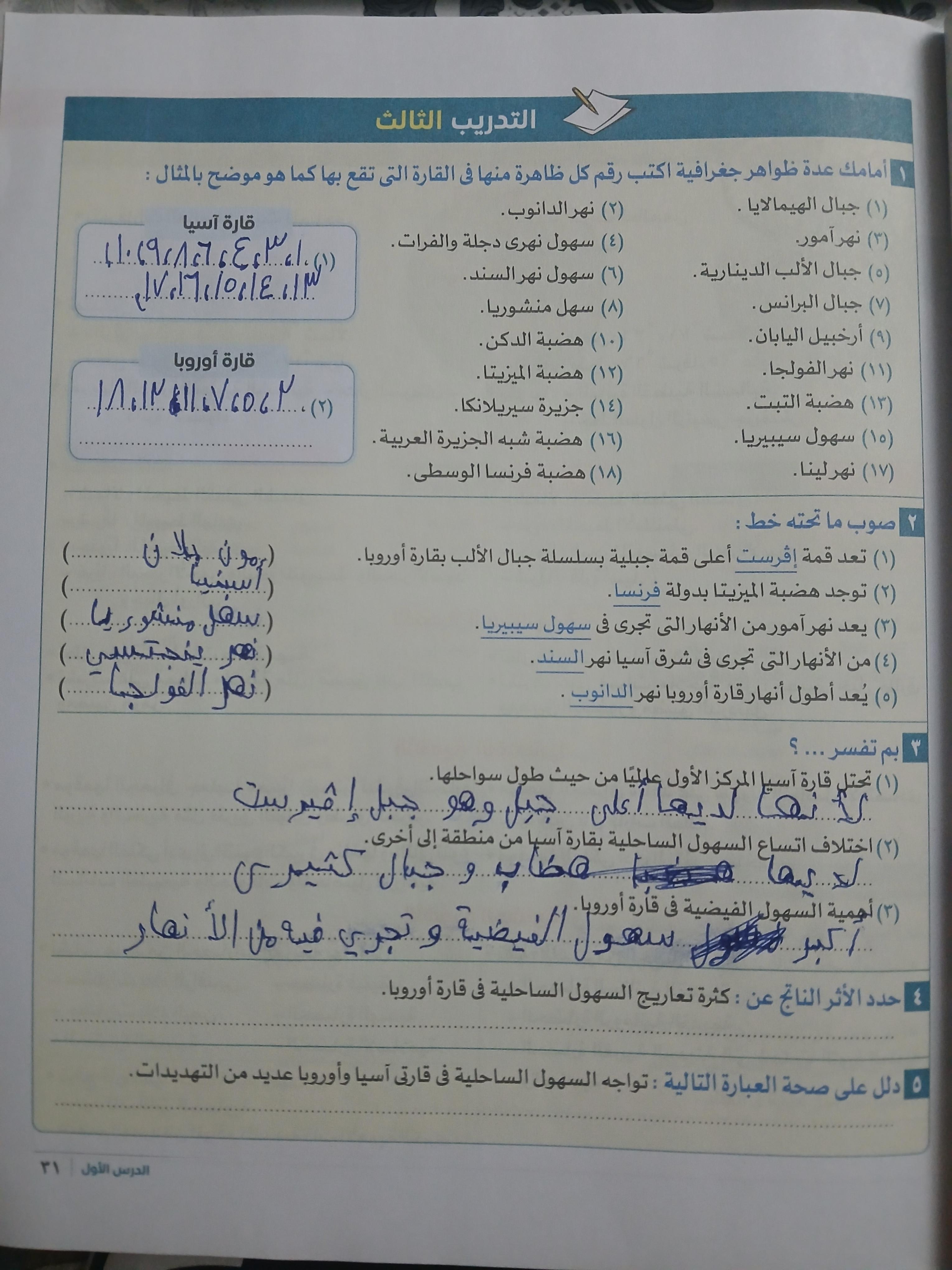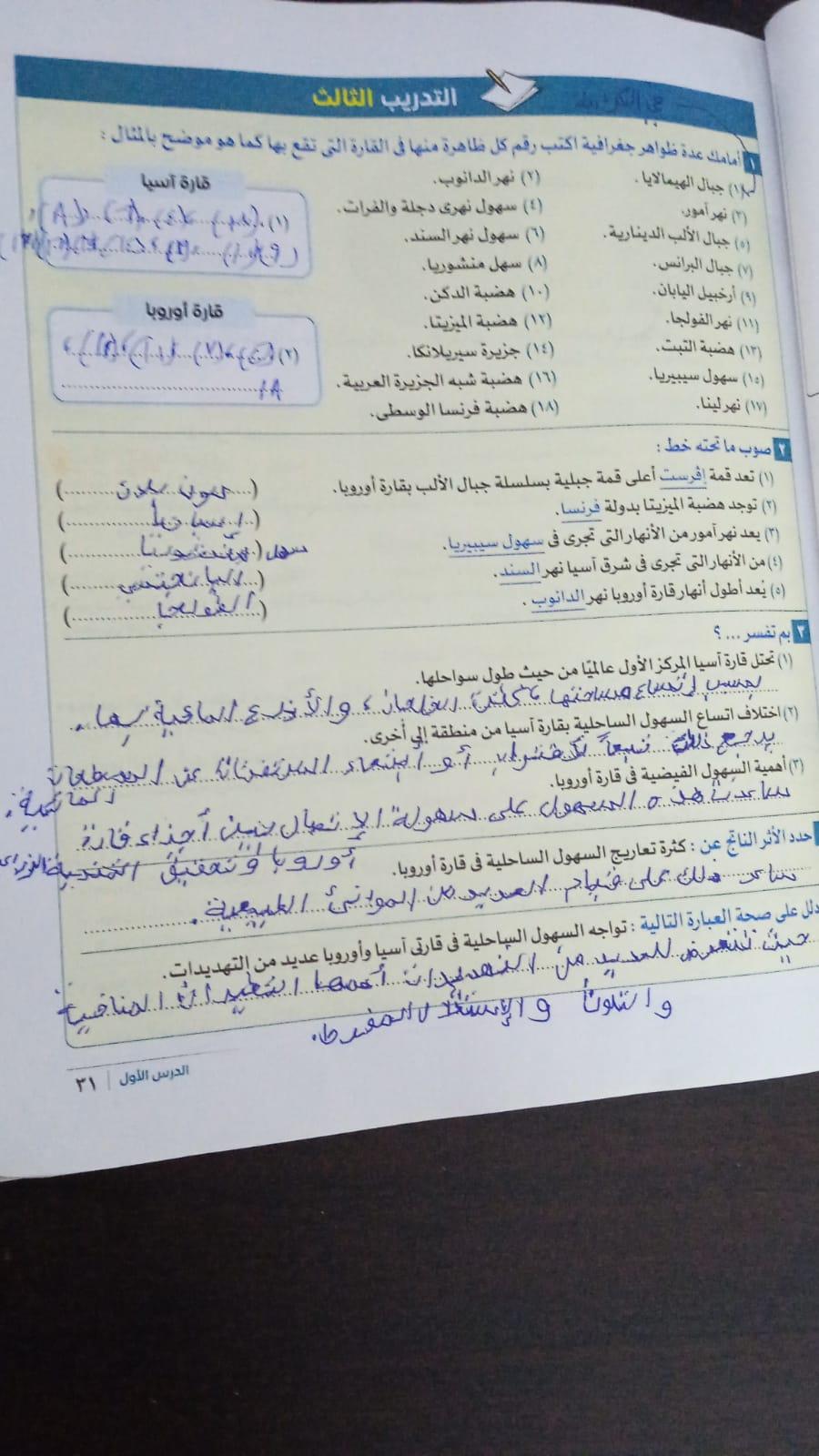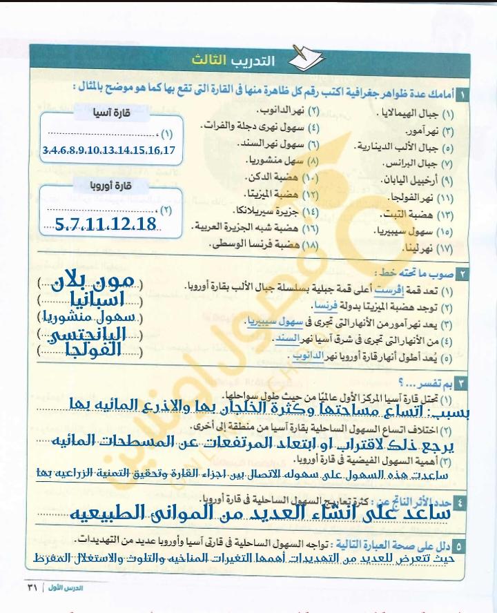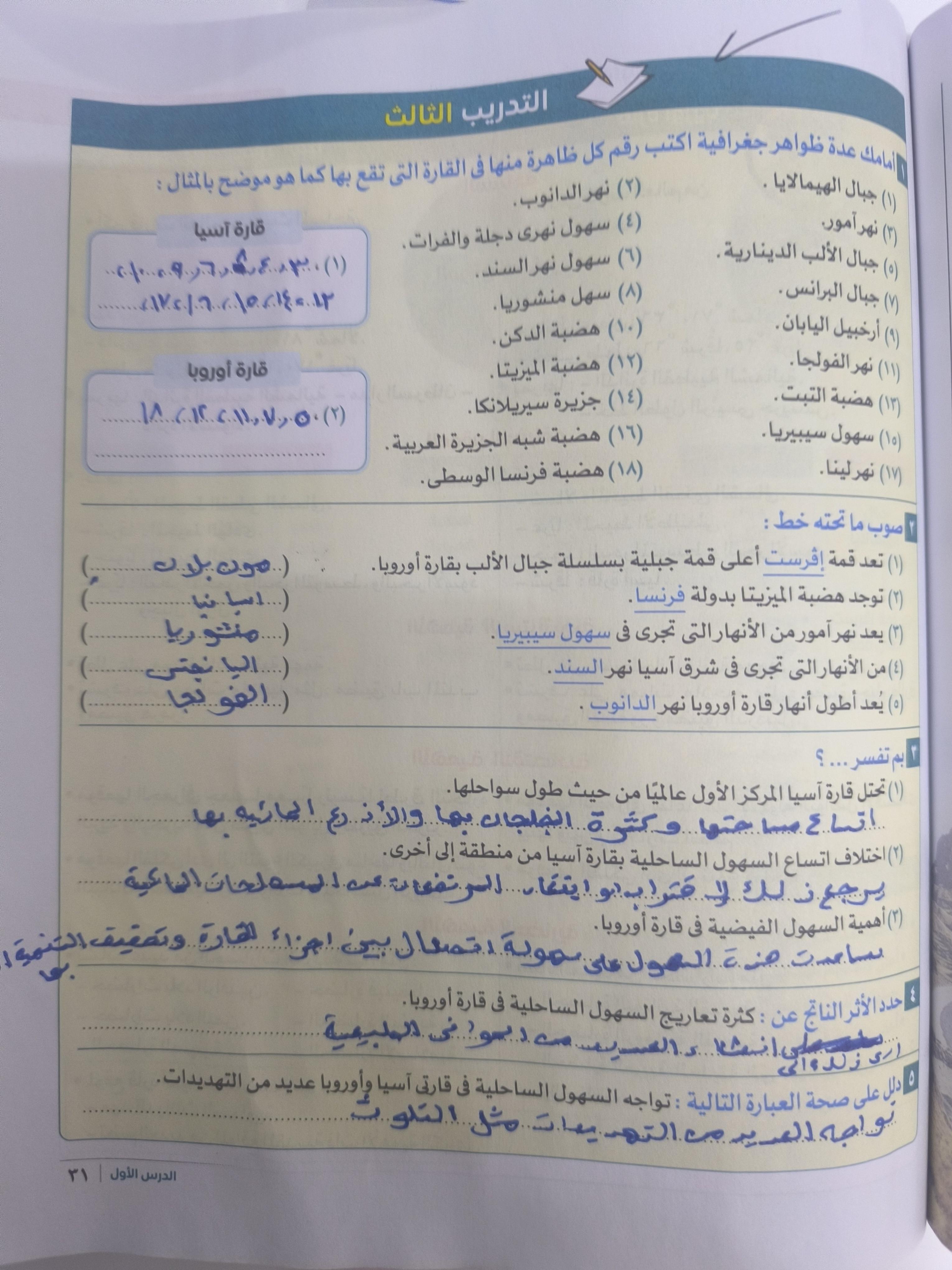 اخدنا اليوم مظاهر سطح اسيا واوربا والواجب التدريب الثالث ص 31 وتدريبات كتاب الامتحان اول تلات صفحات