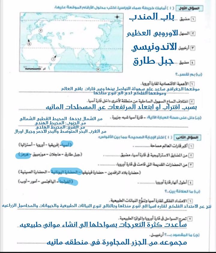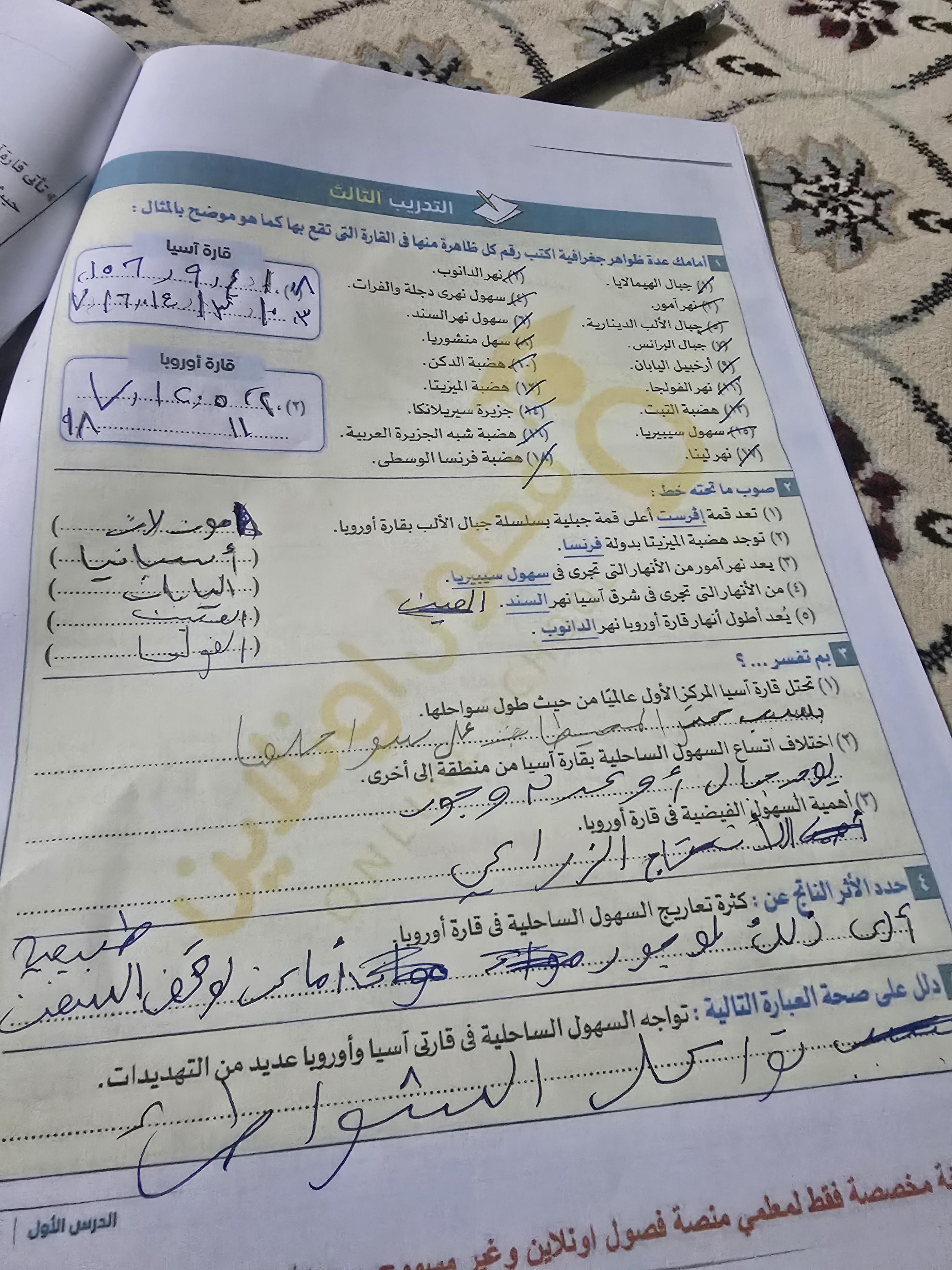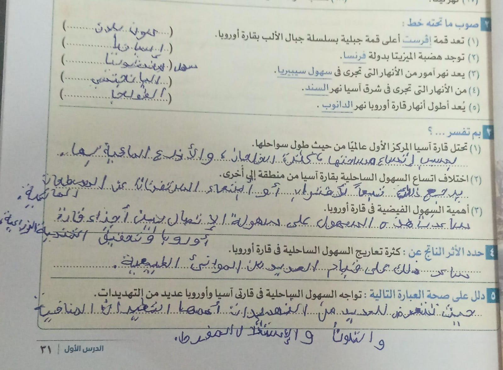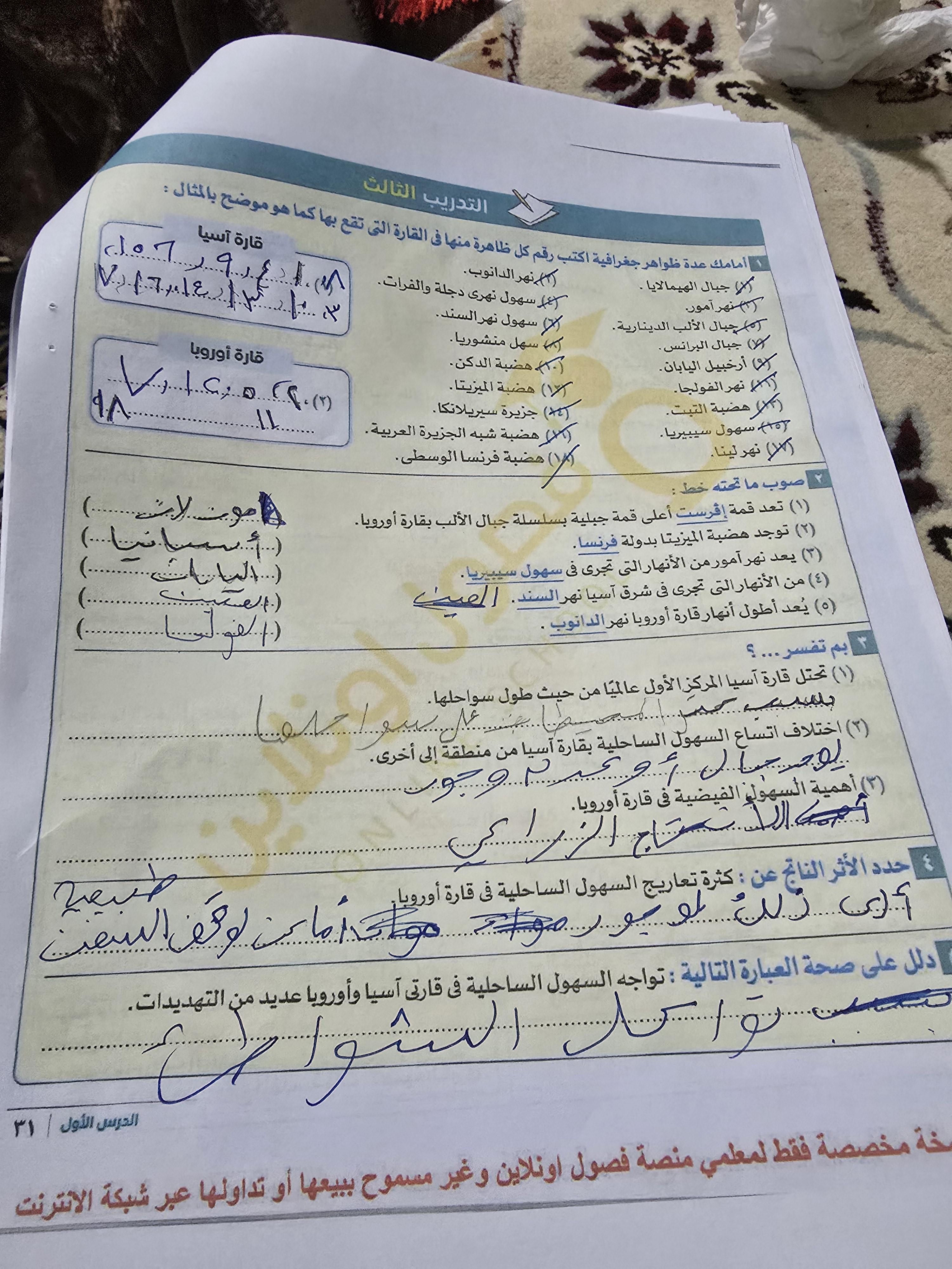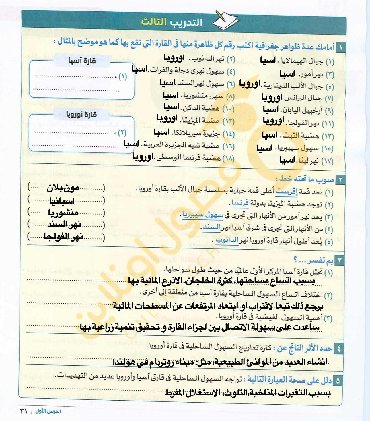 اخدنا اليوم مظاهر سطح اسيا واوربا والواجب التدريب الثالث ص 31 وتدريبات كتاب الامتحان اول تلات صفحات